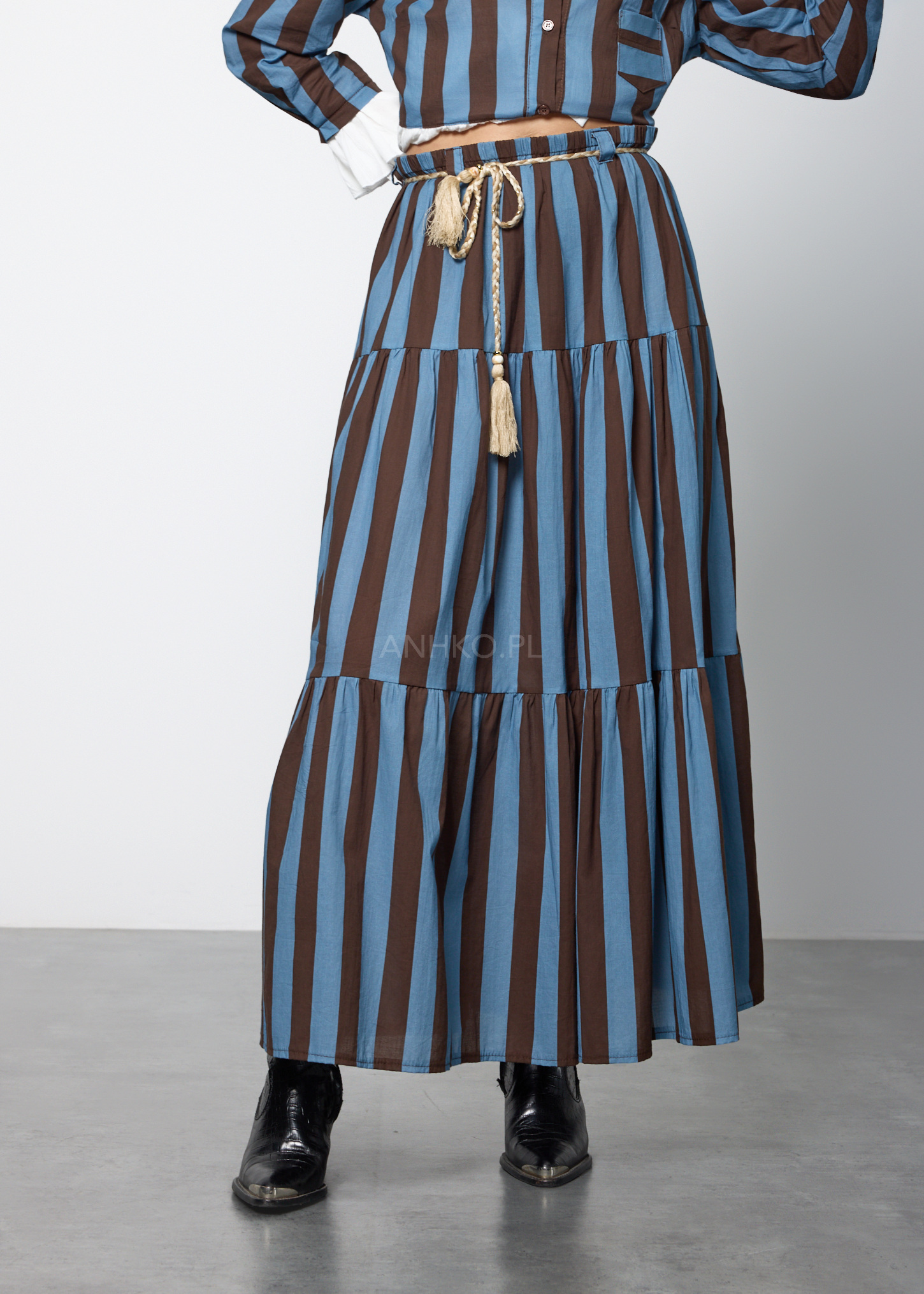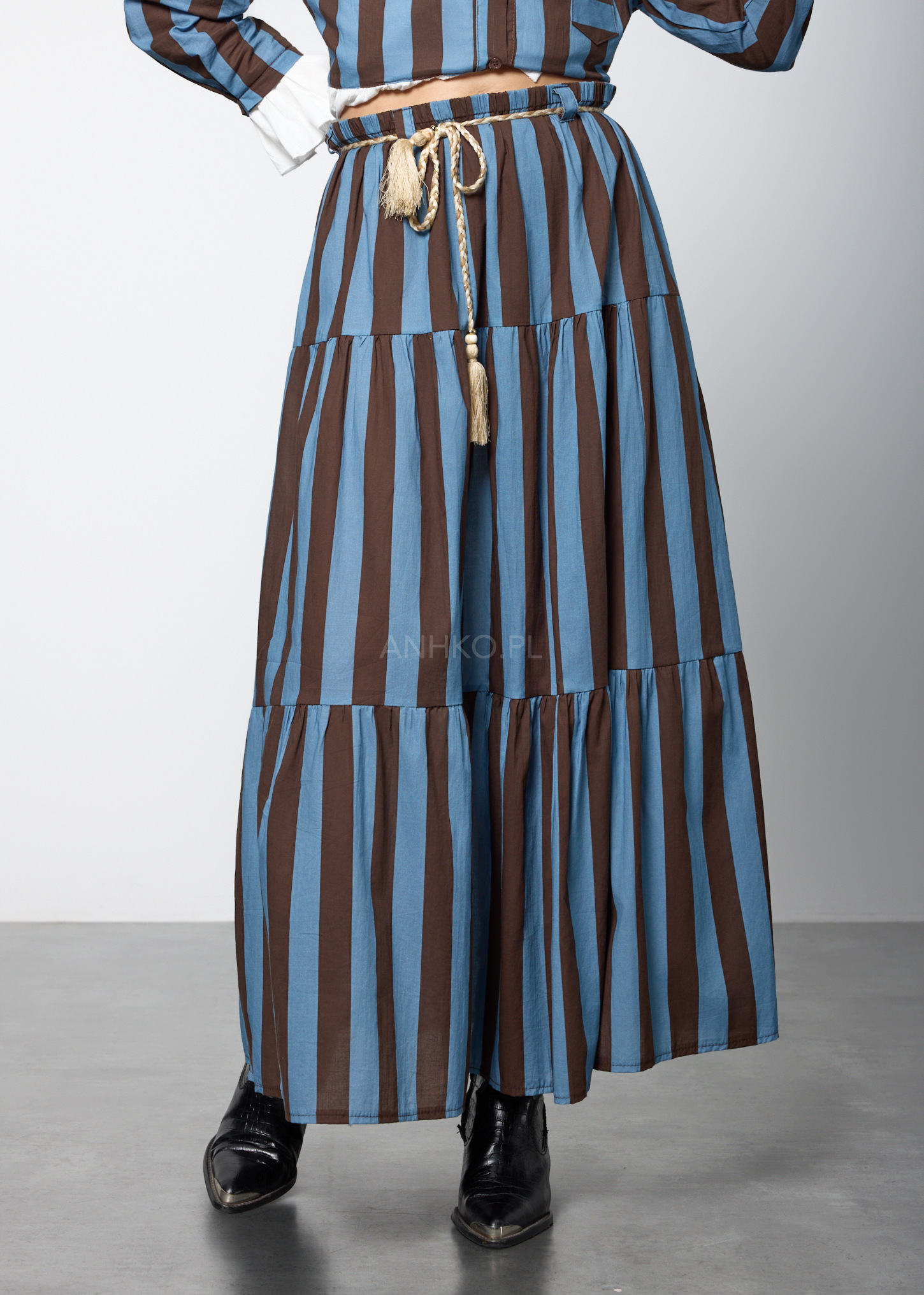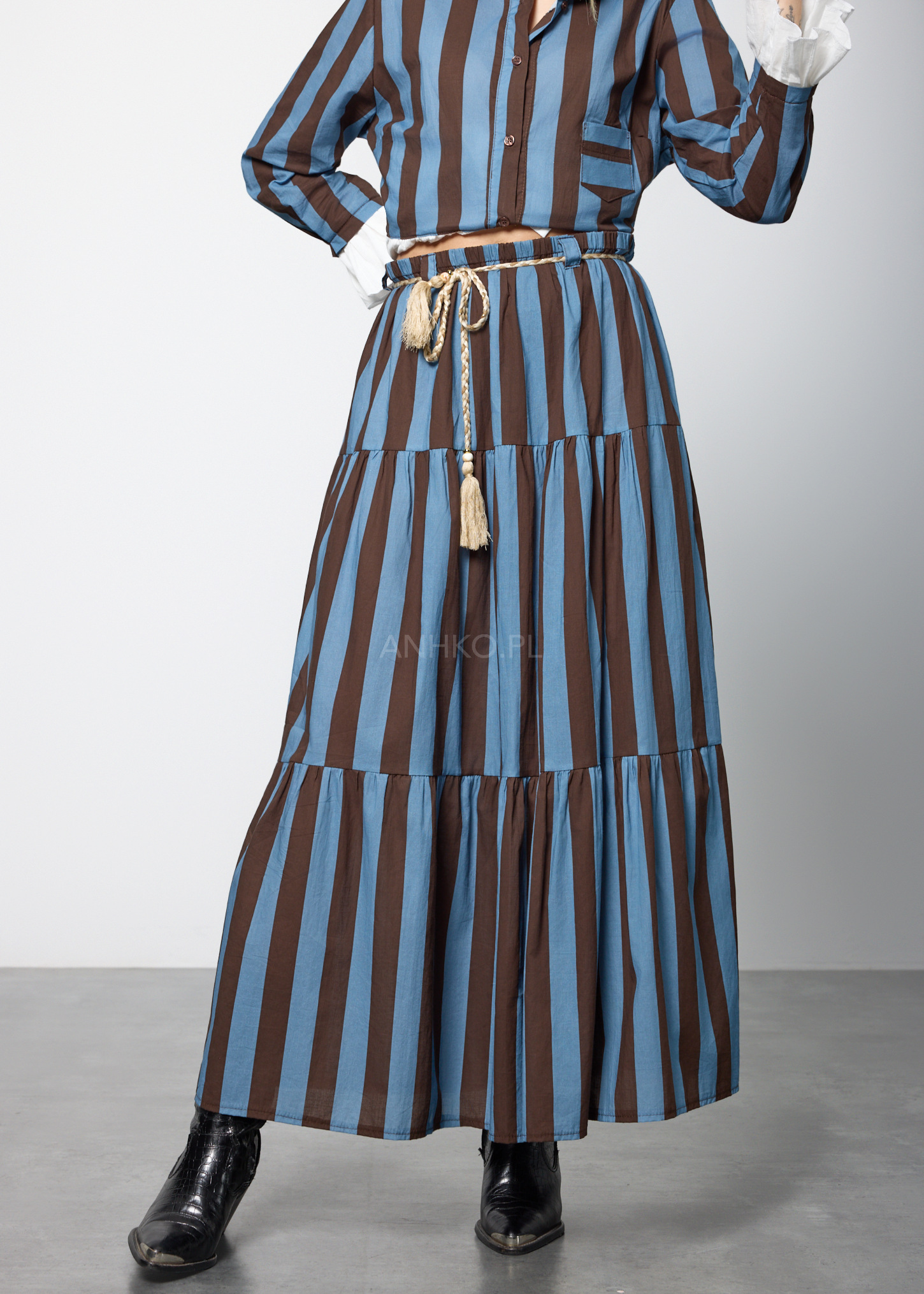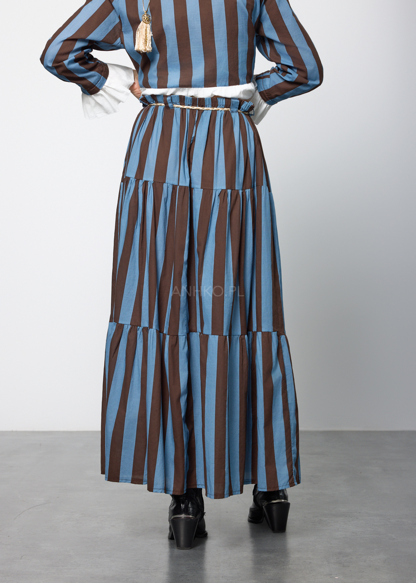 Ten wyjątkowy komplet damski składa się z lekkiej bluzki o koszulowym kroju oraz rozkloszowanej spódnicy z elastyczną talią. Bluzka posiada dekolt w kształcie litery V, długie rękawy zakończone falbanką oraz praktyczną kieszeń na piersi. Spódnica została zaprojektowana z myślą o swobodzie ruchu – ma gumkę w pasie oraz dekoracyjny pleciony pasek z chwostami, który podkreśla talię. Zestaw nie posiada podszewki ani halki, dzięki czemu pozostaje lekki i przewiewny. Doskonale sprawdzi się w stylizacjach codziennych, na spotkania, wyjazdy, a także letnie uroczystości w stylu boho lub casual chic.