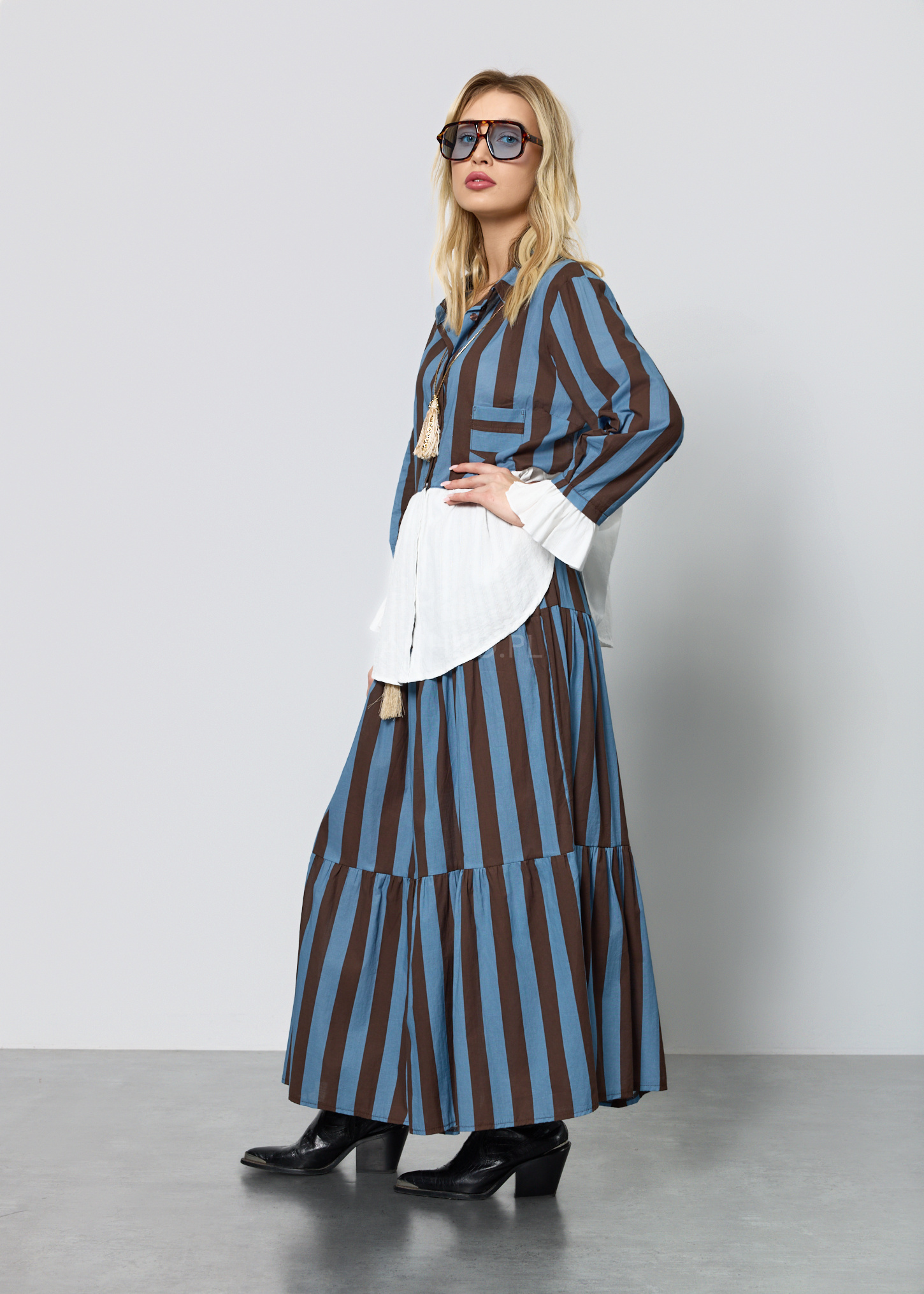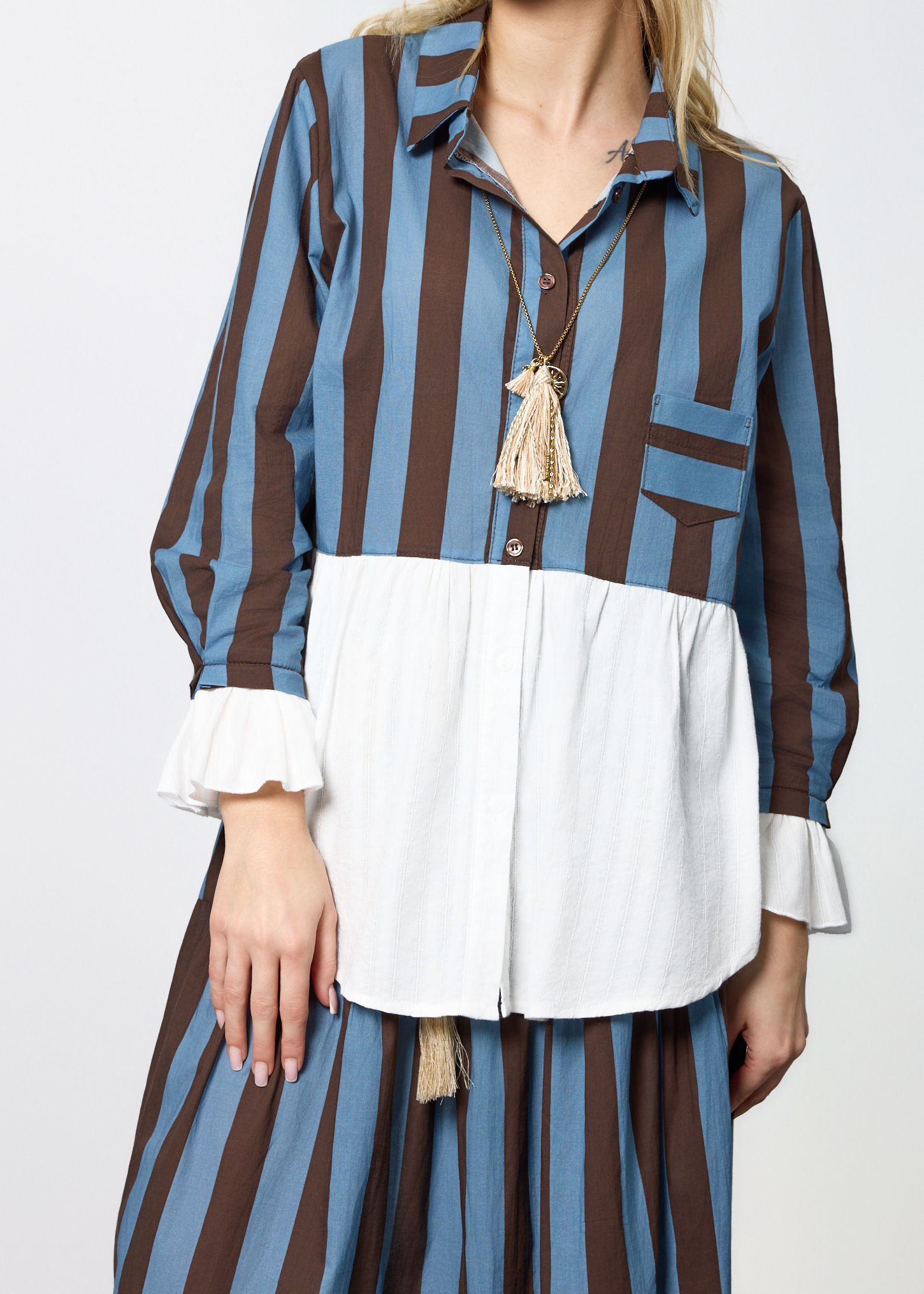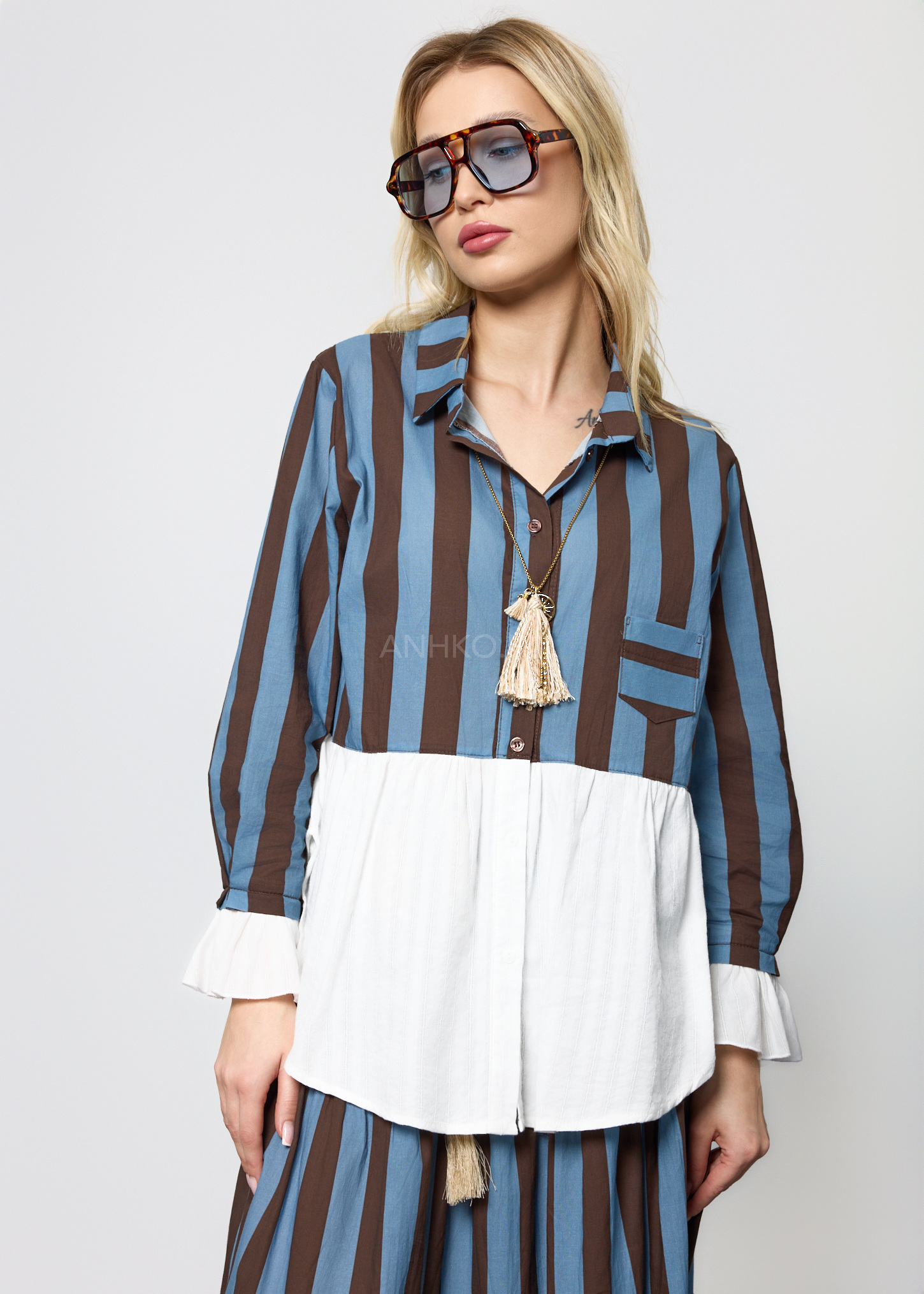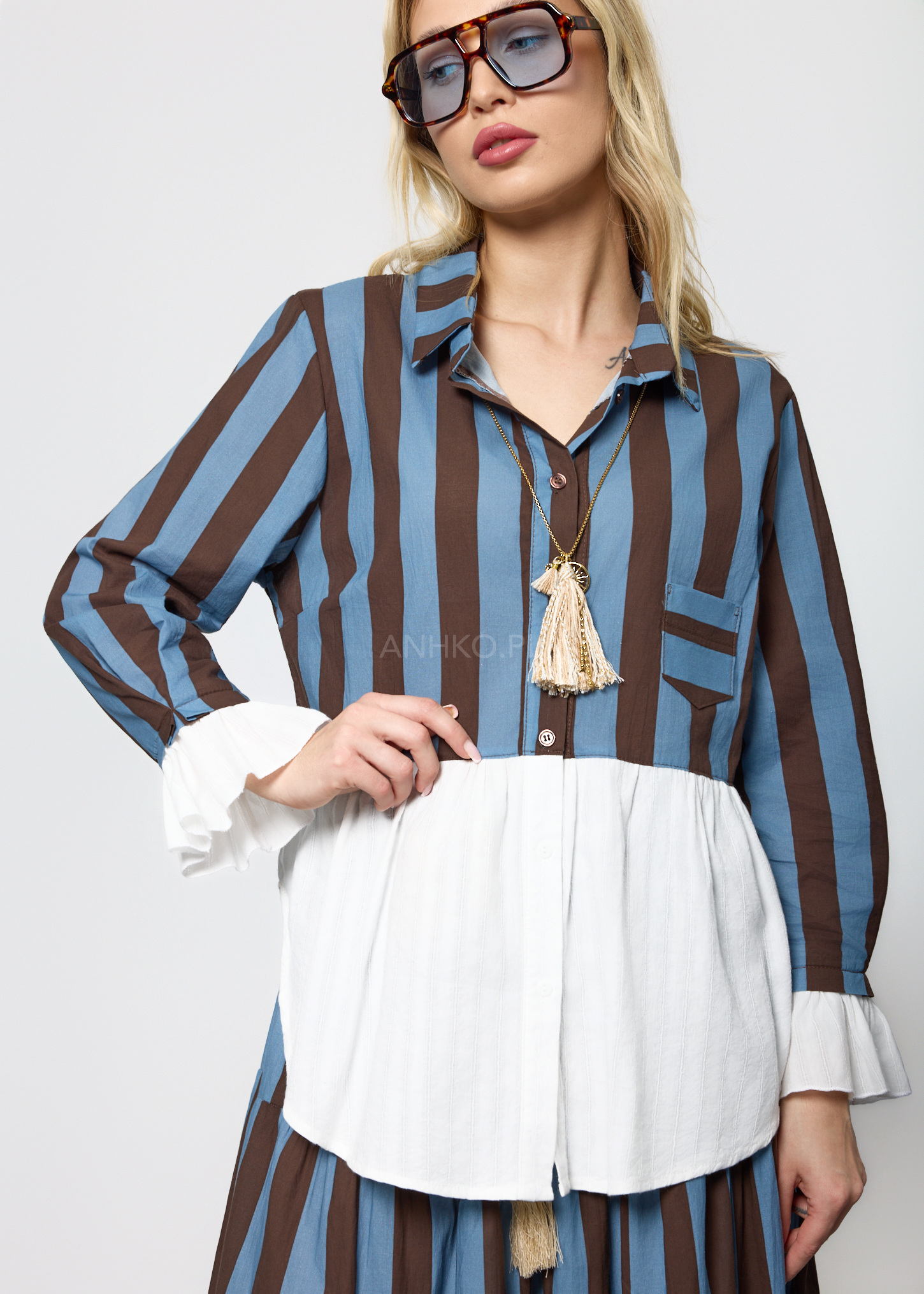 Ten wyjątkowy komplet damski składa się z lekkiej bluzki o koszulowym kroju oraz rozkloszowanej spódnicy z elastyczną talią. Bluzka posiada dekolt w kształcie litery V, długie rękawy zakończone falbanką oraz praktyczną kieszeń na piersi. Spódnica została zaprojektowana z myślą o swobodzie ruchu – ma gumkę w pasie oraz dekoracyjny pleciony pasek z chwostami, który podkreśla talię. Zestaw nie posiada podszewki ani halki, dzięki czemu pozostaje lekki i przewiewny. Doskonale sprawdzi się w stylizacjach codziennych, na spotkania, wyjazdy, a także letnie uroczystości w stylu boho lub casual chic.