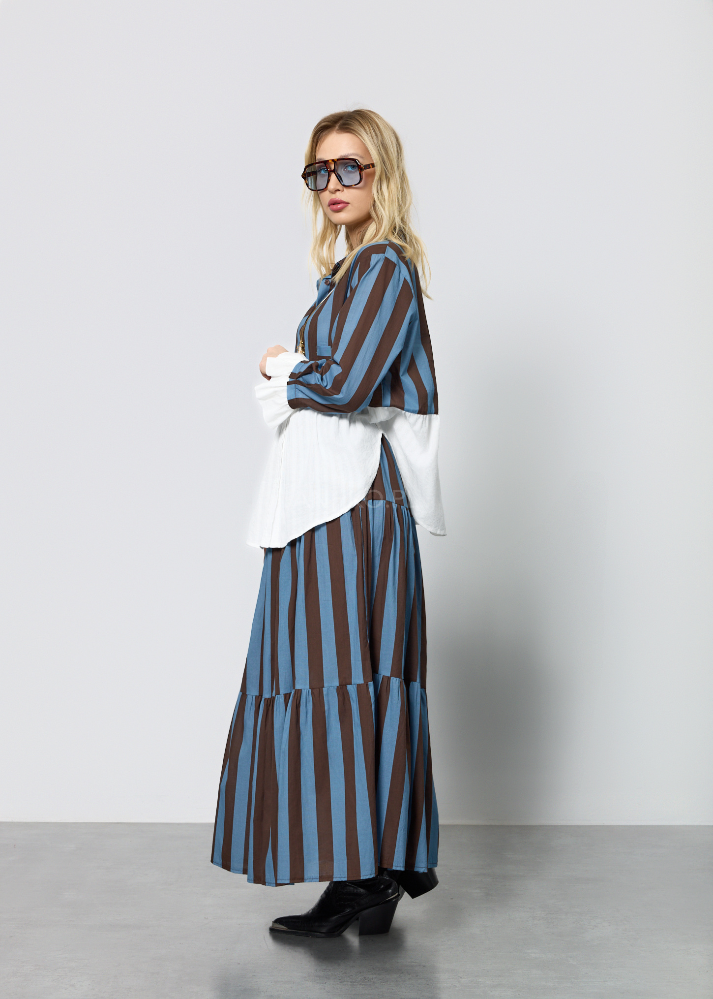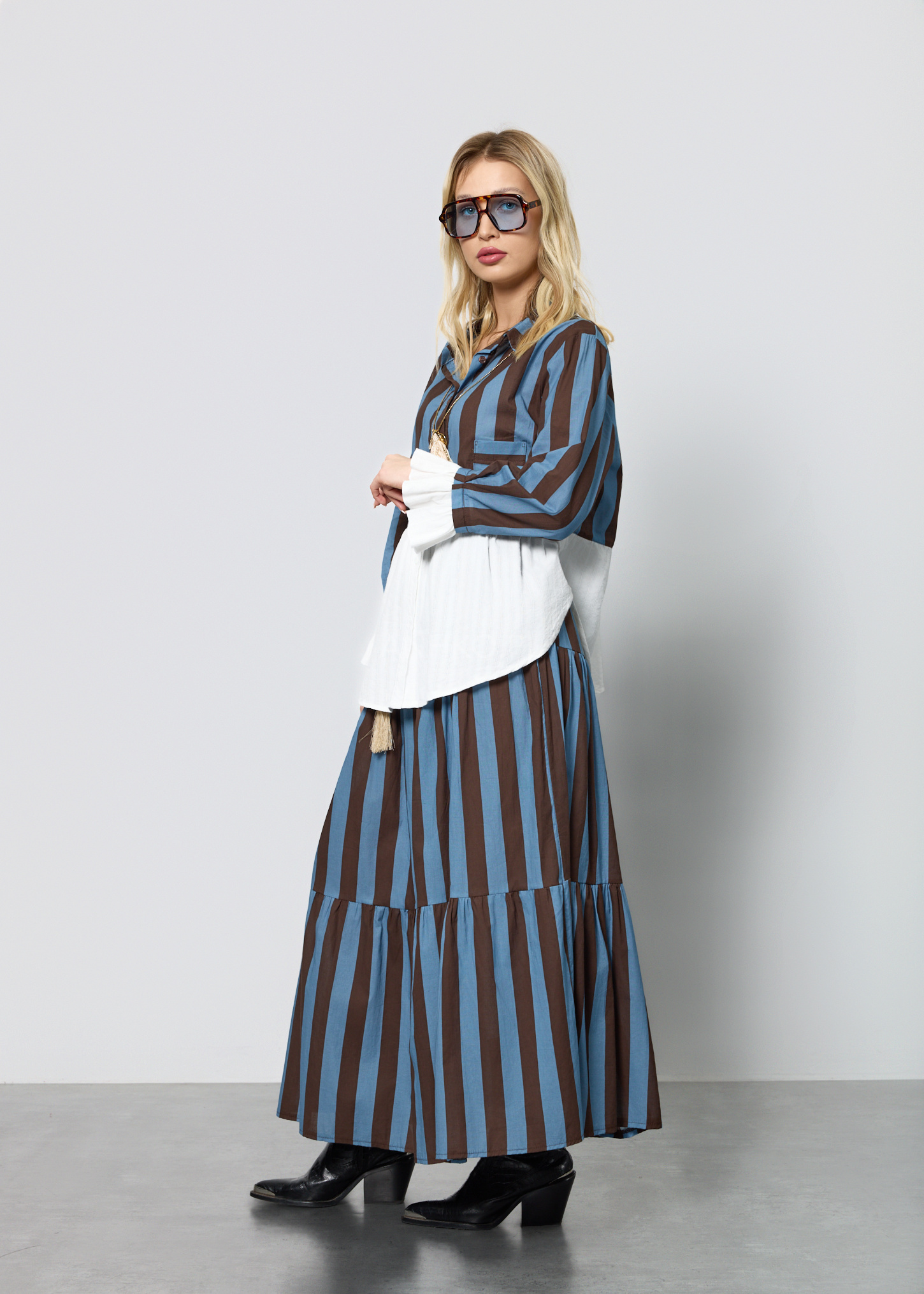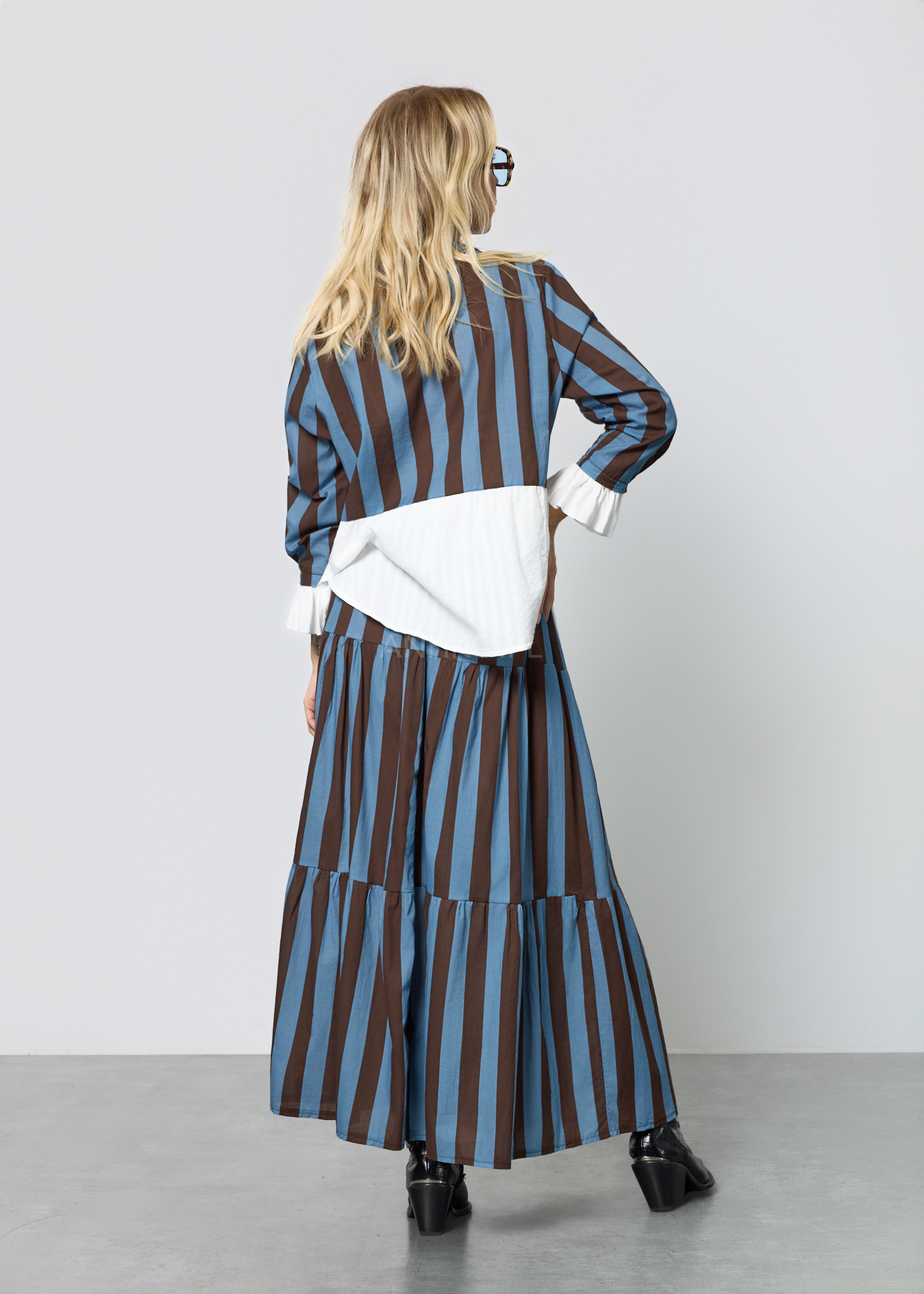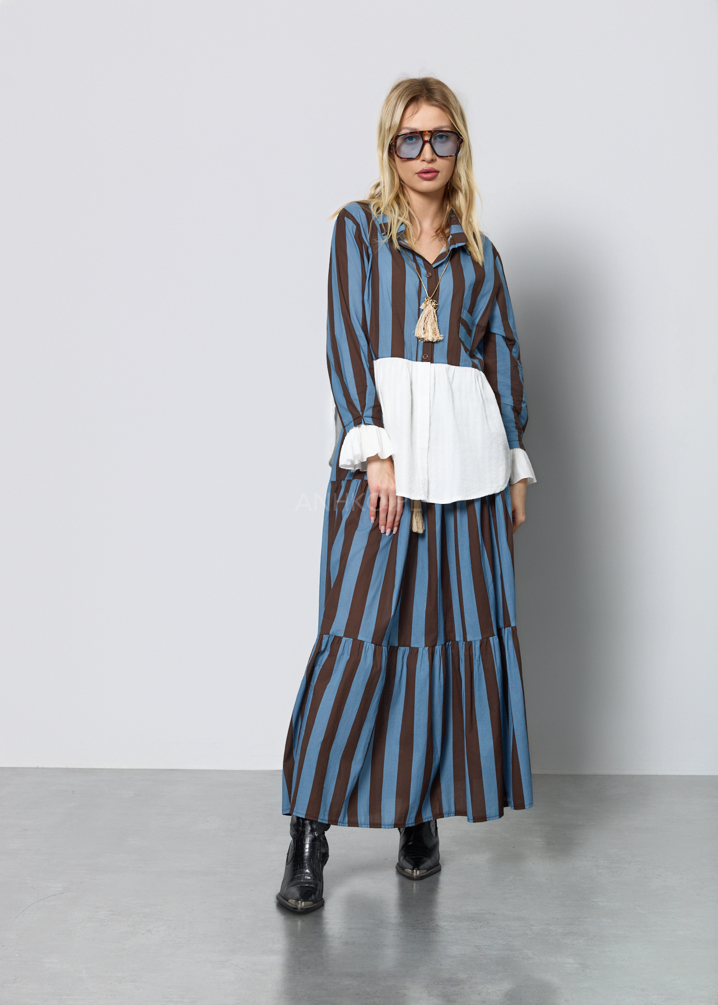 Ten wyjątkowy komplet damski składa się z lekkiej bluzki o koszulowym kroju oraz rozkloszowanej spódnicy z elastyczną talią. Bluzka posiada dekolt w kształcie litery V, długie rękawy zakończone falbanką oraz praktyczną kieszeń na piersi. Spódnica została zaprojektowana z myślą o swobodzie ruchu – ma gumkę w pasie oraz dekoracyjny pleciony pasek z chwostami, który podkreśla talię. Zestaw nie posiada podszewki ani halki, dzięki czemu pozostaje lekki i przewiewny. Doskonale sprawdzi się w stylizacjach codziennych, na spotkania, wyjazdy, a także letnie uroczystości w stylu boho lub casual chic.