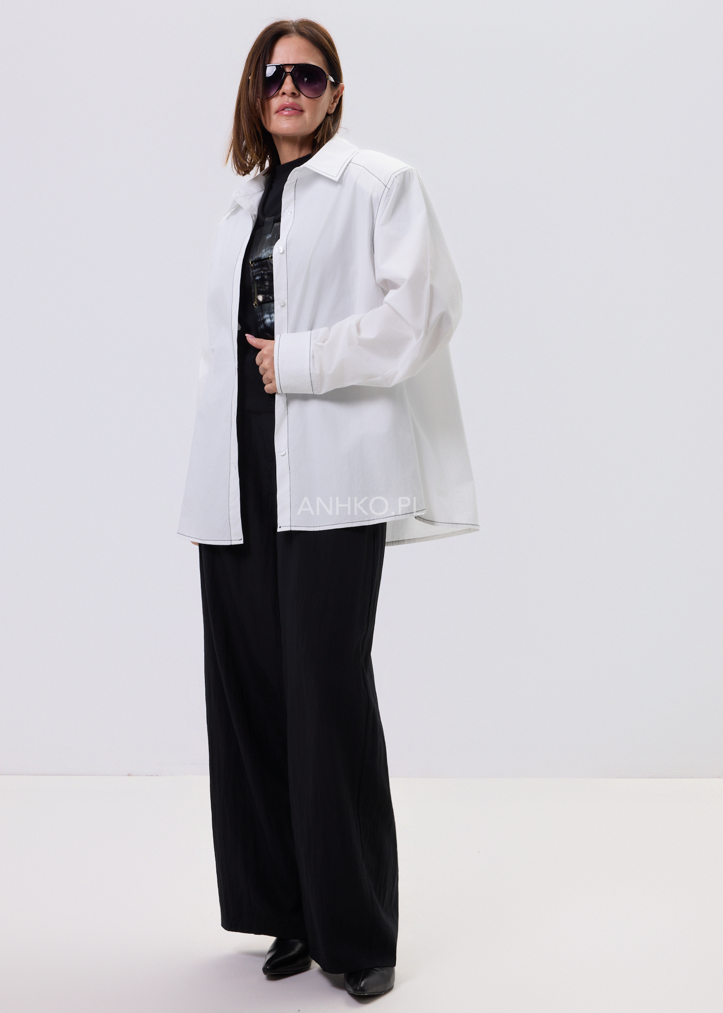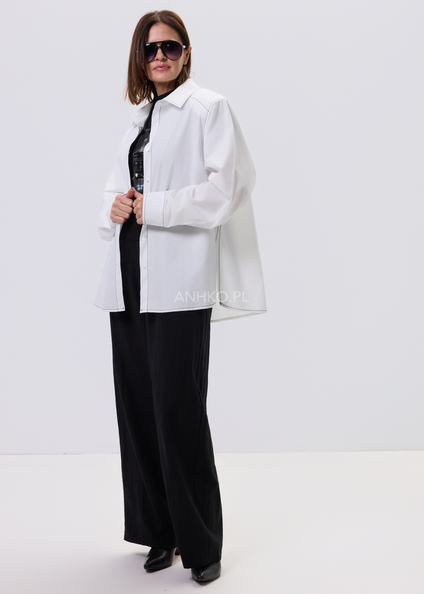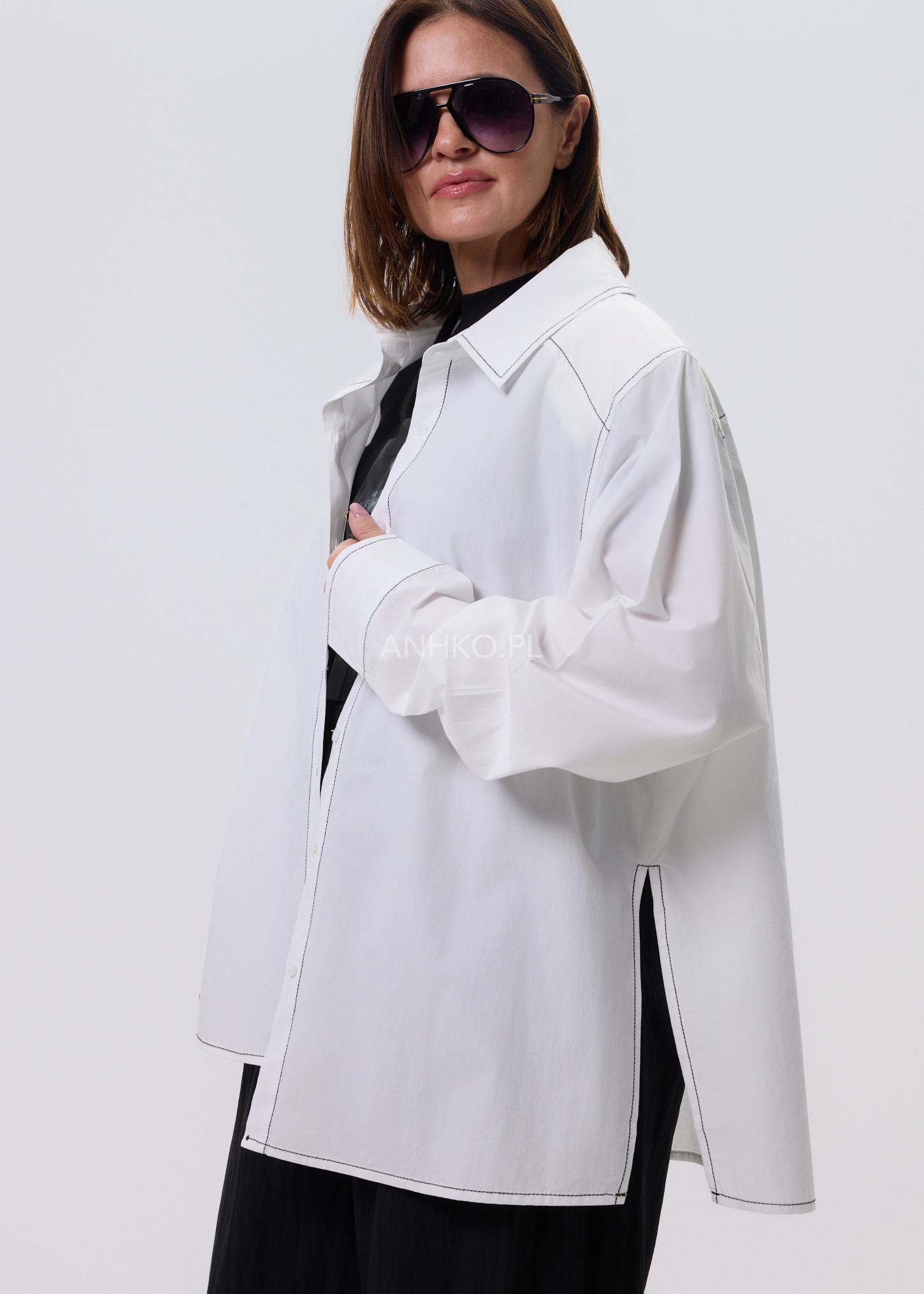 Ta koszula damska o luźnym kroju swobodnie układa się na sylwetce, tworząc minimalistyczną, czystą linię. Lekko wydłużona długość oraz kontrastowe przeszycia podkreślają konstrukcję modelu i nadają mu wyrazistego, designerskiego charakteru. Klasyczny kołnierz i miękka bawełniana tkanina sprawiają, że to ponadczasowa baza z nowoczesnym akcentem.