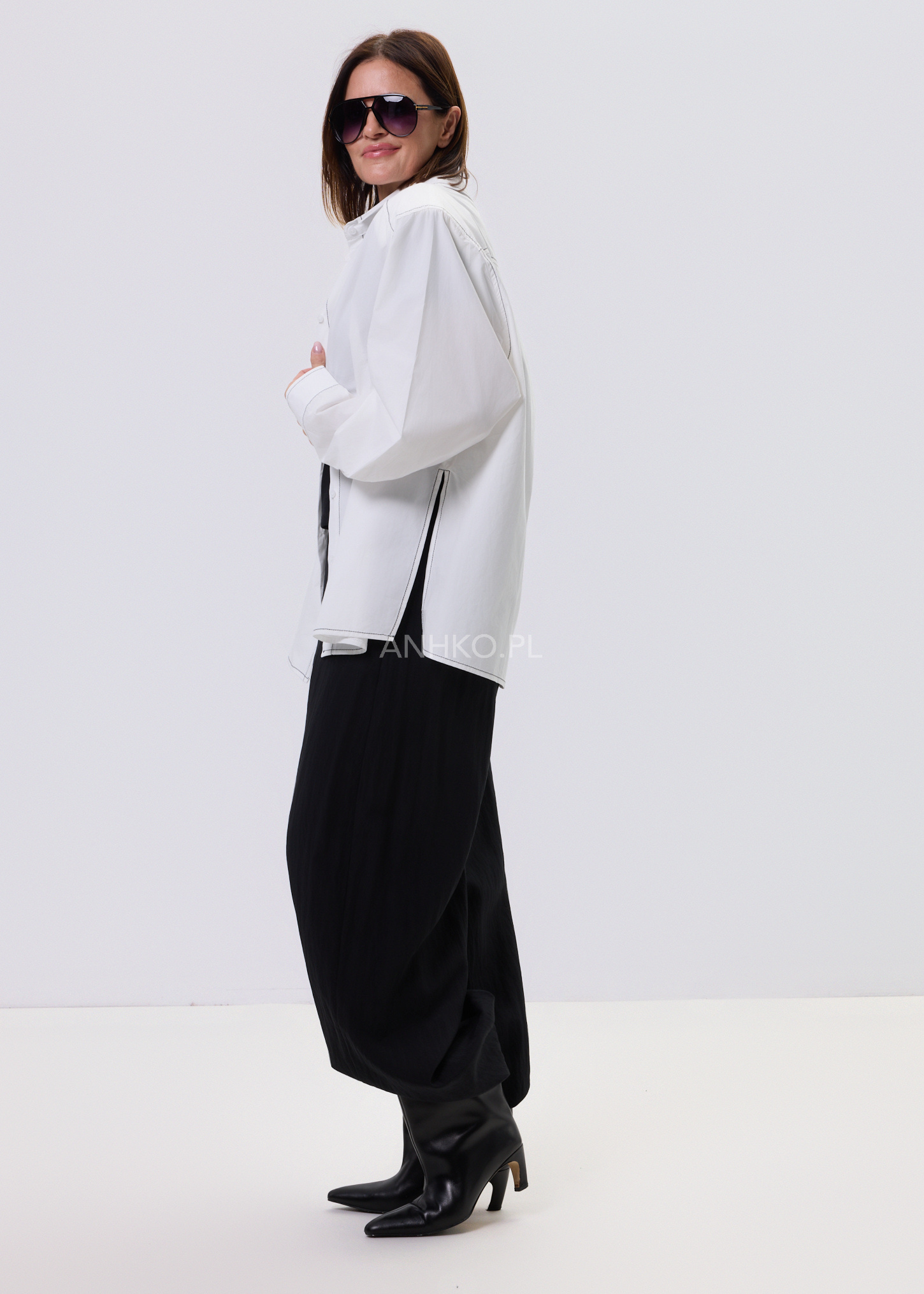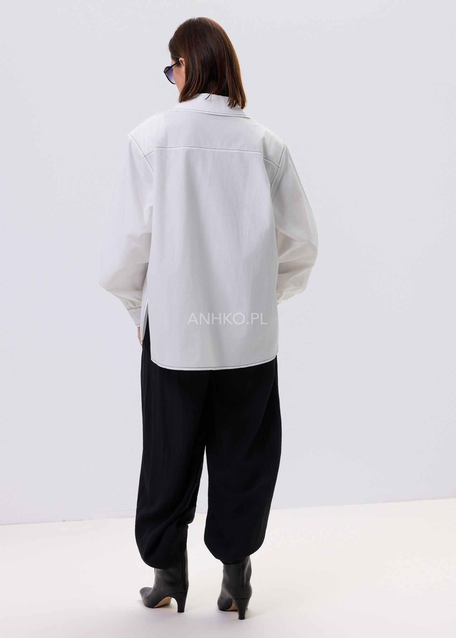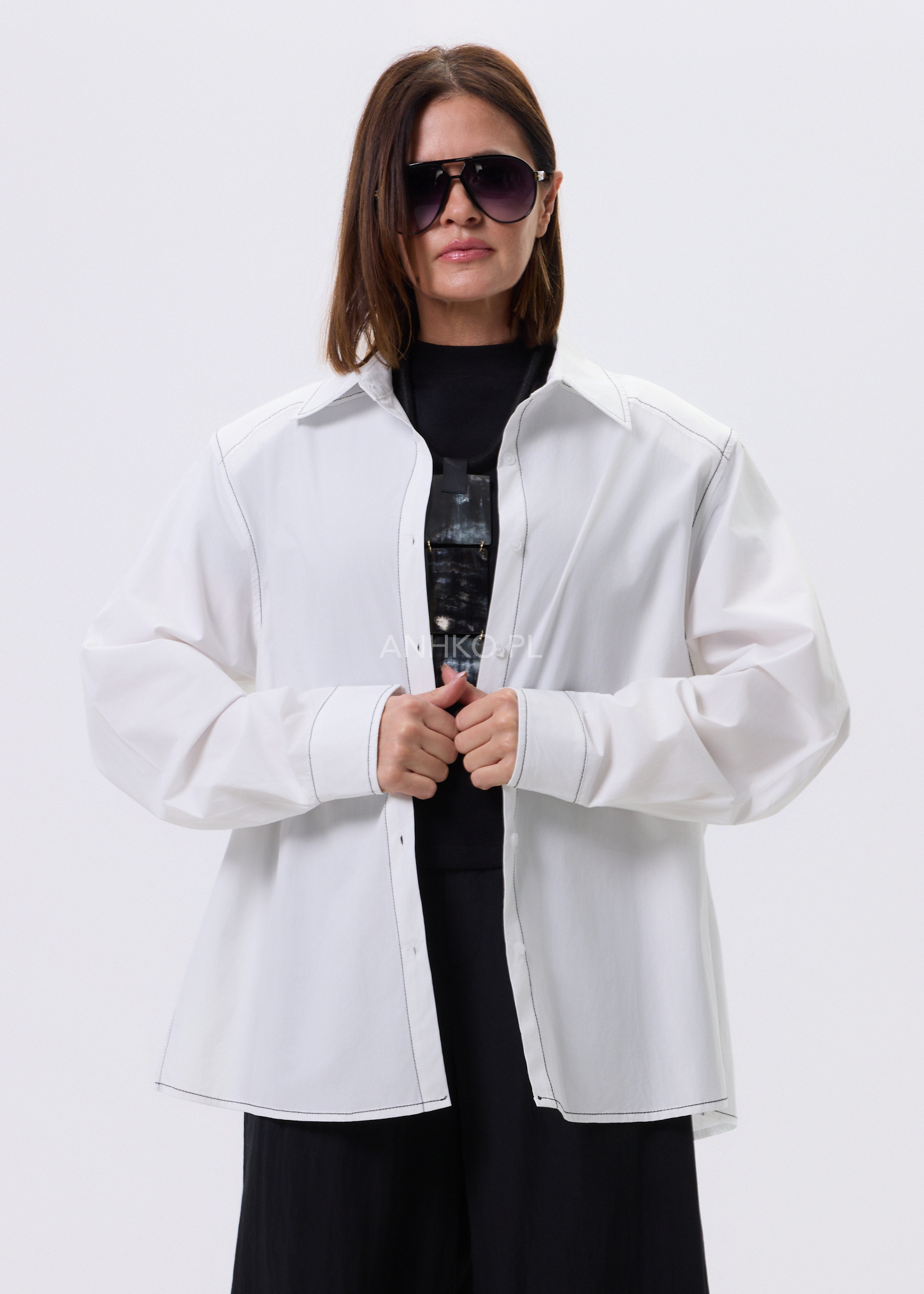 Ta koszula damska o luźnym kroju swobodnie układa się na sylwetce, tworząc minimalistyczną, czystą linię. Lekko wydłużona długość oraz kontrastowe przeszycia podkreślają konstrukcję modelu i nadają mu wyrazistego, designerskiego charakteru. Klasyczny kołnierz i miękka bawełniana tkanina sprawiają, że to ponadczasowa baza z nowoczesnym akcentem.