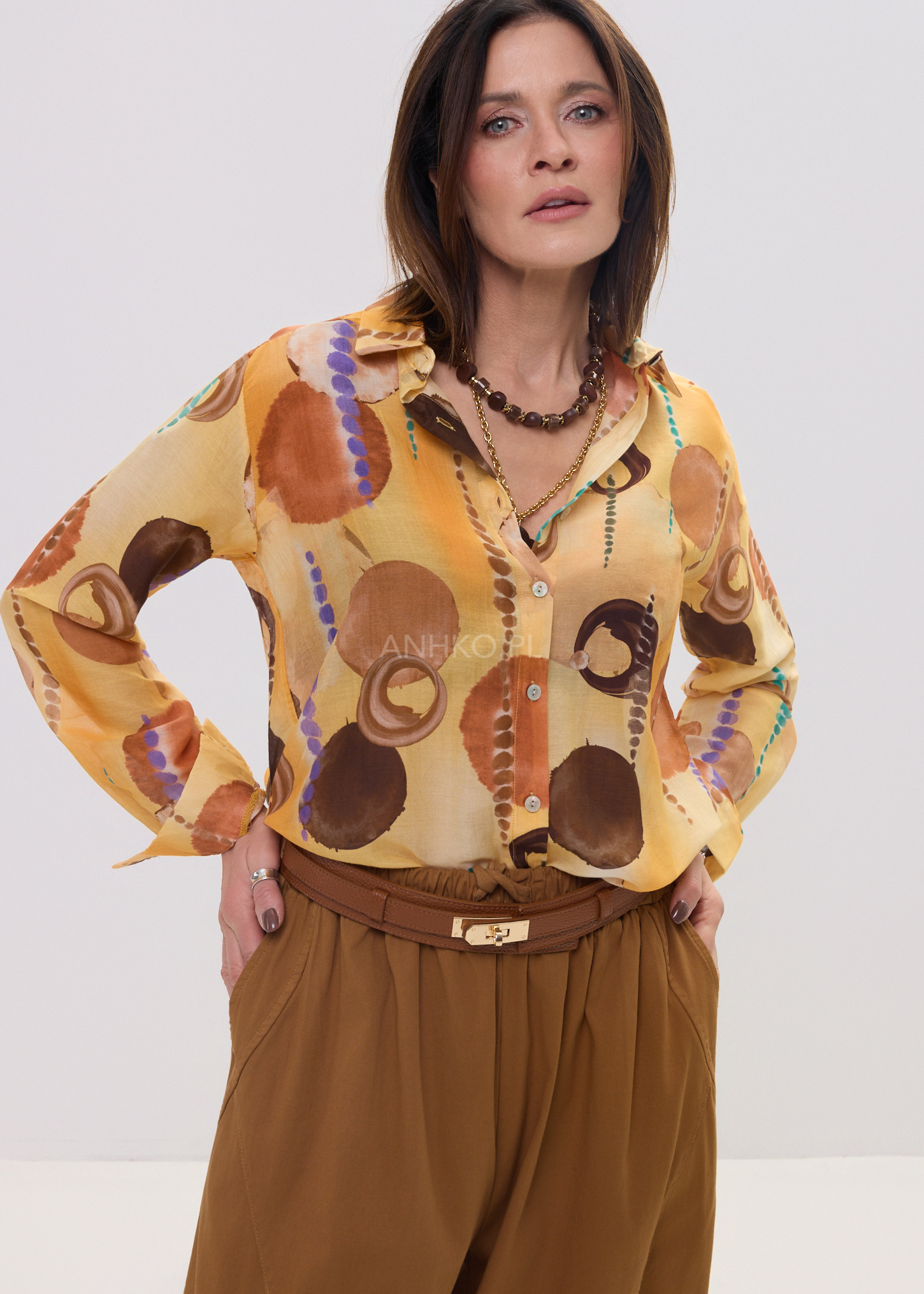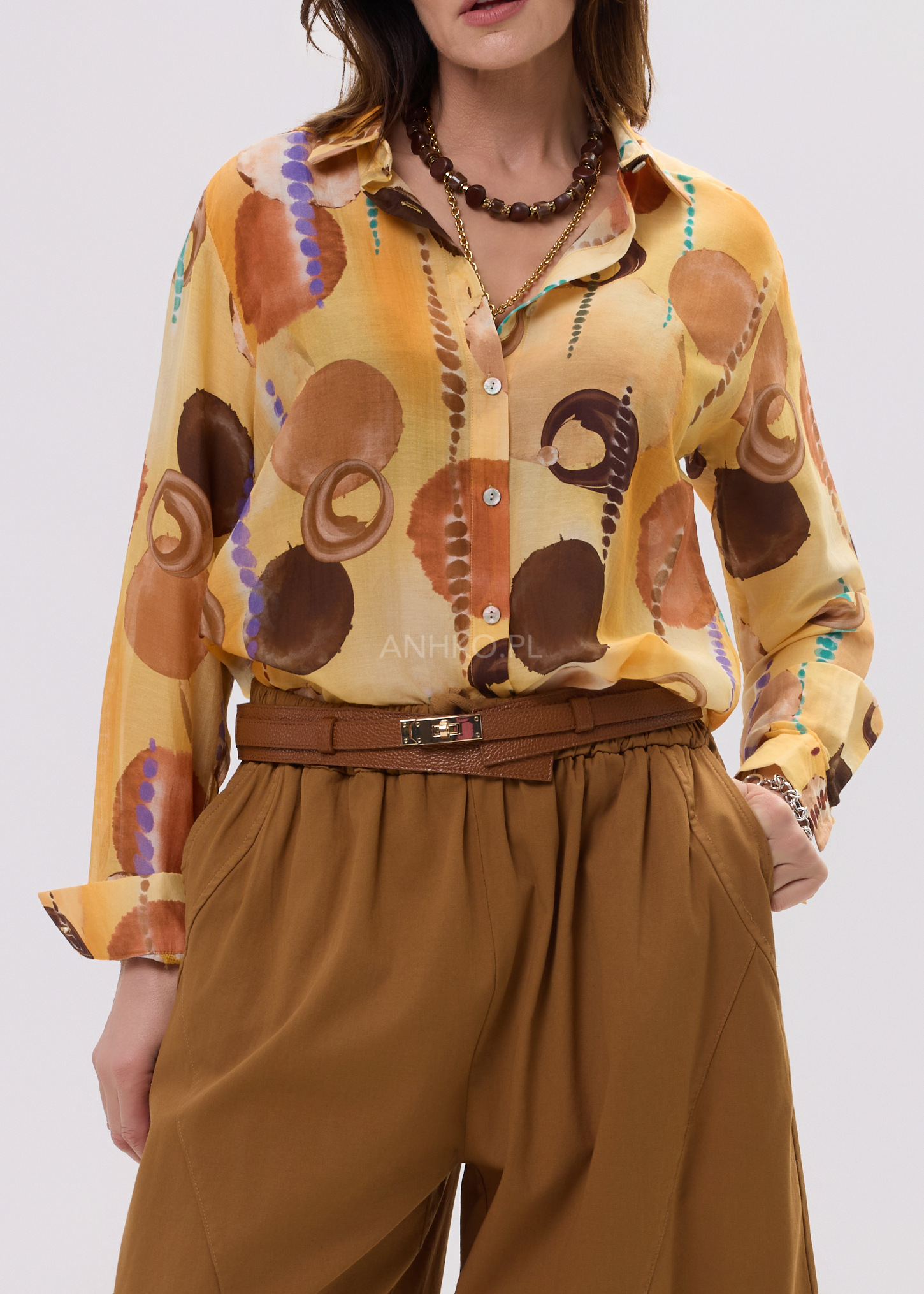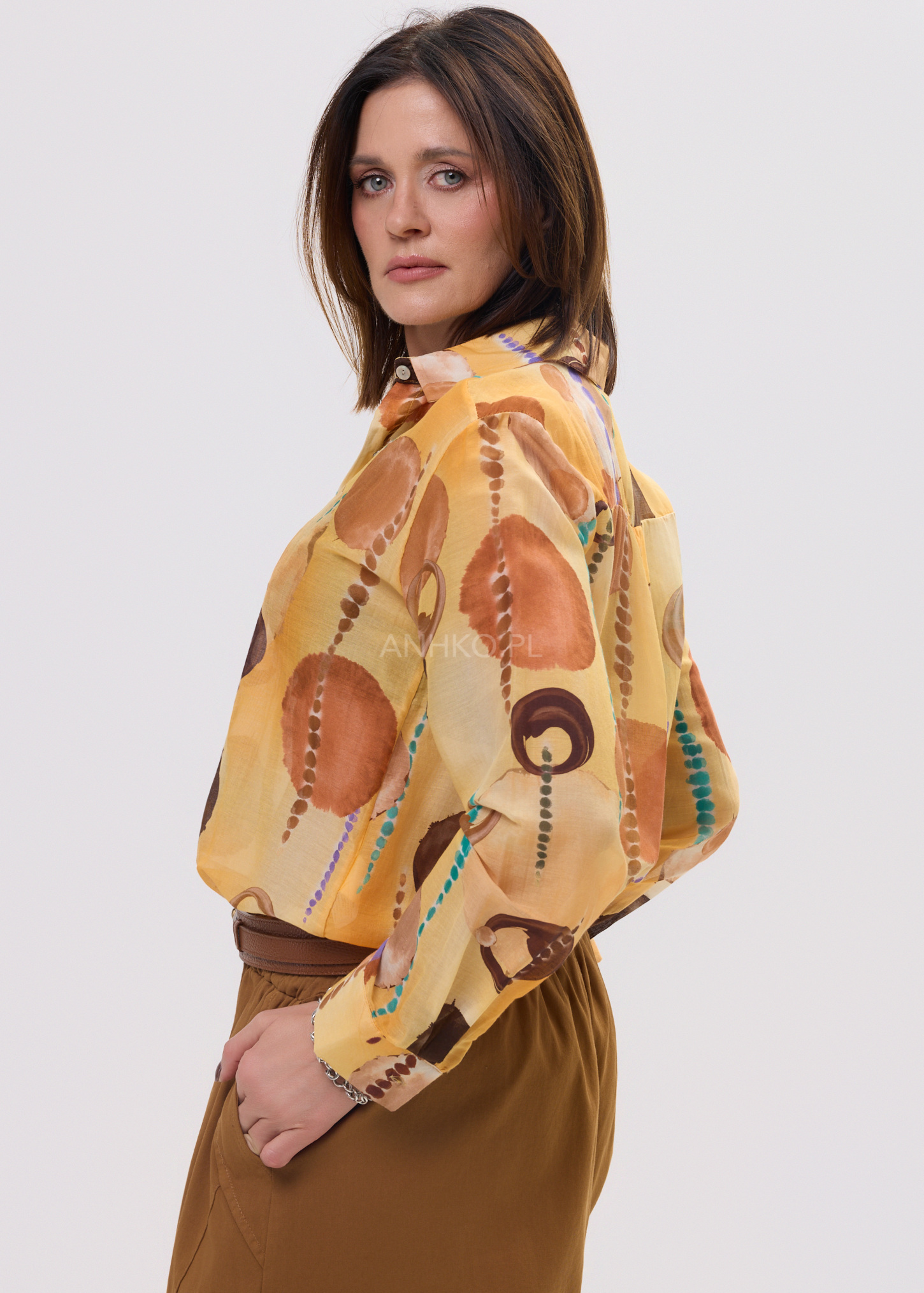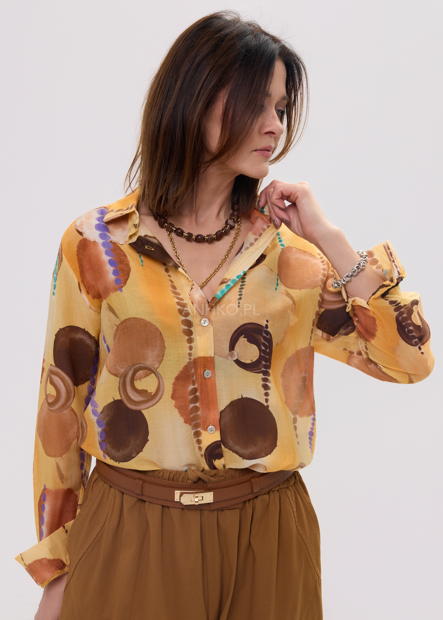 Ta koszula damska o swobodnym kroju subtelnie opływa sylwetkę, tworząc efekt lekkości i niewymuszonej elegancji. Oversize’owy fason zapewnia komfort ruchów, a jednocześnie nadaje stylizacji modowego charakteru. Artystyczny print na Pomarańczowo-brązowej bazie przyciąga uwagę i sprawia, że model staje się centralnym punktem każdego outfitu.