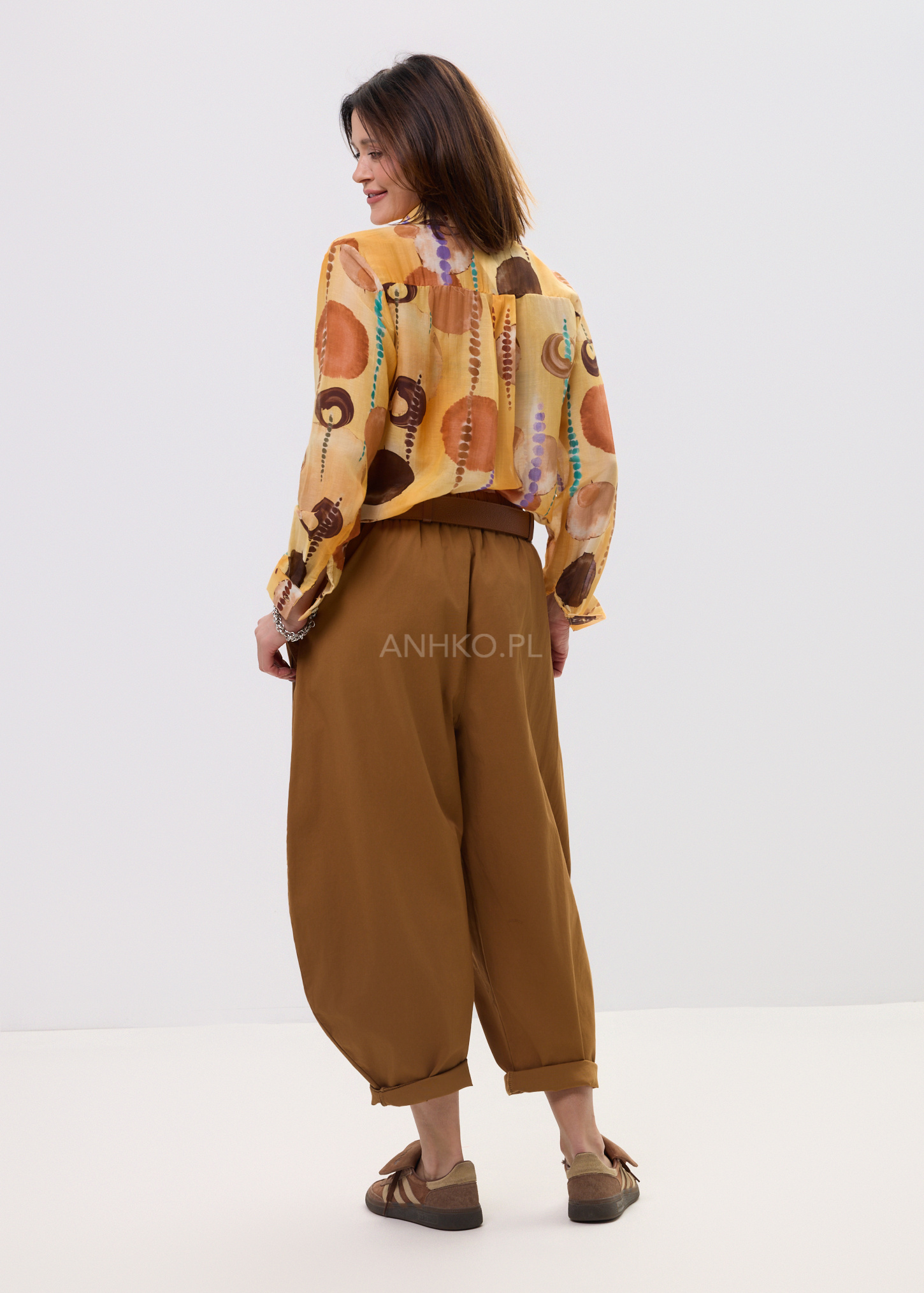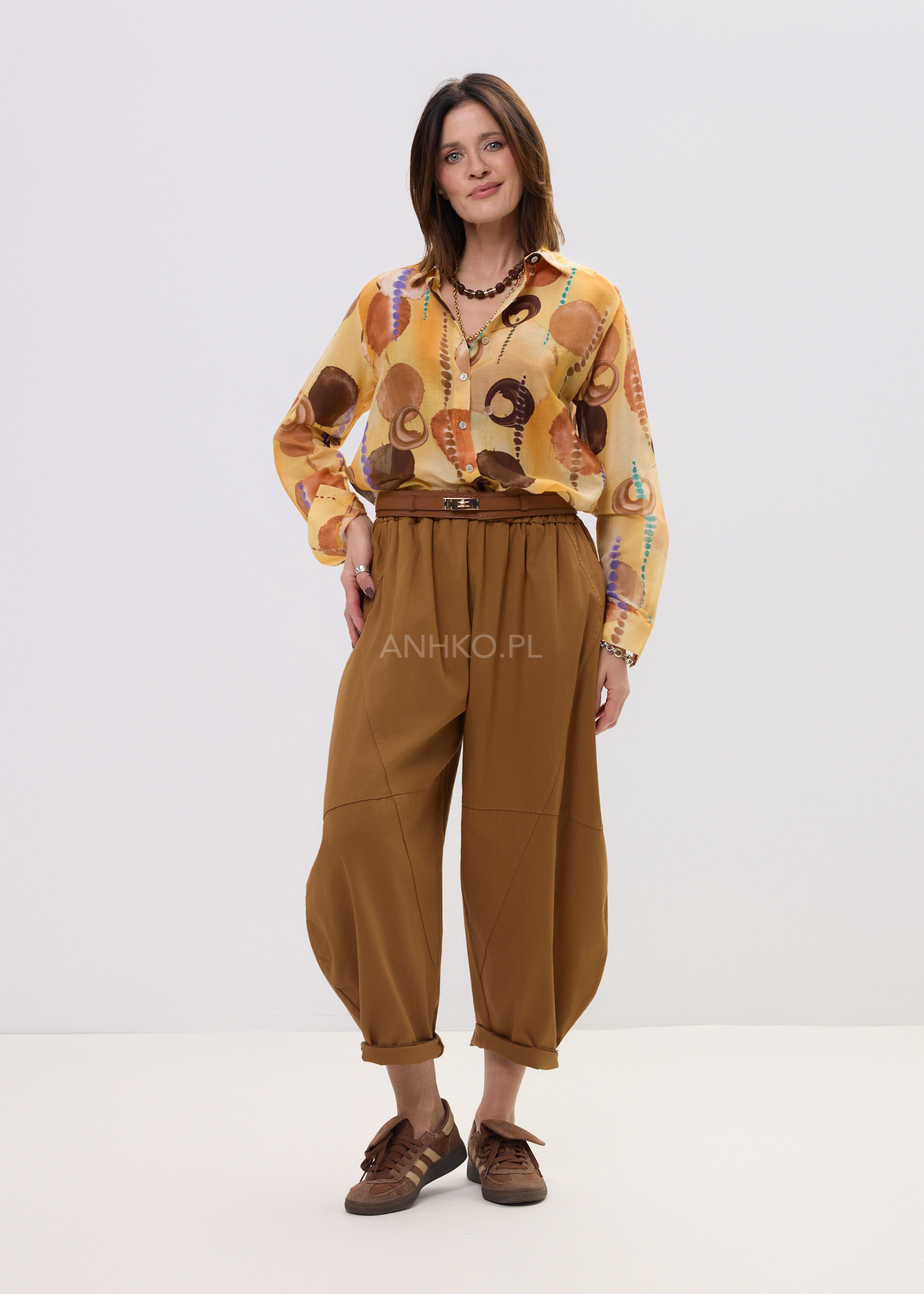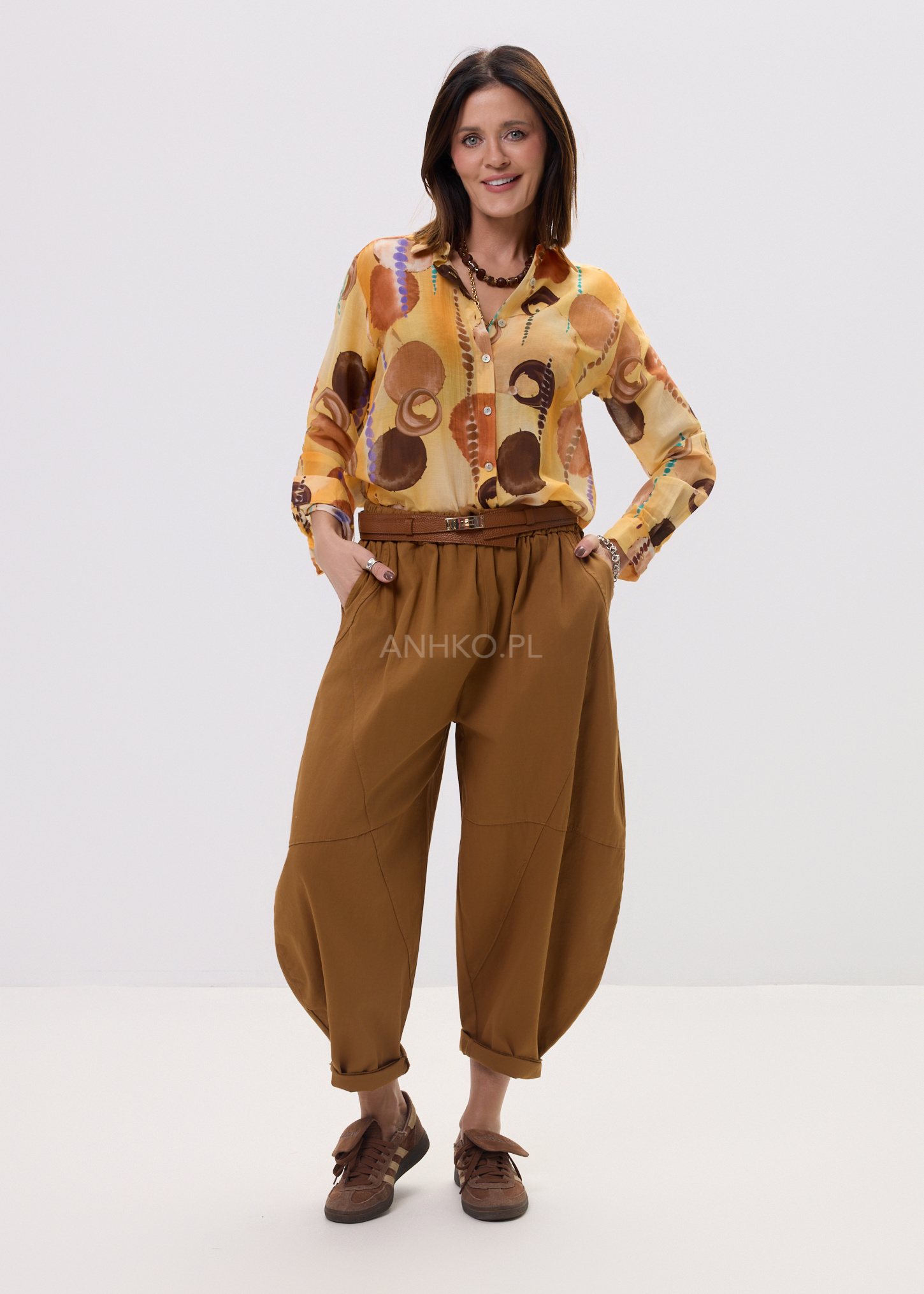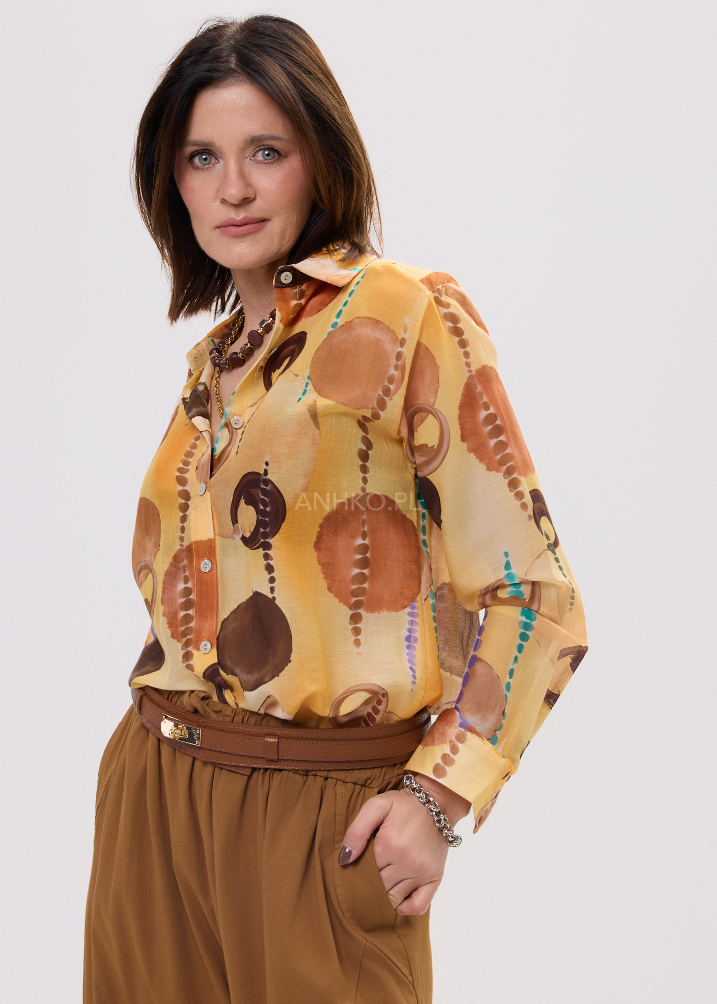 Ta koszula damska o swobodnym kroju subtelnie opływa sylwetkę, tworząc efekt lekkości i niewymuszonej elegancji. Oversize’owy fason zapewnia komfort ruchów, a jednocześnie nadaje stylizacji modowego charakteru. Artystyczny print na Pomarańczowo-brązowej bazie przyciąga uwagę i sprawia, że model staje się centralnym punktem każdego outfitu.