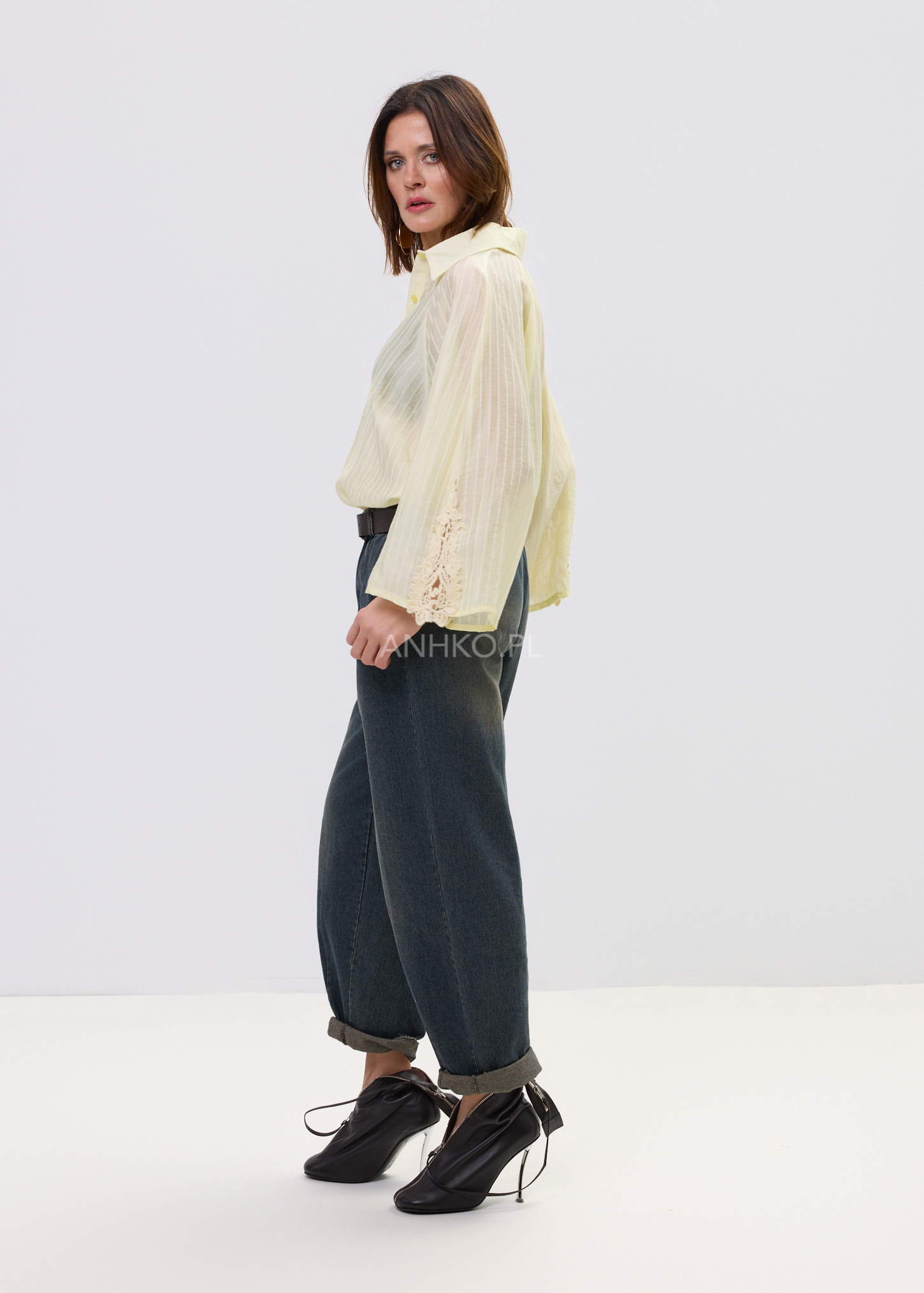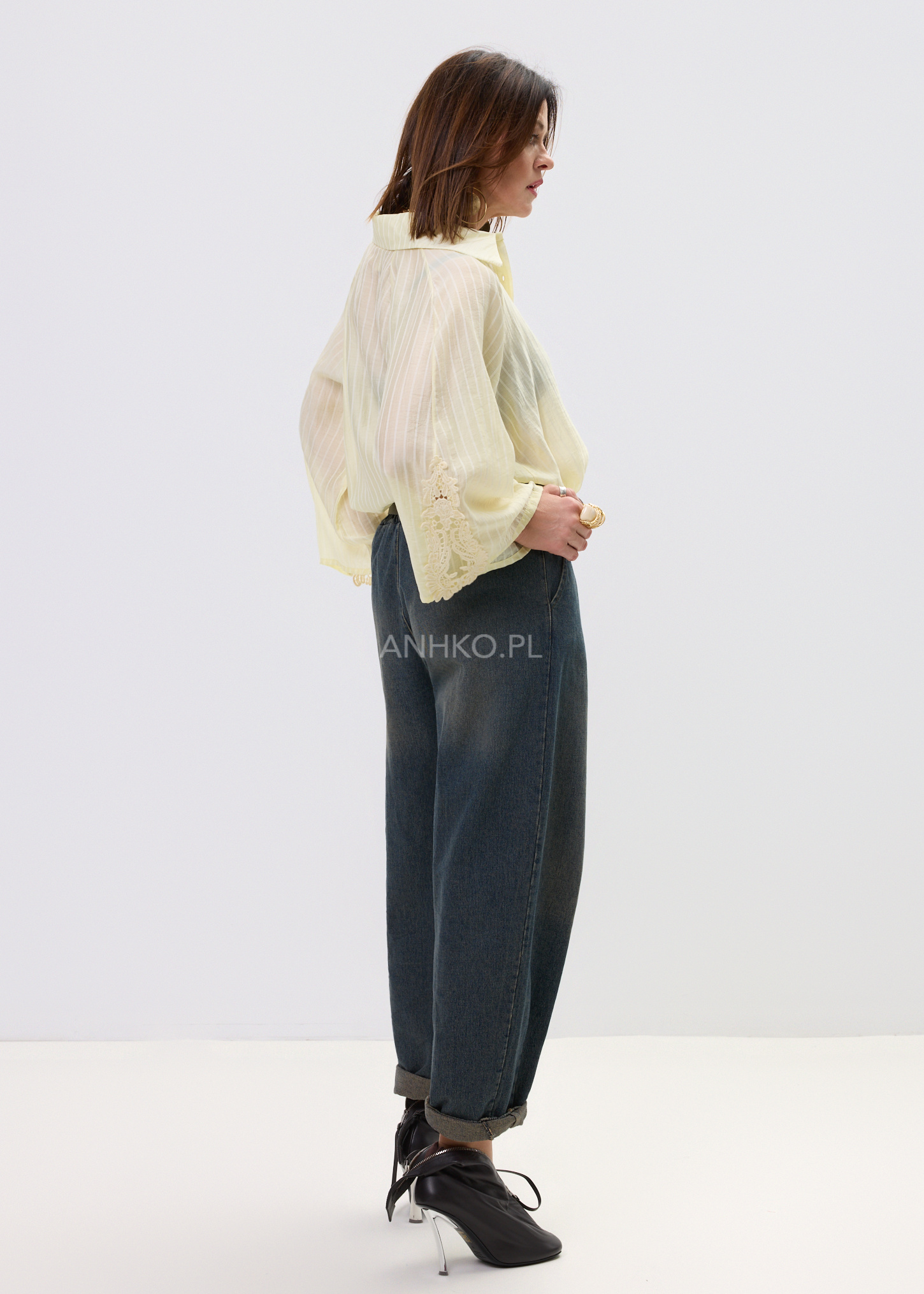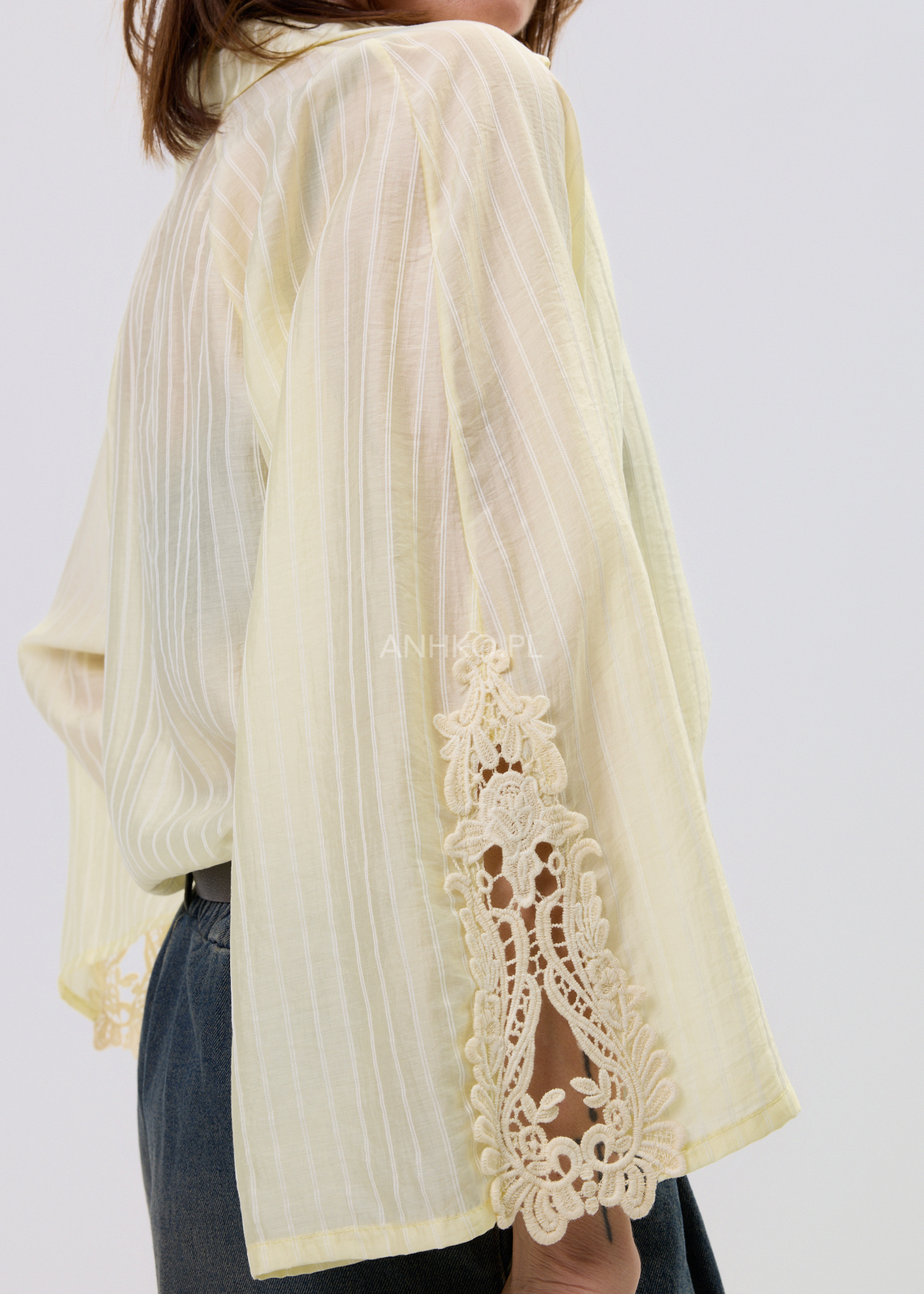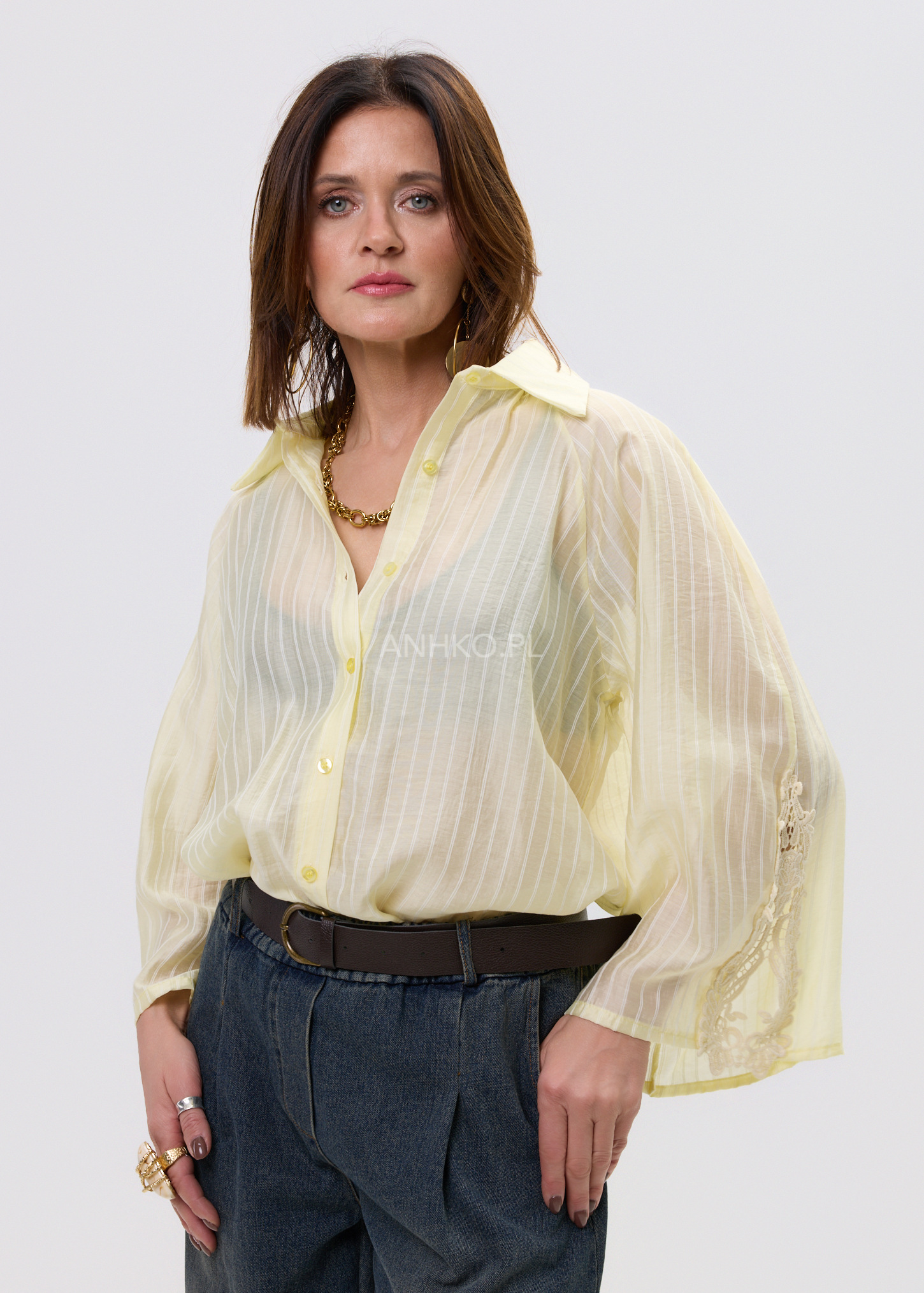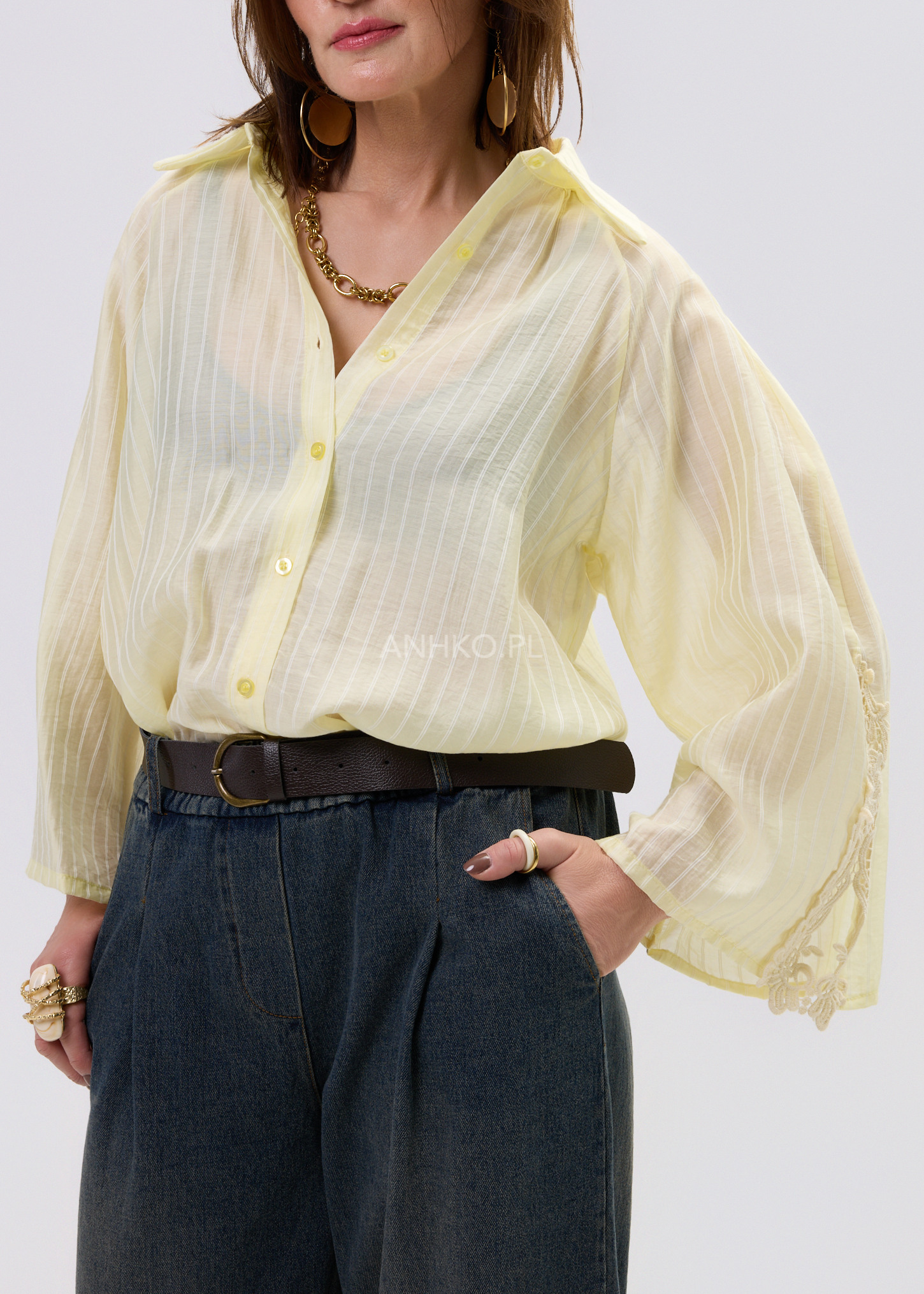 Ta koszula damska w subtelnym cytrynowym odcieniu przyciąga uwagę delikatną strukturą pionowych prążków i lekko półtransparentną tkaniną. Luźniejszy fason sprawia, że materiał naturalnie układa się na sylwetce, tworząc swobodny, elegancki efekt. Dzięki miękkiej i przewiewnej tkaninie model zapewnia komfort noszenia zarówno w codziennych stylizacjach, jak i bardziej dopracowanych zestawach.