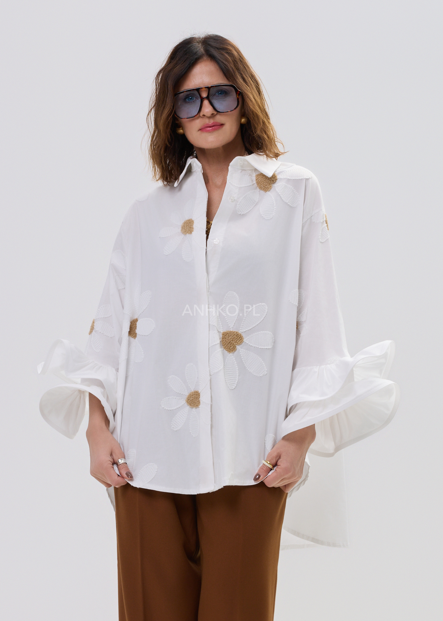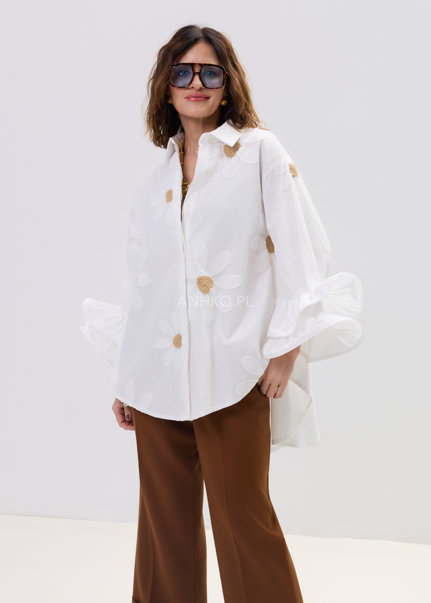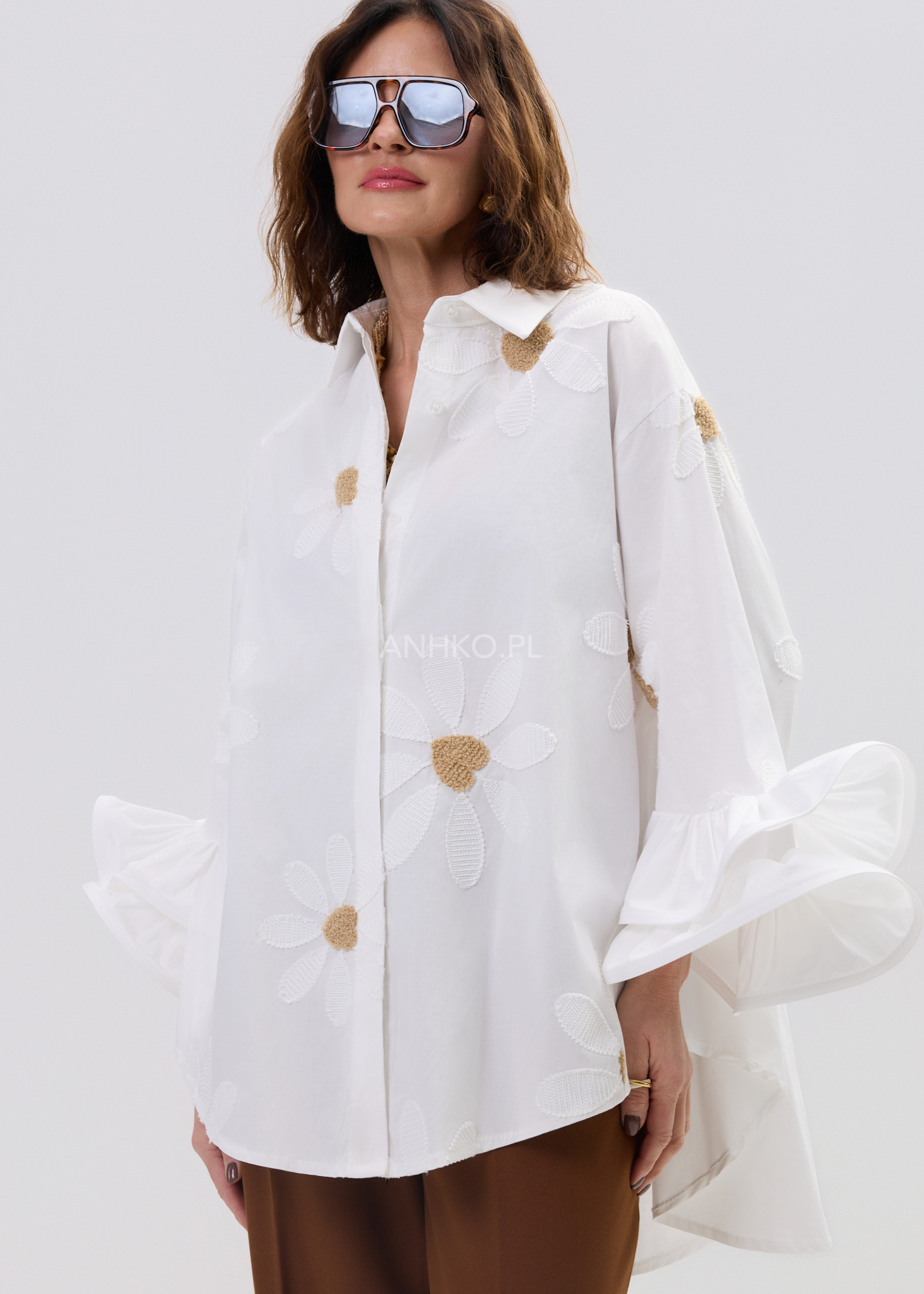 Największą uwagę przyciągają haftowane stokrotki z beżowym środkiem oraz rękawy wykończone falbaną, które nadają koszuli wyjątkowego charakteru. Klasyczny kołnierz i zapięcie na guziki równoważą romantyczny design, dzięki czemu model sprawdzi się zarówno w codziennych stylizacjach, jak i w bardziej dopracowanych zestawach.