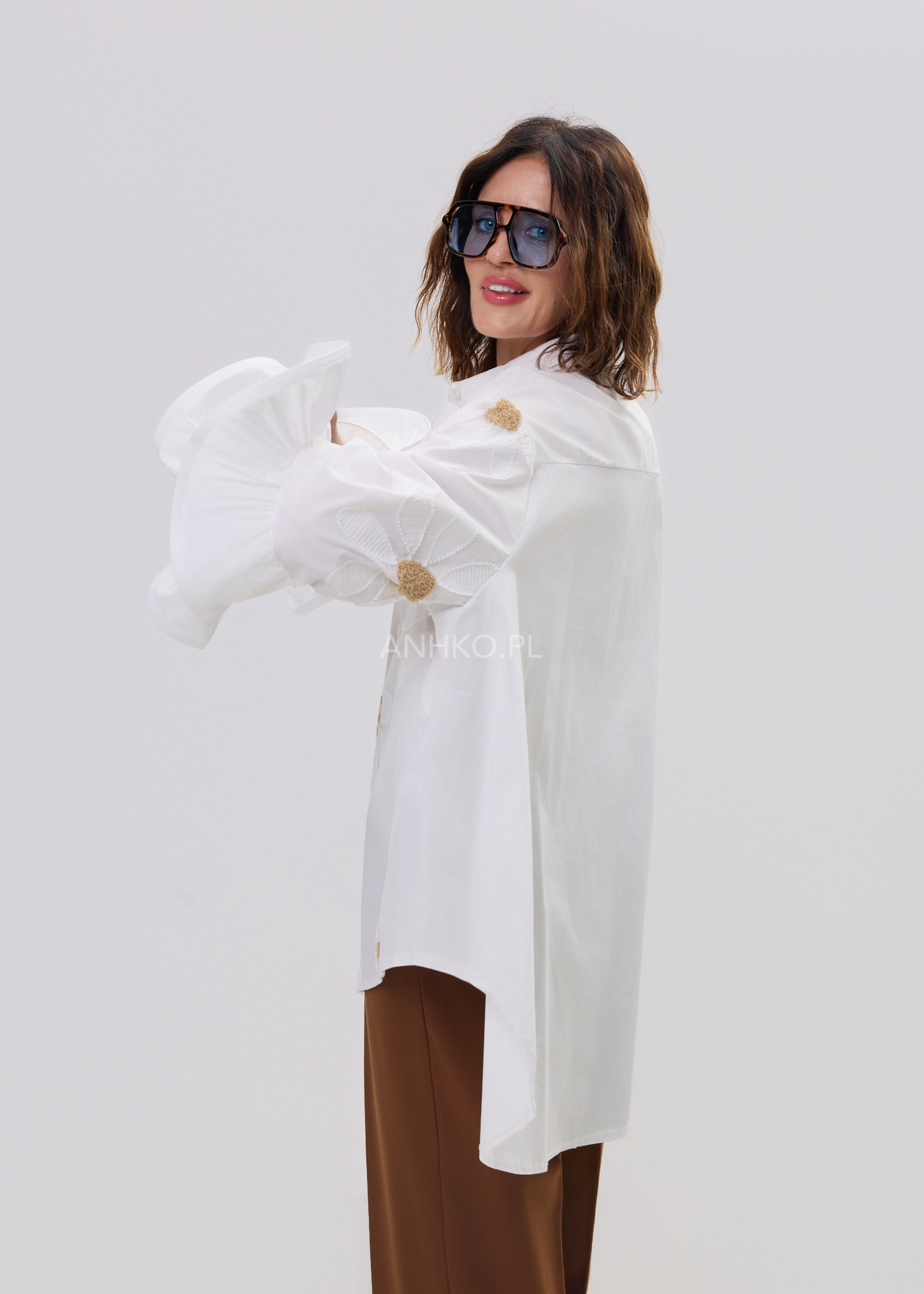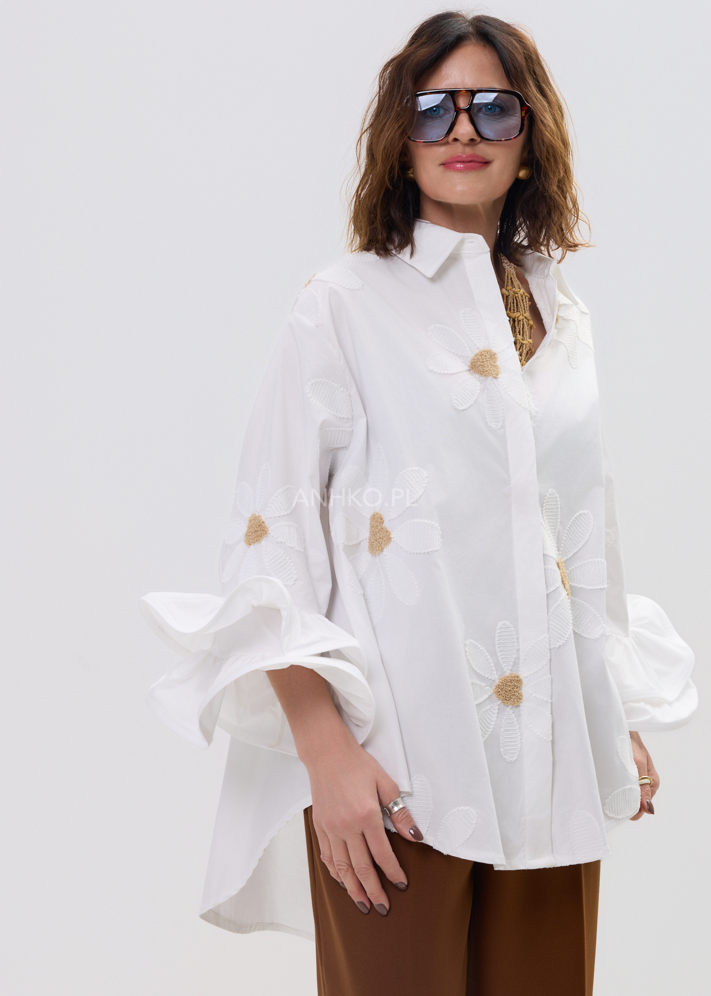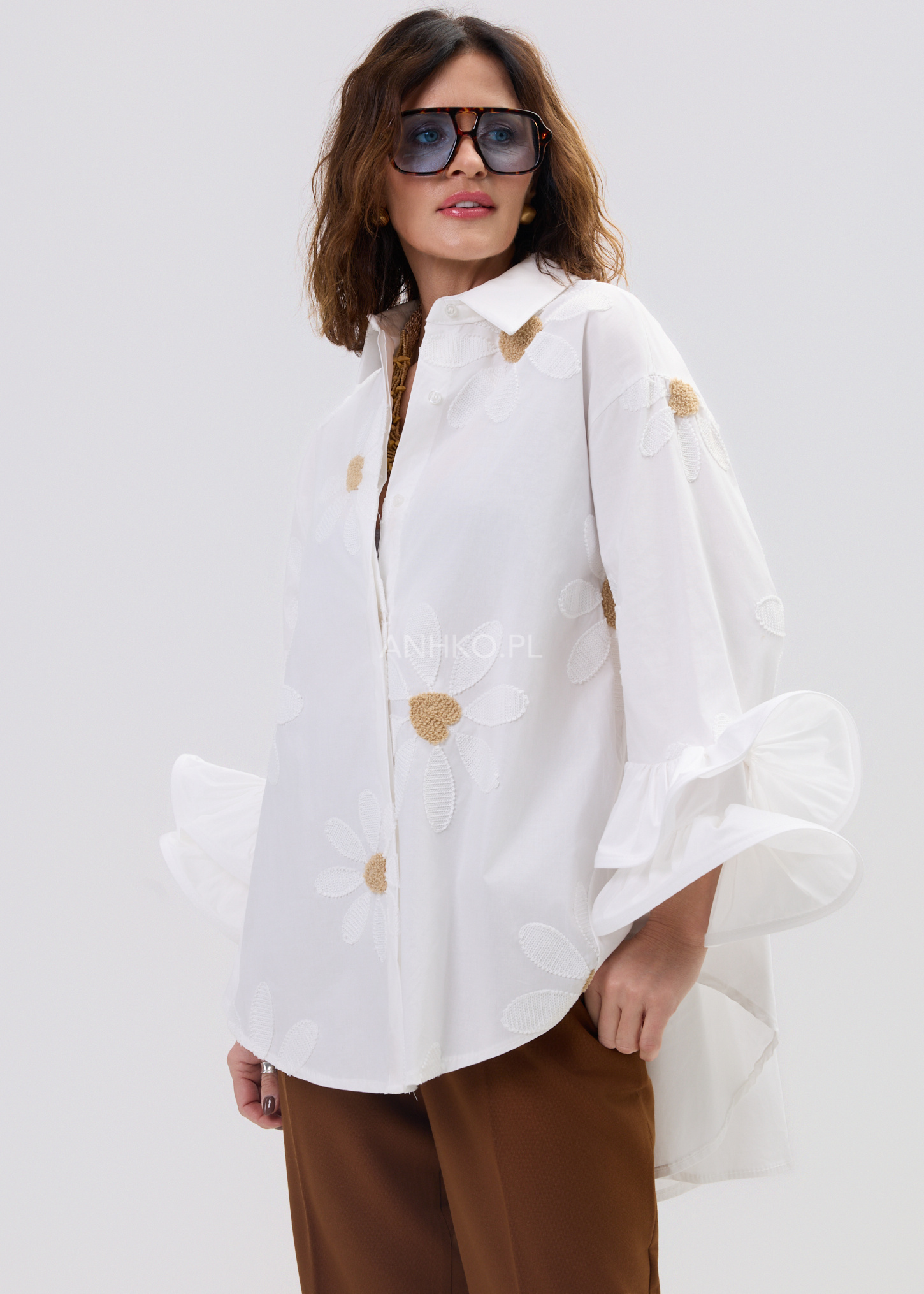 Największą uwagę przyciągają haftowane stokrotki z beżowym środkiem oraz rękawy wykończone falbaną, które nadają koszuli wyjątkowego charakteru. Klasyczny kołnierz i zapięcie na guziki równoważą romantyczny design, dzięki czemu model sprawdzi się zarówno w codziennych stylizacjach, jak i w bardziej dopracowanych zestawach.