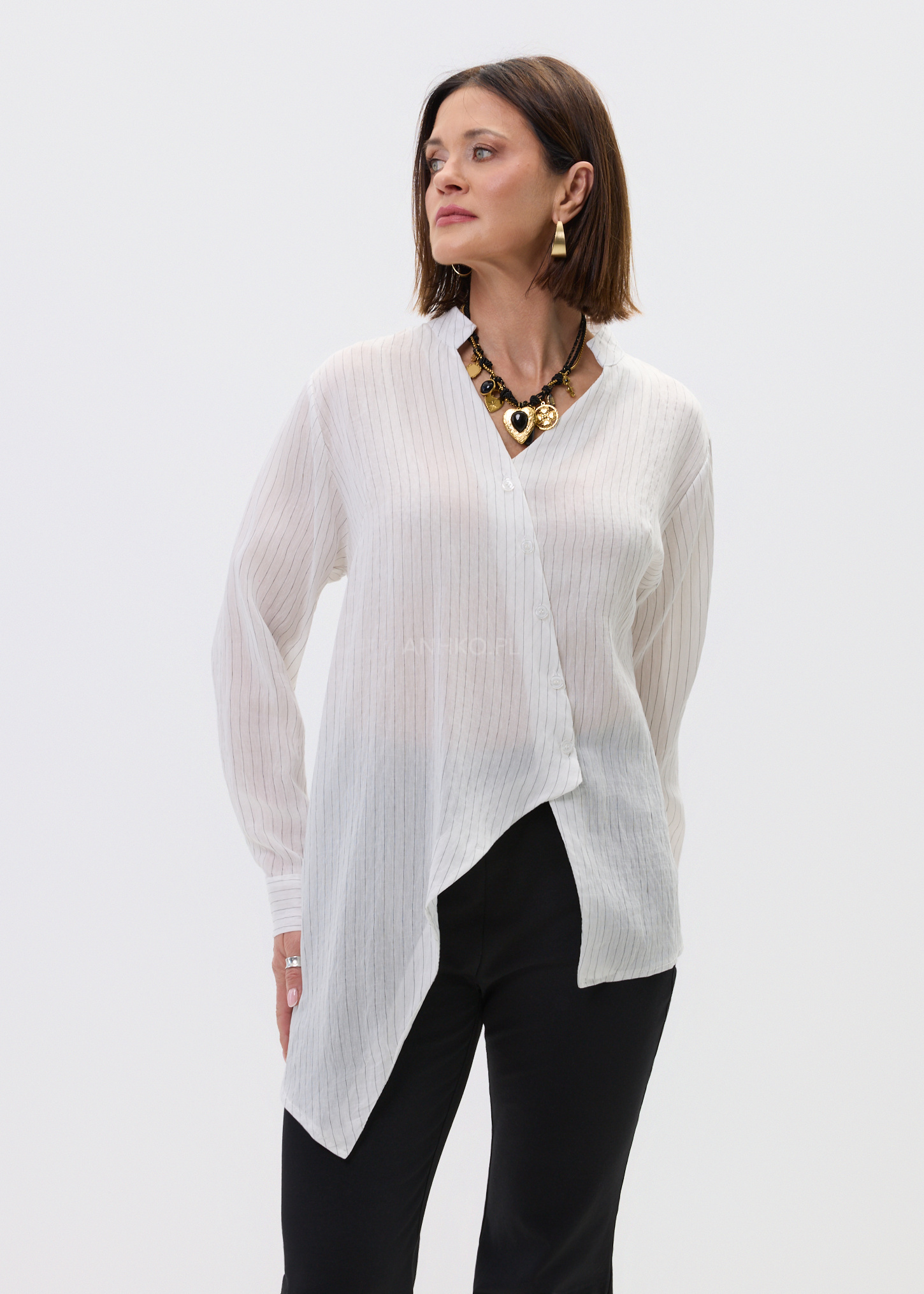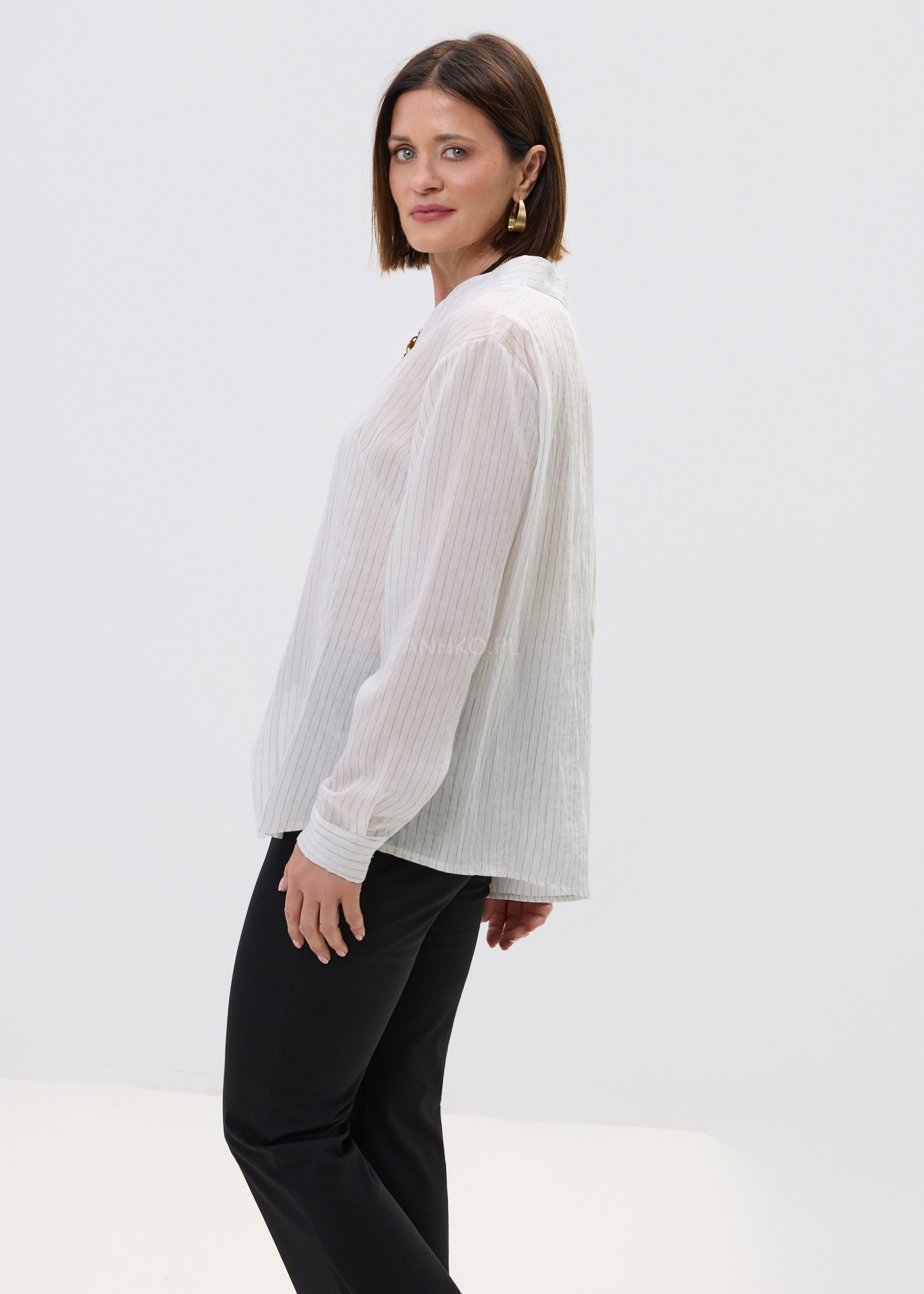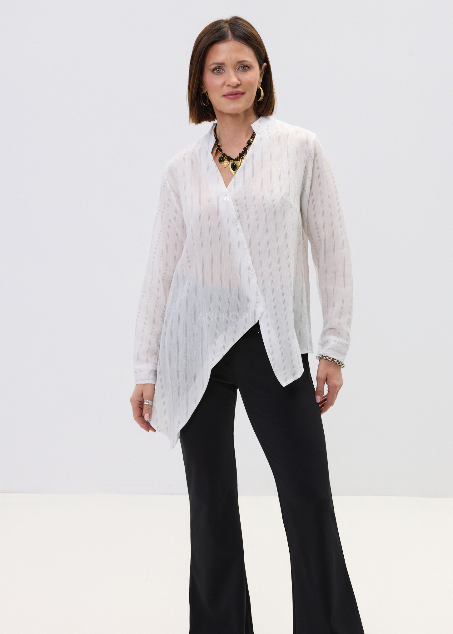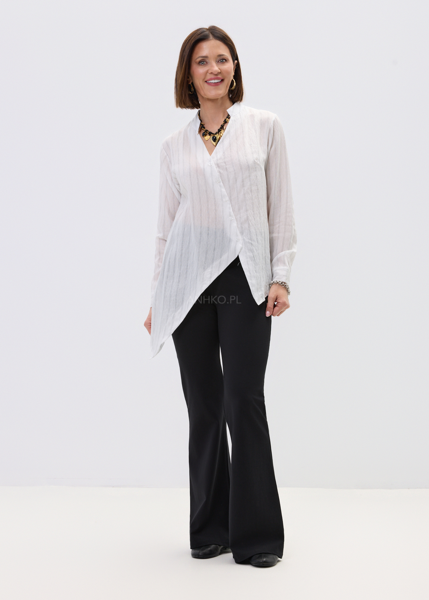 Ta koszula damska o luźnym fasonie delikatnie opływa sylwetkę, tworząc lekki i swobodny efekt. Asymetryczny dół nadaje jej nowoczesnego charakteru, a pionowe prążki optycznie wysmuklają całość. Dekolt w literę V subtelnie eksponuje szyję, dzięki czemu model prezentuje się lekko i kobieco.