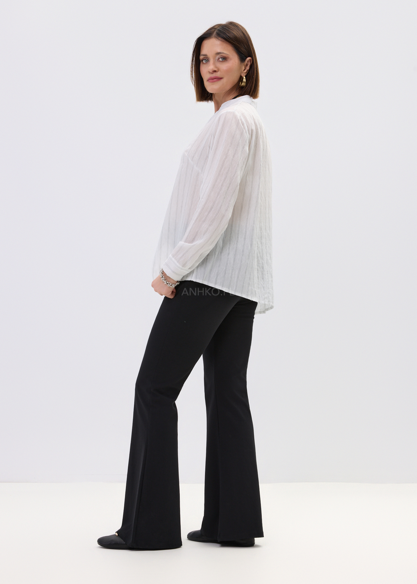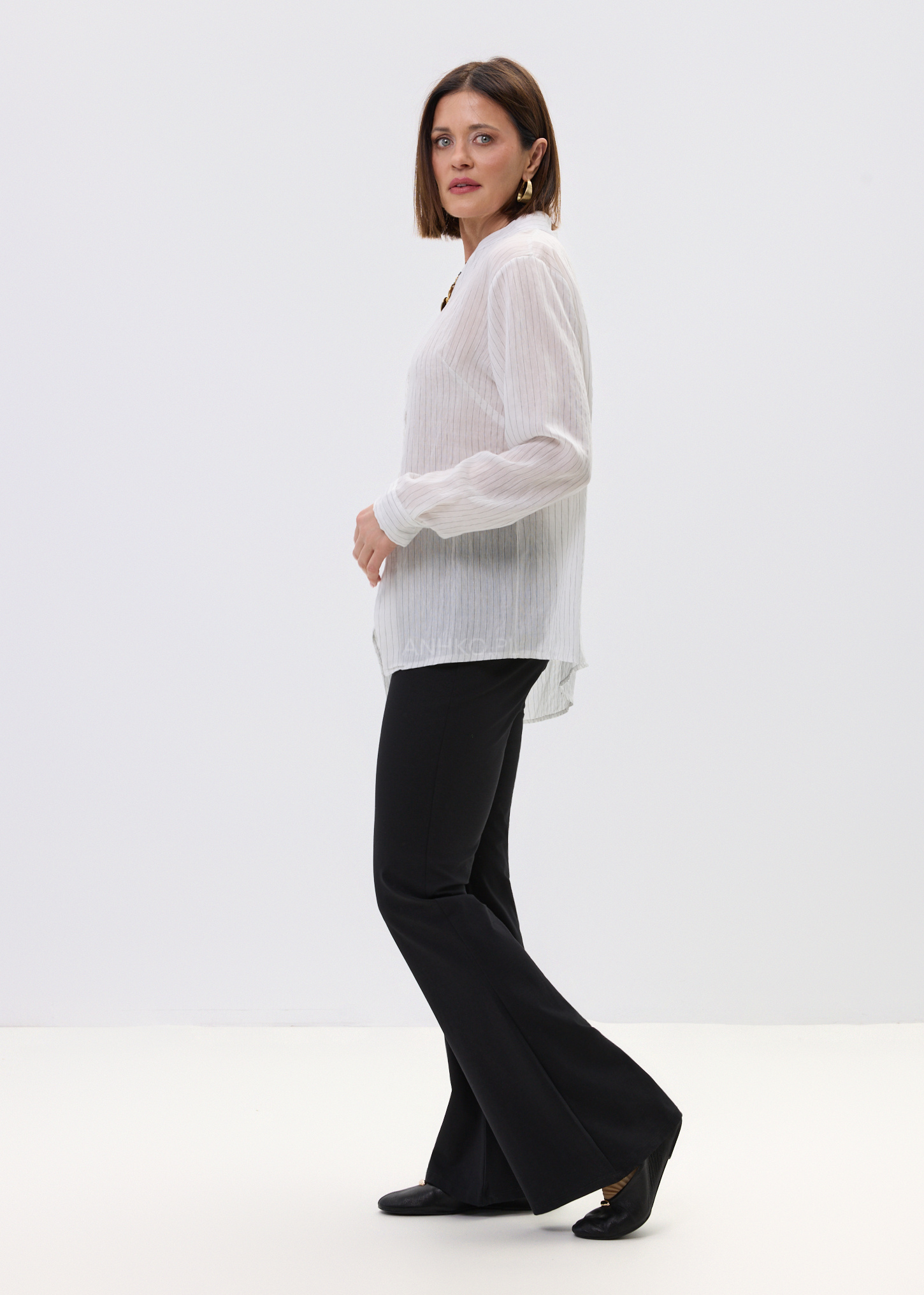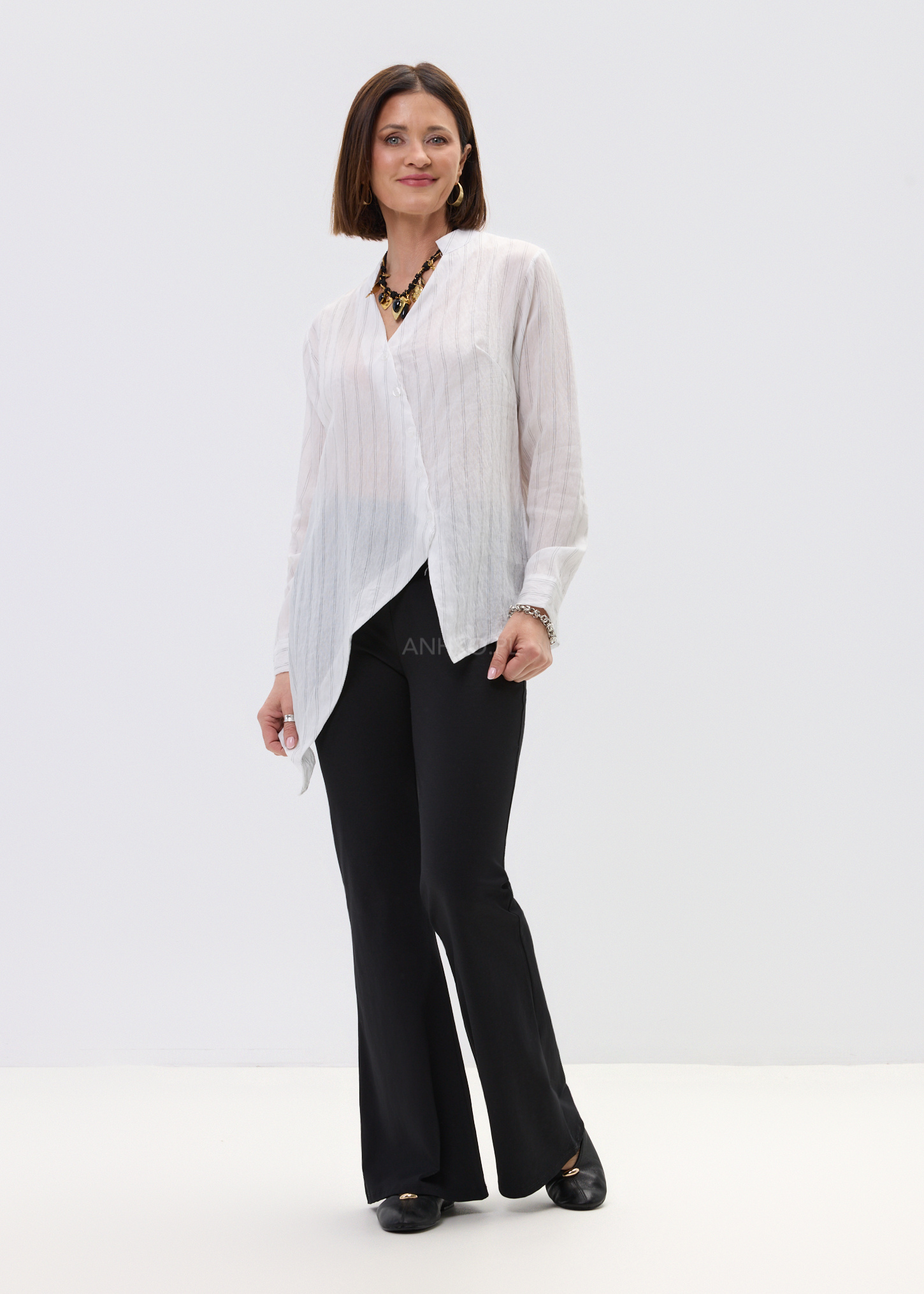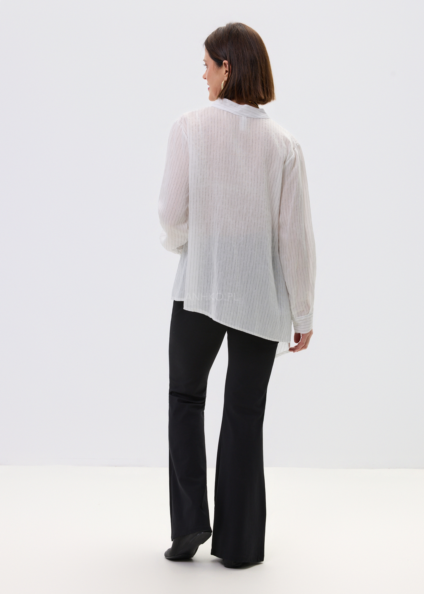 Ta koszula damska o luźnym fasonie delikatnie opływa sylwetkę, tworząc lekki i swobodny efekt. Asymetryczny dół nadaje jej nowoczesnego charakteru, a pionowe prążki optycznie wysmuklają całość. Dekolt w literę V subtelnie eksponuje szyję, dzięki czemu model prezentuje się lekko i kobieco.