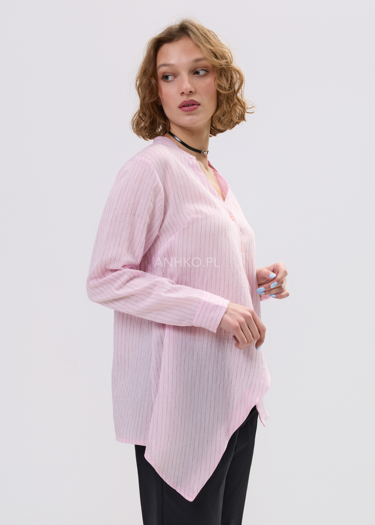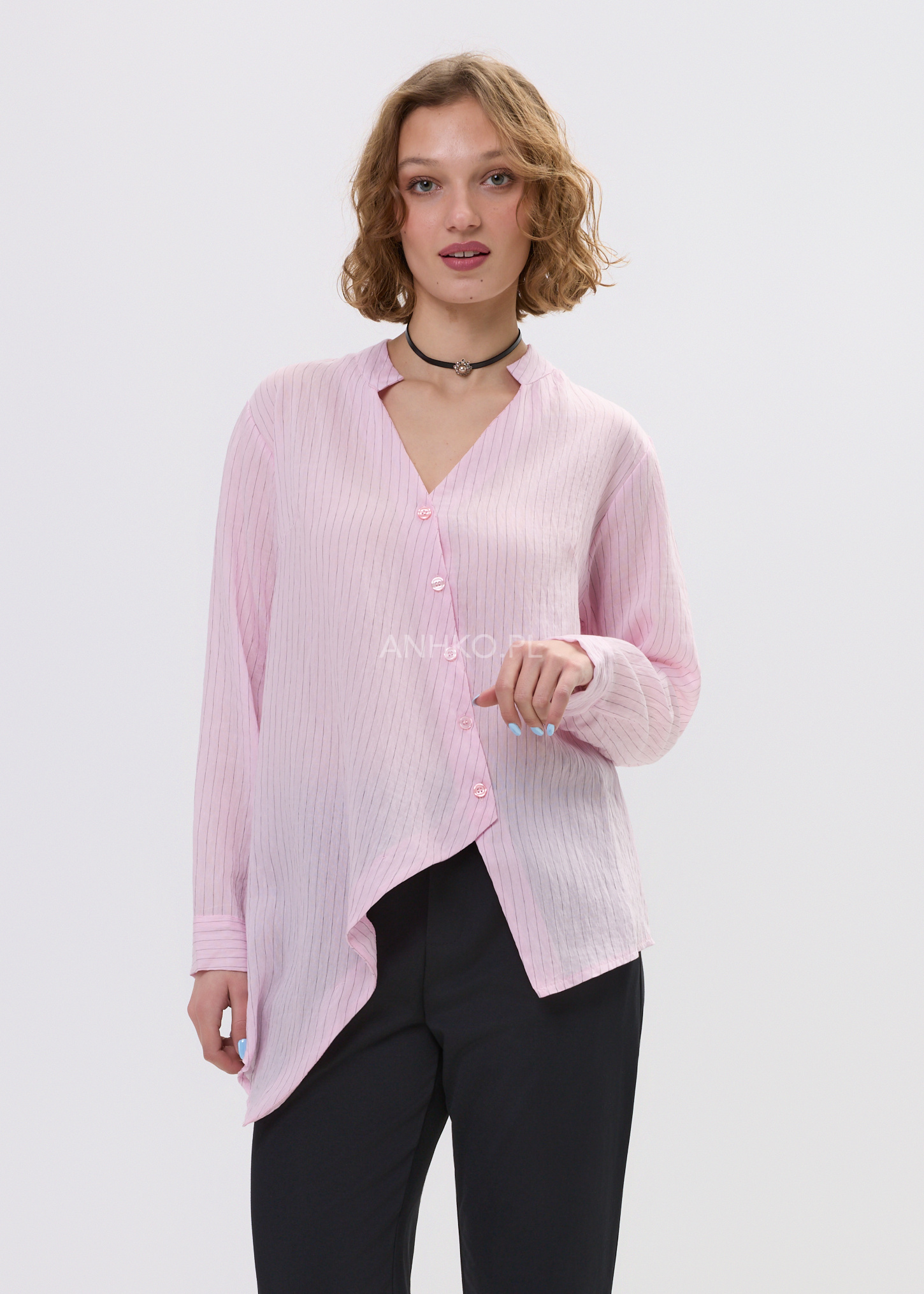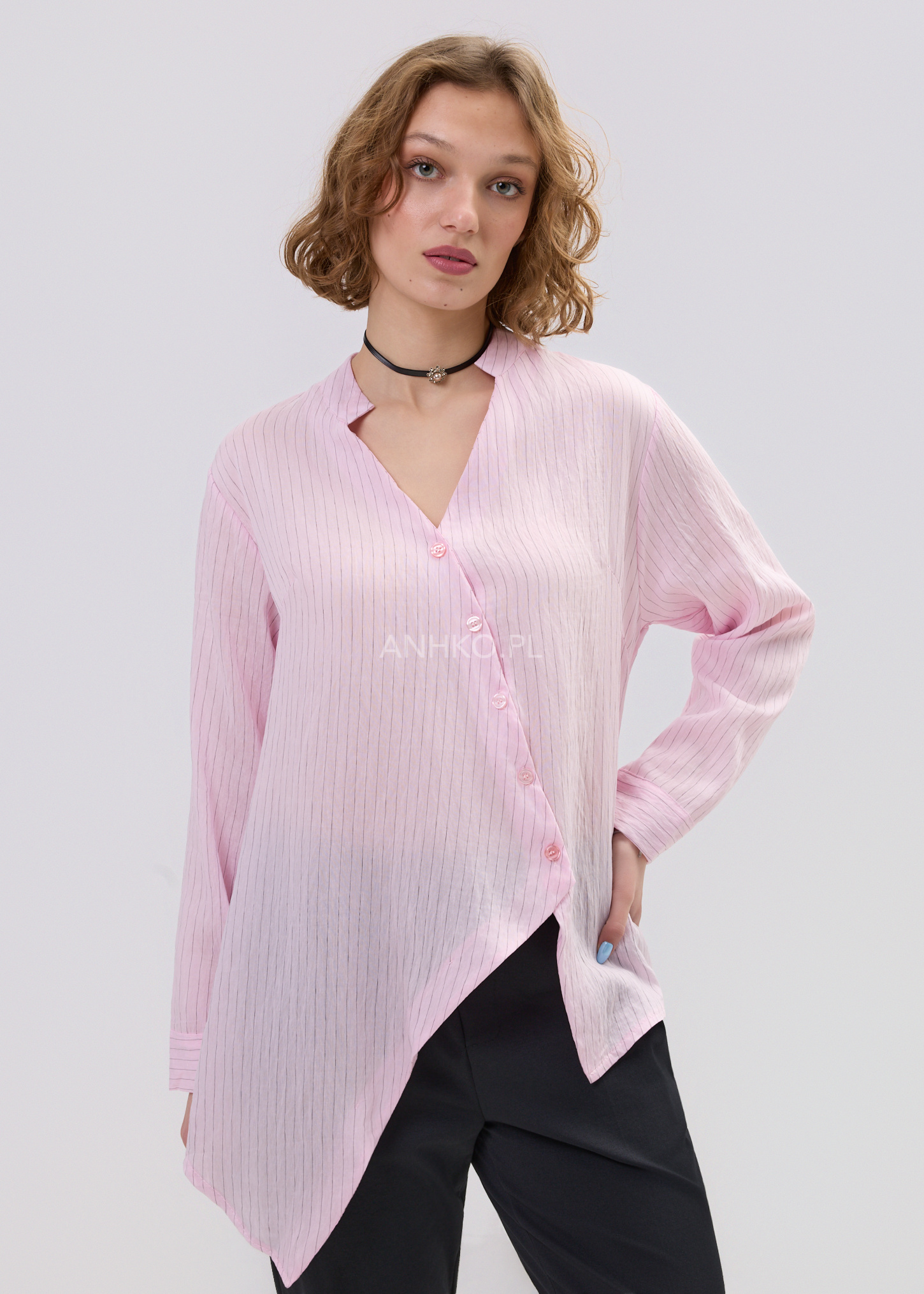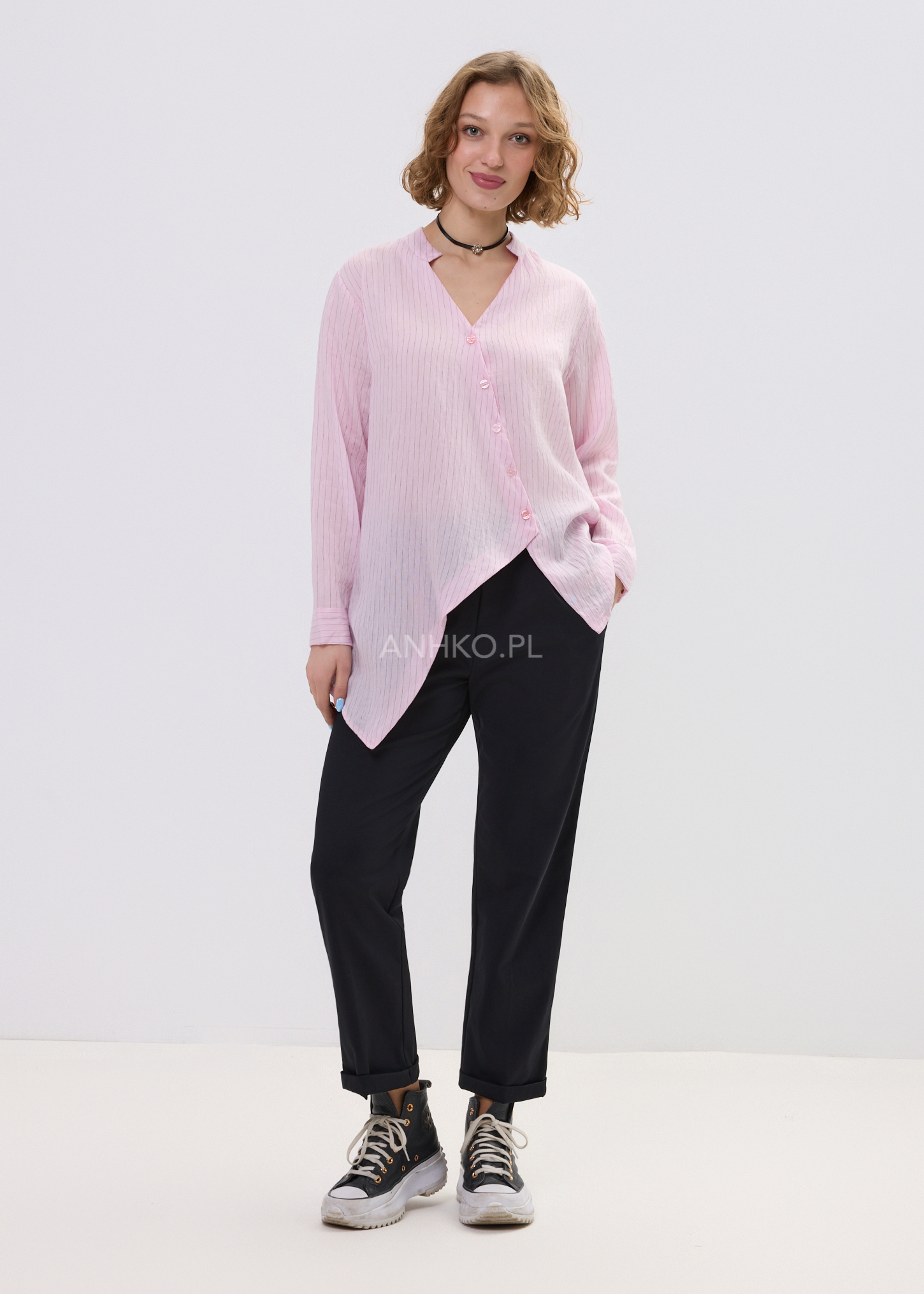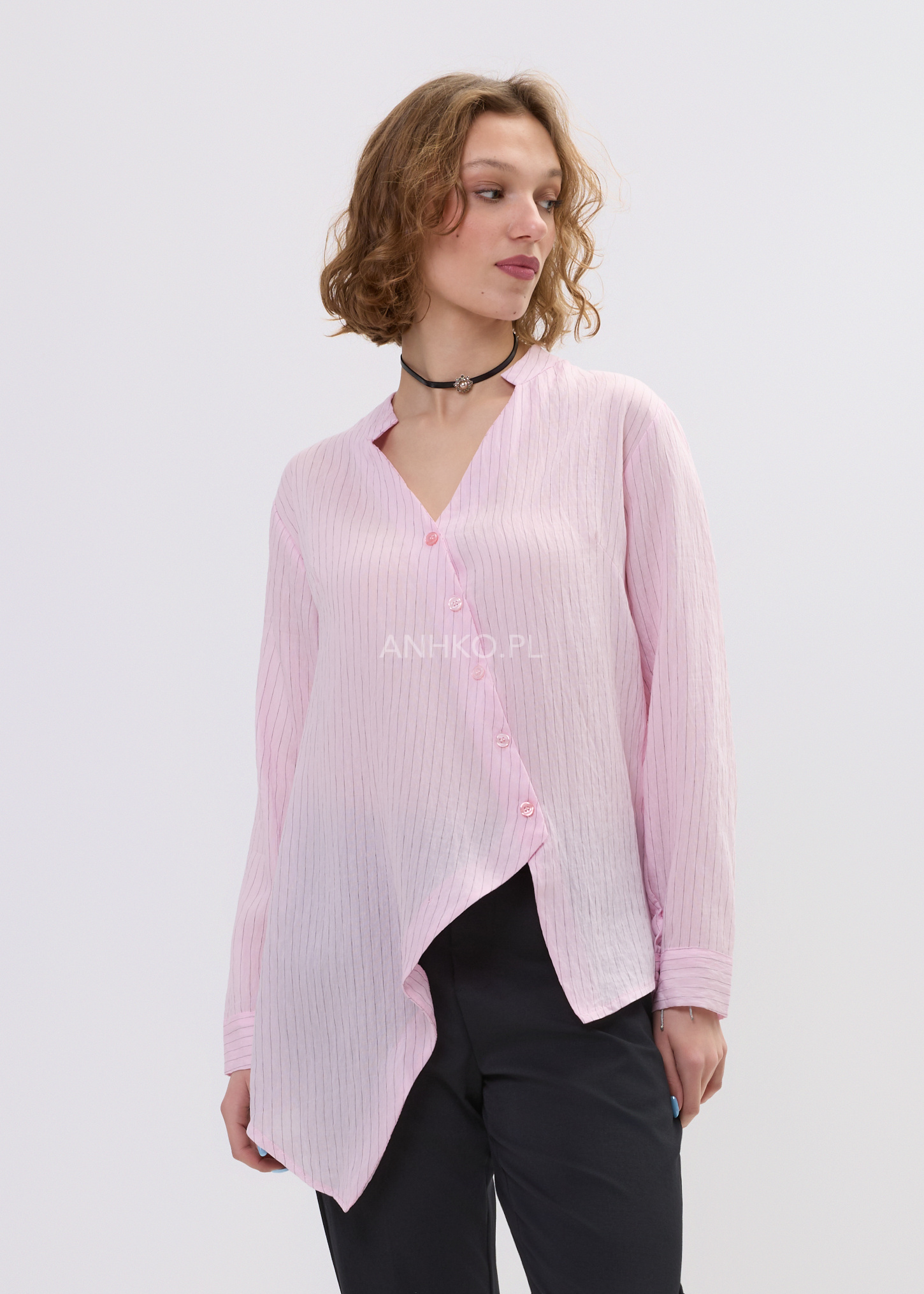 Ta koszula damska o luźnym fasonie delikatnie opływa sylwetkę, tworząc lekki i swobodny efekt. Asymetryczny dół nadaje jej nowoczesnego charakteru, a pionowe prążki optycznie wysmuklają całość. Dekolt w literę V subtelnie eksponuje szyję, dzięki czemu model prezentuje się lekko i kobieco.