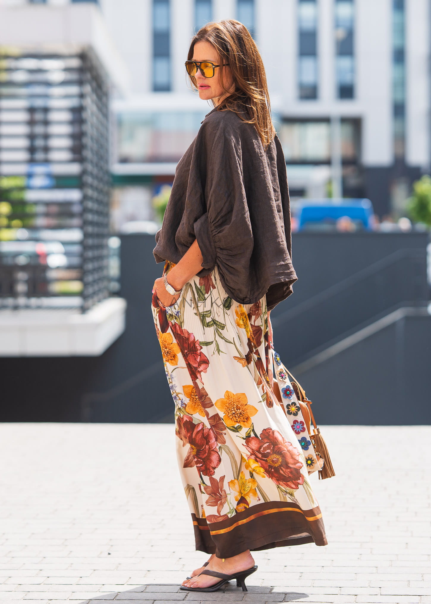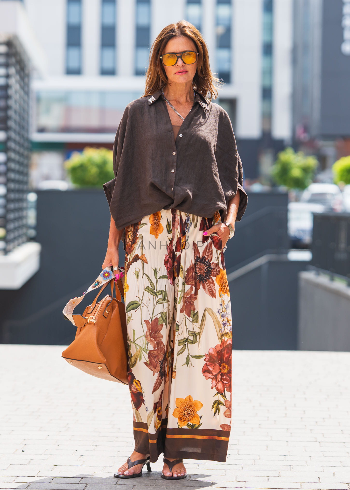 To kobieca koszula z lekkiego, 100% lnu, zaprojektowana z myślą o stylowych i wygodnych letnich stylizacjach. Brązowy kolor w połączeniu z błyszczącymi aplikacjami na kołnierzyku i mankietach dodaje całości nuty glamour. Luźny krój z wiązaniem z przodu tworzy efekt nonszalanckiej elegancji. Koszula sprawdzi się zarówno w zestawieniu z białymi spodniami, szortami czy spódnicą, jak i jako kontrast do jeansu. Doskonała na codzienne wyjścia, wieczorne spotkania i letnie wydarzenia.