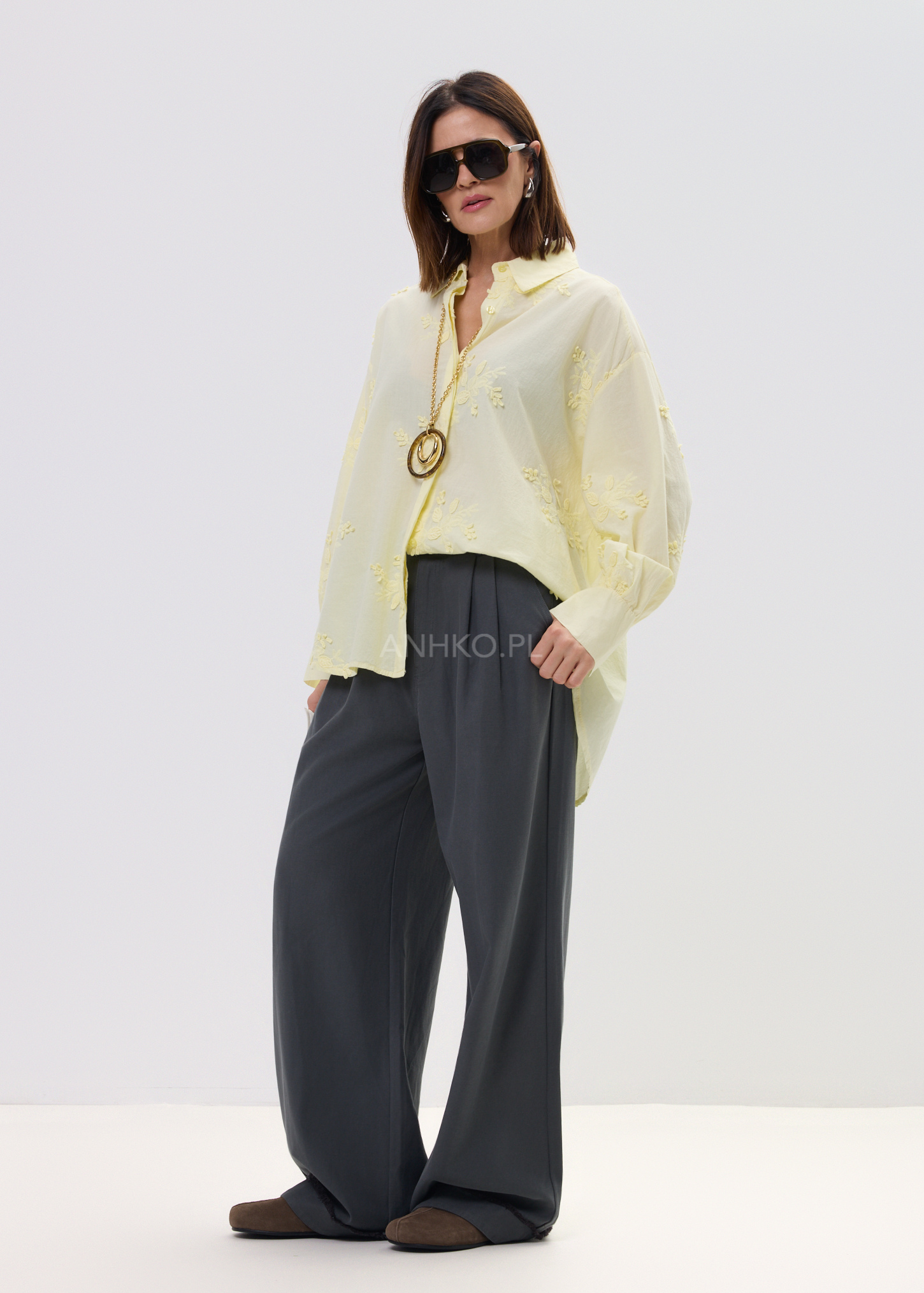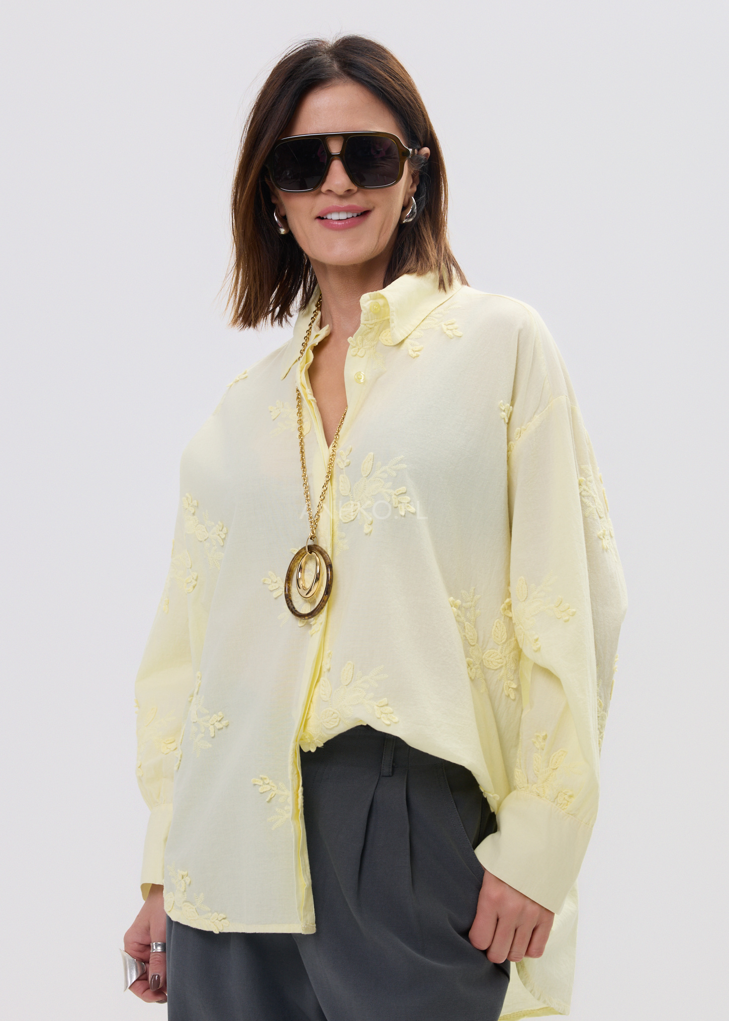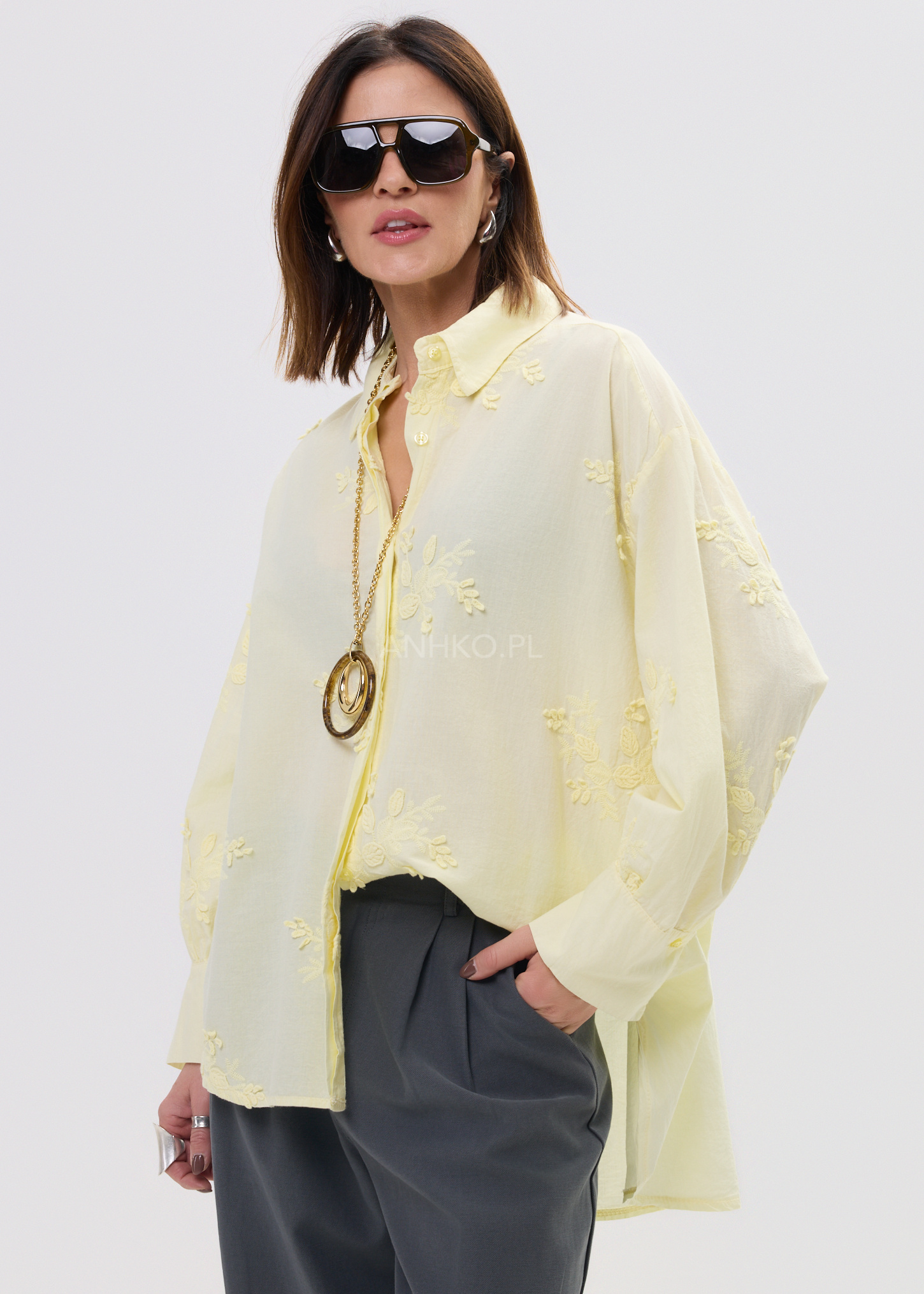 Ta koszula damska o luźnym, oversize’owym kroju miękko układa się na sylwetce, tworząc naturalny, niewymuszony efekt. Lekka tkanina delikatnie opływa ciało, zapewniając pełną swobodę ruchów, a subtelne hafty nadają całości wyjątkowego charakteru. To model, który łączy komfort noszenia z dopracowanym detalem.