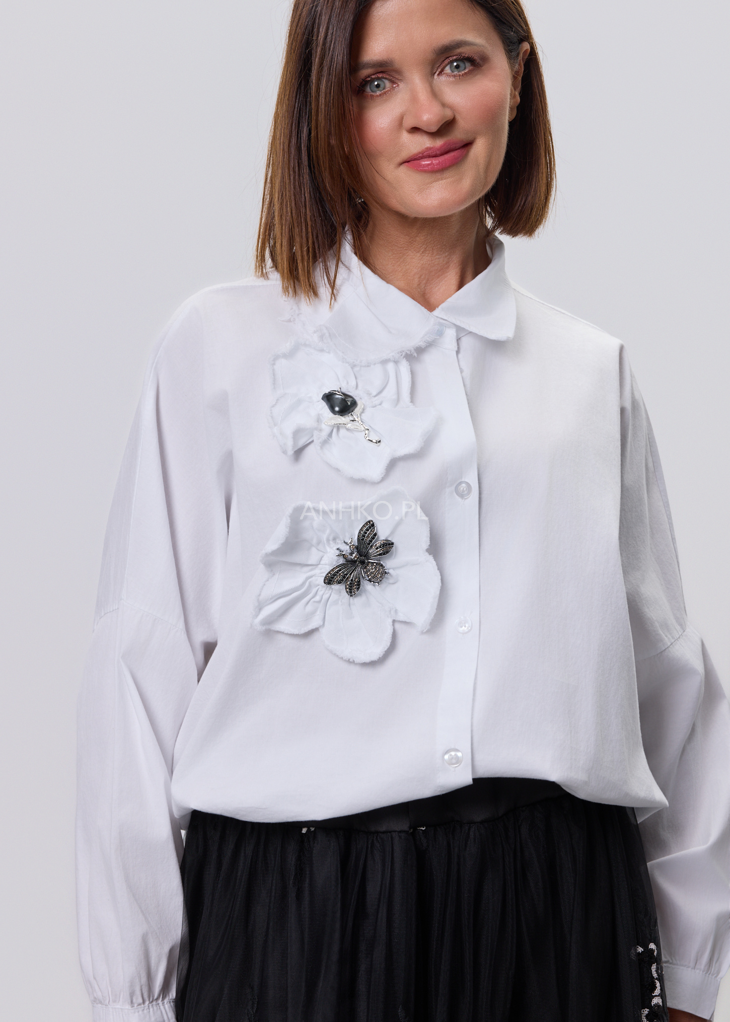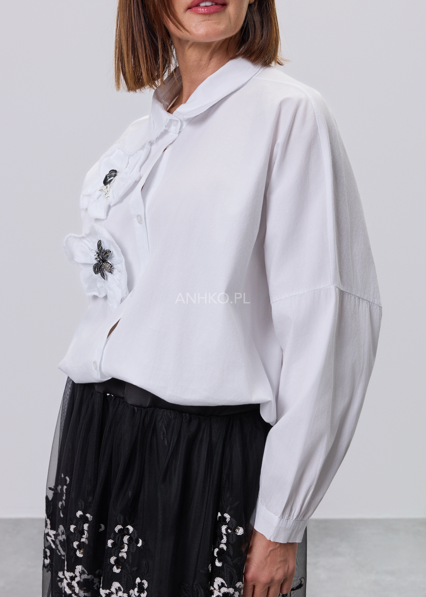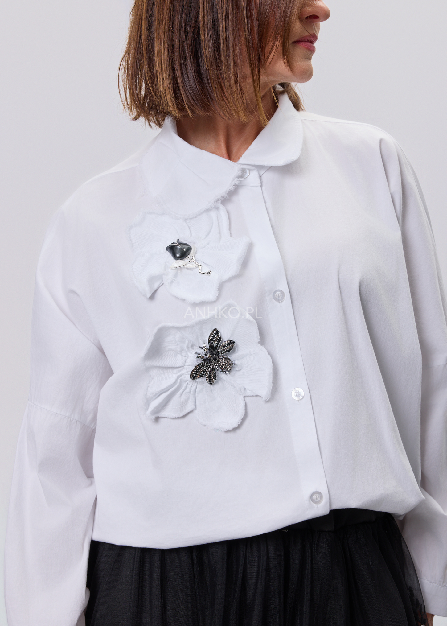 Ta koszula to połączenie wygody, lekkości i subtelnego detalu. Swobodny krój zapewnia komfort noszenia przez cały dzień, a miękka, elastyczna tkanina dopasowuje się do sylwetki bez uczucia sztywności. Ozdobne, przestrzenne aplikacje po jednej stronie przodu nadają całości unikalnego charakteru i sprawiają, że model wyróżnia się na tle klasycznych koszul. Koszula zapinana jest na guziki, bez podszewki, co czyni ją lekką i przewiewną. Doskonale sprawdzi się w zestawieniu z jeansami, spodniami materiałowymi lub spódnicą. Można ją nosić na co dzień, do pracy w stylu smart casual, na spotkania, wyjścia do miasta czy spokojne okazje towarzyskie.