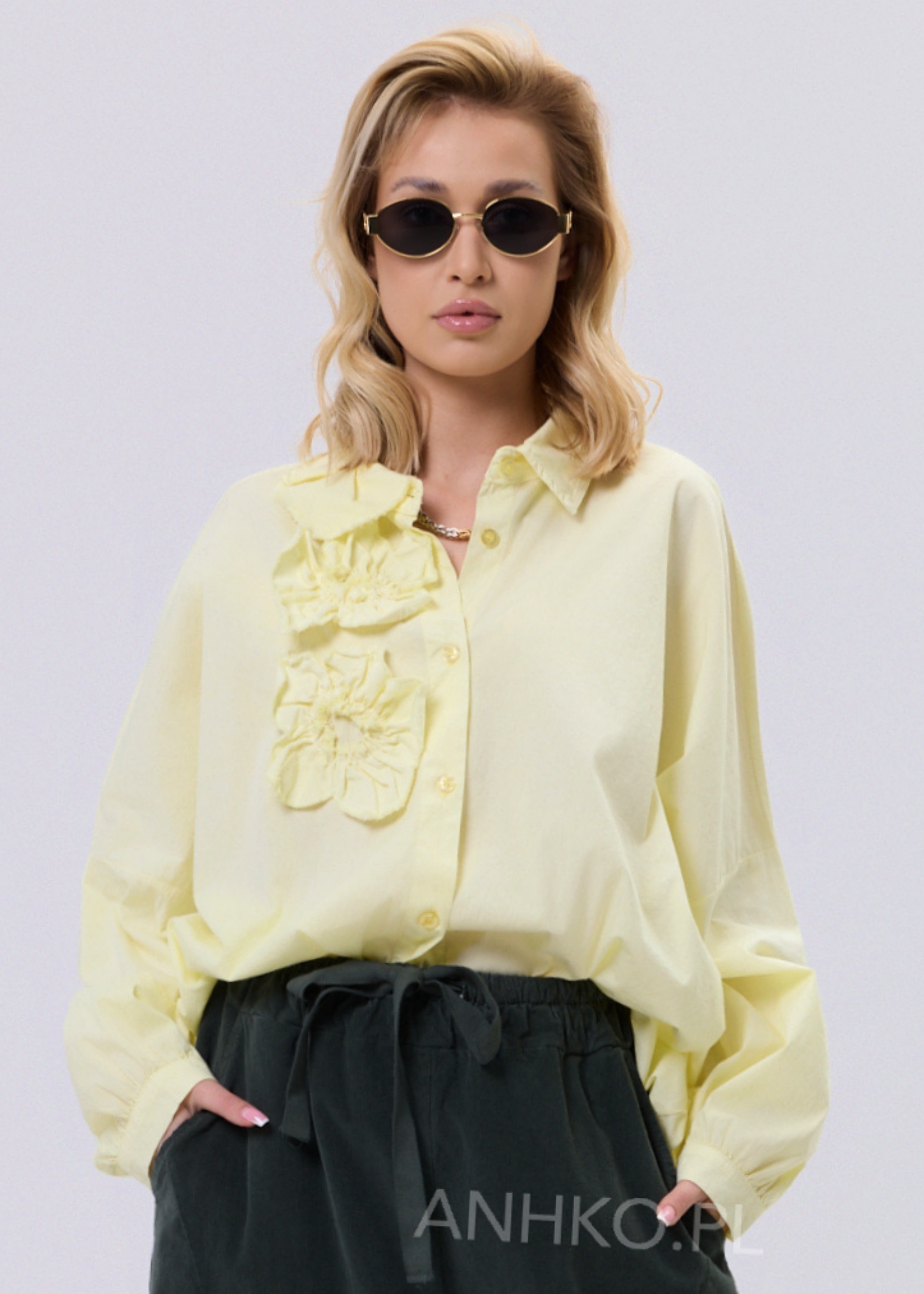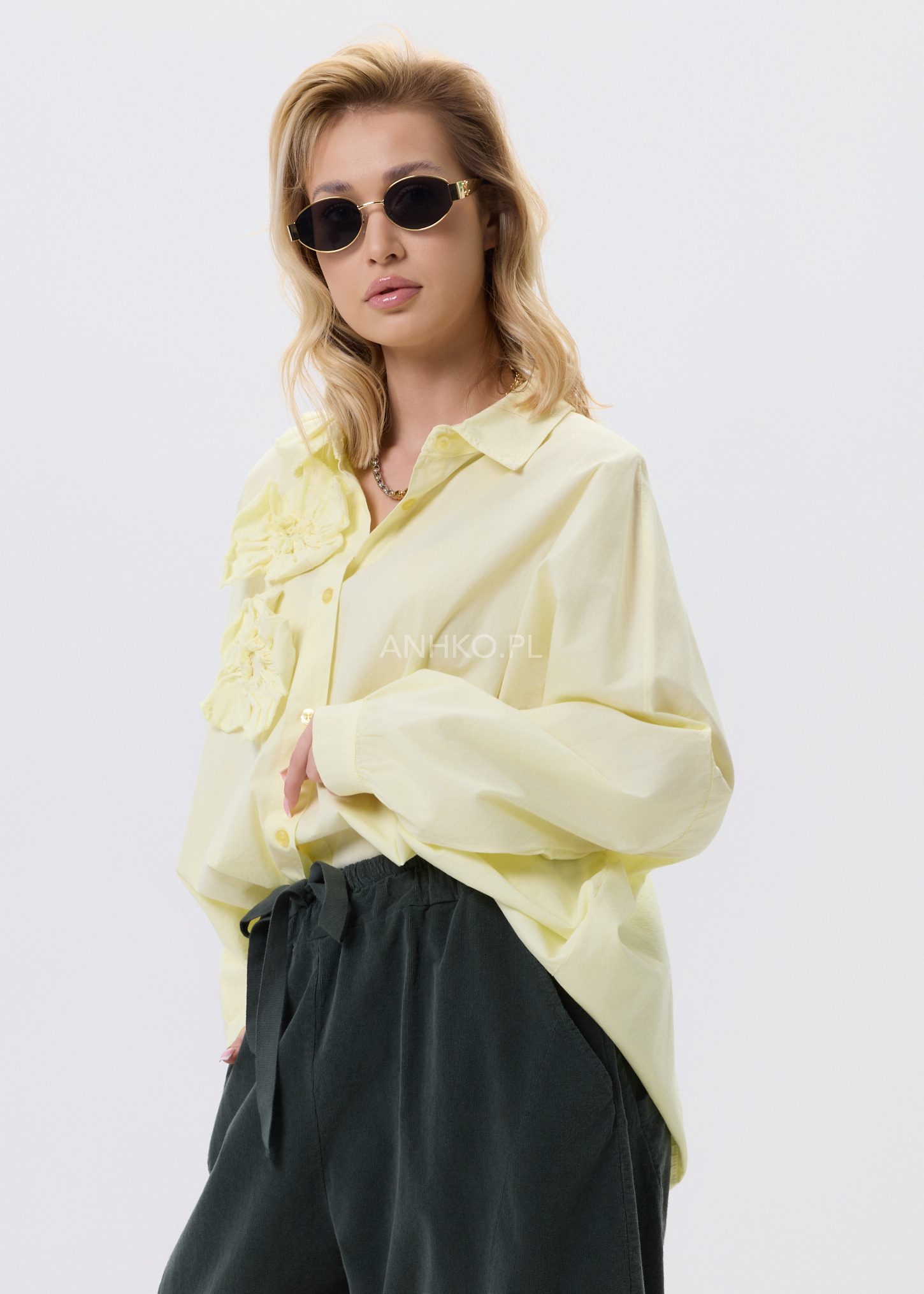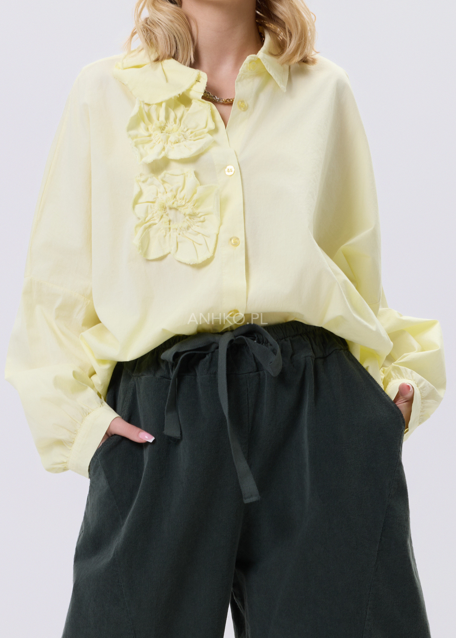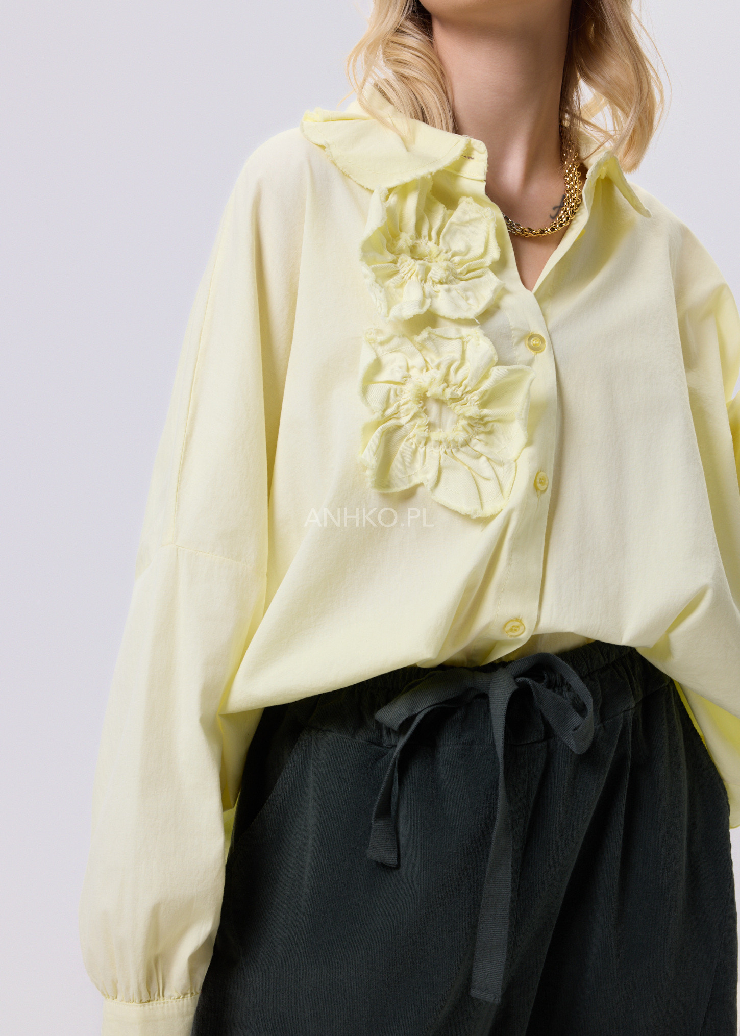 Ta koszula to połączenie wygody, lekkości i subtelnego detalu. Swobodny krój zapewnia komfort noszenia przez cały dzień, a miękka, elastyczna tkanina dopasowuje się do sylwetki bez uczucia sztywności. Ozdobne, przestrzenne aplikacje po jednej stronie przodu nadają całości unikalnego charakteru i sprawiają, że model wyróżnia się na tle klasycznych koszul. Koszula zapinana jest na guziki, bez podszewki, co czyni ją lekką i przewiewną. Doskonale sprawdzi się w zestawieniu z jeansami, spodniami materiałowymi lub spódnicą. Można ją nosić na co dzień, do pracy w stylu smart casual, na spotkania, wyjścia do miasta czy spokojne okazje towarzyskie.