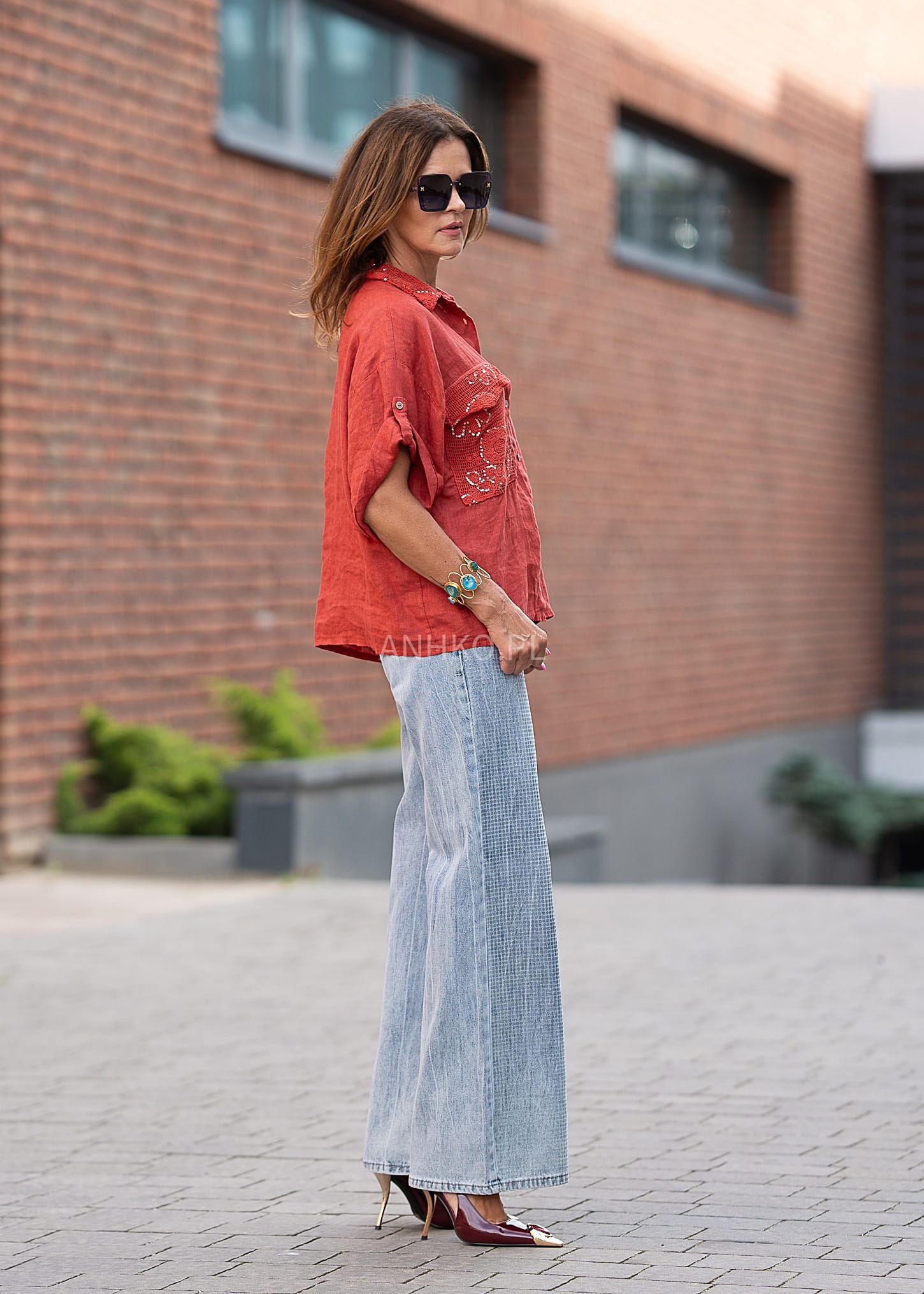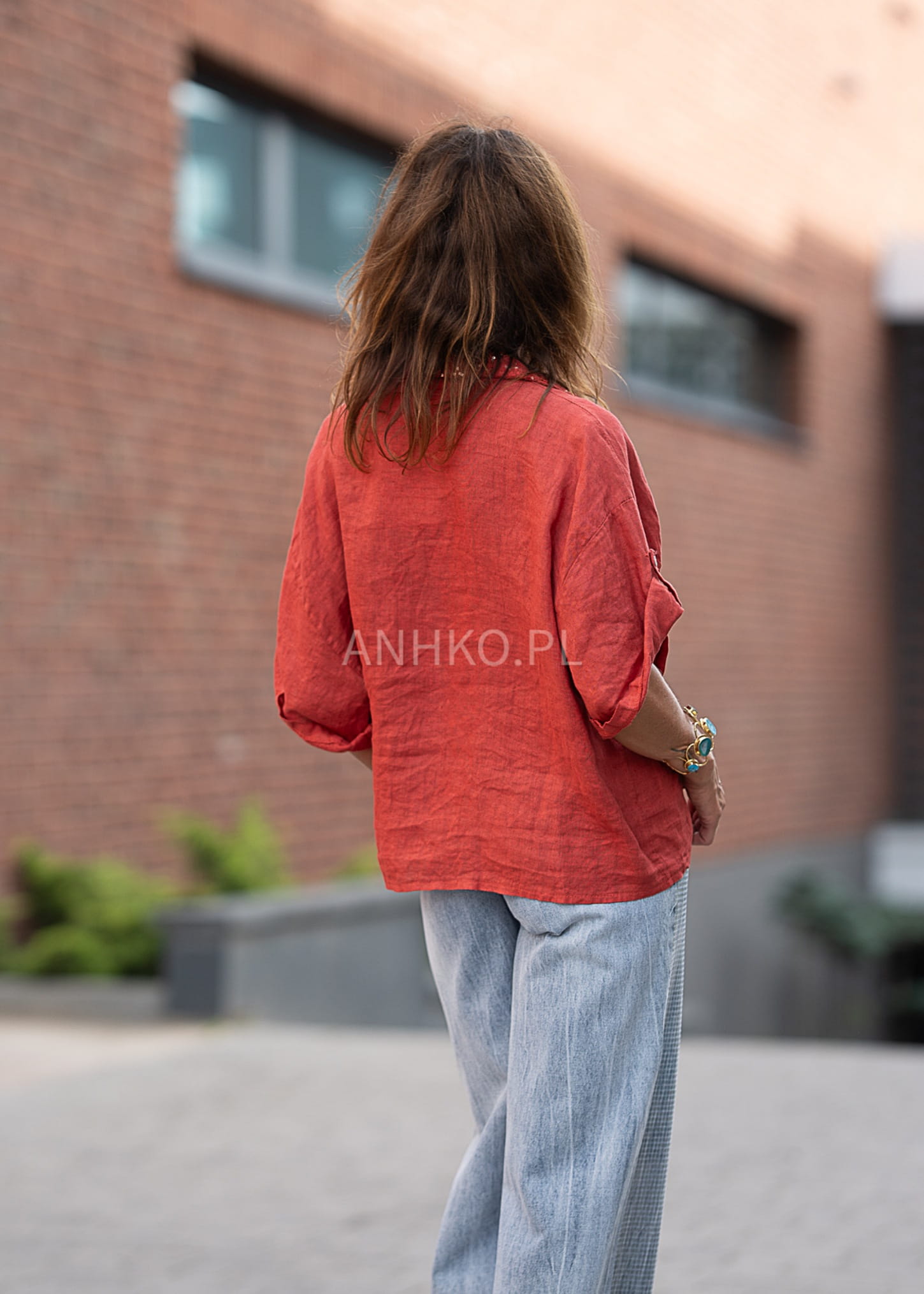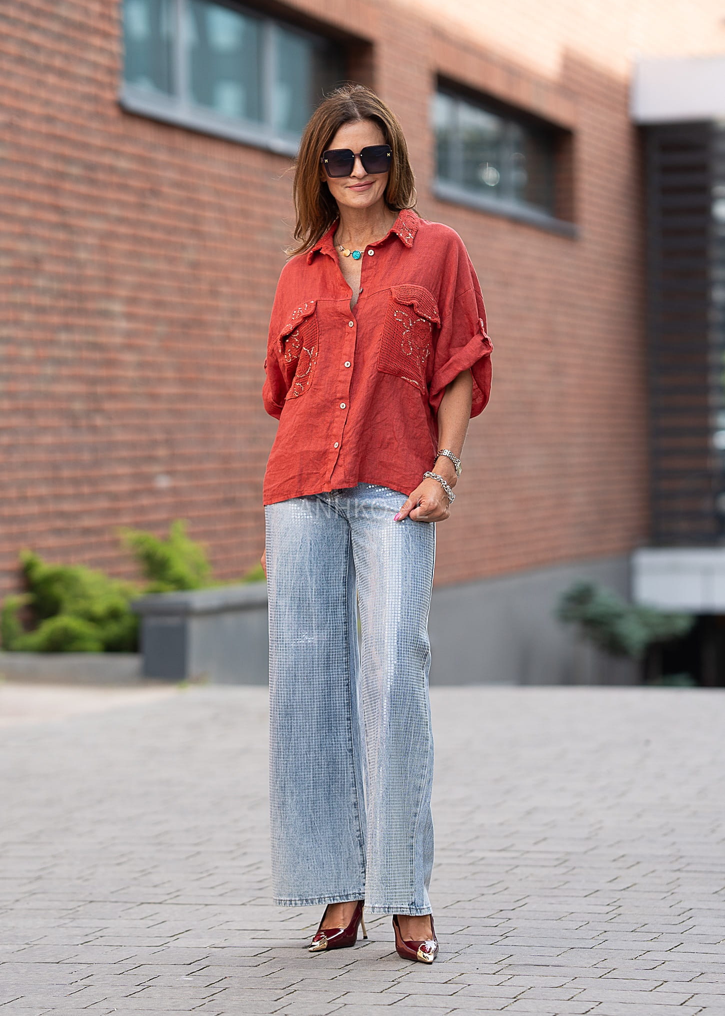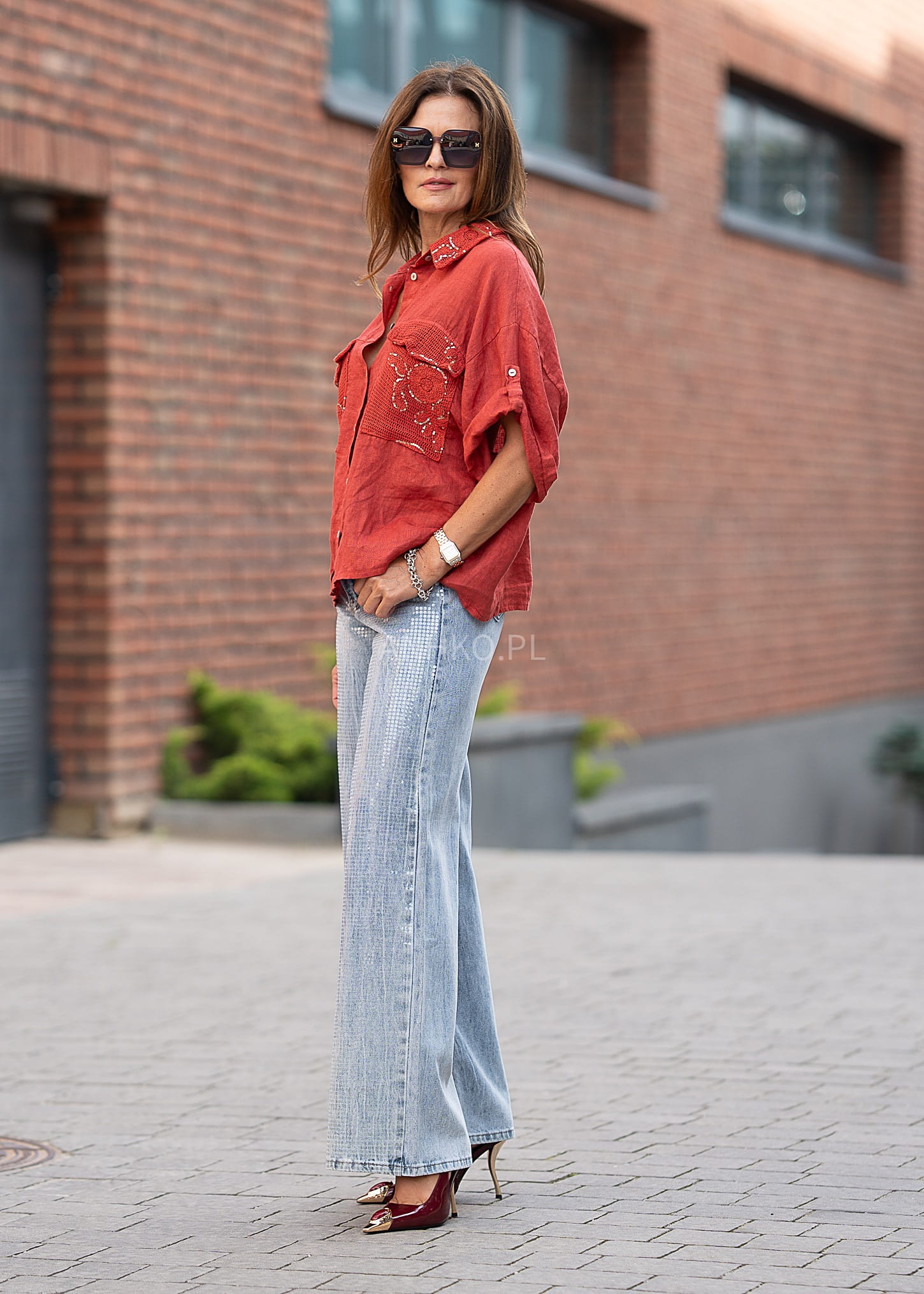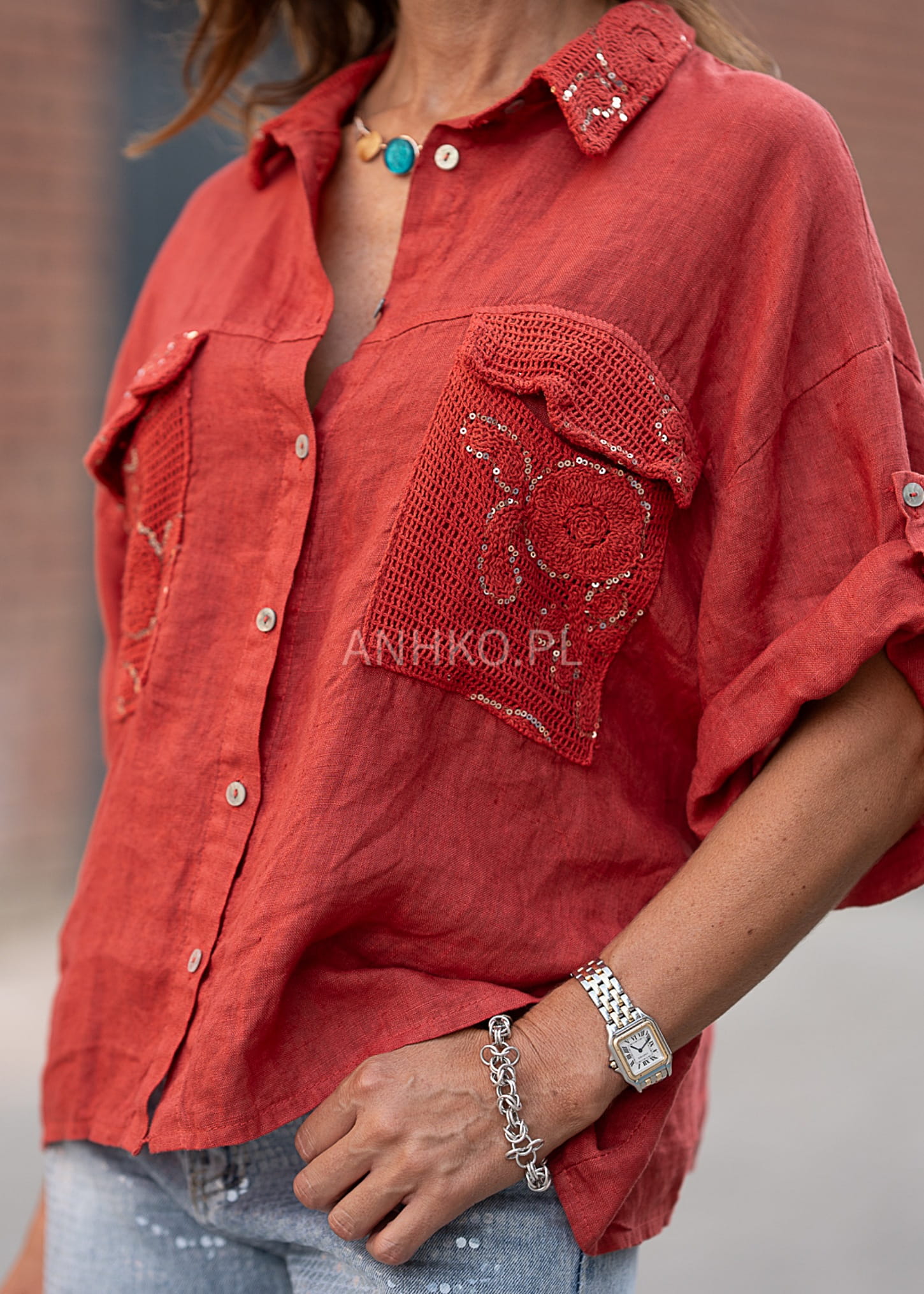 To wyjątkowa koszula w intensywnym czerwonym kolorze, która przyciąga wzrok detalami. Wykonana z naturalnego lnu, z dodatkowymi wstawkami z bawełny i poliestru, zapewnia przewiewność i wygodę. Jej najbardziej charakterystycznym elementem są ozdobne kieszenie oraz kołnierz z haftowanej siateczki udekorowanej cekinami, które dodają jej wyrazistości. Koszula zapinana jest na guziki i posiada rękawy z możliwością podpięcia. Idealna na lato, do casualowych i boho stylizacji – świetnie komponuje się z jeansami, szortami lub lnianymi spodniami. Sprawdzi się na spacer, zakupy, spotkanie z przyjaciółmi czy na wakacyjny wyjazd.