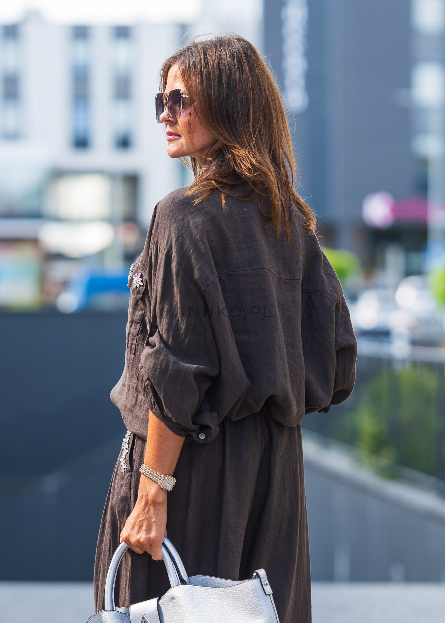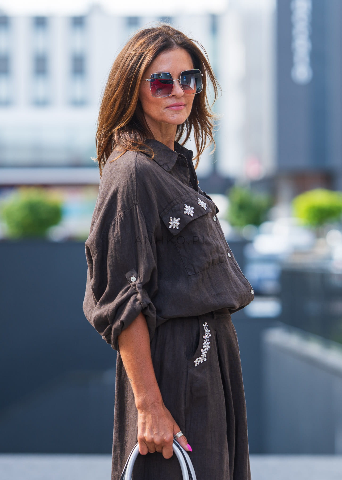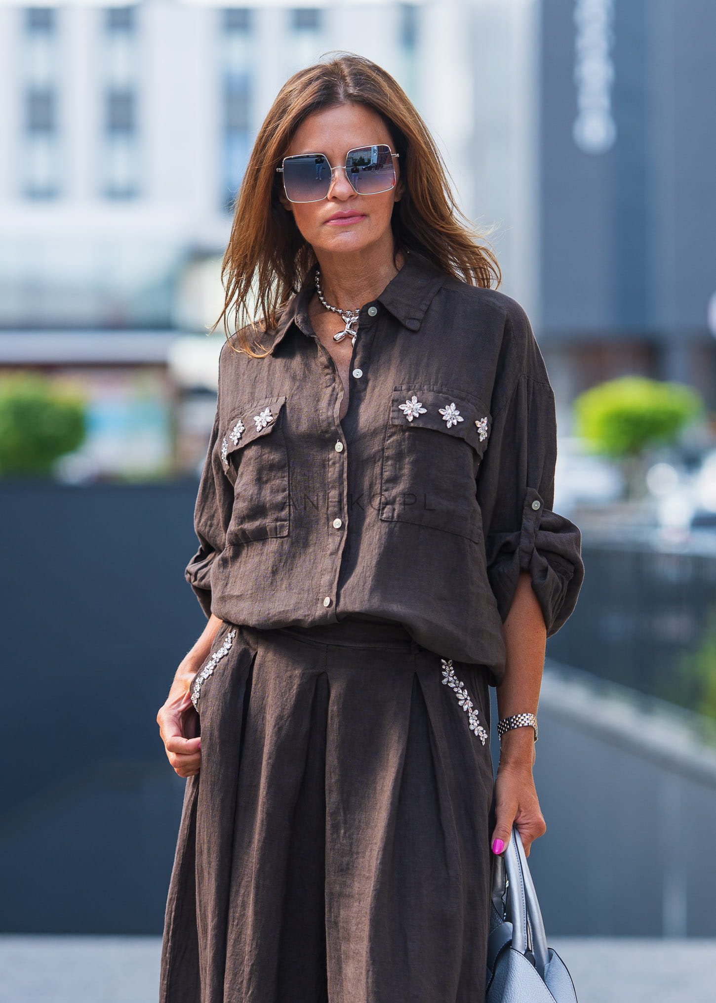 Spodnie Lniane Floral Pleat Ciemnobrązowe - Szerokie lniane spodnie z elastycznym pasem i ozdobnymi haftami – idealne na lato. Styl i wygoda w jednym!
