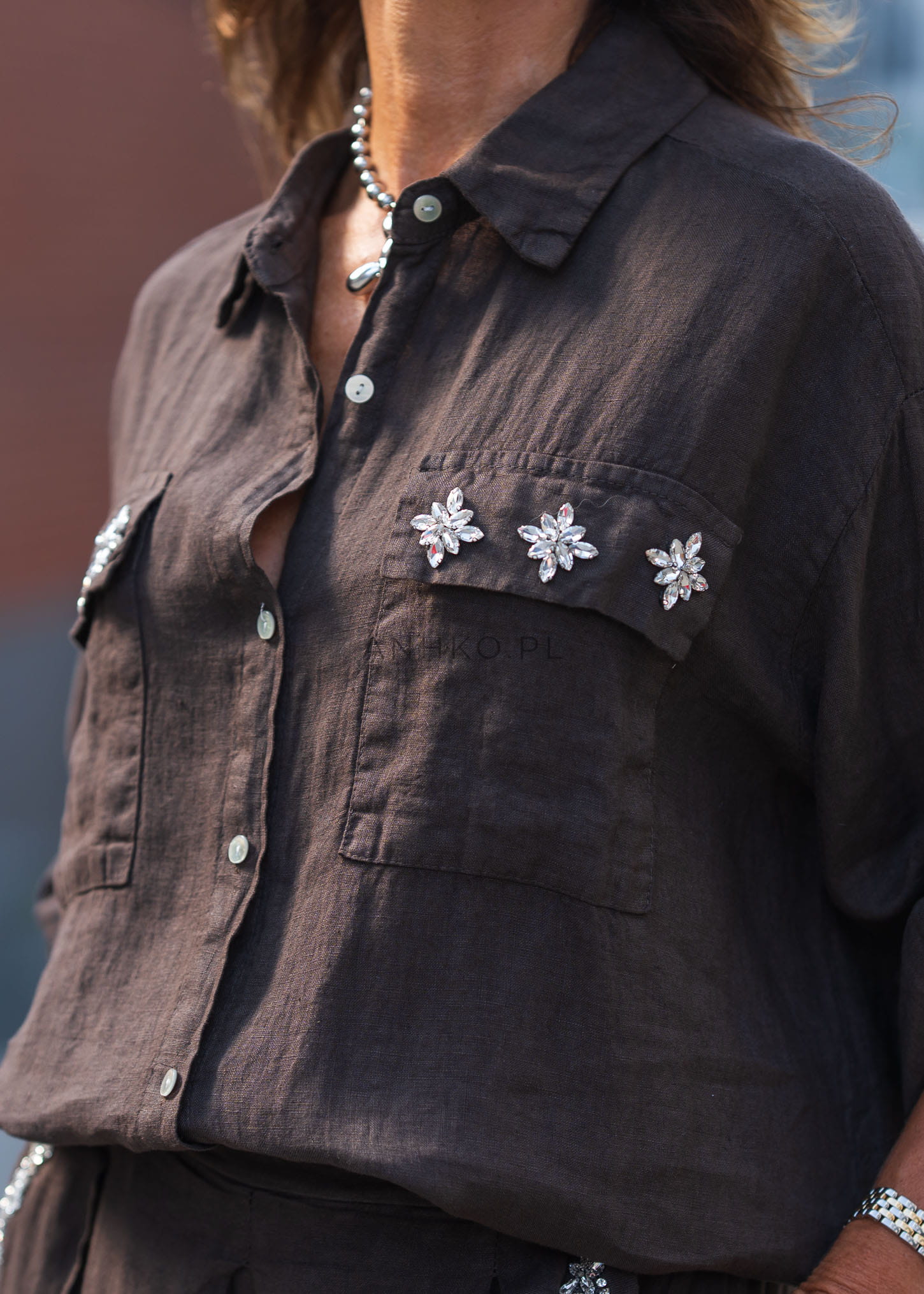 Koszula Lniana Crystal Glam Beżowa - Elegancka koszula z 100% lnu z ozdobnymi kryształkami na kieszeniach. Swobodny krój, klasyczny kołnierzyk i długi rękaw sprawiają, że to doskonały wybór zarówno na co dzień, jak i na specjalne okazje.