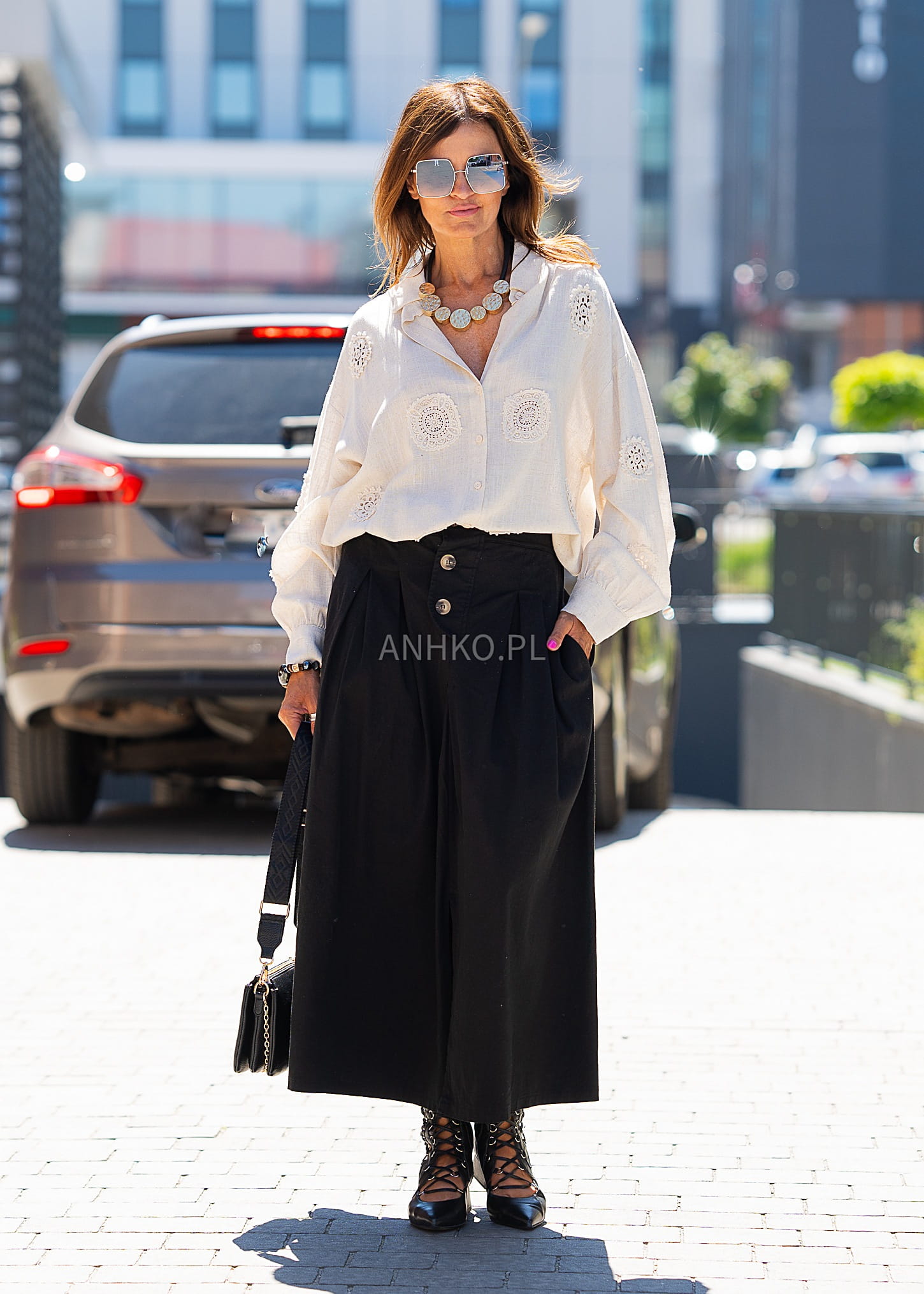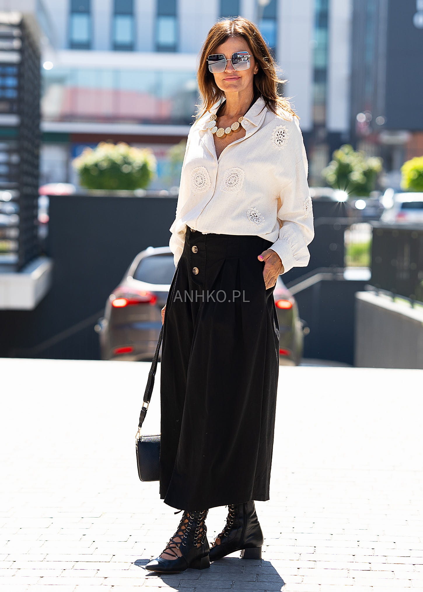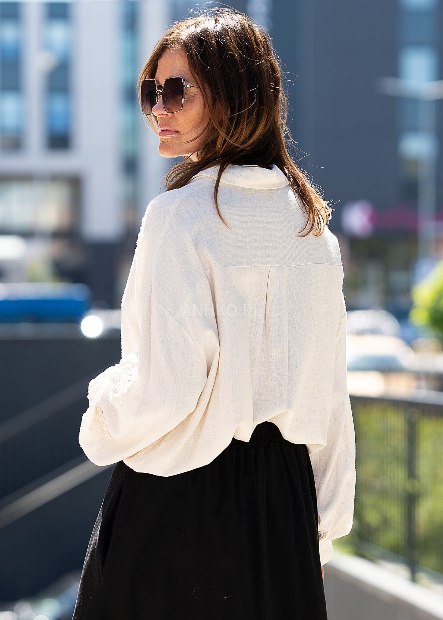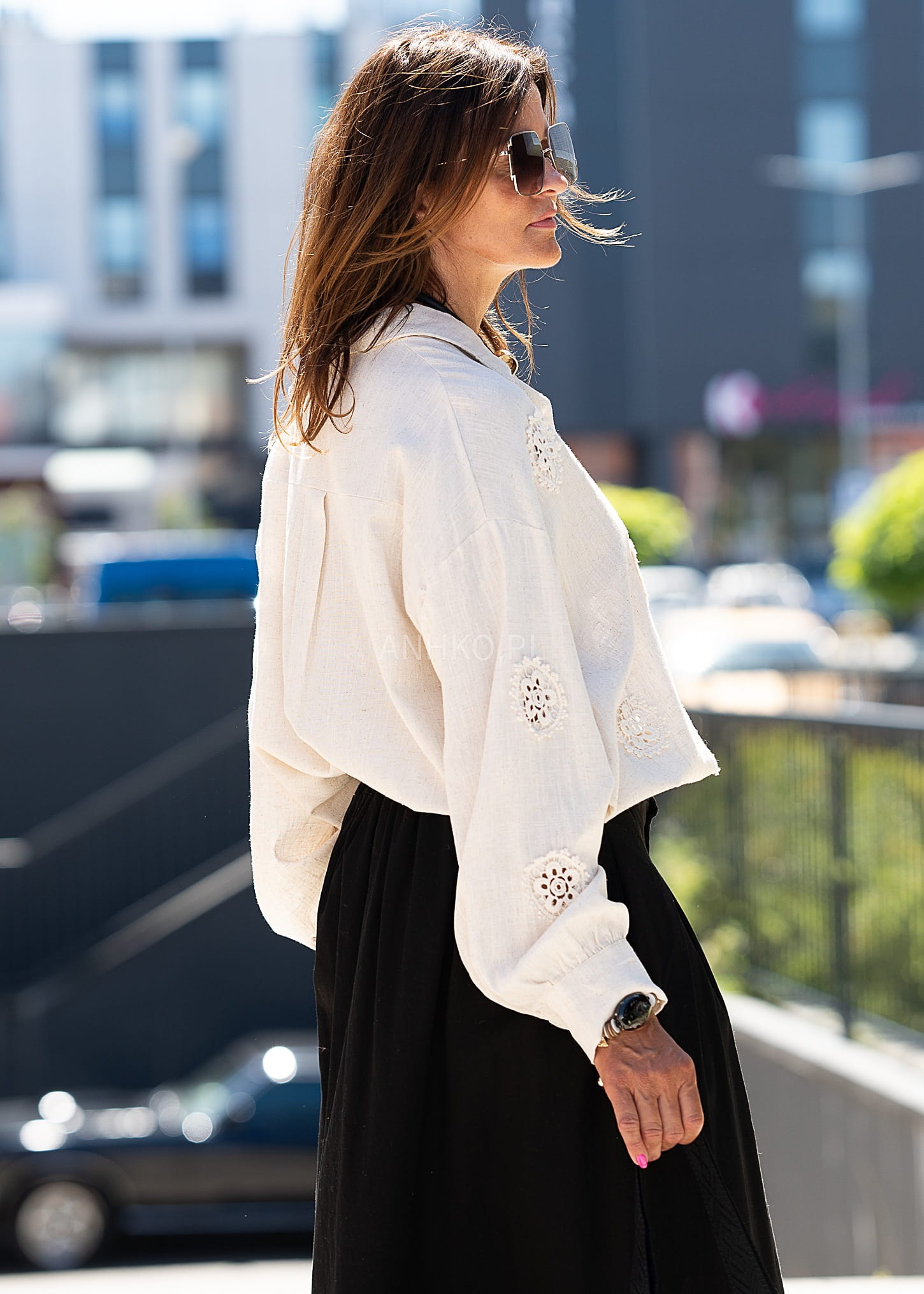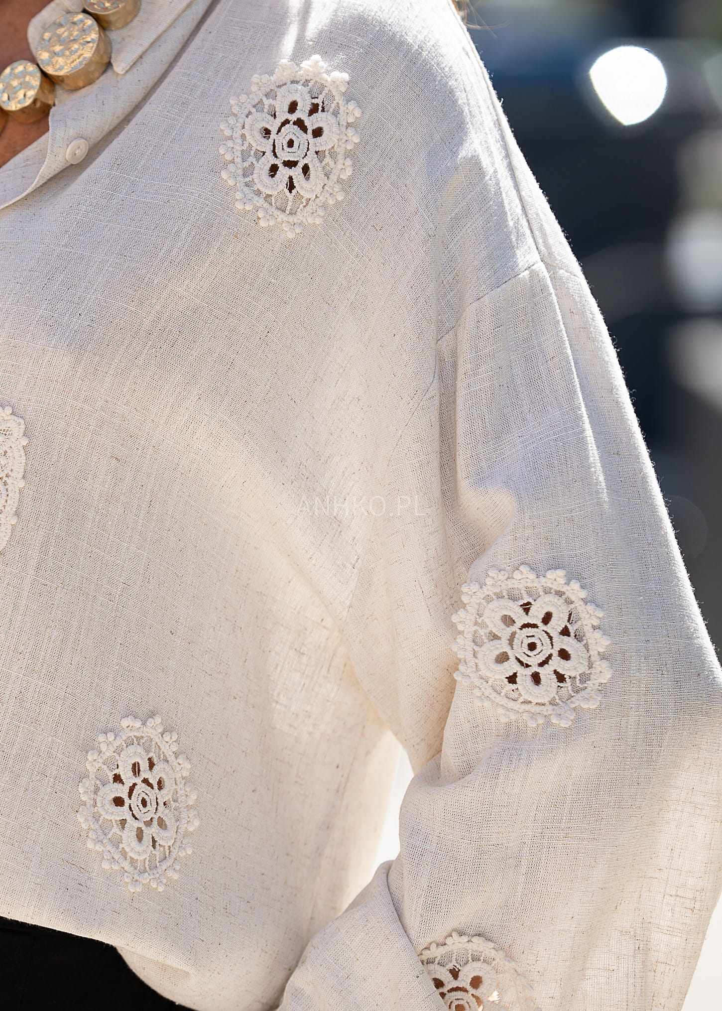 To koszula, która zachwyca subtelnym stylem i naturalnymi materiałami. Została uszyta z mieszanki lnu i wiskozy, co zapewnia przewiewność, miękkość i lekkość – idealną na cieplejsze dni. Delikatne aplikacje w formie koronkowych medalionów dodają jej wyjątkowego charakteru i kobiecego uroku. Doskonała zarówno do codziennych stylizacji z jeansami, jak i na bardziej eleganckie okazje, np. spotkanie z przyjaciółmi, brunch czy letnią kolację na tarasie. Sprawdzi się też jako narzutka na top.
