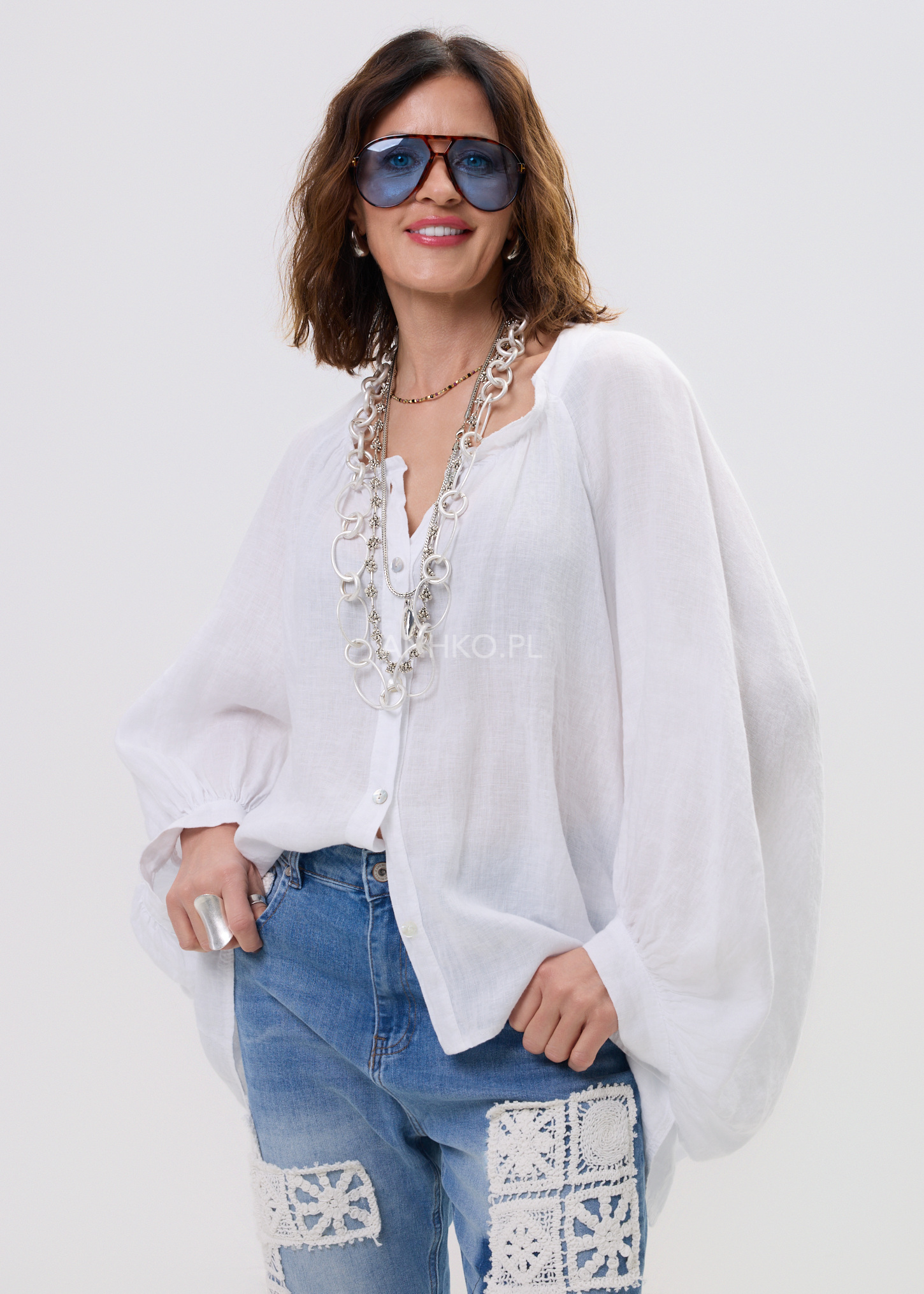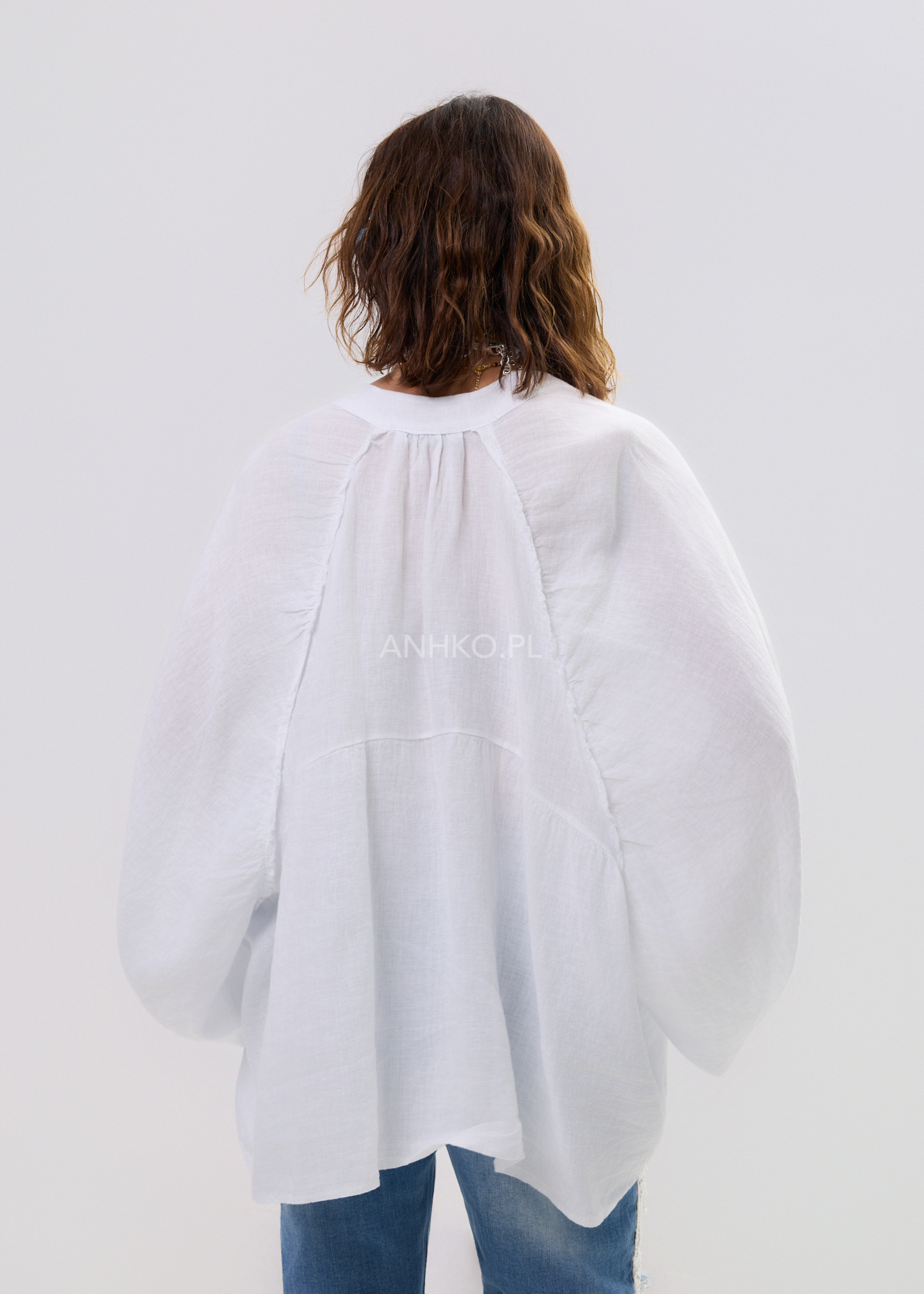 Ta lniana koszula damska przyciąga uwagę białym kolorem oraz lekką, naturalną strukturą materiału. Luźny fason oversize swobodnie układa się na sylwetce, tworząc efekt lekkości i komfortu. Dzięki delikatnej transparentności lnu oraz miękko opadającej tkaninie model prezentuje się niezwykle stylowo zarówno w ruchu, jak i w spokojnych, minimalistycznych stylizacjach. Naturalny len zapewnia przewiewność, a obszerne rękawy z marszczeniem nadają całości kobiecego charakteru.