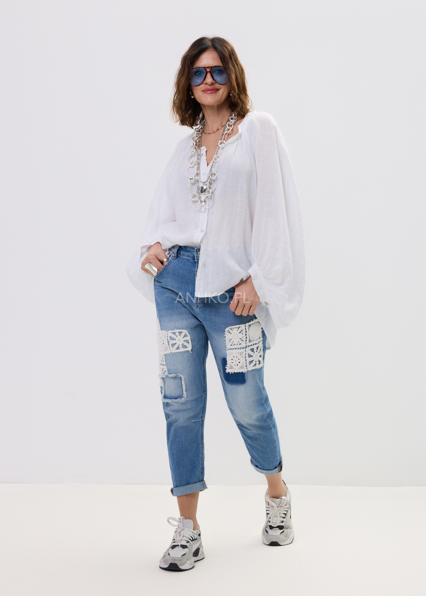 Jeansy Crochet Denim - Jeansy, które robią cały look. Luźny fason, przetarcia i szydełkowe naszywki w klimacie boho tworzą efekt WOW bez wysiłku. Idealne na co dzień, gdy chcesz wyglądać stylowo, ale na luzie.