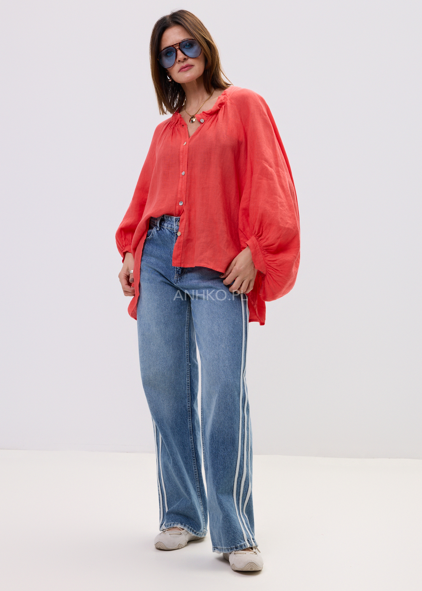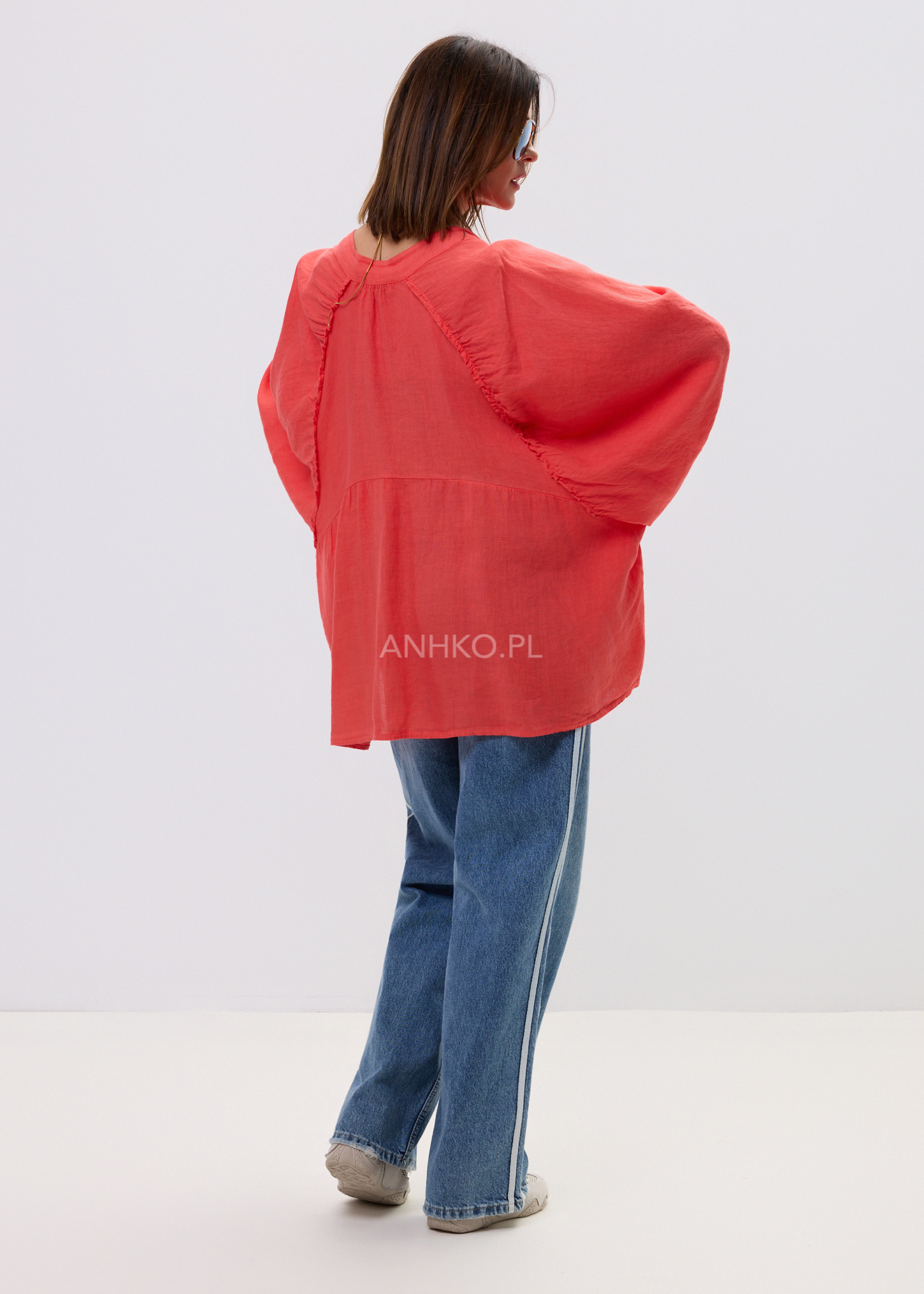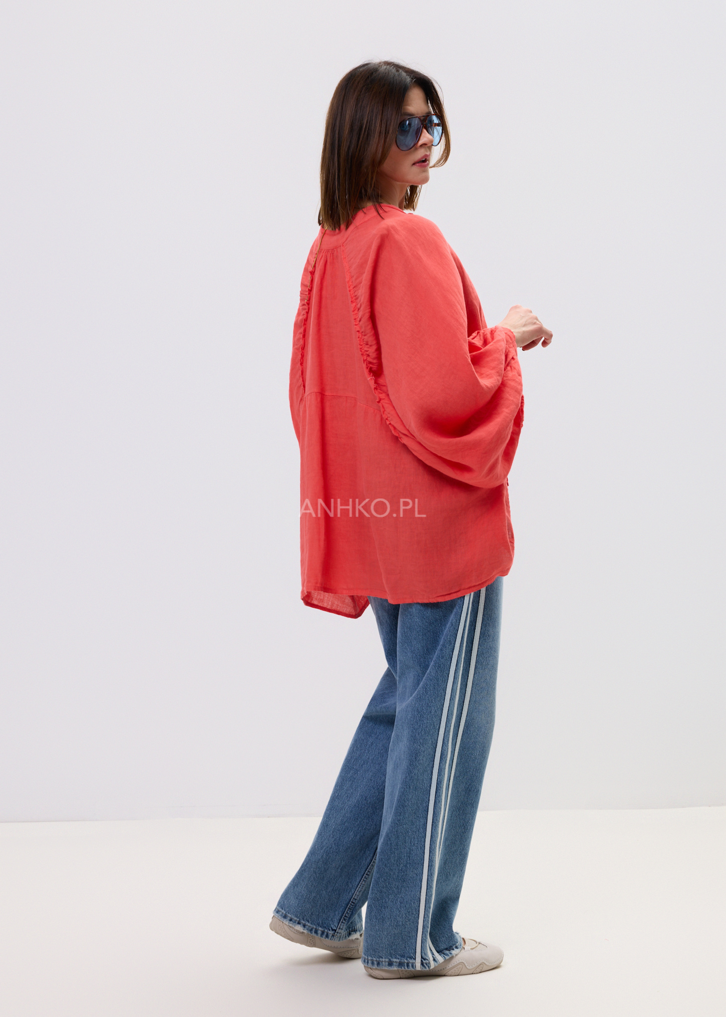 Ta lniana koszula damska przyciąga uwagę intensywnym koralowym kolorem oraz lekką, naturalną strukturą materiału. Luźny fason oversize swobodnie układa się na sylwetce, tworząc efekt lekkości i komfortu. Dzięki delikatnej transparentności lnu oraz miękko opadającej tkaninie model prezentuje się niezwykle stylowo zarówno w ruchu, jak i w spokojnych, minimalistycznych stylizacjach. Naturalny len zapewnia przewiewność, a obszerne rękawy z marszczeniem nadają całości kobiecego charakteru.
