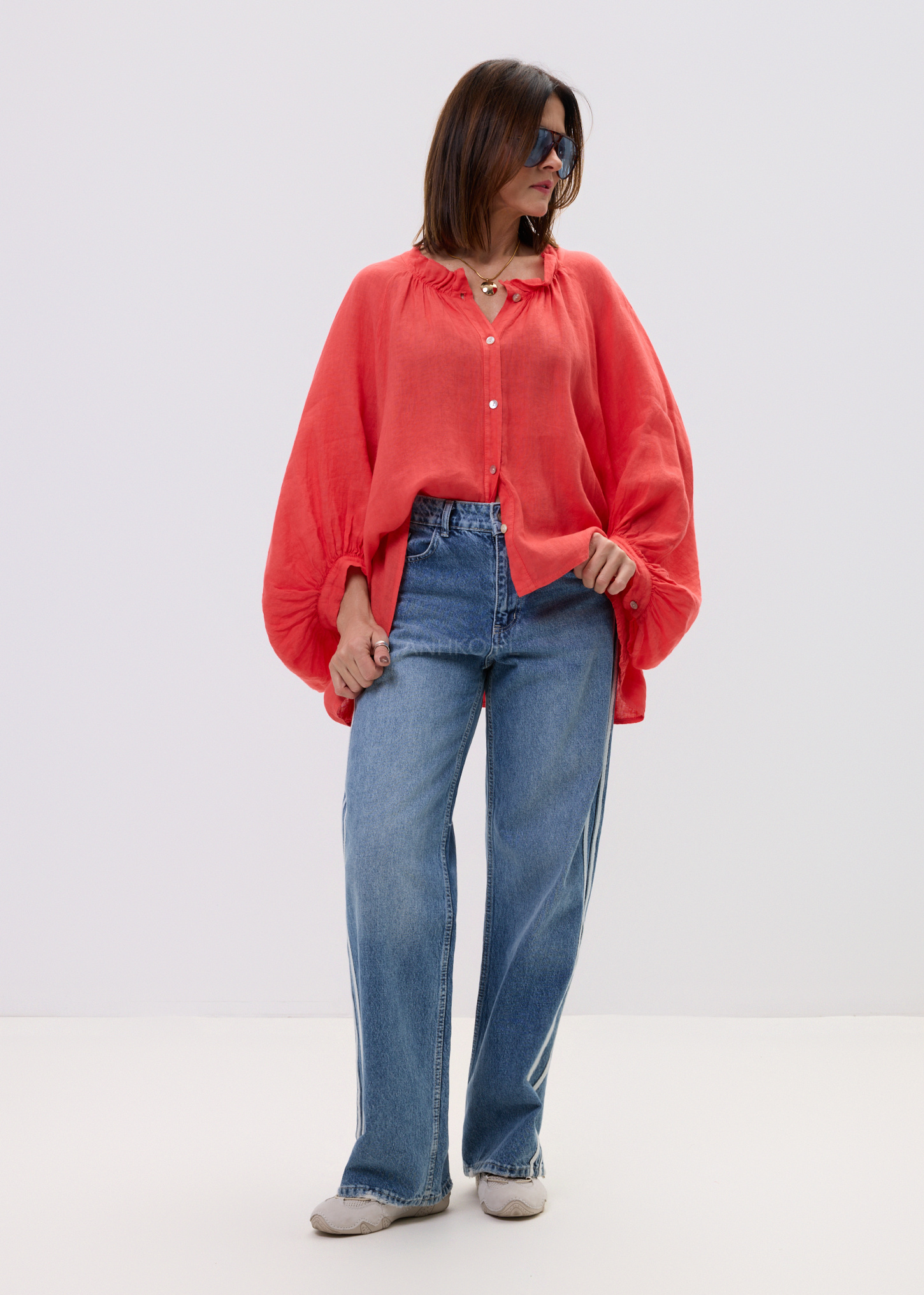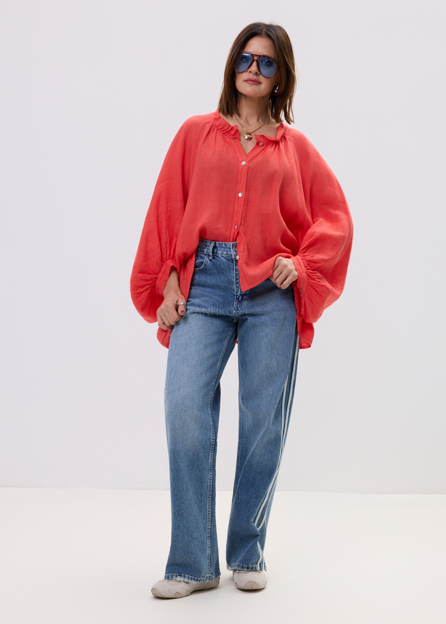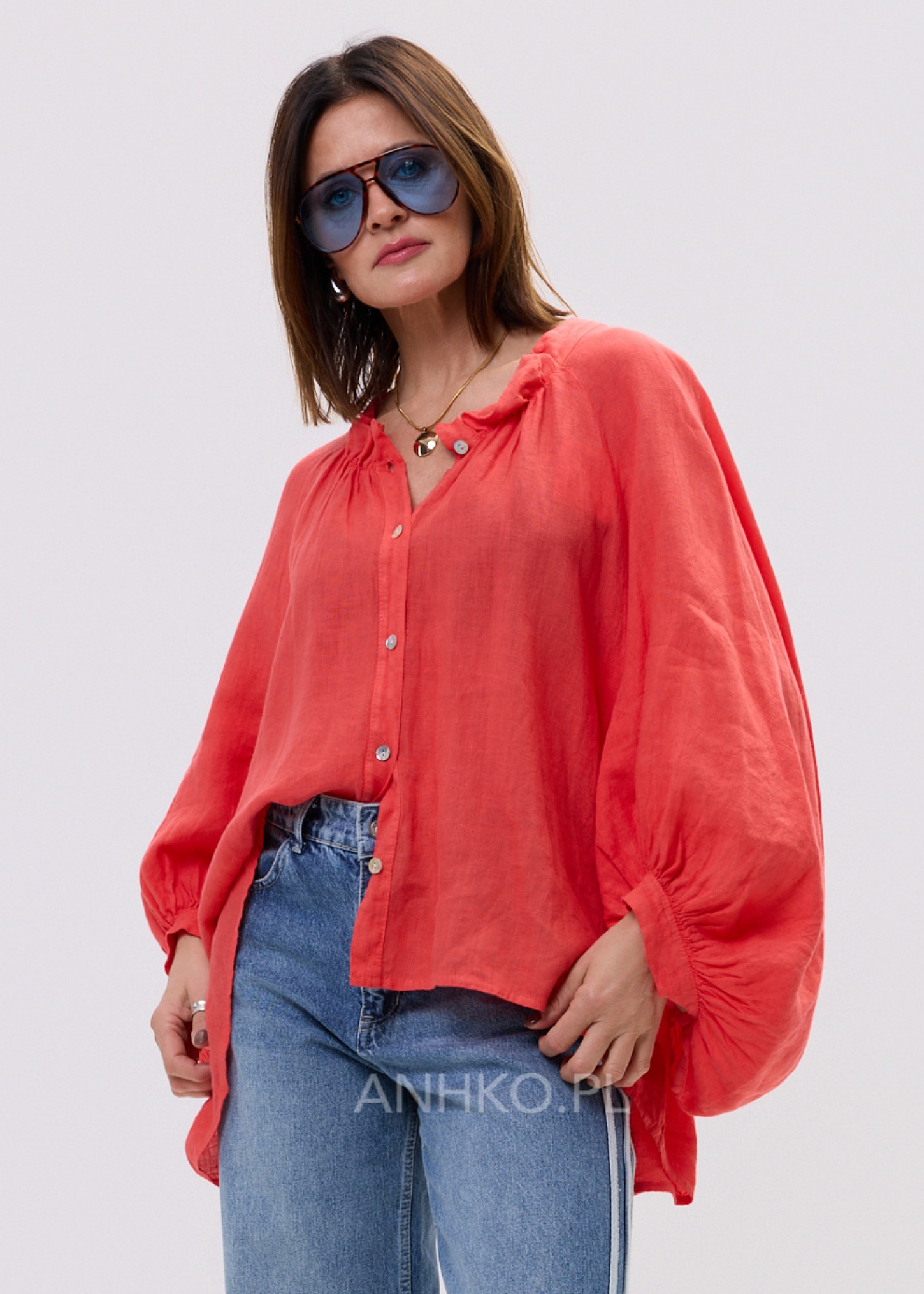 Ta lniana koszula damska przyciąga uwagę intensywnym koralowym kolorem oraz lekką, naturalną strukturą materiału. Luźny fason oversize swobodnie układa się na sylwetce, tworząc efekt lekkości i komfortu. Dzięki delikatnej transparentności lnu oraz miękko opadającej tkaninie model prezentuje się niezwykle stylowo zarówno w ruchu, jak i w spokojnych, minimalistycznych stylizacjach. Naturalny len zapewnia przewiewność, a obszerne rękawy z marszczeniem nadają całości kobiecego charakteru.