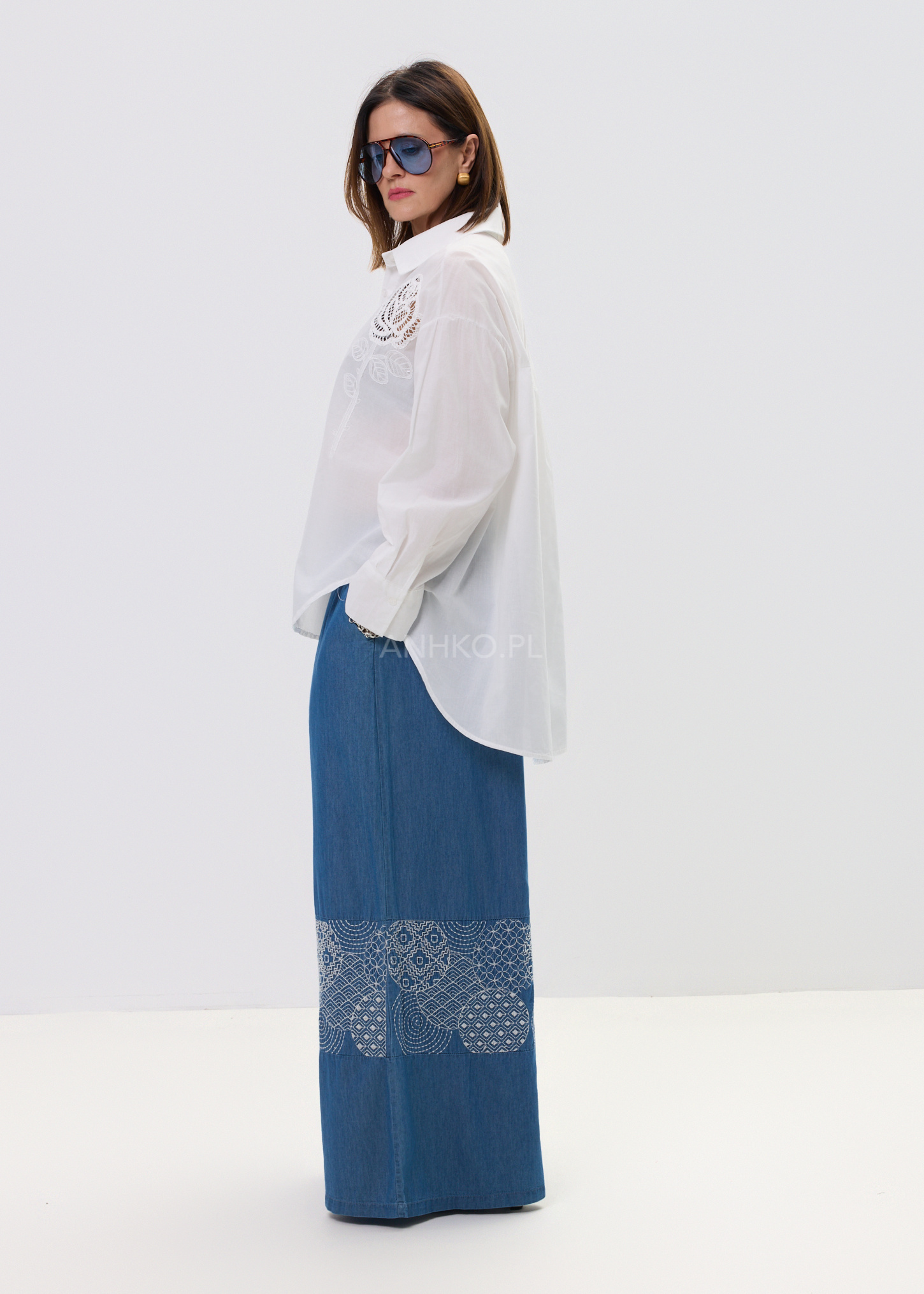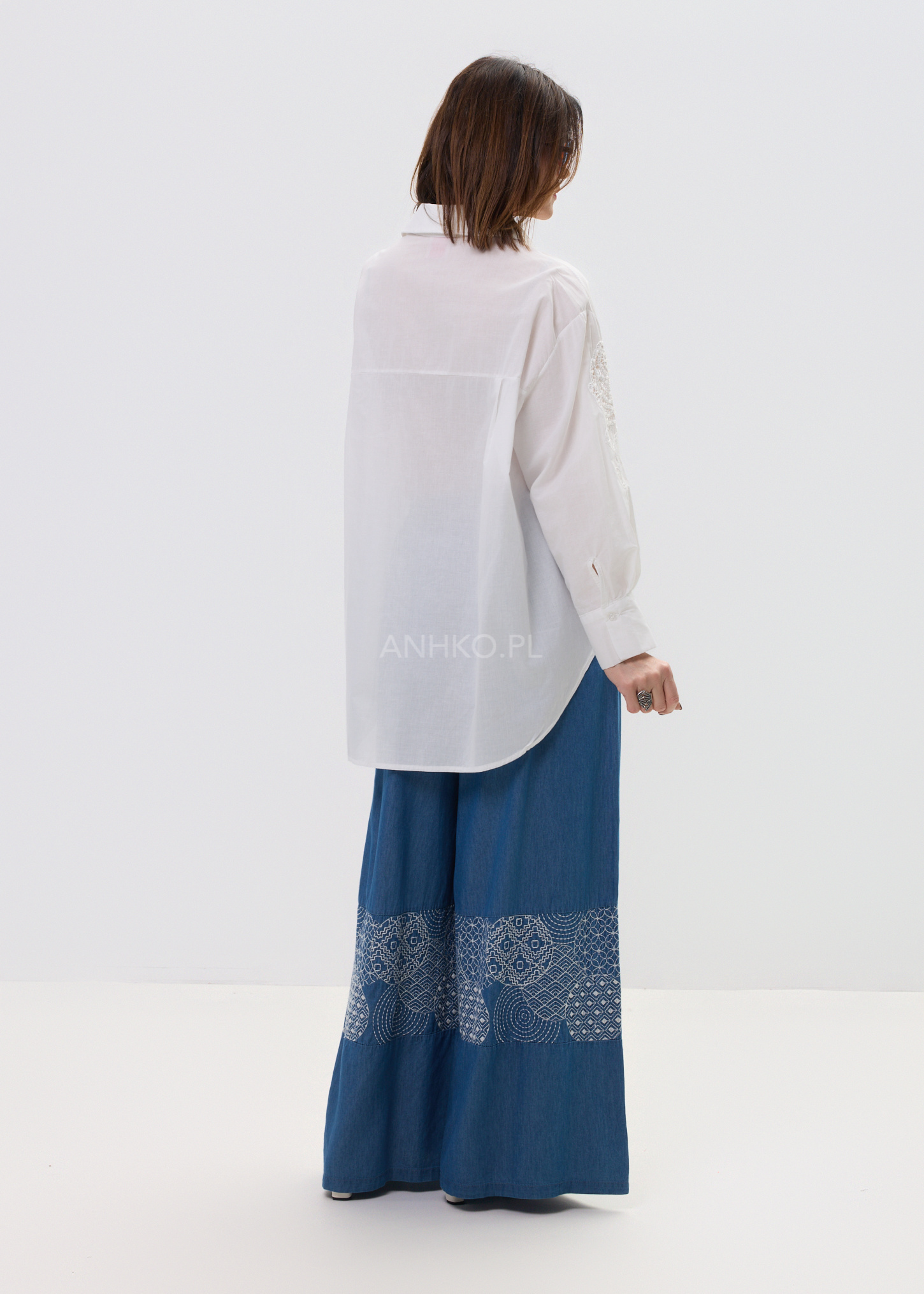 Spodnie Boho Den Niebieskie - Stylowe spodnie w stylu boho z lekkiego jeansu, ozdobione białym haftem. Elastyczny pas i kieszenie zapewniają wygodę, a unikalny wzór dodaje charakteru codziennym stylizacjom.