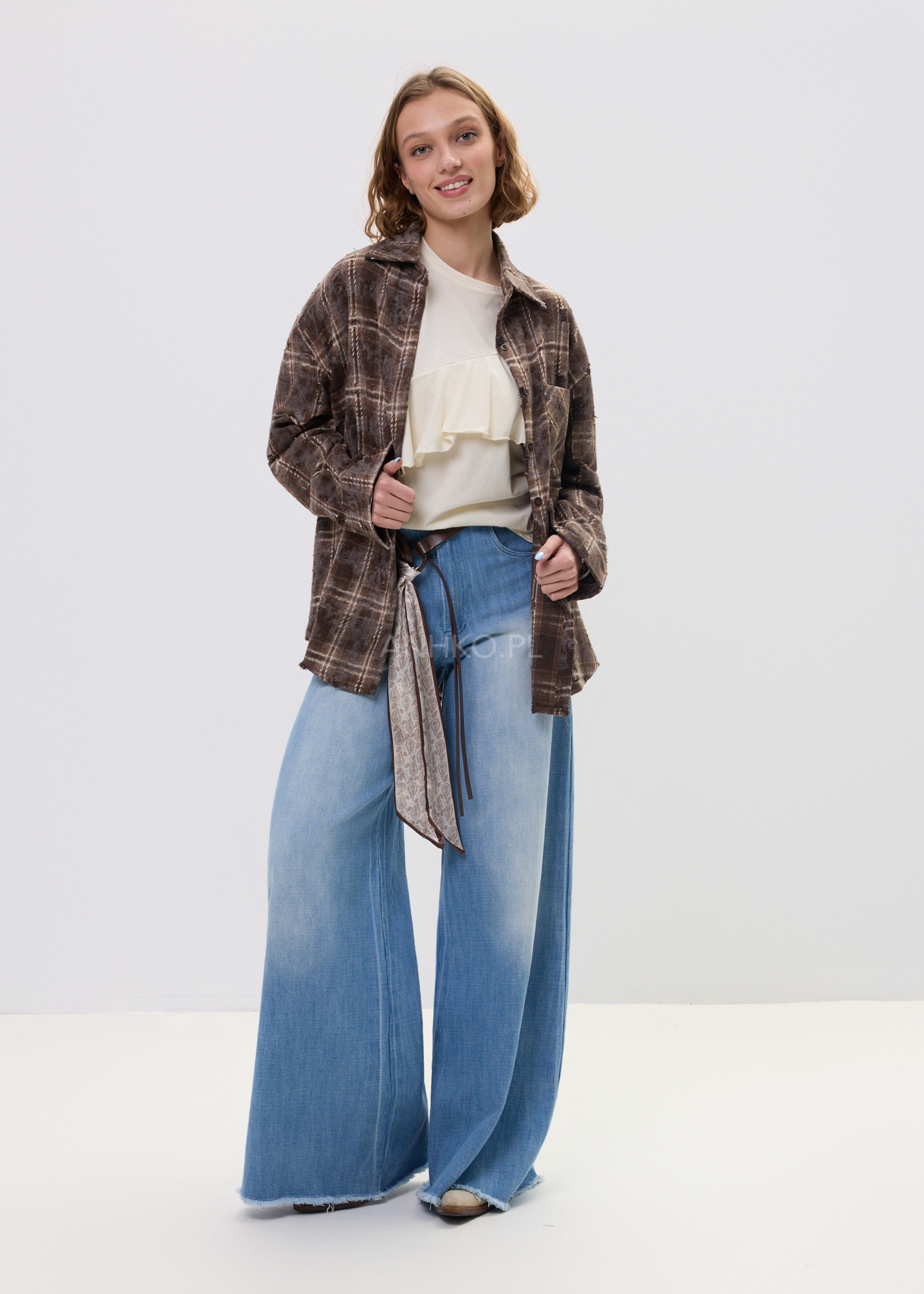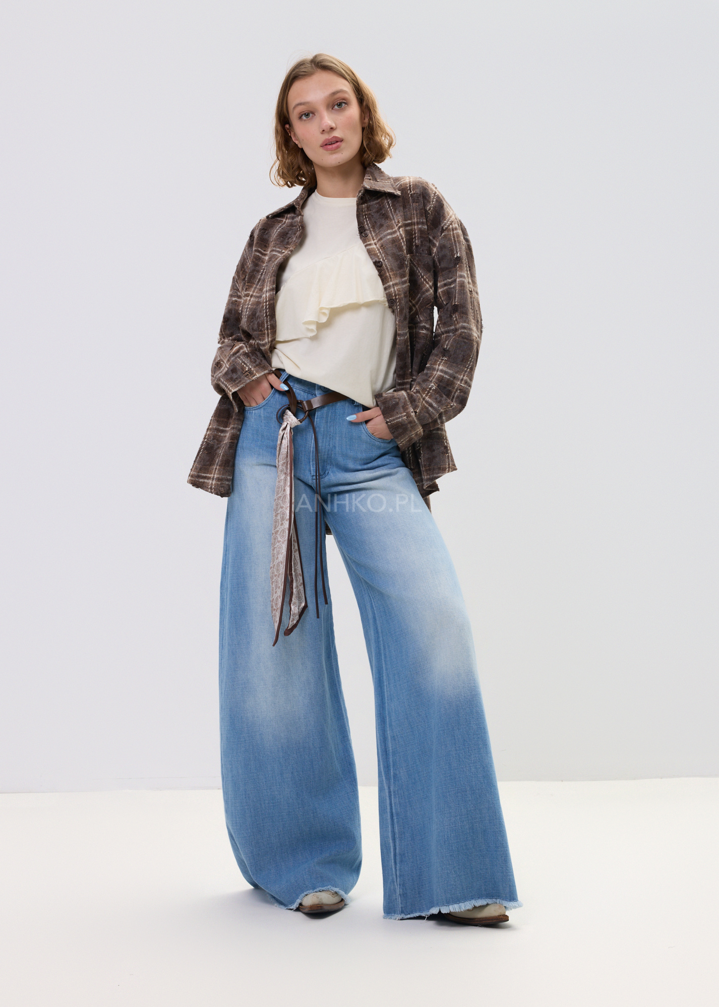 Spodnie Jeansowe Wid Lind Denim - Luźne jeansy wide leg w odcieniu denim blue z modnym, spranym efektem. W zestawie pasek z dekoracyjną apaszką, który nadaje całości stylowego, lekko boho charakteru.