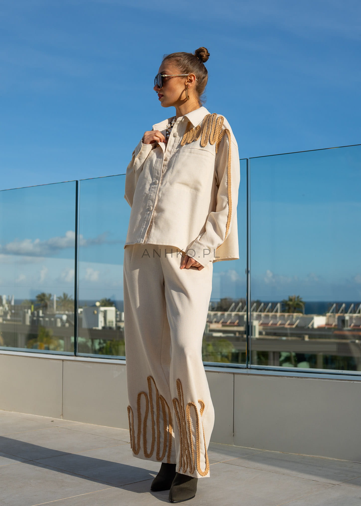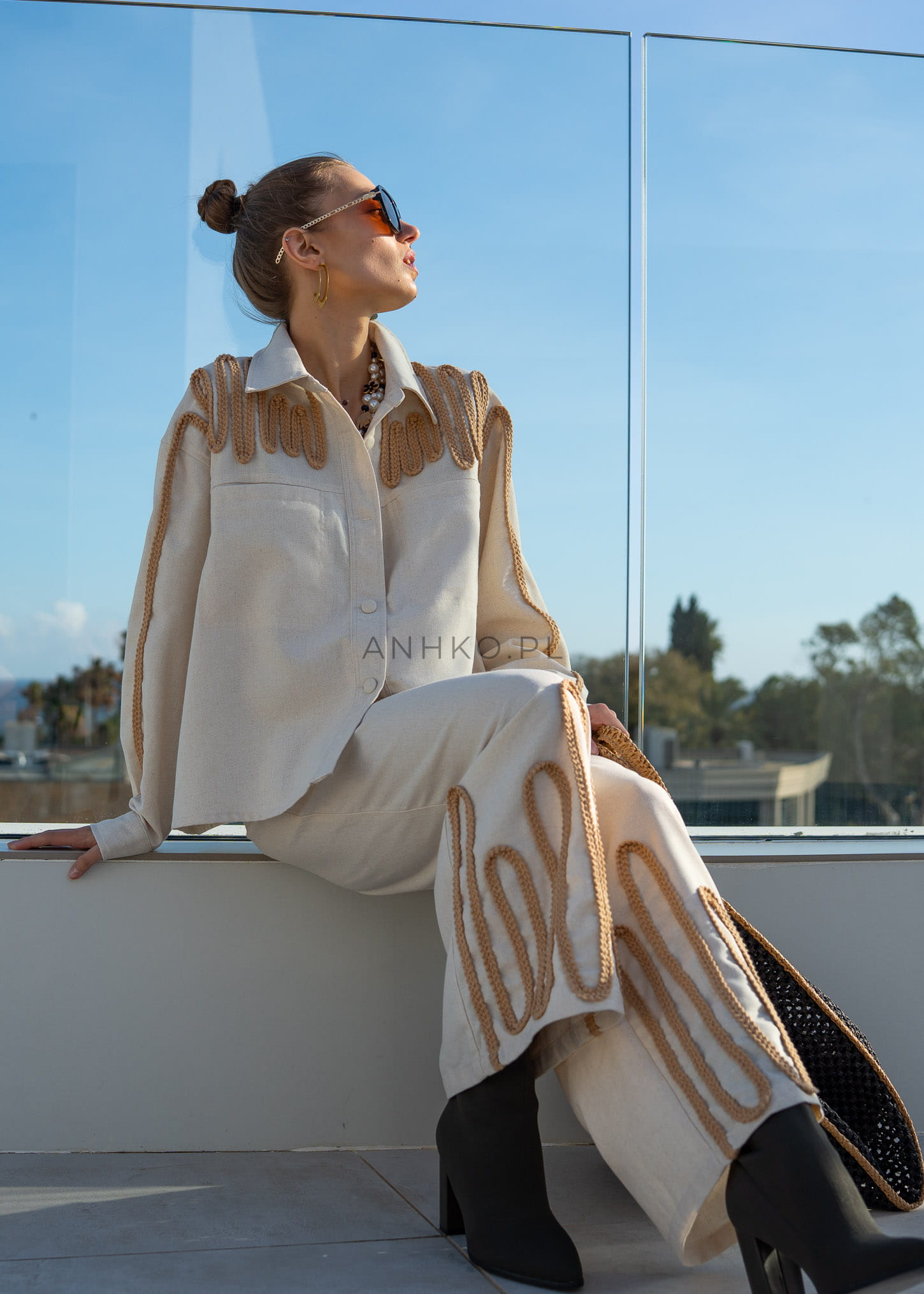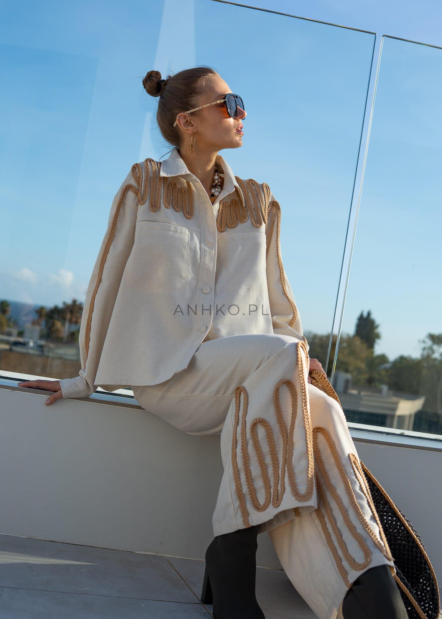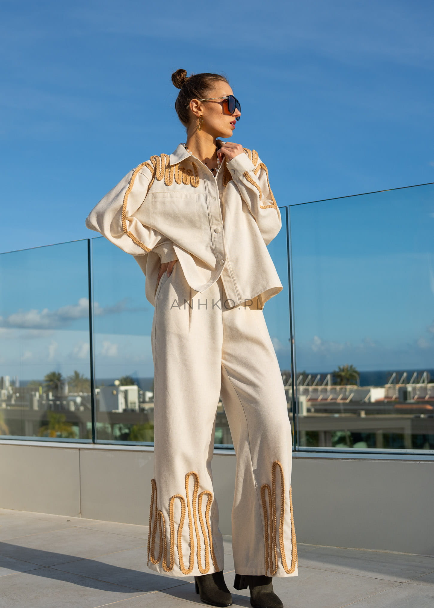 Spodnie Modern z Dodatkiem Lnu Beżowe - Eleganckie spodnie z dekoracyjnym wykończeniem z plecionki w dolnej części nogawek. Idealne na formalne spotkania lub eleganckie wyjścia. Wysokiej jakości mieszanka lnu, bawełny i wiskozy zapewnia wygodę i styl.