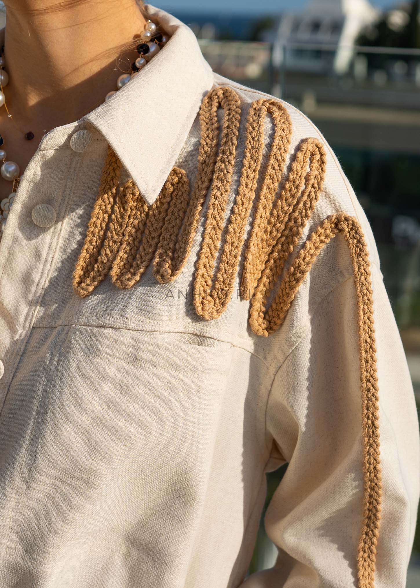 To wyjątkowy element garderoby, który wyróżnia się unikalnymi, plecionymi zdobieniami na ramionach i rękawach. Dzięki klasycznemu krojowi i uniwersalnej czerni, ta kurtka doskonale pasuje zarówno do codziennych stylizacji z jeansami, jak i bardziej eleganckich zestawów z cygaretkami. Lekki materiał z dodatkiem lnu i bawełny zapewnia wygodę noszenia, a subtelne akcenty nadają jej wyrazistości. Świetna opcja na wieczorne wyjścia czy casualowe spotkania.