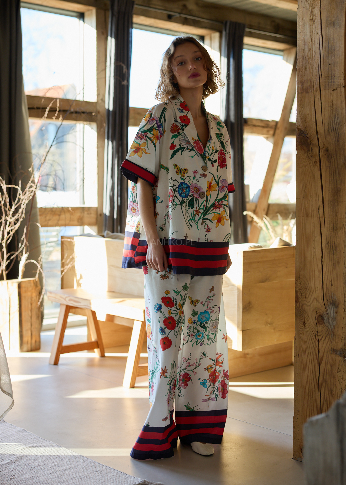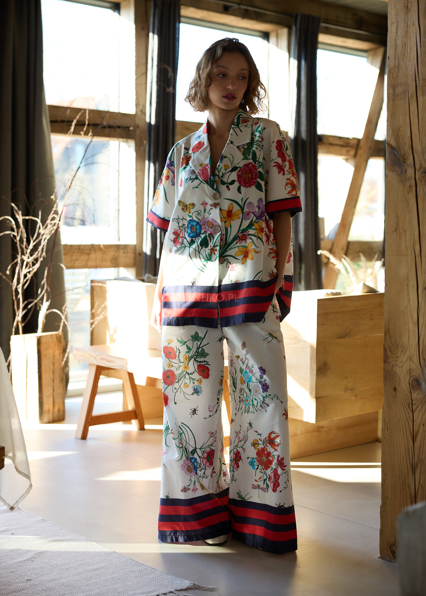 Kontrastowe wykończenie w pasy na dole i rękawach przełamuje wzór i dodaje całości modowego pazura. Klasyczny kołnierzyk i zapięcie na guziki pozwalają stylizować ją na wiele sposobów – od casualowych zestawów z jeansami po bardziej wyraziste looki z szerokimi spodniami lub spódnicą.
