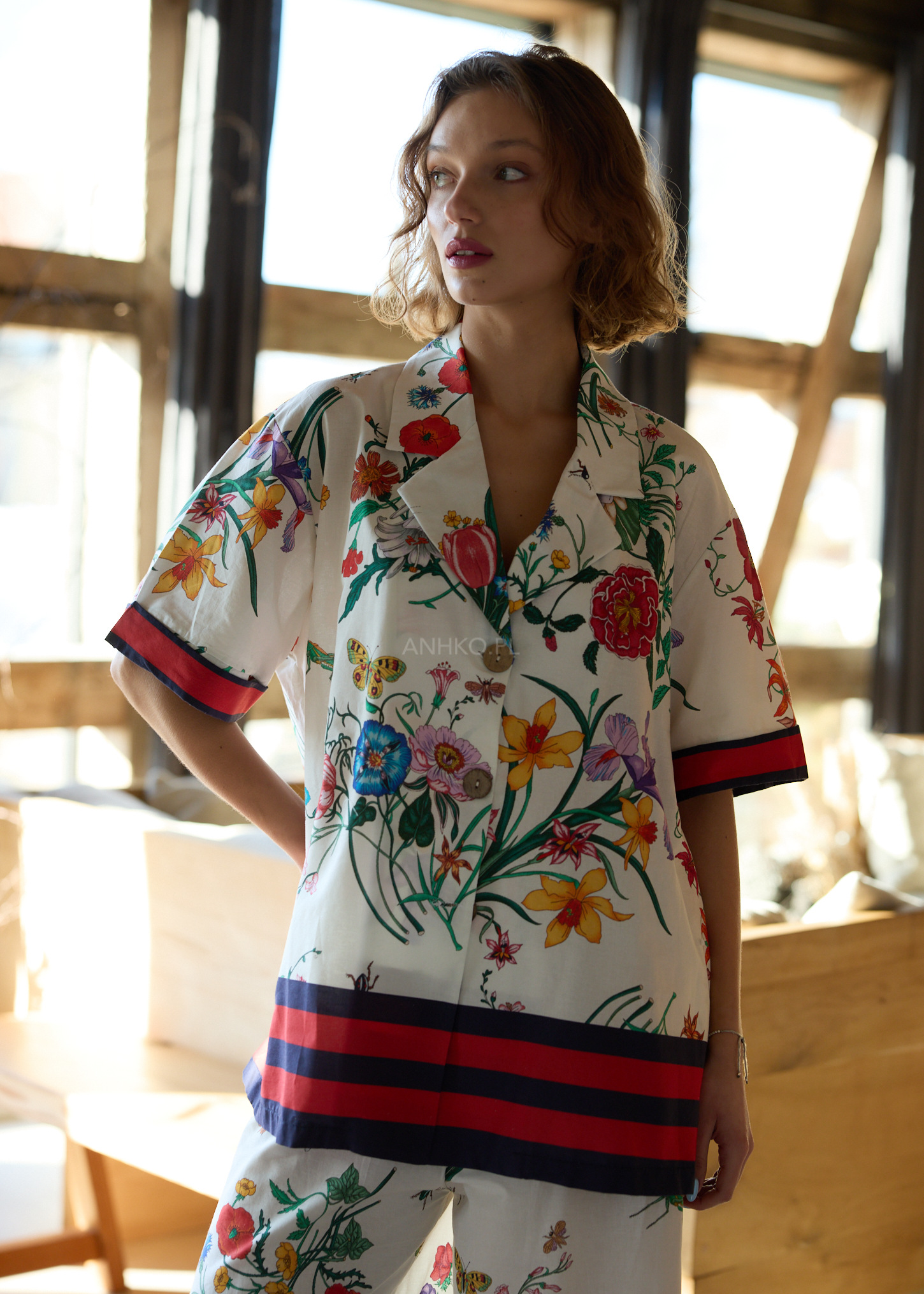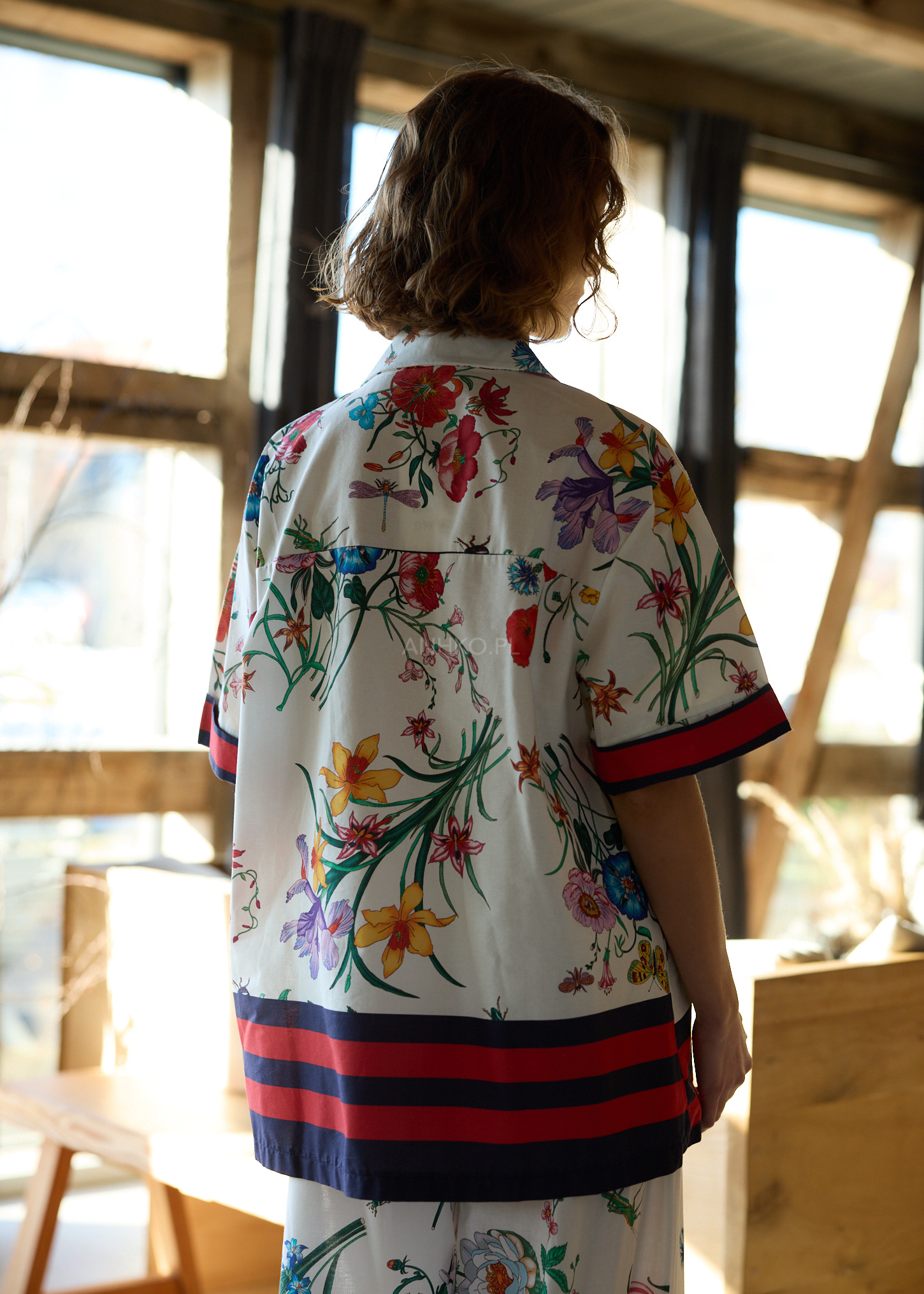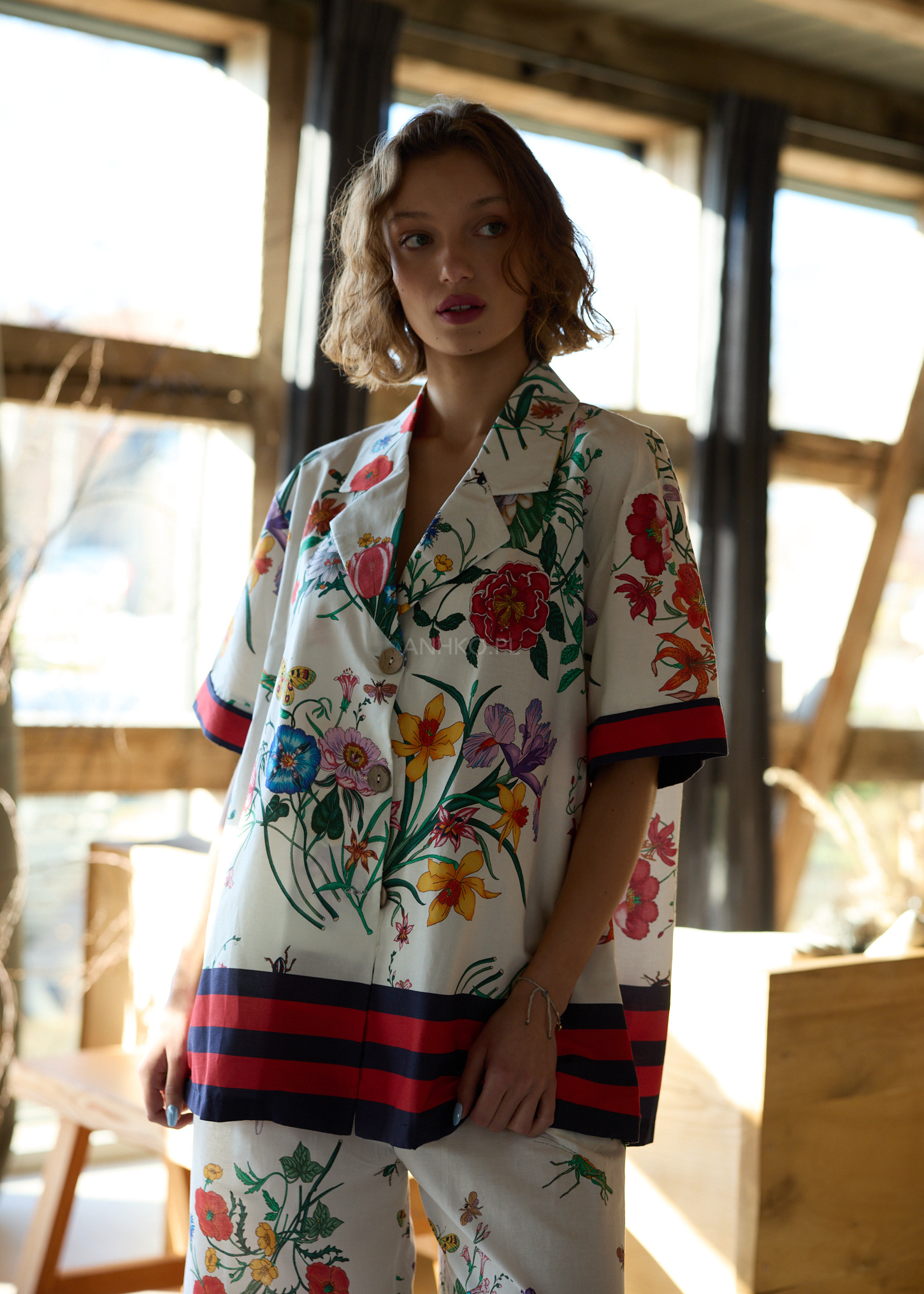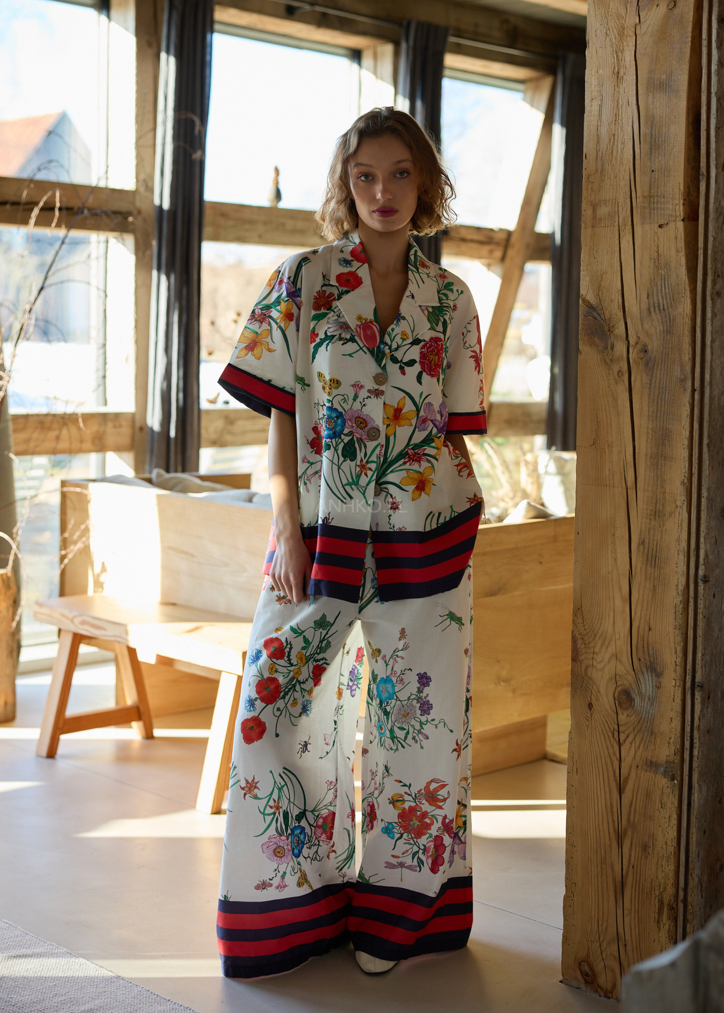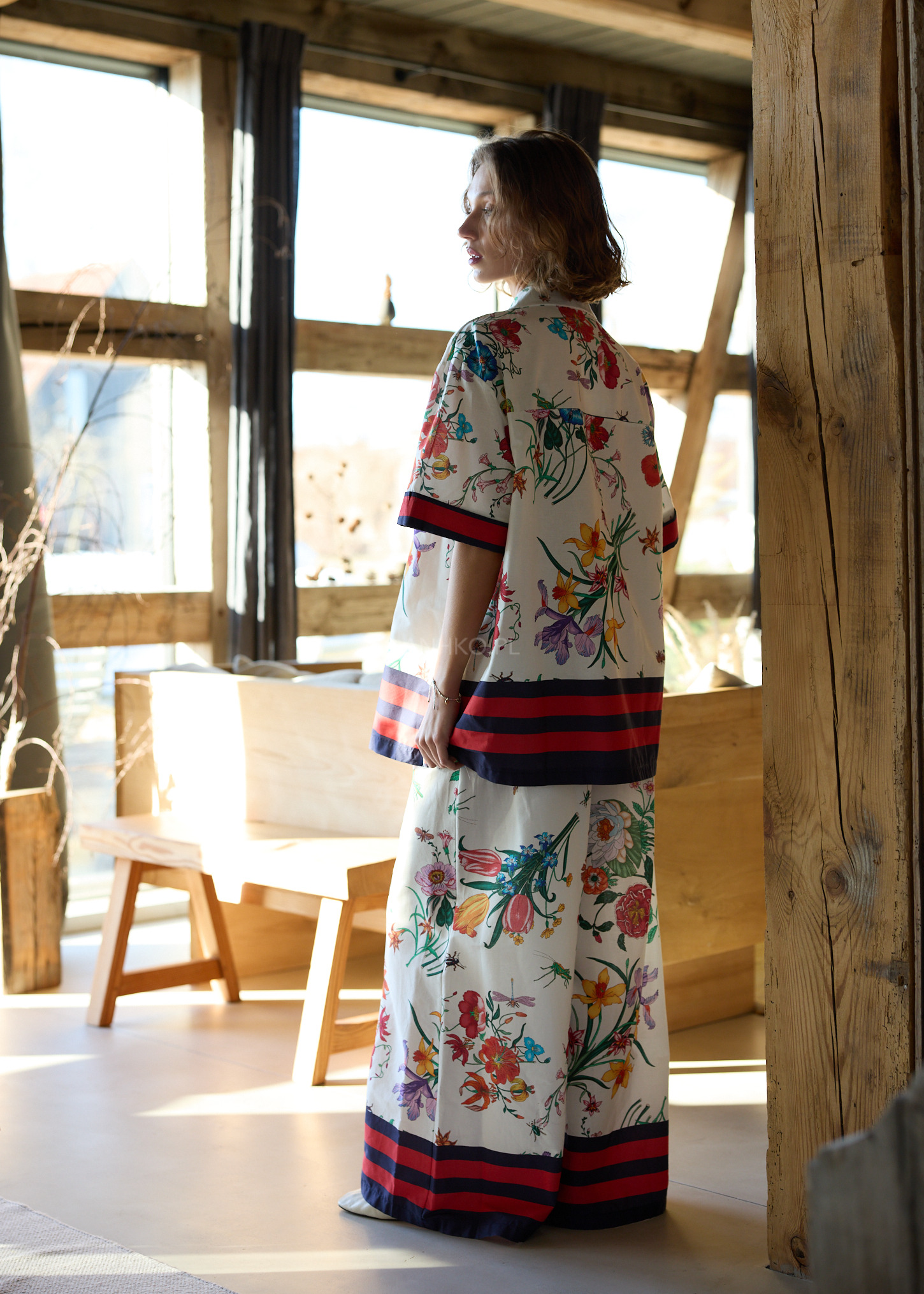 Ta koszula damska o luźnym, oversize’owym kroju swobodnie opływa sylwetkę, zapewniając pełen komfort i nowoczesny look. Krótki rękaw oraz lekka forma sprawiają, że model świetnie sprawdza się zarówno solo, jak i w stylizacjach warstwowych. Intensywny botaniczny print z motywem kwiatów i owadów przyciąga uwagę i nadaje całości artystycznego charakteru.