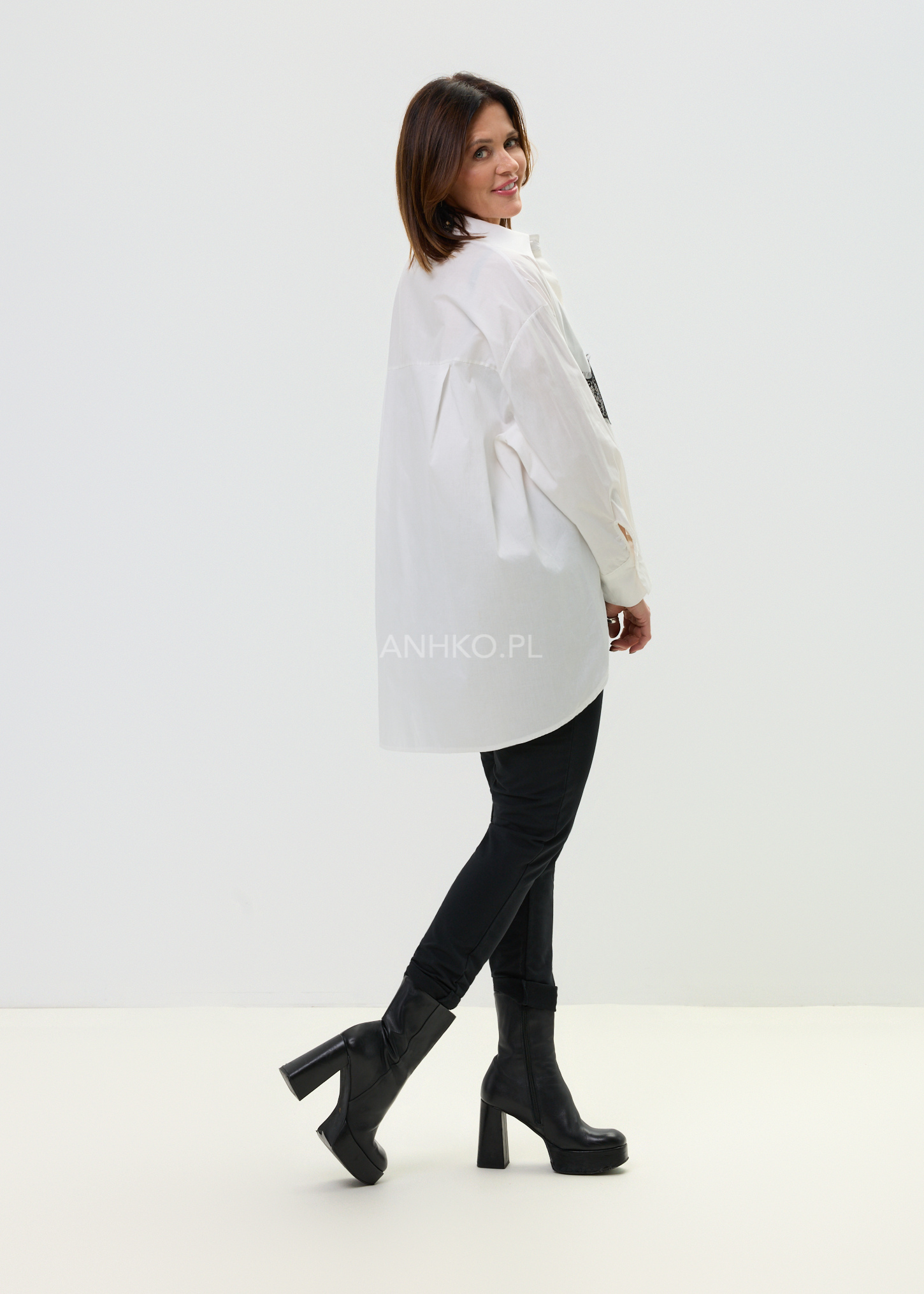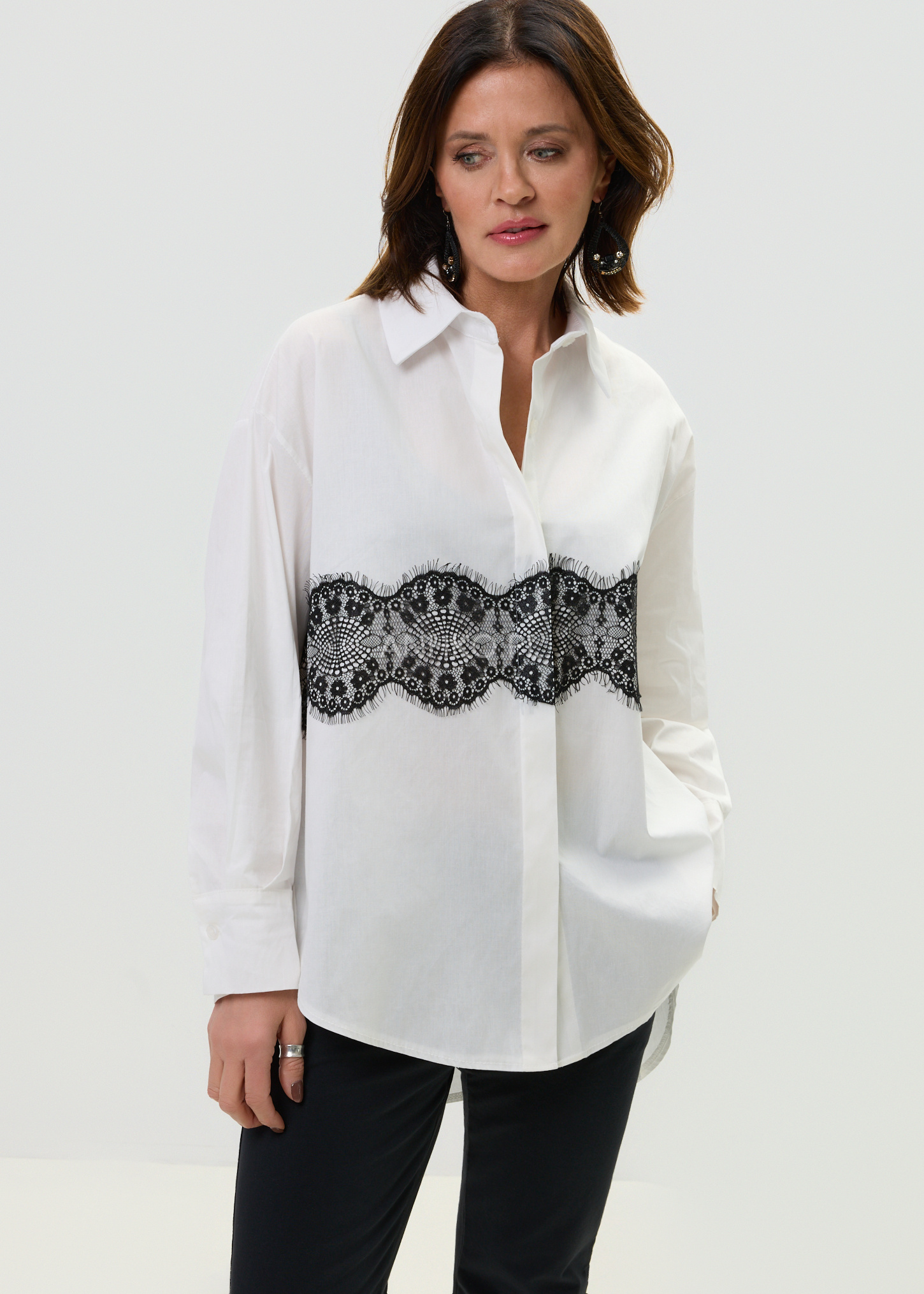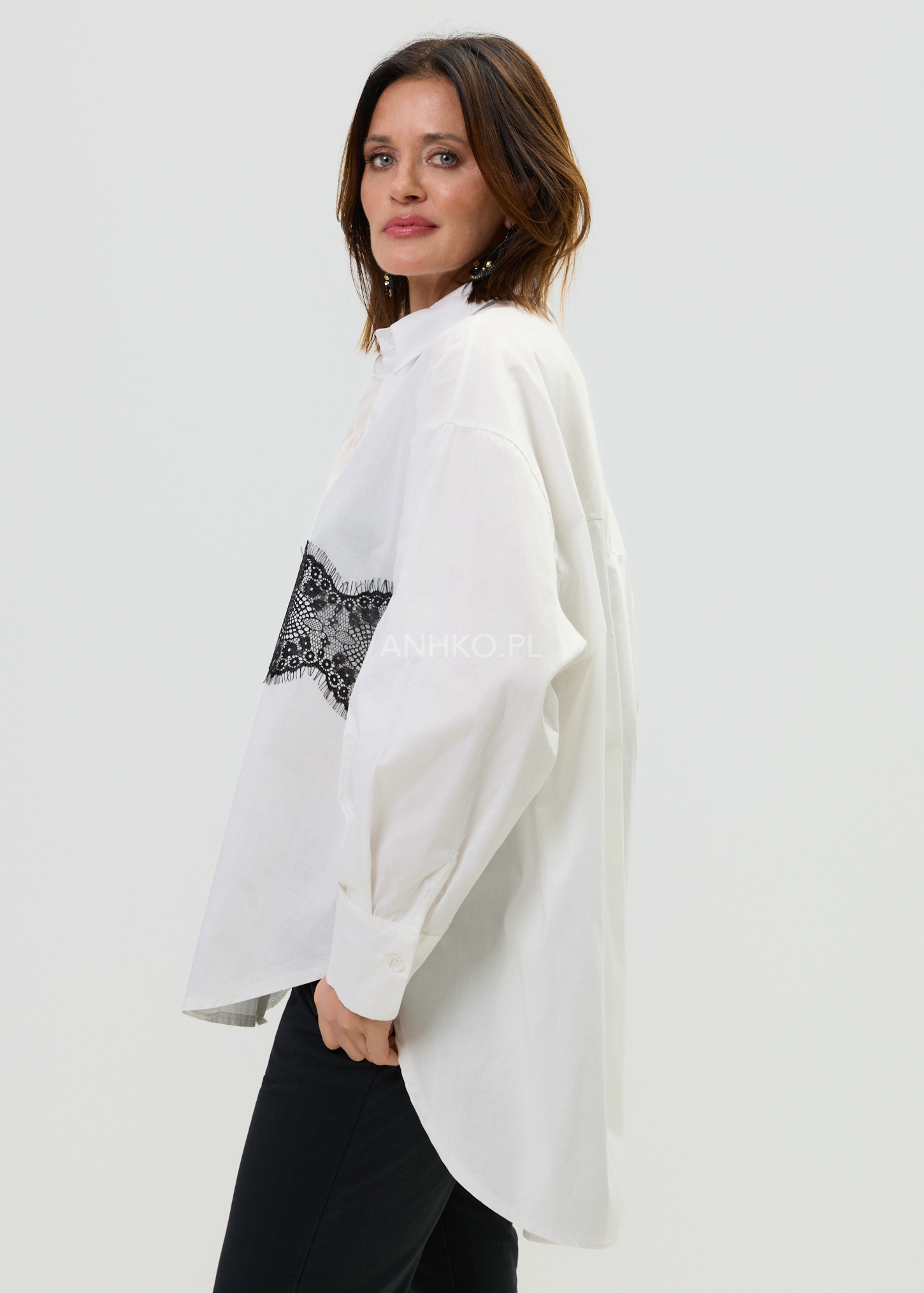 Ta biała koszula damska to połączenie klasycznego fasonu z subtelnym, modowym detalem. Luźny krój oversize swobodnie układa się na sylwetce i zapewnia wygodę noszenia, a kontrastowy pas czarnej koronki biegnący przez całą szerokość koszuli przyciąga uwagę i nadaje stylizacji charakteru. Lekka, oddychająca tkanina sprawia, że model świetnie sprawdza się zarówno jako samodzielny element stylizacji, jak i baza do warstwowego looku.