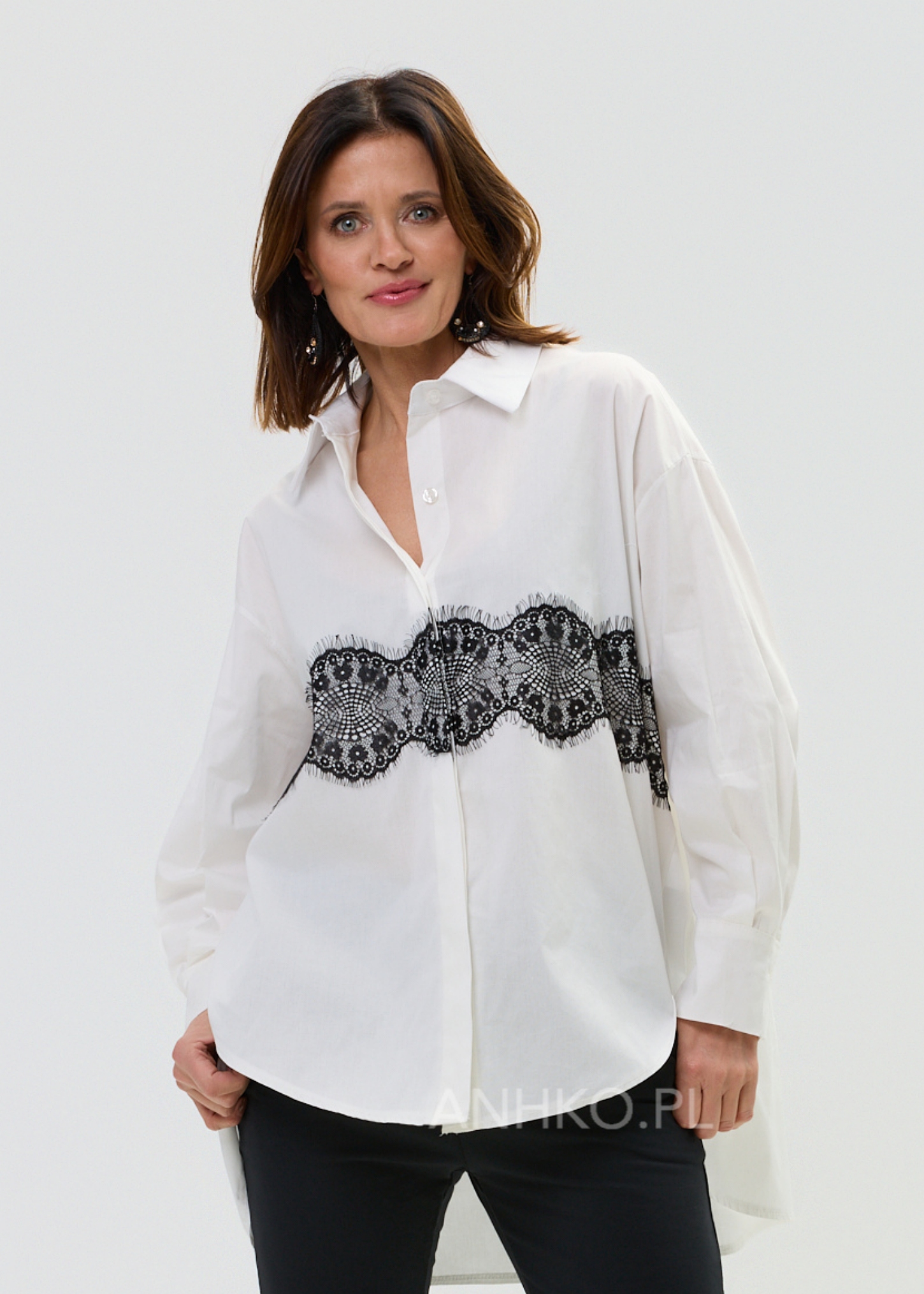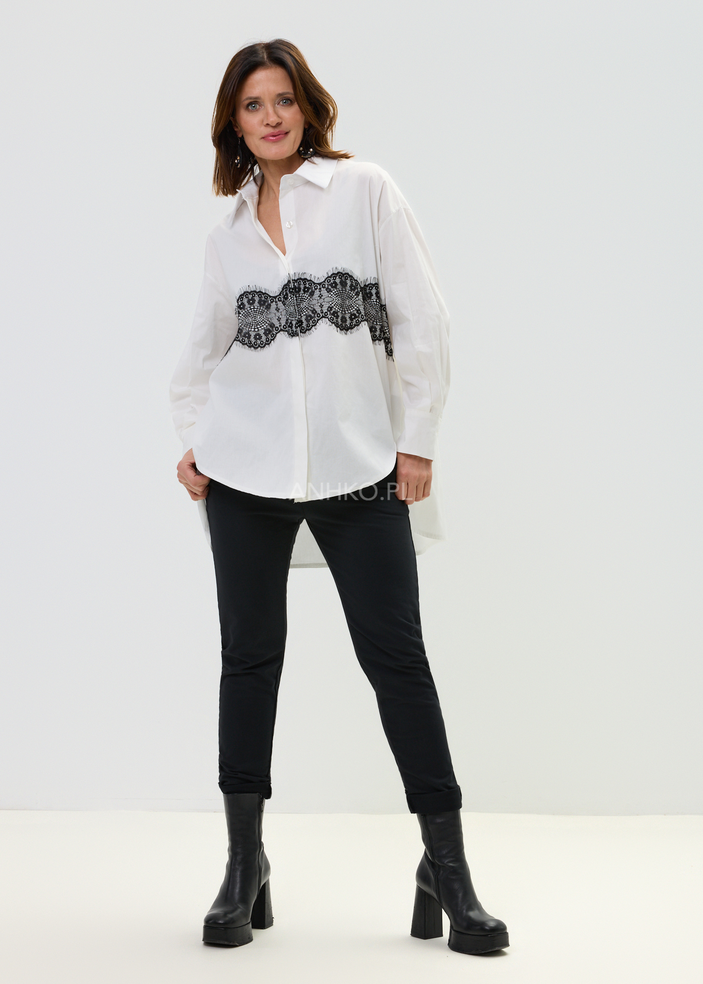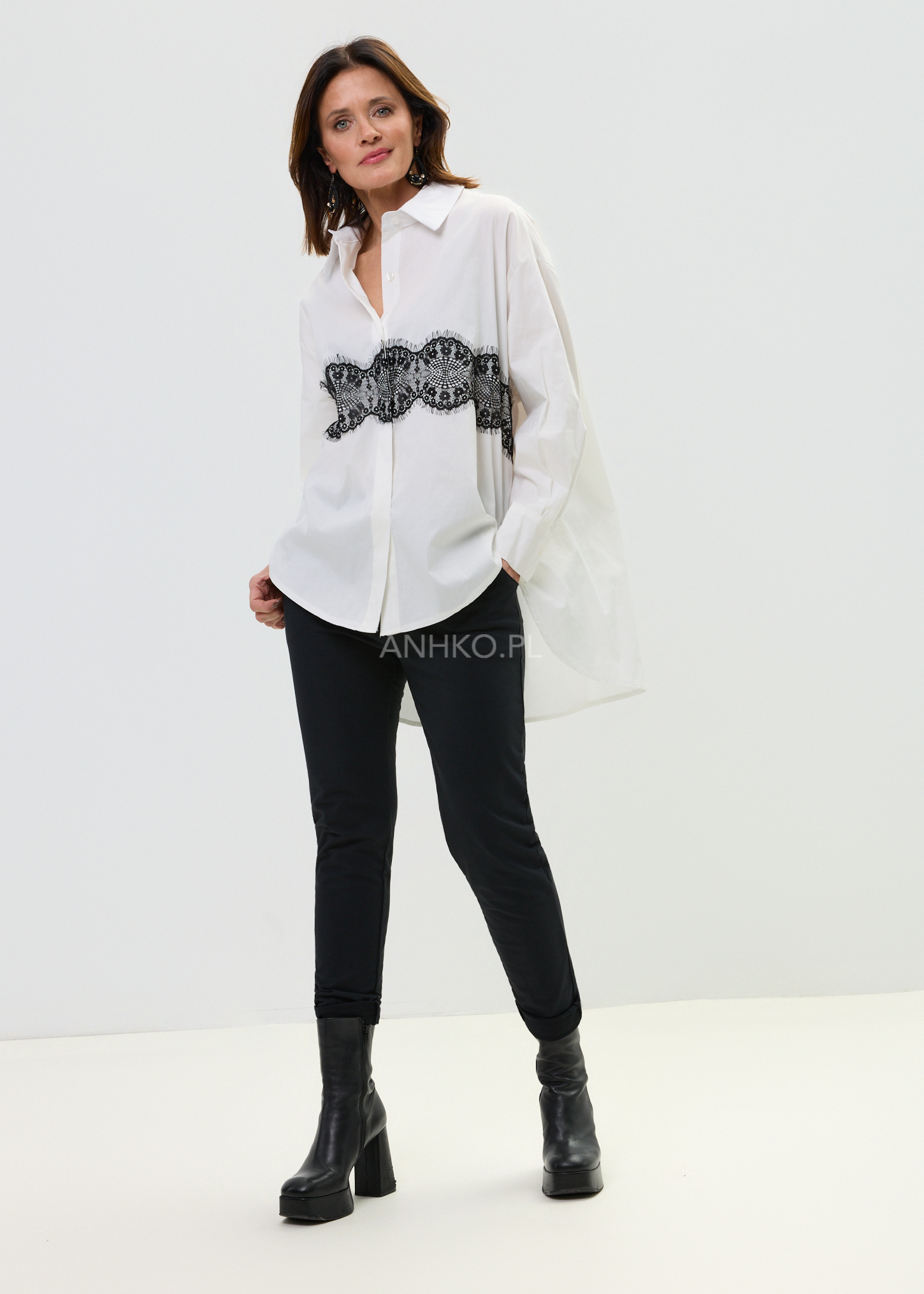 - Koronkowy detal: Kontrastowy pas czarnej koronki nadający koszuli charakteru.