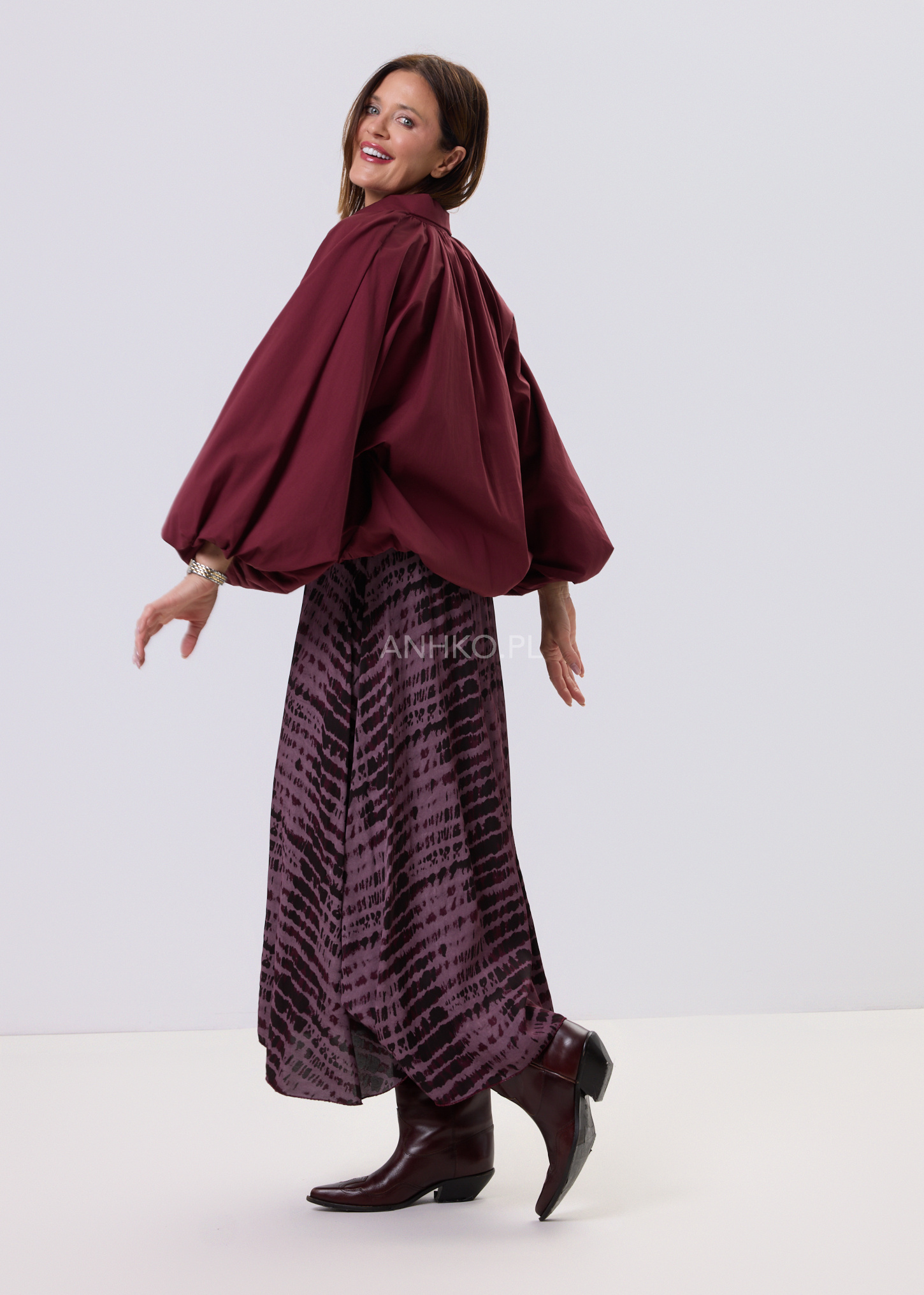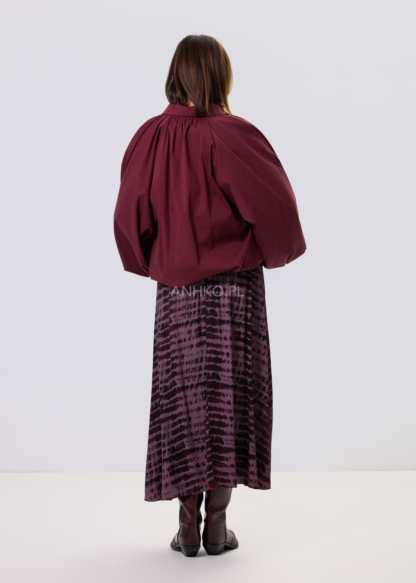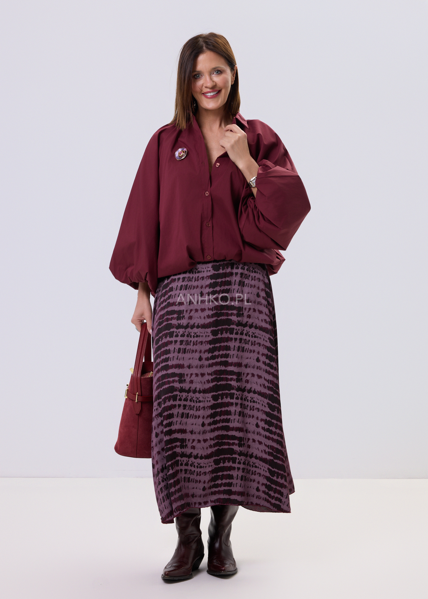 Spódnica Bakano Śliwkowa - Lekka spódnica midi z artystycznym printem w odcieniach fioletu i czerni. Rozkloszowany fason oraz elastyczna talia zapewniają komfort noszenia i swobodę ruchów. Idealna do codziennych stylizacji z nutą artystycznego charakteru.