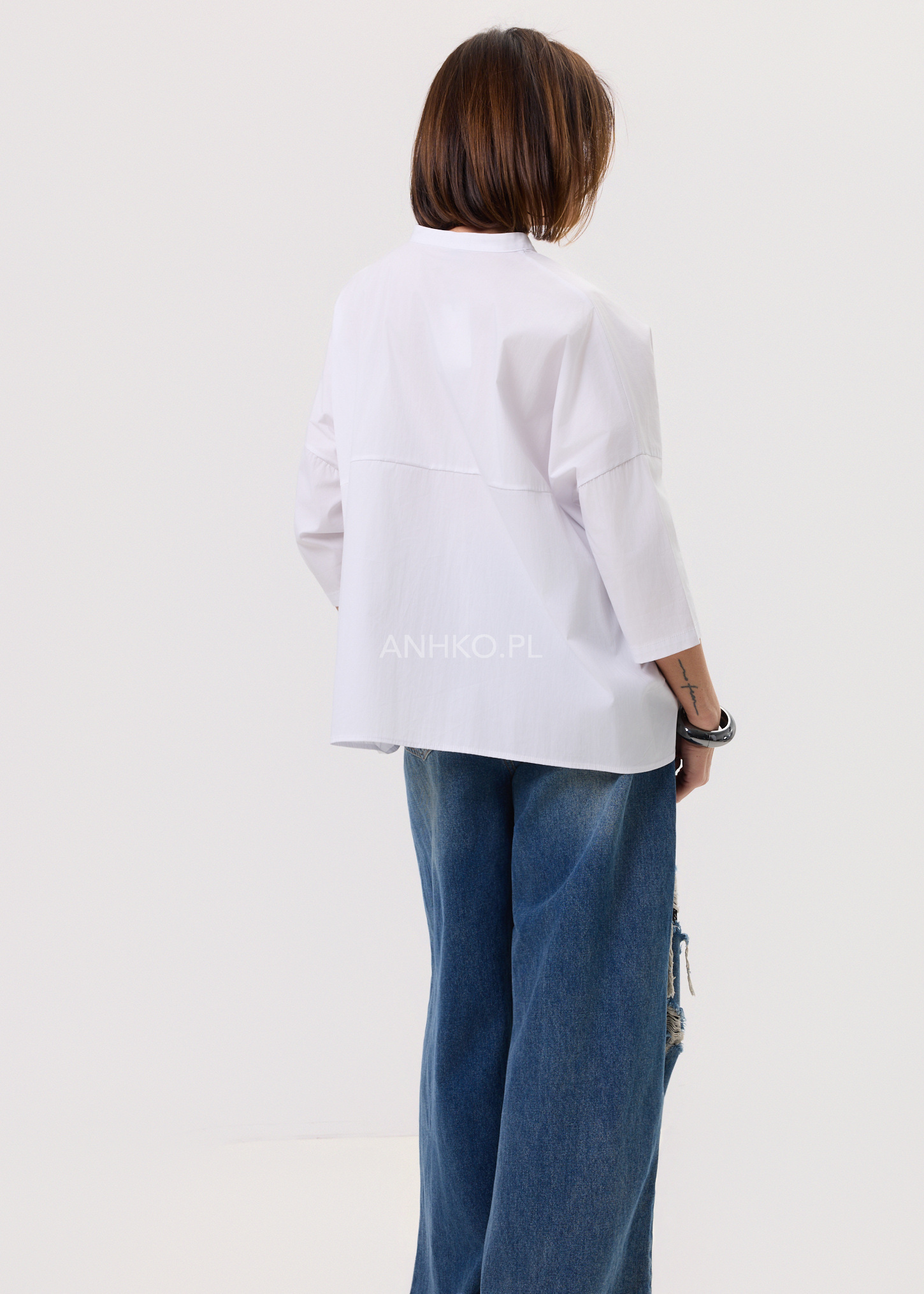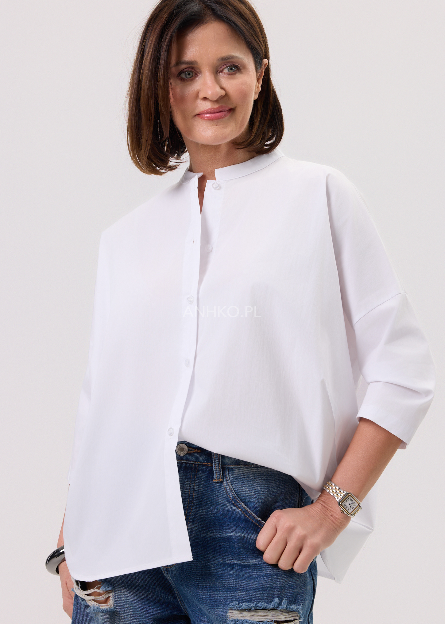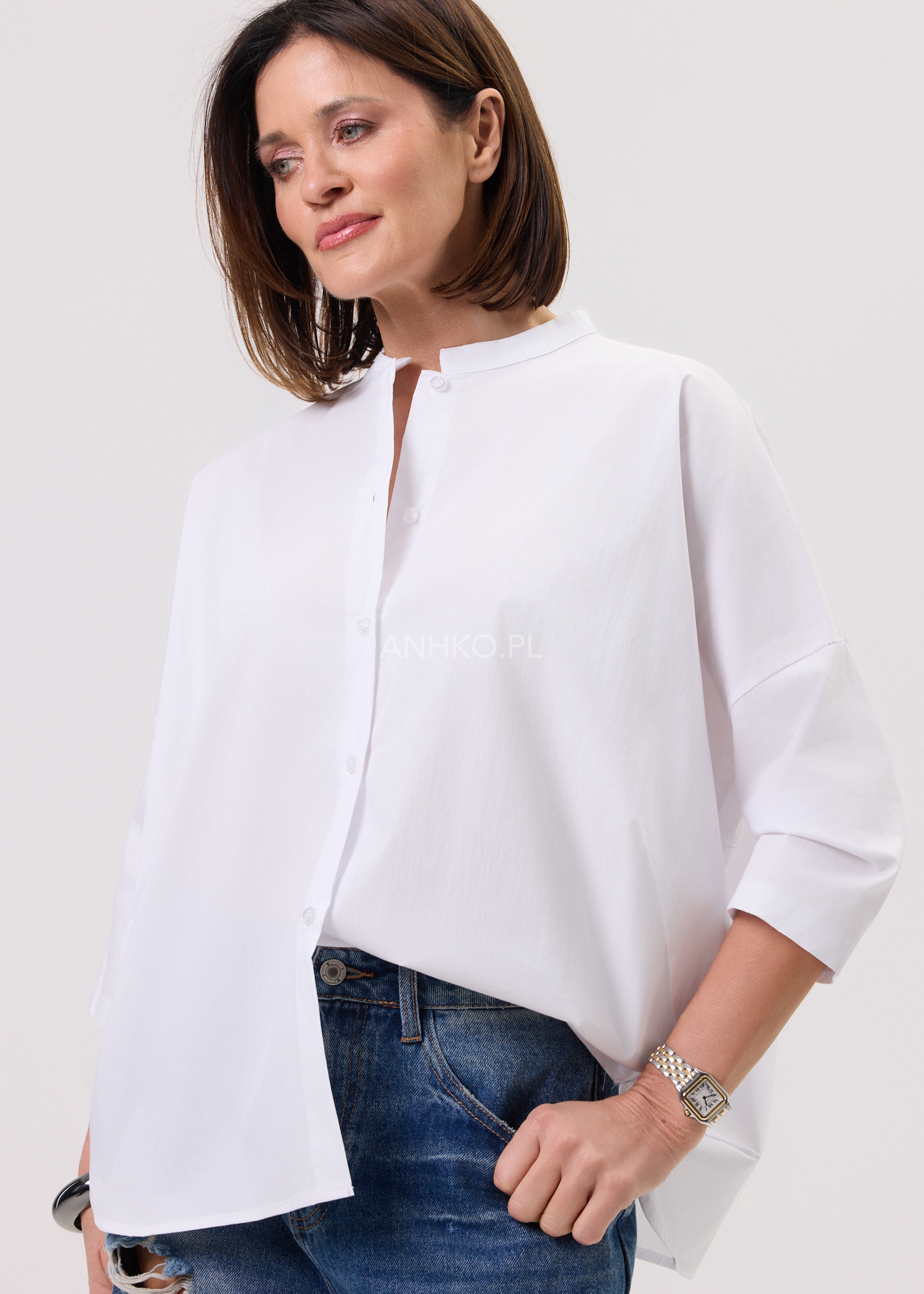 Gładka, biała tkanina podkreśla ponadczasowy charakter, a stójkowy dekolt z delikatnym rozcięciem i guzikami wprowadza minimalistyczny detal. Materiał z przewagą bawełny jest przyjemny w dotyku, a dzięki dodatkowi elastanu całość delikatnie pracuje z sylwetką. To model, który sprawdzi się jako baza do warstwowych stylizacji i element kapsułowej garderoby w estetyce casual premium.