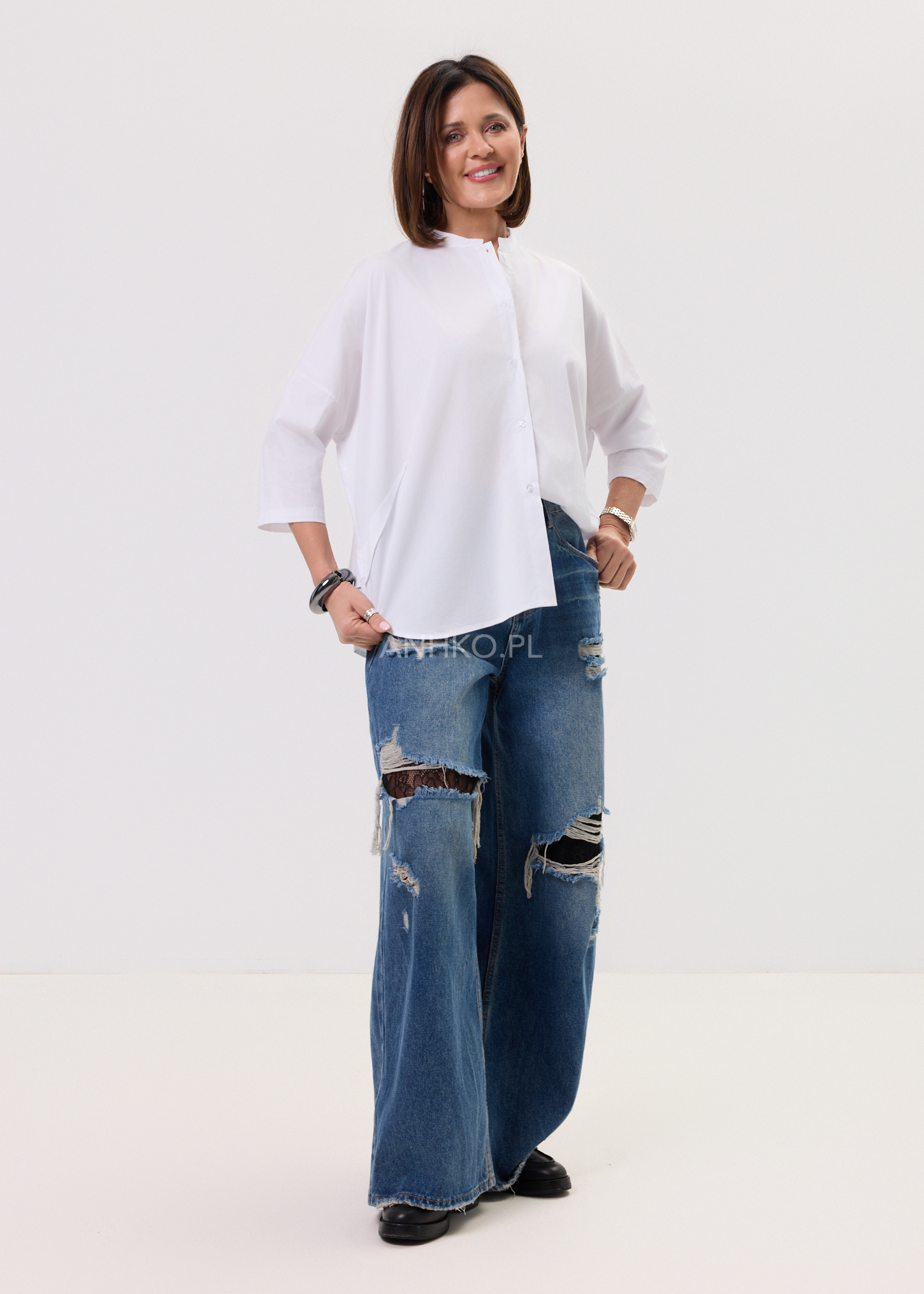 Ta koszula damska o luźnym, oversize’owym kroju swobodnie opływa sylwetkę, tworząc lekki, nowoczesny kształt. Szeroka linia ramion oraz rękaw 3/4 nadają jej subtelnej objętości, dzięki czemu model nie przylega do ciała i zapewnia pełen komfort ruchu. Długość do bioder pozwala nosić ją zarówno wpuszczoną w spodnie, jak i luźno – w zależności od efektu, jaki chcesz uzyskać.