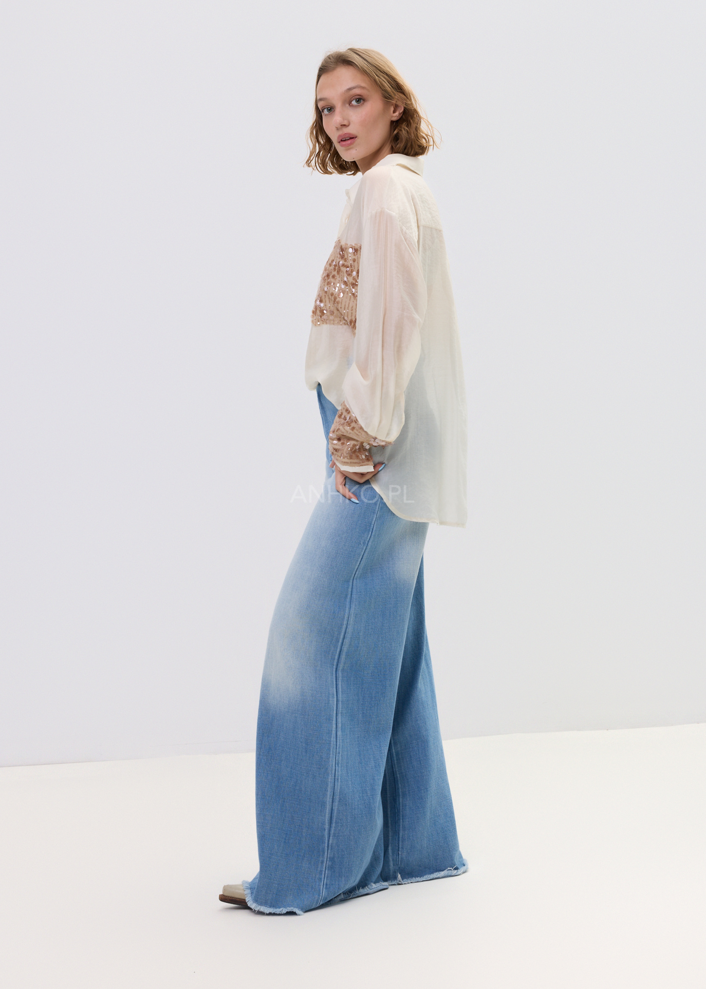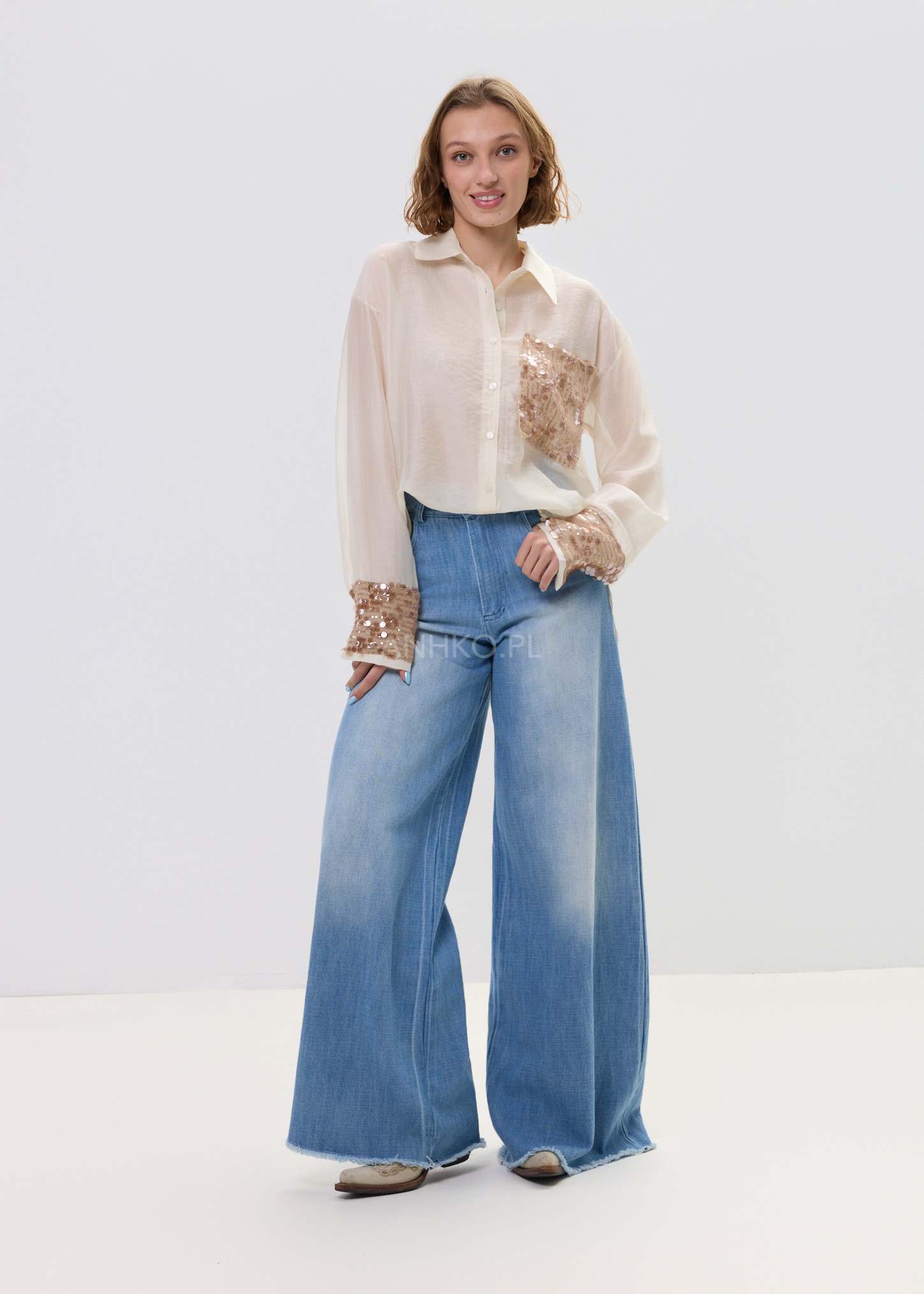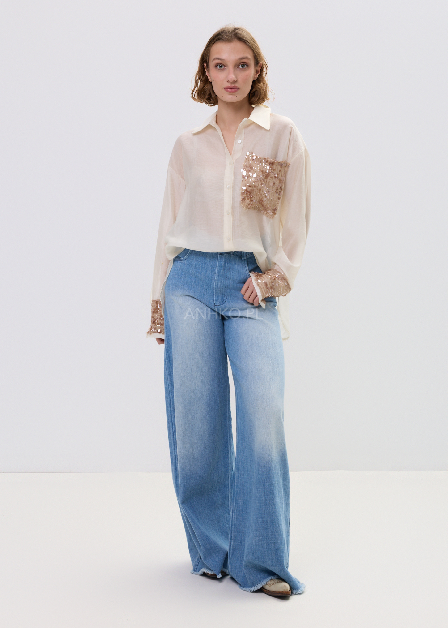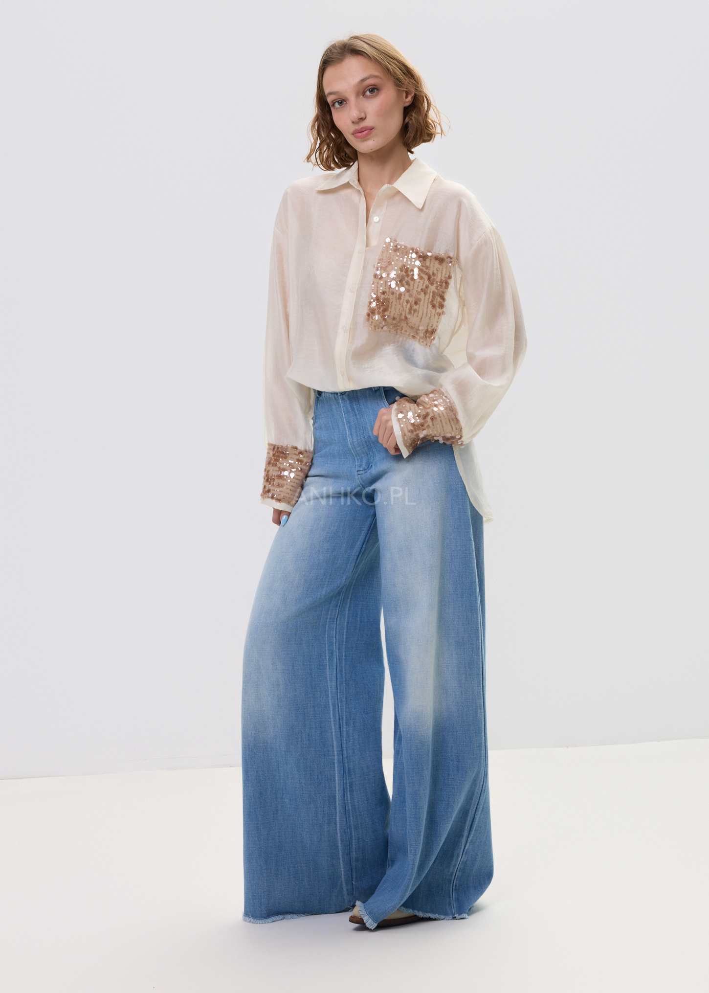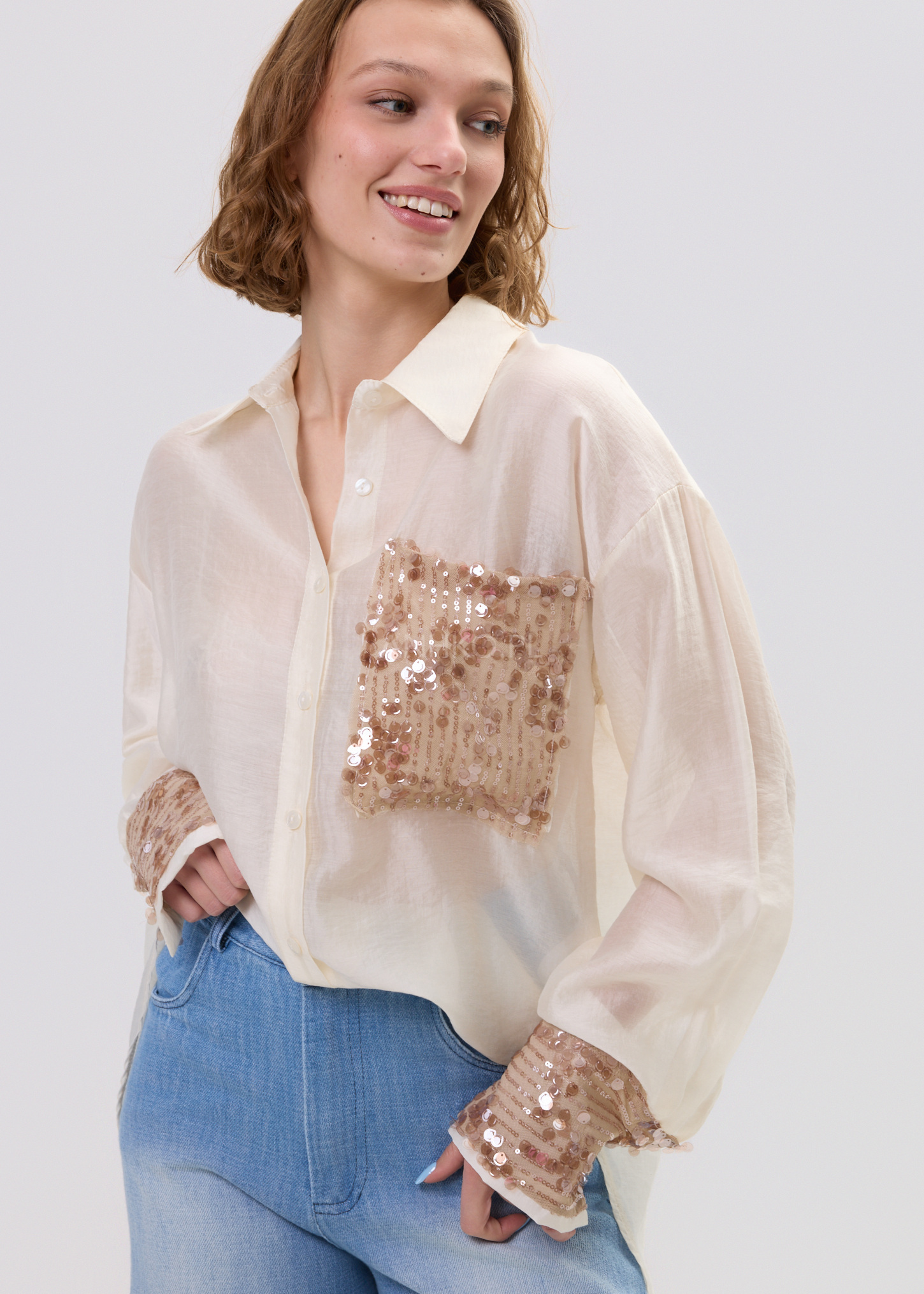 Model wyróżnia się detalem, który przyciąga spojrzenia – kieszonką z cekinami, subtelnie przełamującą klasyczną formę. Delikatna tkanina z lyocellu sprawia, że koszula jest przyjemna w dotyku i świetnie sprawdza się w stylizacjach warstwowych – zarówno w wersji casual, jak i bardziej dopracowanej.