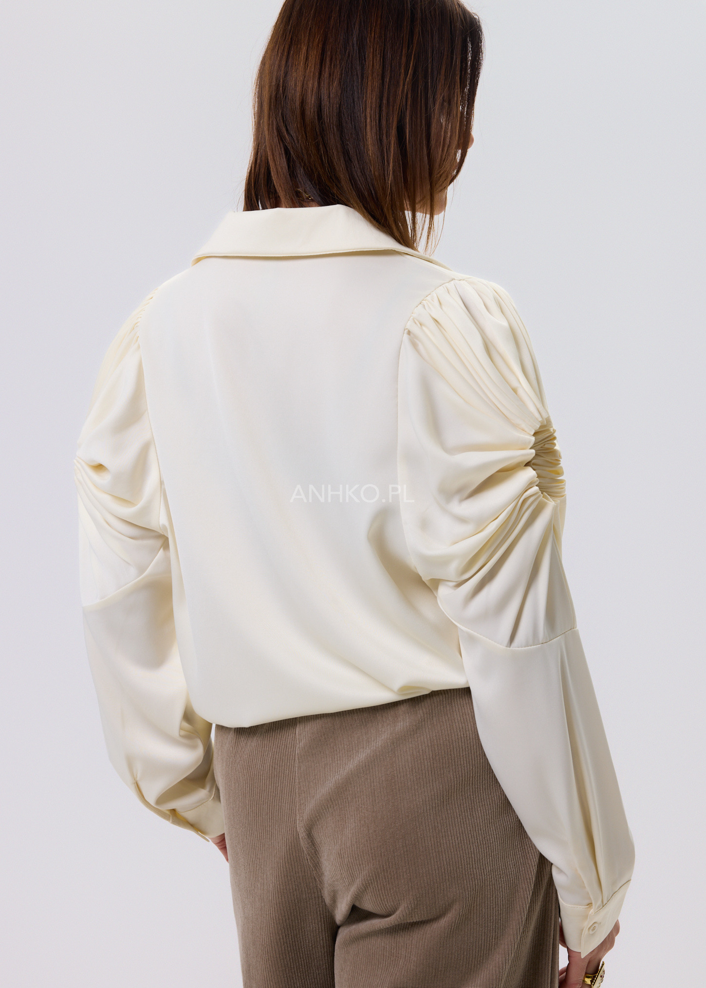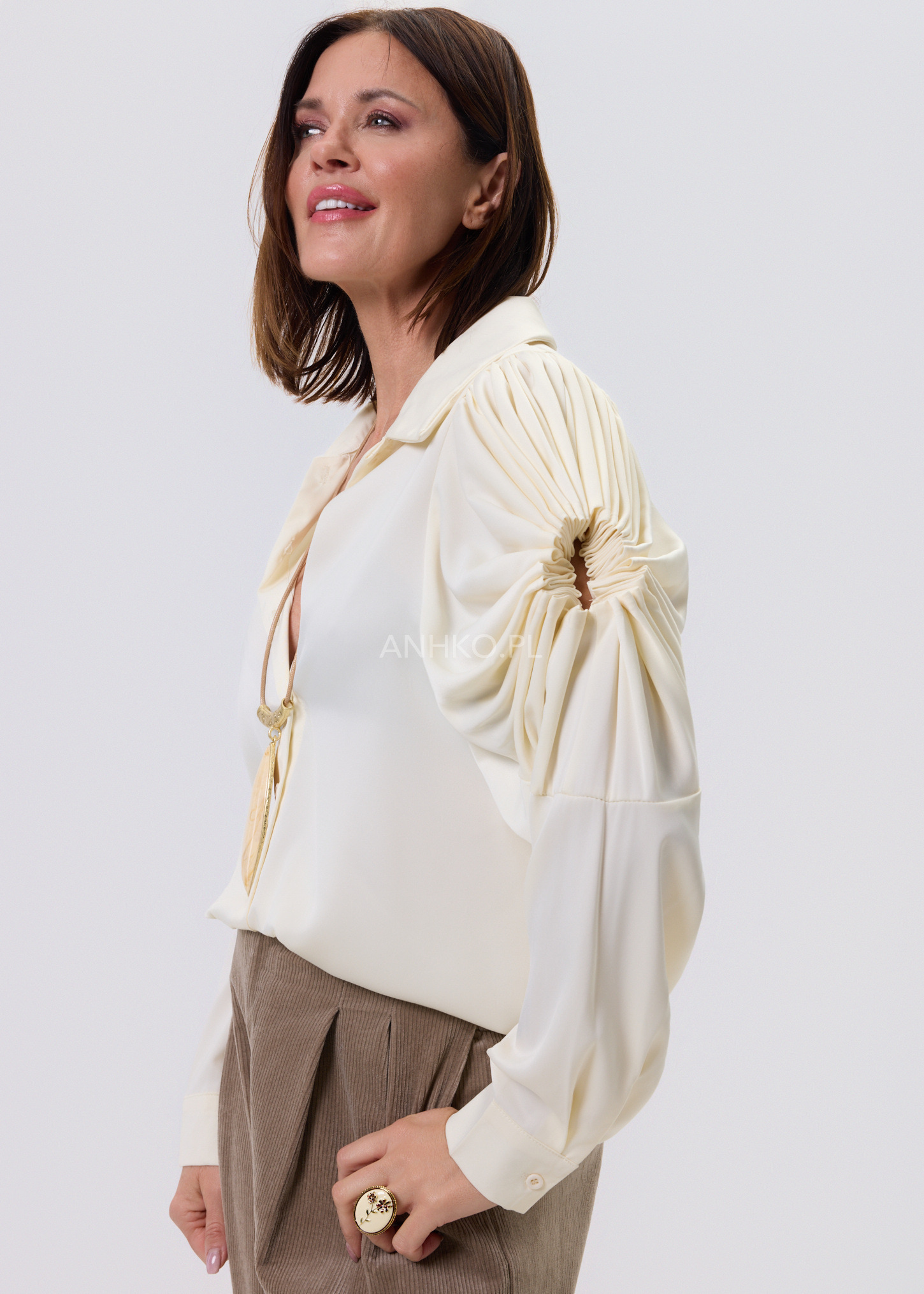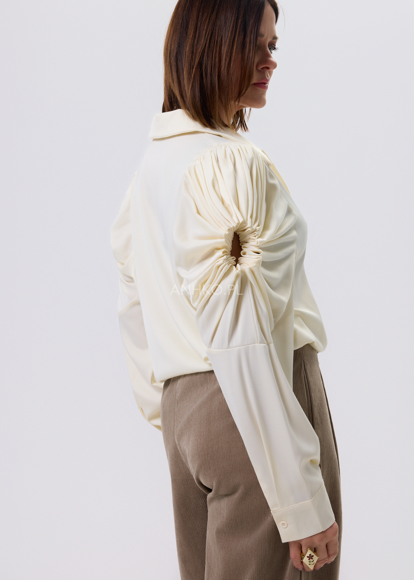Koszula Soft Drapé to połączenie klasycznej formy z wyraźnym, modowym akcentem. Kremowy kolor nadaje całości lekkości i elegancji, a dekoracyjne rękawy z efektownym marszczeniem przyciągają uwagę i budują wyjątkowy charakter modelu. Dłuższy krój zapewnia komfort noszenia i świetnie sprawdza się zarówno wpuszczony w spodnie, jak i noszony luźno. Klasyczny koszulowy dekolt dodaje całości ponadczasowego stylu, dzięki czemu koszula z łatwością odnajdzie się w stylizacjach do pracy, na spotkania czy na co dzień — zawsze z nutą elegancji.