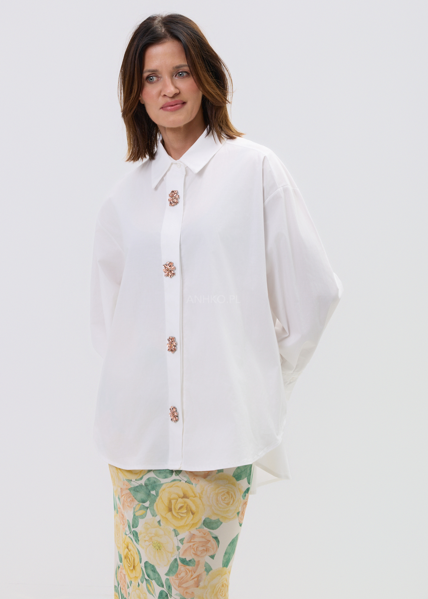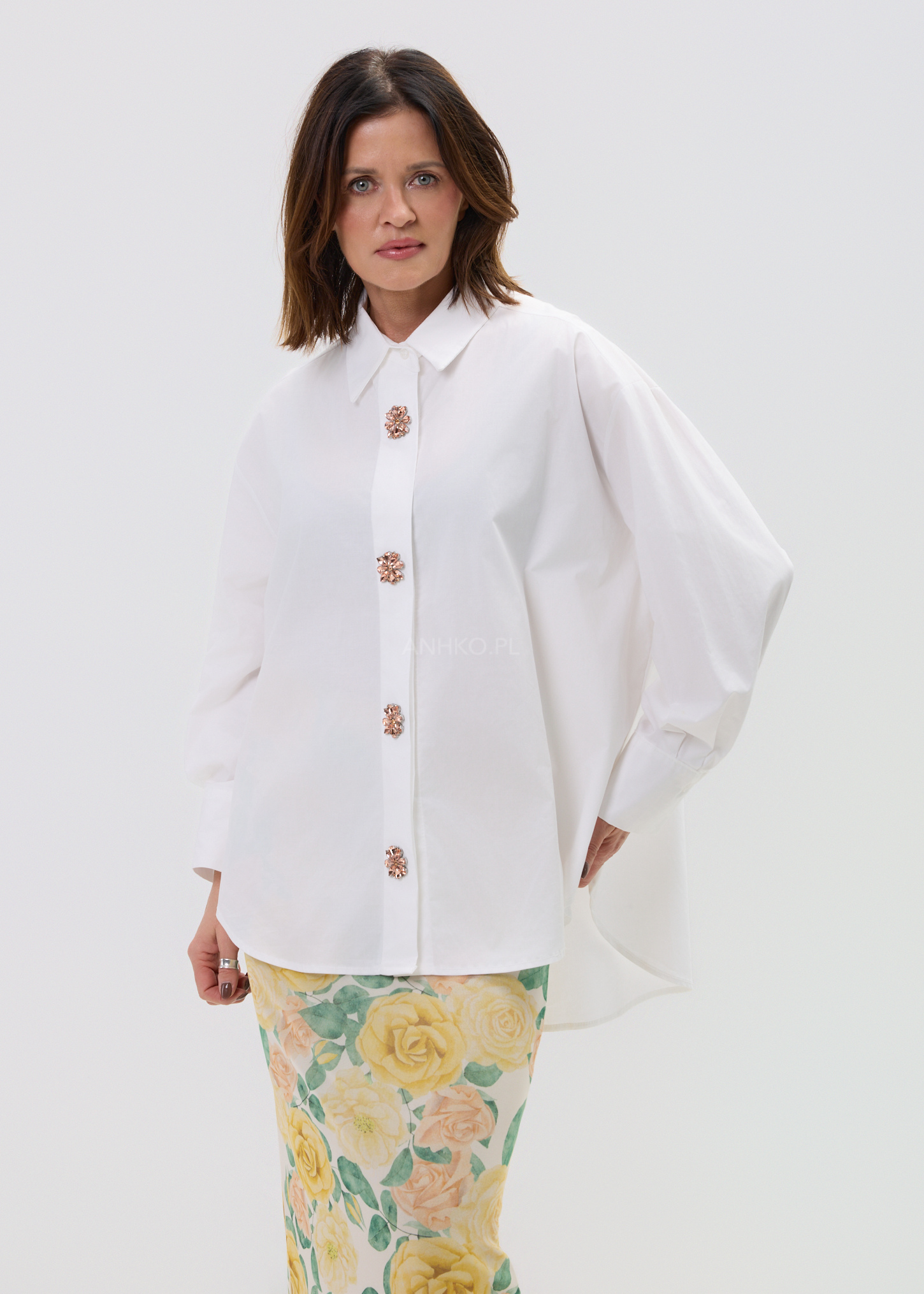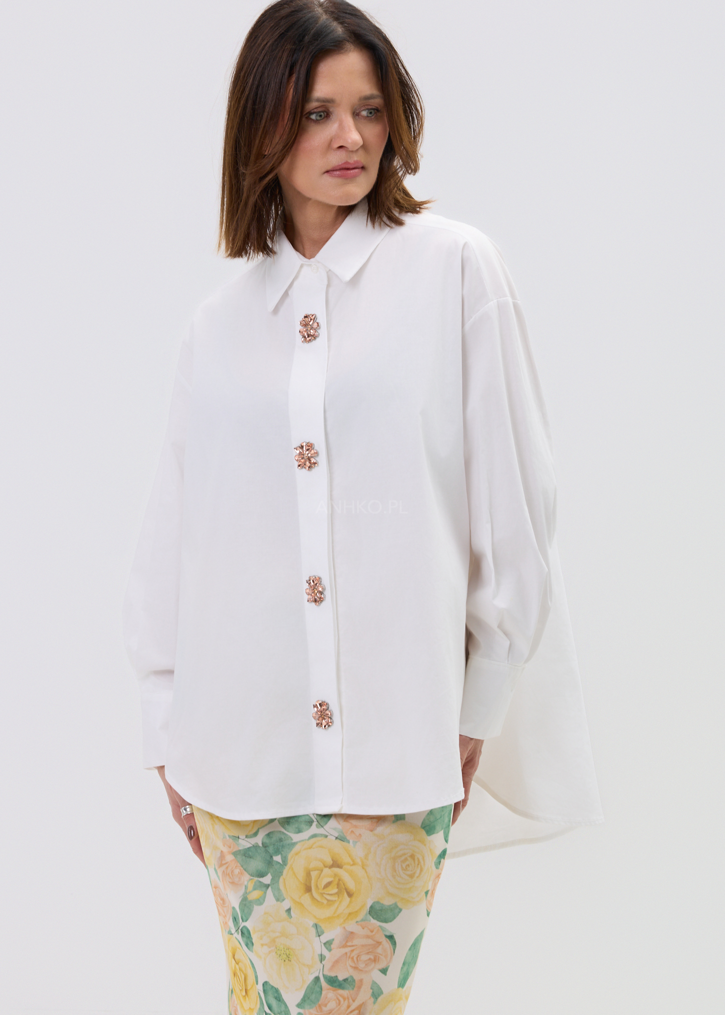 Najmocniejszym punktem modelu są ozdobne, kwiatowe guziki o biżuteryjnym wykończeniu, które przyciągają spojrzenia i nadają koszuli unikalnego charakteru. To model, który sprawdzi się zarówno w codziennych stylizacjach, jak i w bardziej dopracowanych zestawach – noś ją do jeansów, eleganckich spodni lub w warstwowych stylizacjach dla pełnego efektu statement.