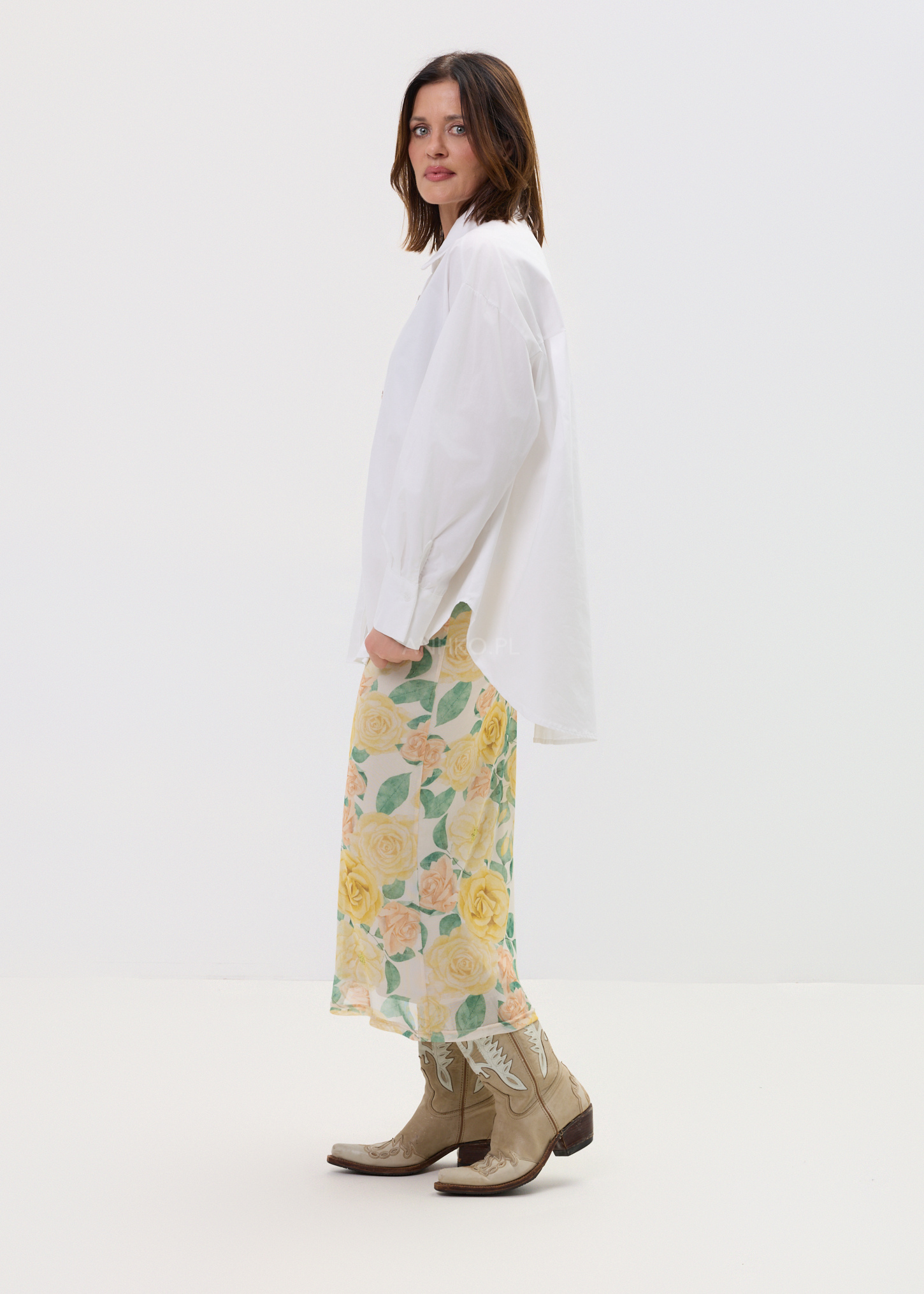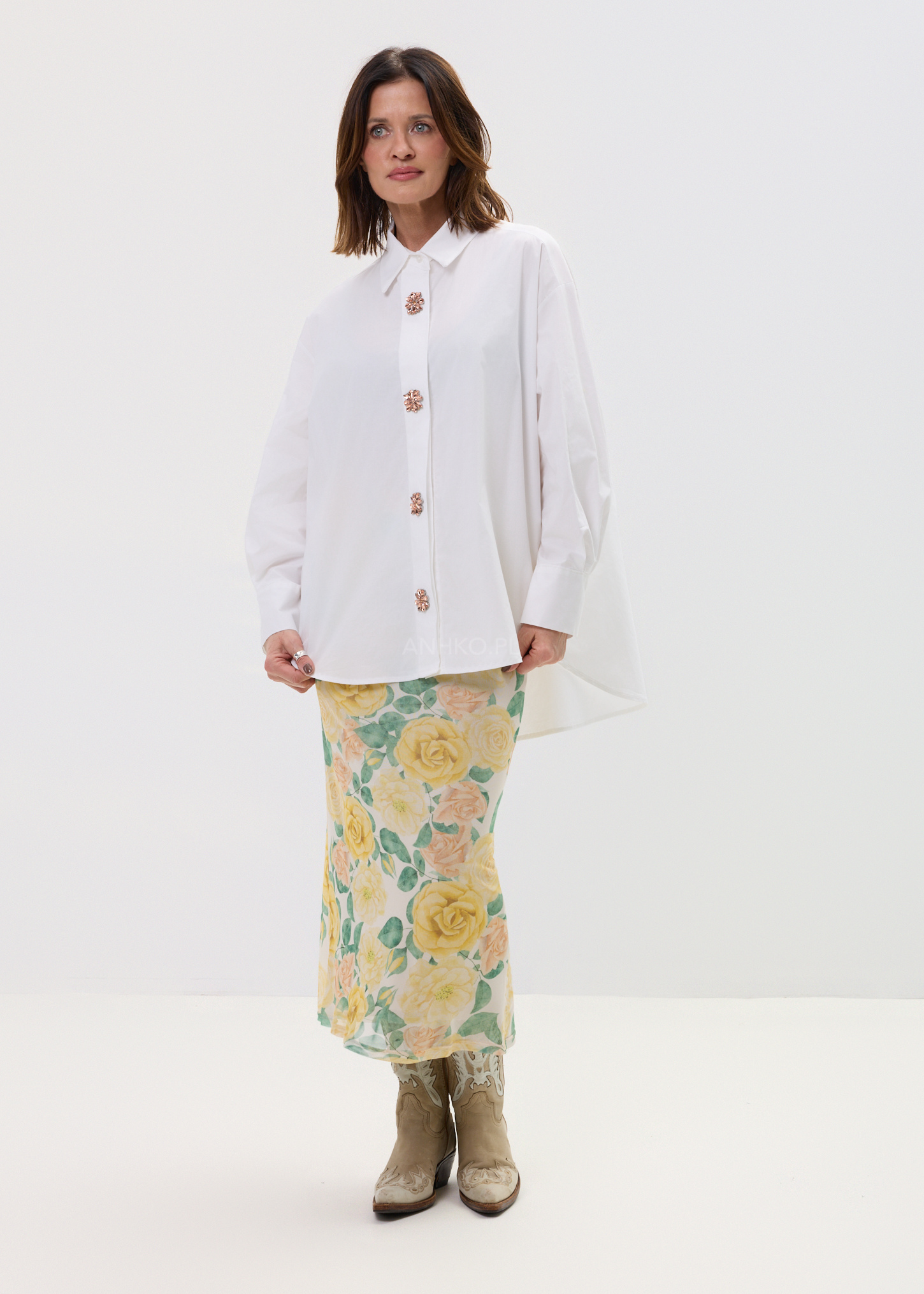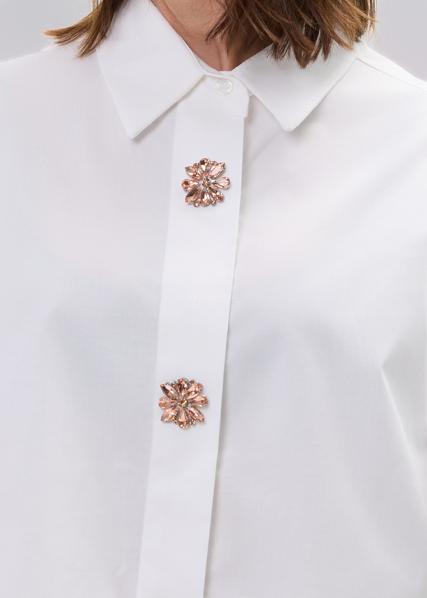 Najmocniejszym punktem modelu są ozdobne, kwiatowe guziki o biżuteryjnym wykończeniu, które przyciągają spojrzenia i nadają koszuli unikalnego charakteru. To model, który sprawdzi się zarówno w codziennych stylizacjach, jak i w bardziej dopracowanych zestawach – noś ją do jeansów, eleganckich spodni lub w warstwowych stylizacjach dla pełnego efektu statement.