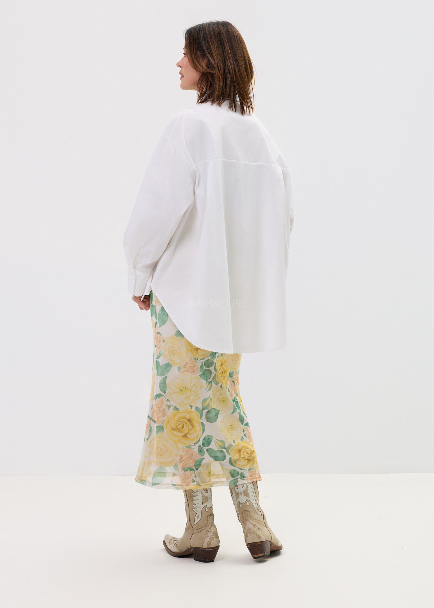 Ta koszula oversize zachwyca formą, która swobodnie układa się na sylwetce i nadaje jej nowoczesnego charakteru. Luźny fason z wydłużonym tyłem zapewnia komfort noszenia i świetnie wpisuje się w estetykę effortless look. Subtelnie opadająca linia ramion dodatkowo podkreśla nonszalancki styl, a klasyczny kołnierzyk równoważy całość.