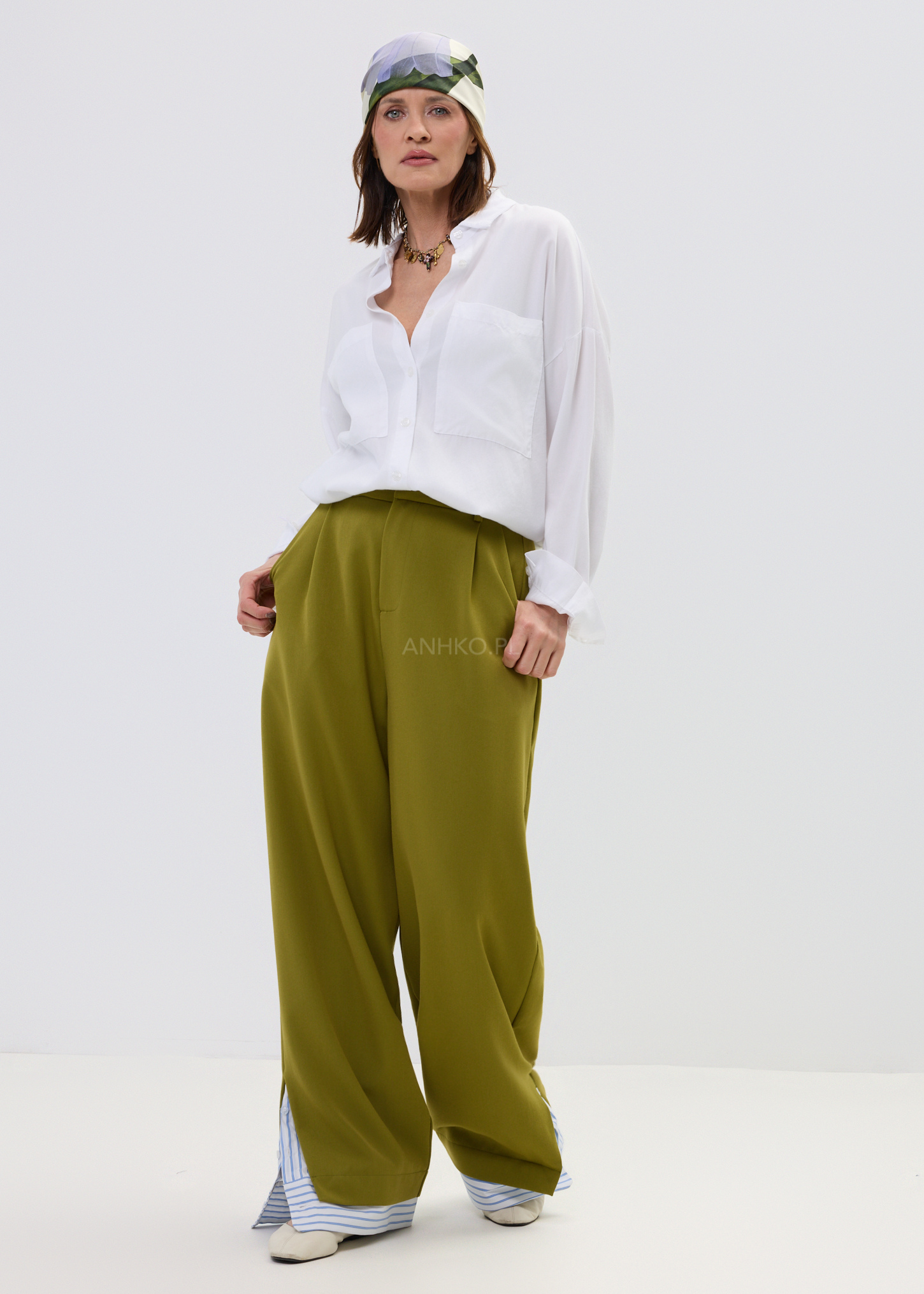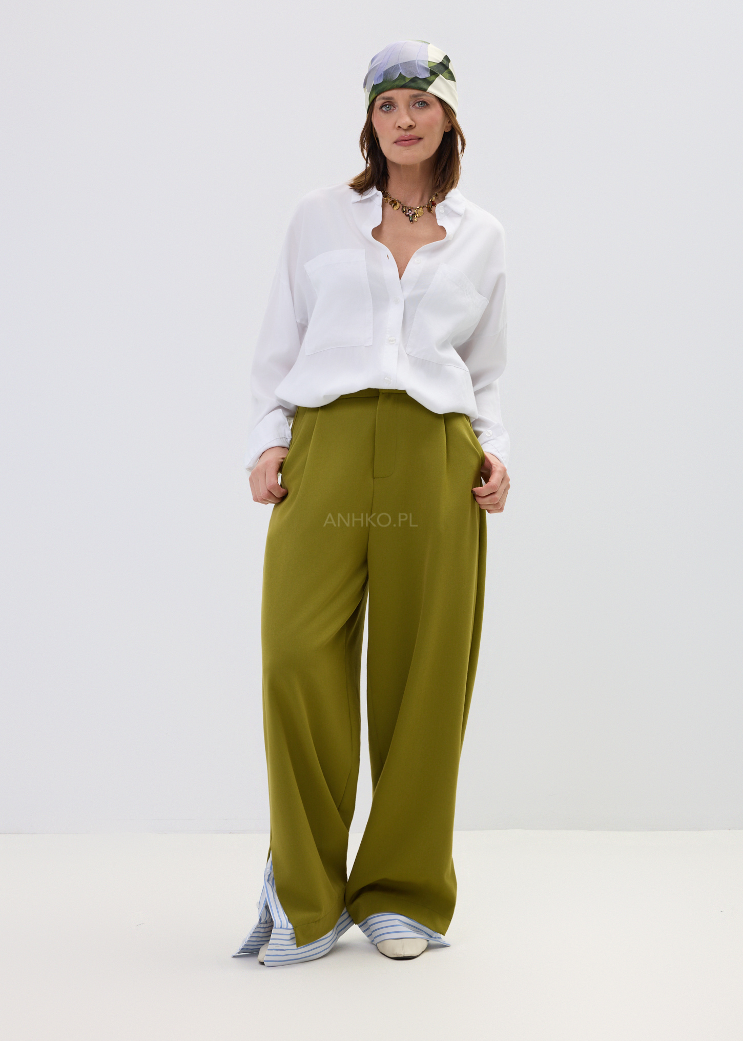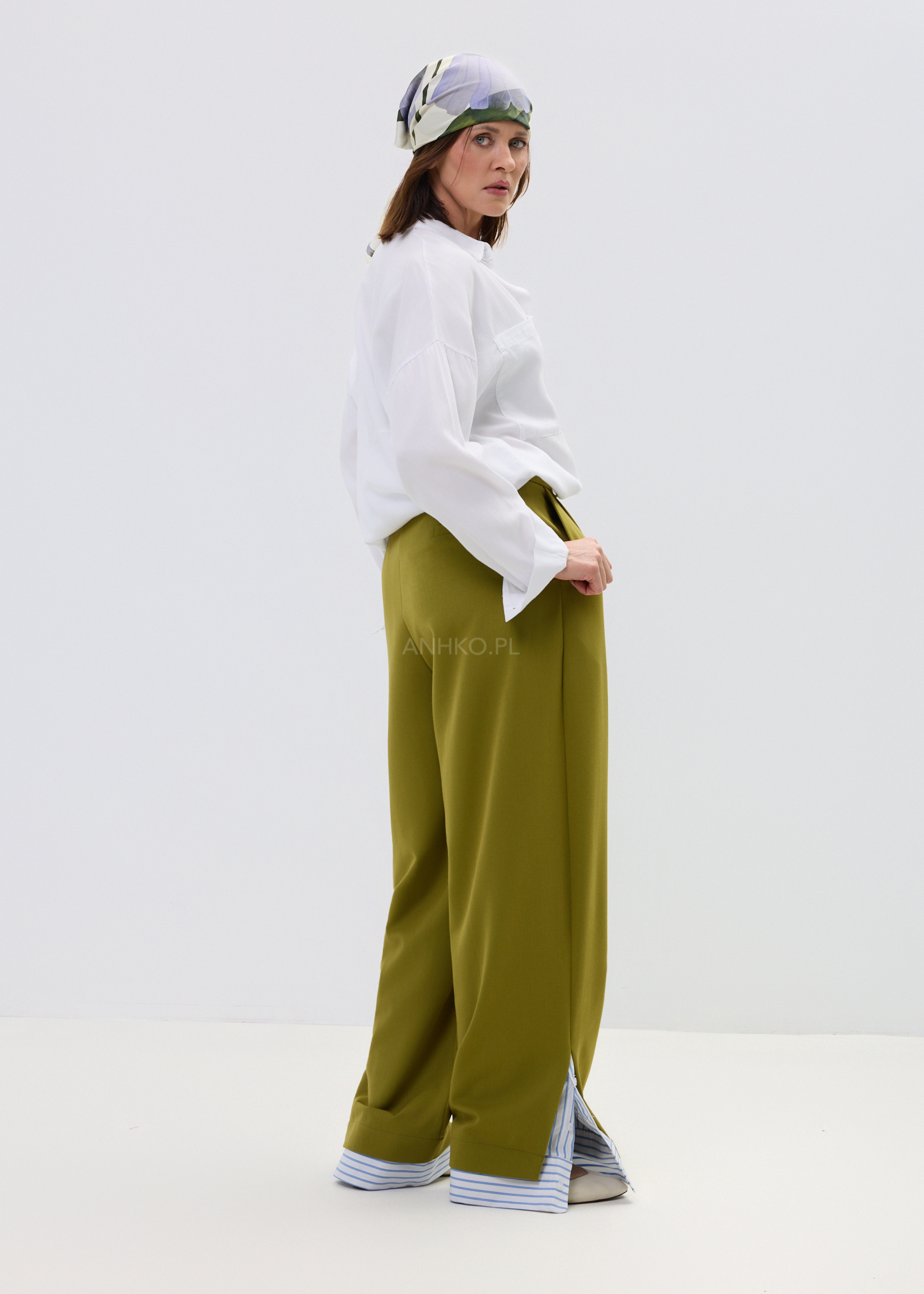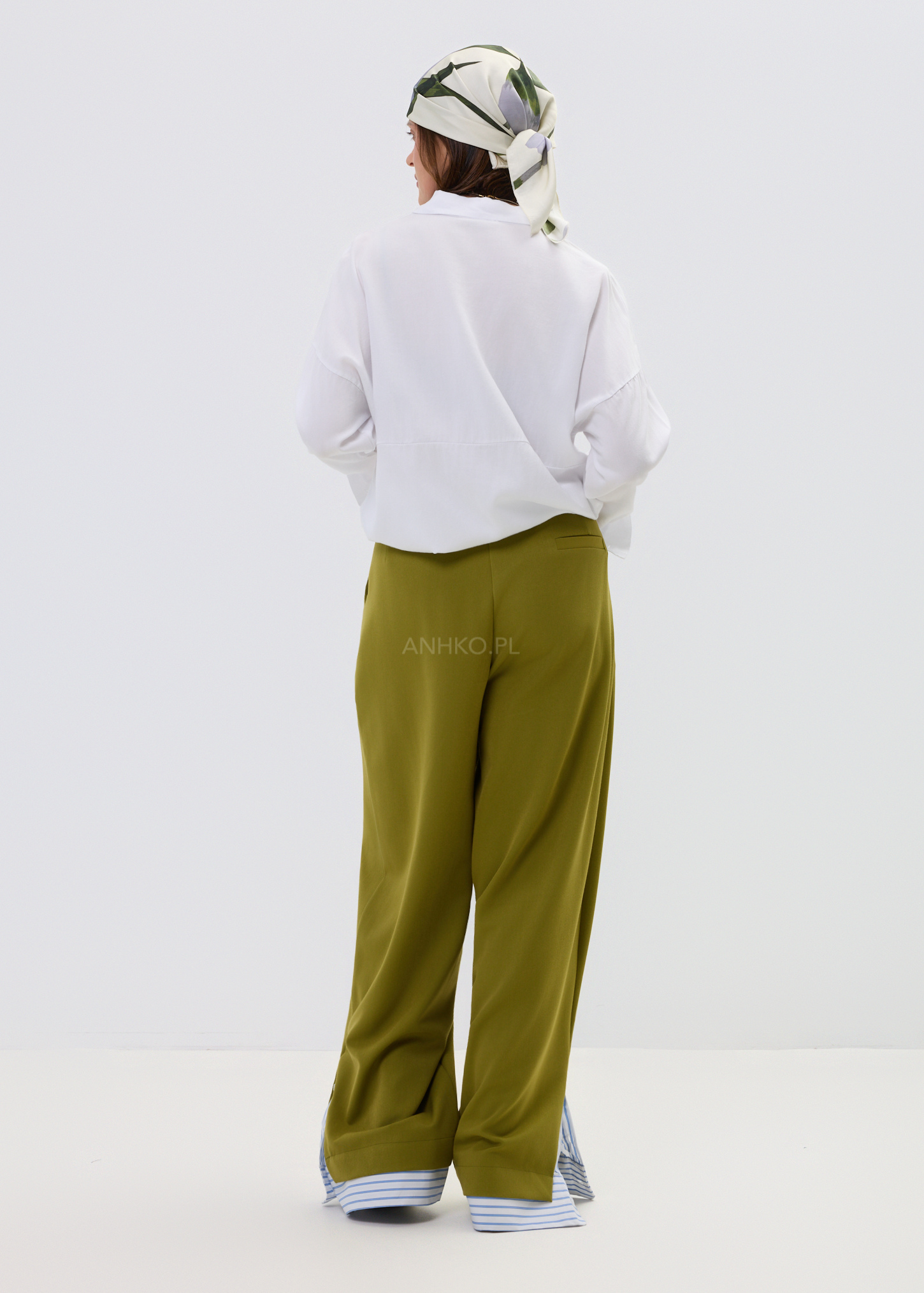 Spodnie Elegano Zielone - Luźne spodnie wide leg w nowoczesnym wydaniu. Minimalistyczna baza przełamana błękitnym detalem przy nogawce. Komfortowe, stylowe i gotowe na każdą okazję – od codziennych looków po bardziej dopracowane stylizacje.