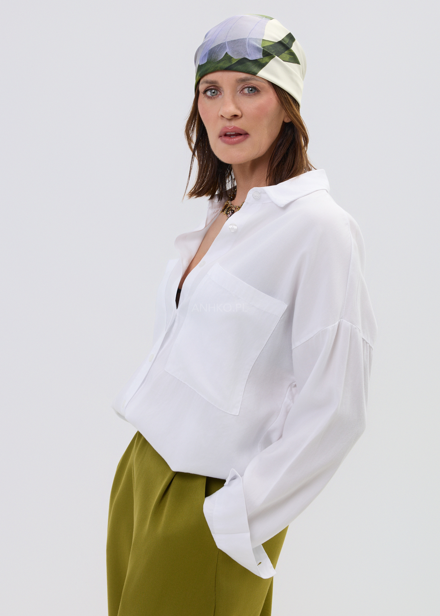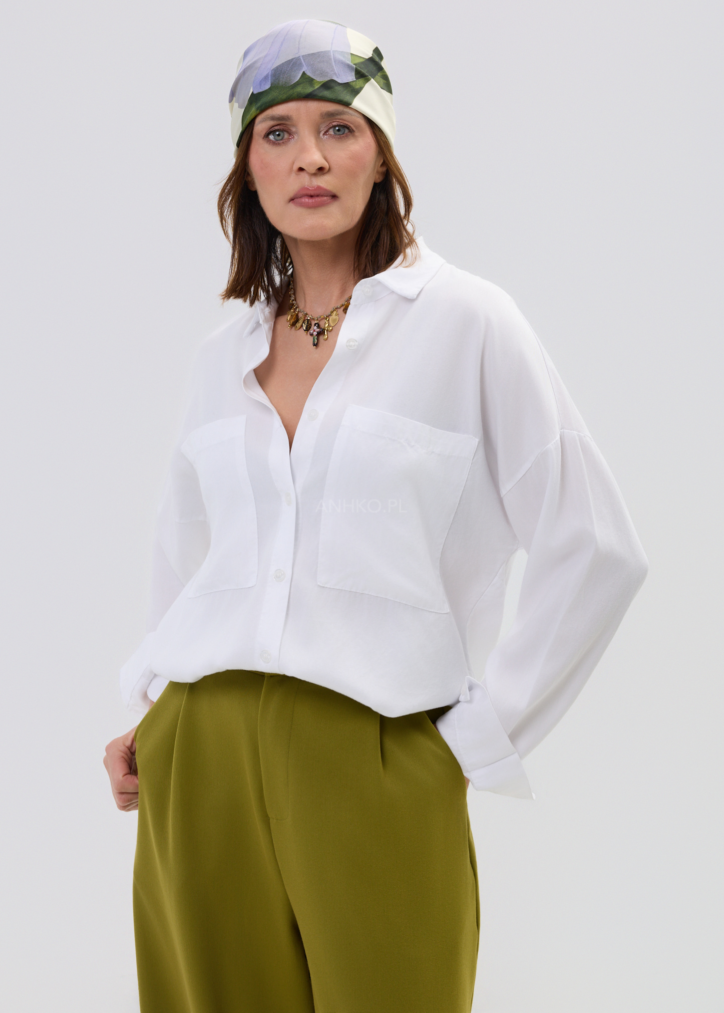 Ta koszula oversize o wyrazistym, Białym kolorze pięknie układa się na sylwetce, tworząc lekko opadającą, swobodną linię. Dzięki luźnemu fasonowi i delikatnie wydłużonemu tyłowi model zapewnia komfort oraz nowoczesny efekt wizualny, który sprawdzi się zarówno w codziennych, jak i bardziej dopracowanych stylizacjach.