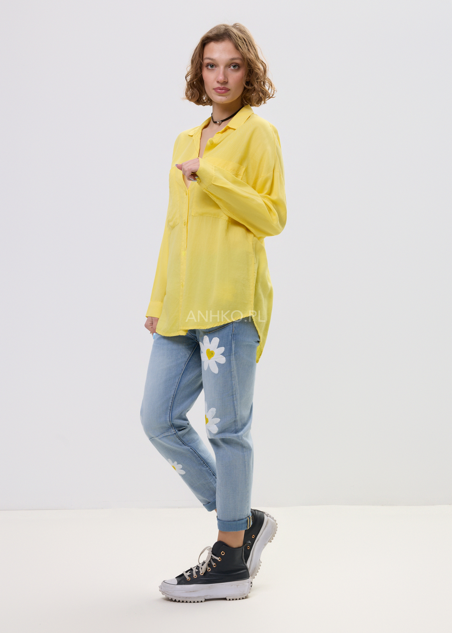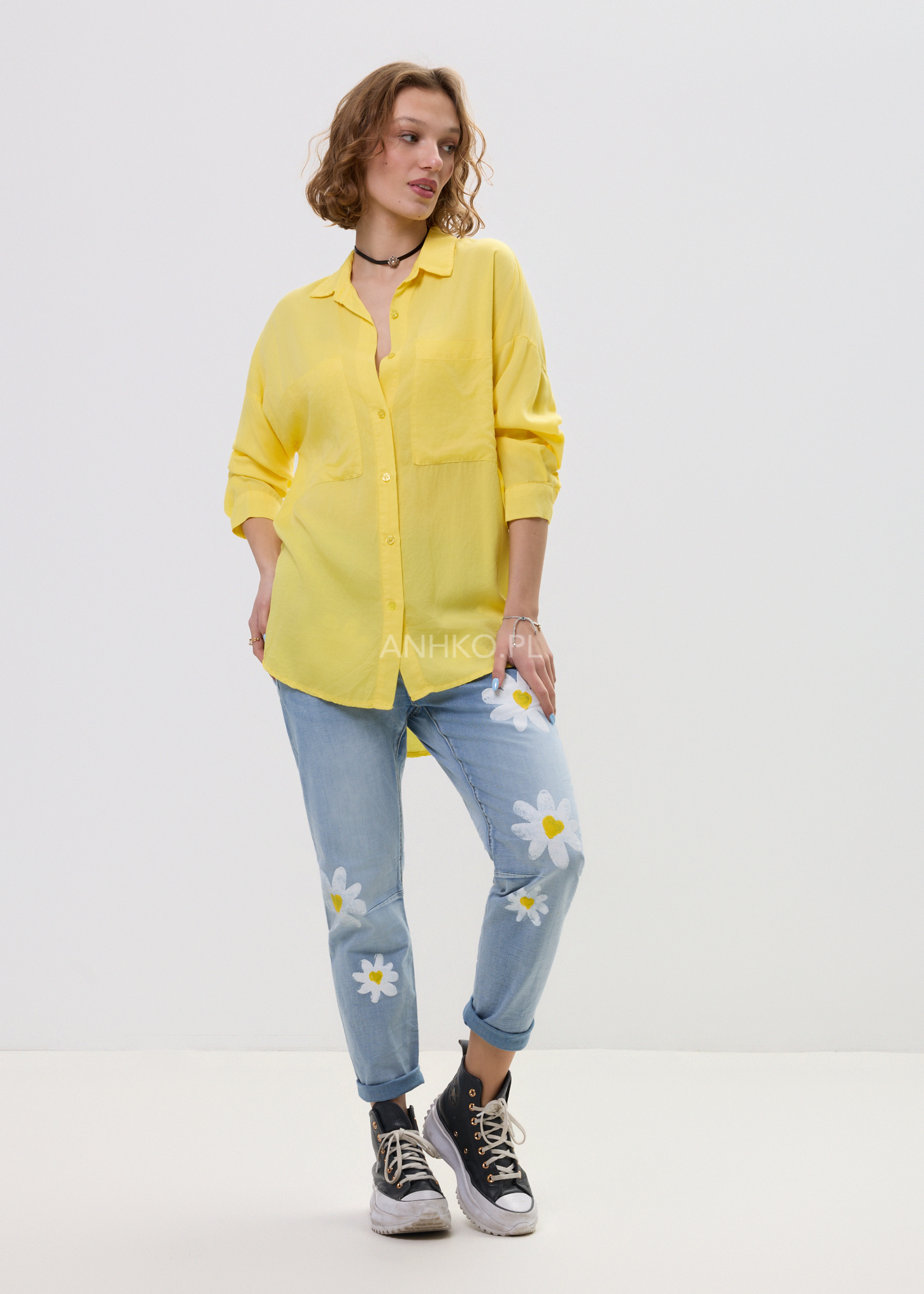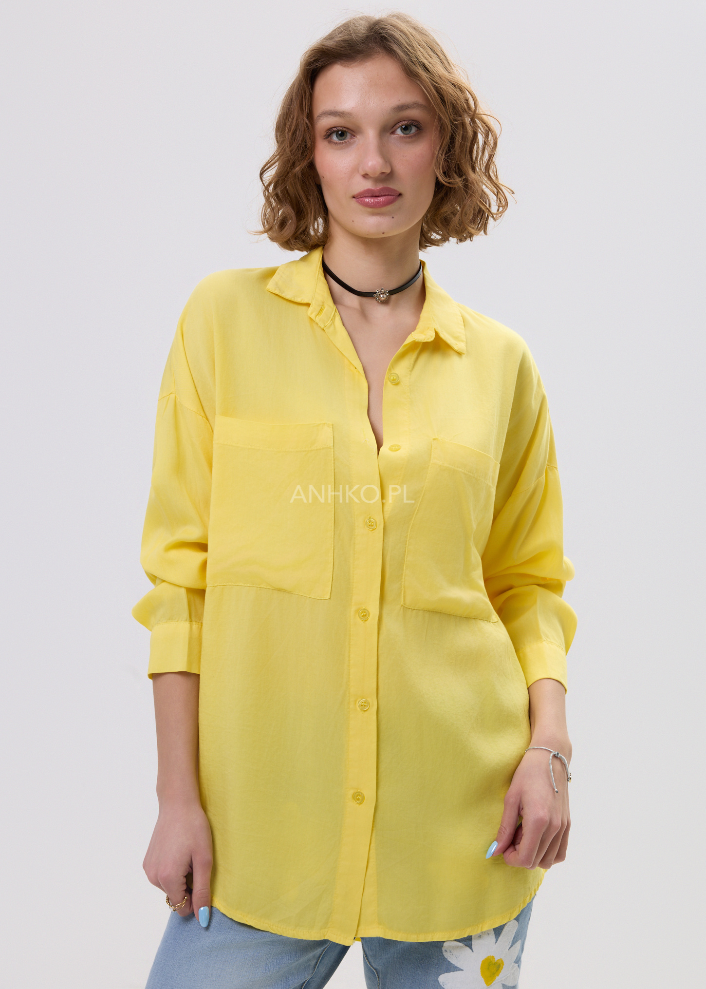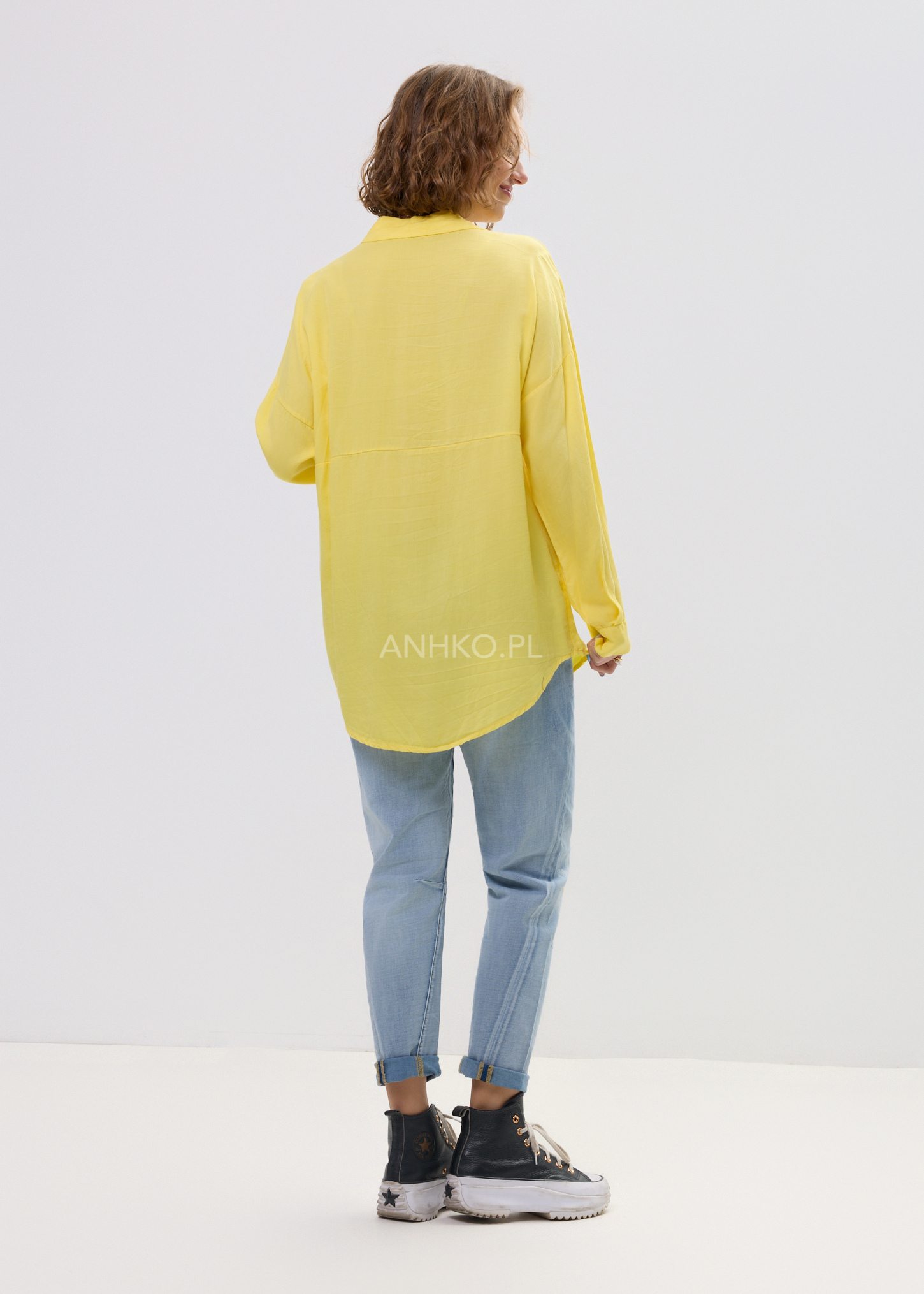 Ta koszula oversize o wyrazistym, cytrynowym odcieniu pięknie układa się na sylwetce, tworząc lekko opadającą, swobodną linię. Dzięki luźnemu fasonowi i delikatnie wydłużonemu tyłowi model zapewnia komfort oraz nowoczesny efekt wizualny, który sprawdzi się zarówno w codziennych, jak i bardziej dopracowanych stylizacjach.
