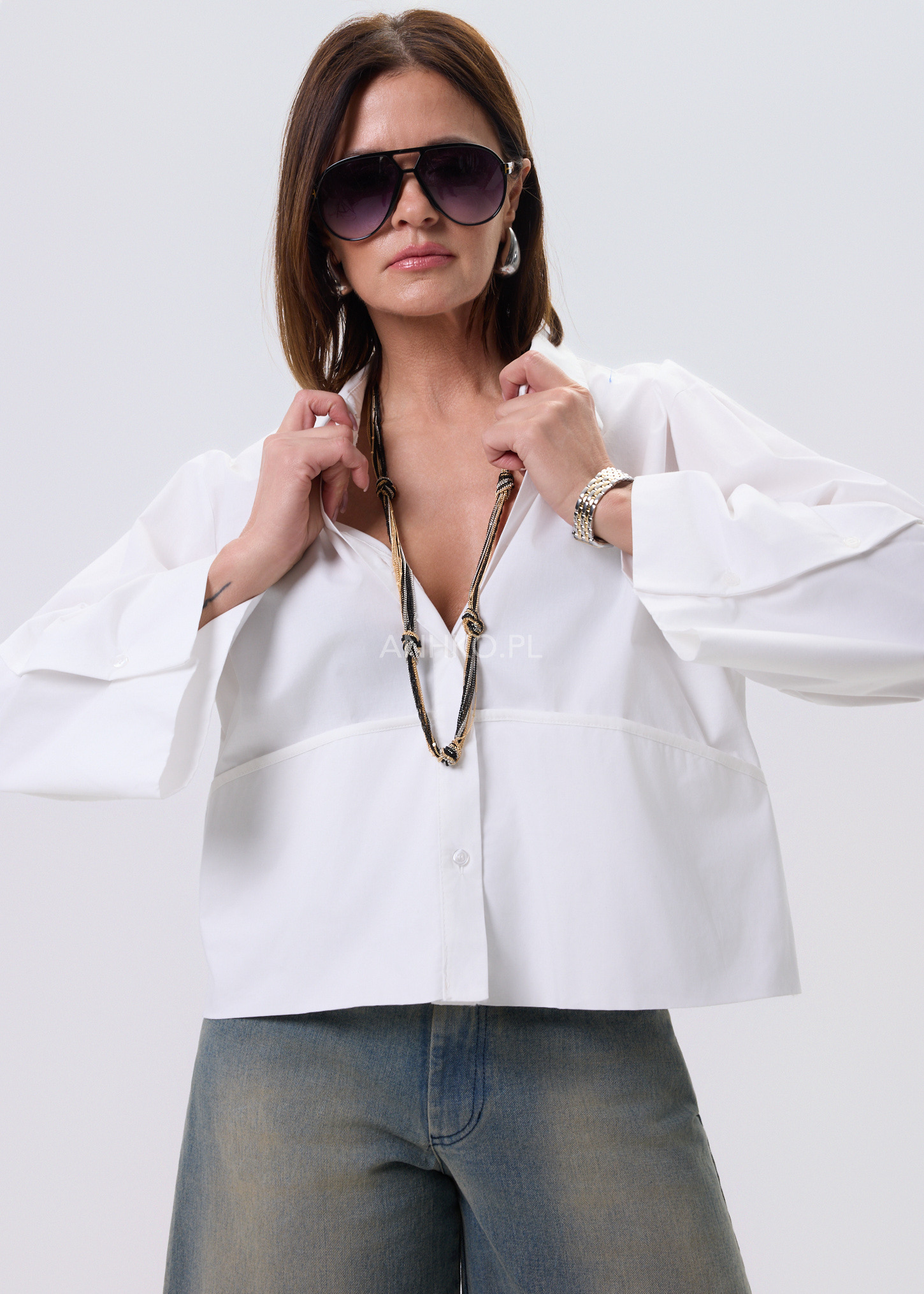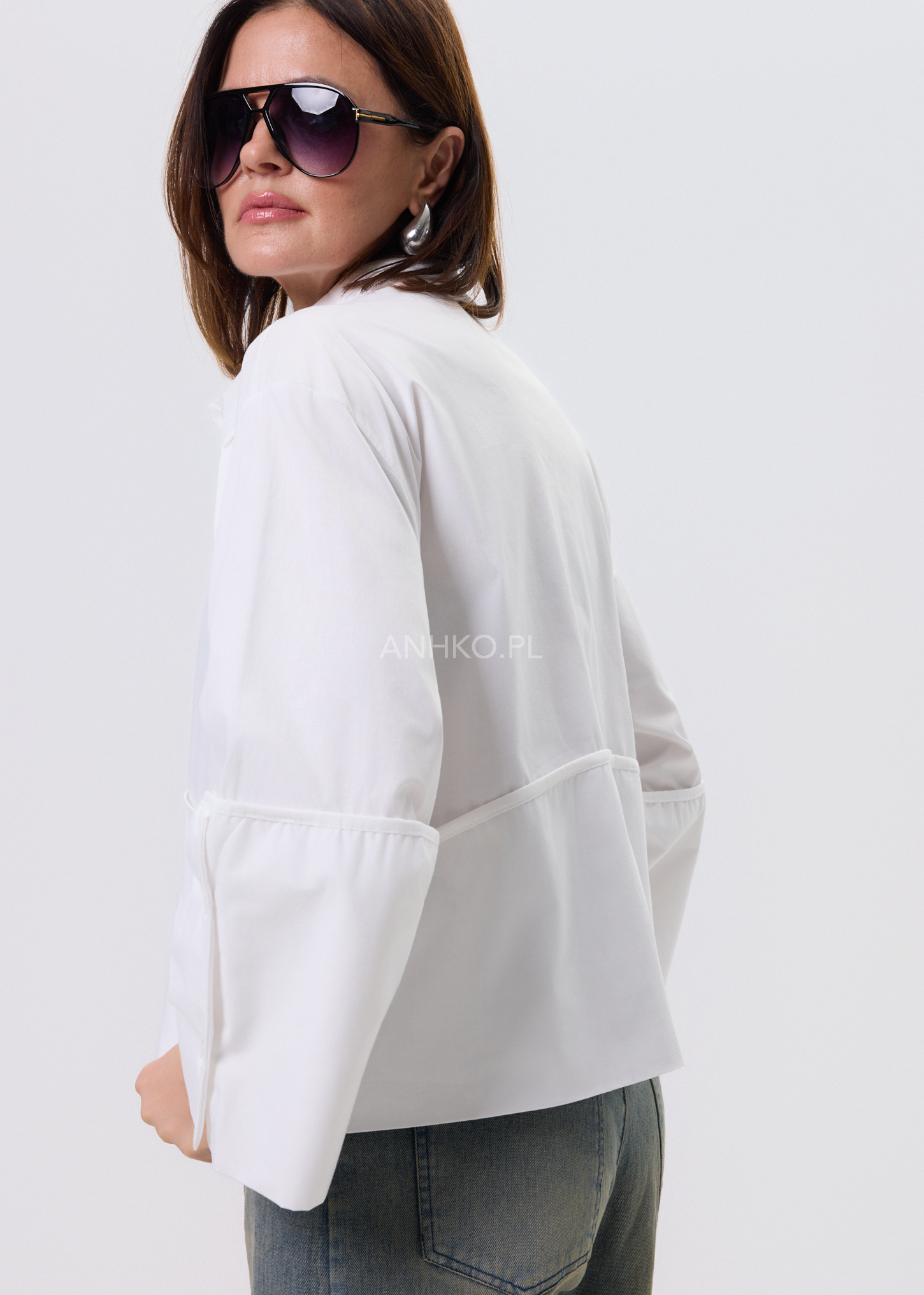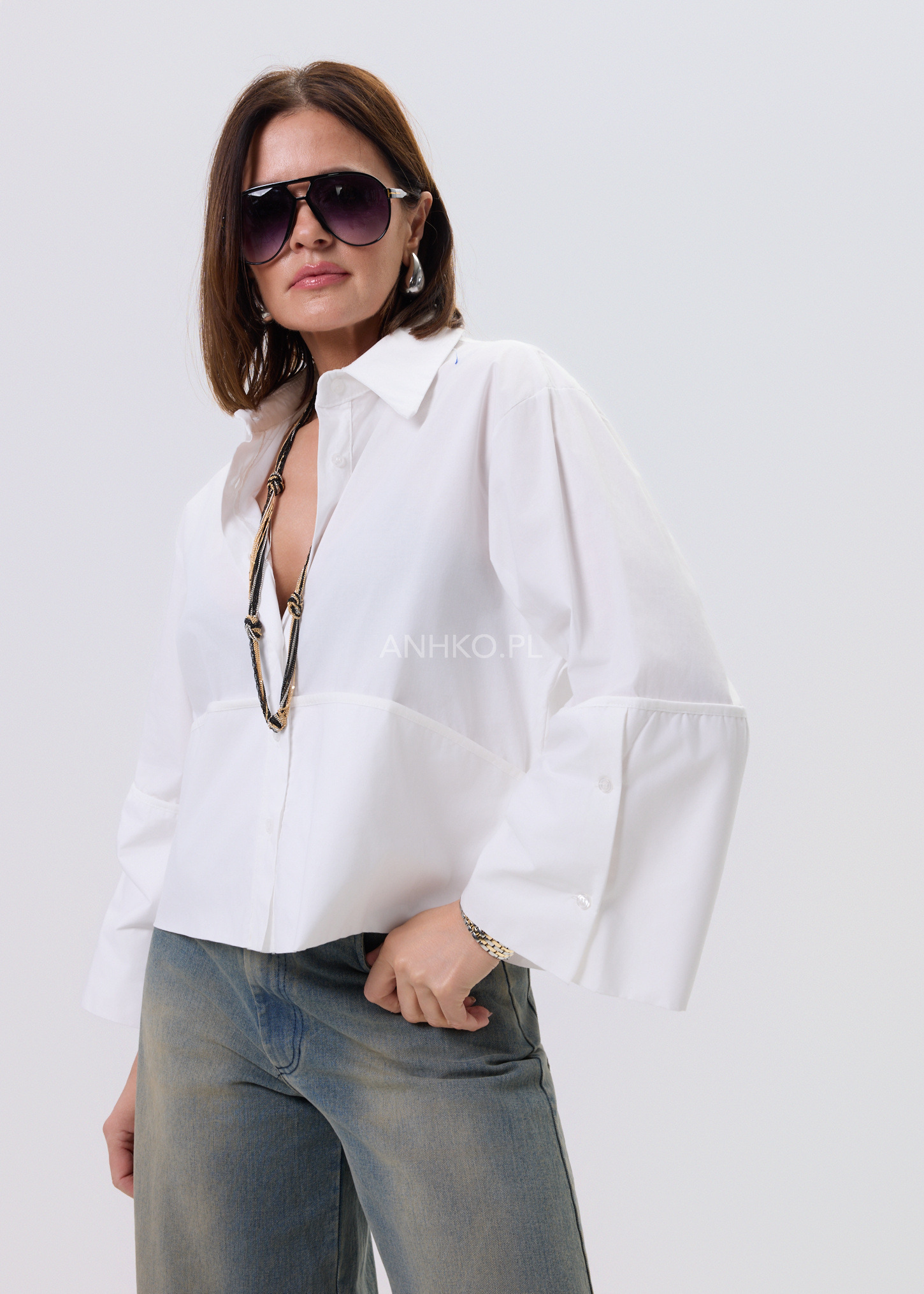 Biała koszula damska o luźnym kroju typu relaxed, zaprojektowana z myślą o wygodzie i stylowym, nowoczesnym wyglądzie. Model posiada klasyczny kołnierzyk oraz zapięcie na guziki, które nadają całości ponadczasowego charakteru. Asymetryczna linia z dłuższym tyłem sprawia, że koszula dobrze układa się na sylwetce i pasuje zarówno do spodni, jak i spódnic. Dekoracyjne, poszerzane rękawy dodają lekkości i subtelnego akcentu modowego. Bawełniany materiał zapewnia komfort noszenia przez cały dzień. To uniwersalna propozycja do stylizacji casualowych i półeleganckich.