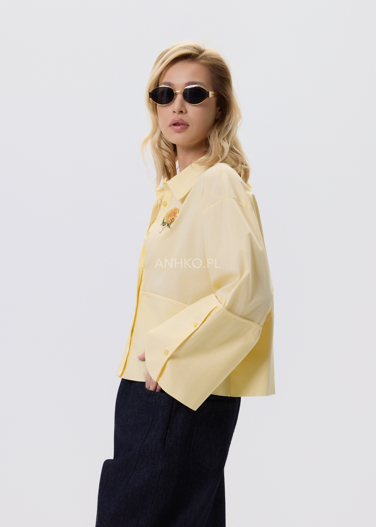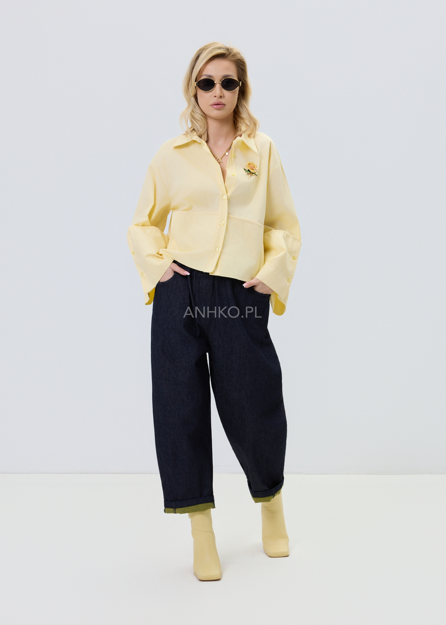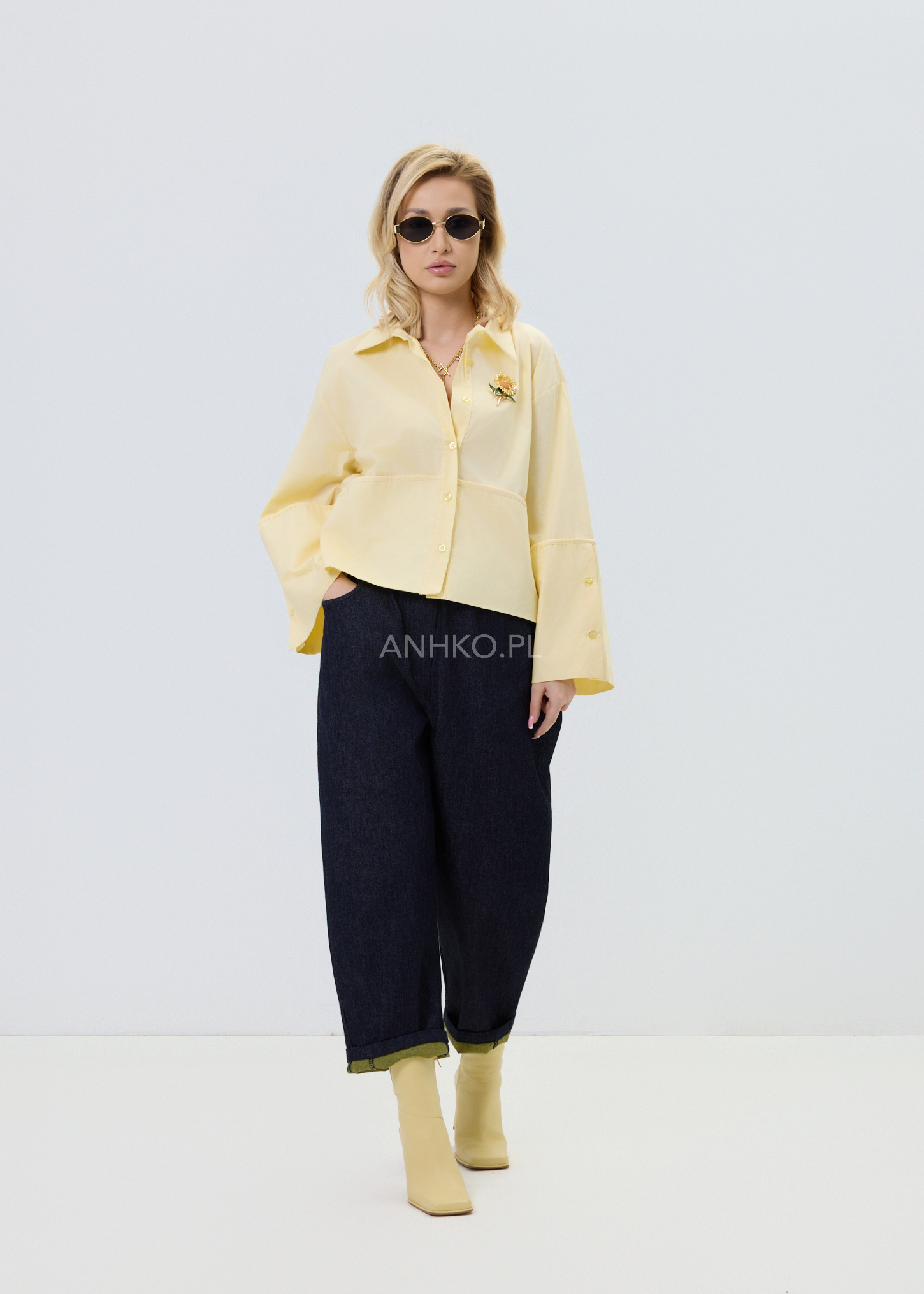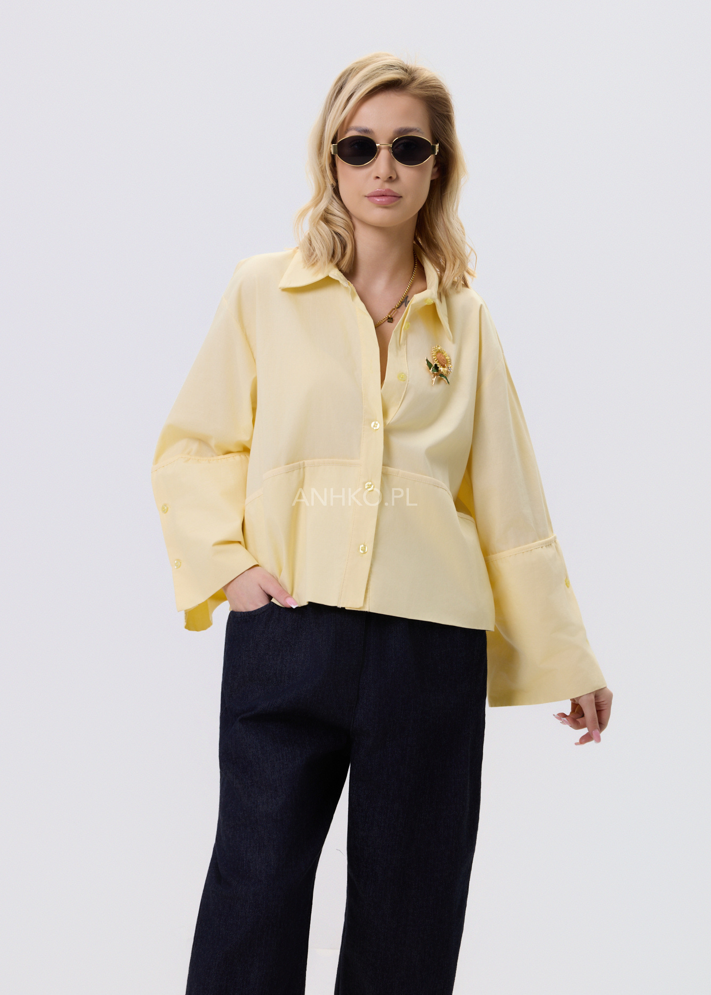 Jasnożółta koszula damska o luźnym kroju typu relaxed, zaprojektowana z myślą o wygodzie i stylowym, nowoczesnym wyglądzie. Model posiada klasyczny kołnierzyk oraz zapięcie na guziki, które nadają całości ponadczasowego charakteru. Asymetryczna linia z dłuższym tyłem sprawia, że koszula dobrze układa się na sylwetce i pasuje zarówno do spodni, jak i spódnic. Dekoracyjne, poszerzane rękawy dodają lekkości i subtelnego akcentu modowego. Bawełniany materiał zapewnia komfort noszenia przez cały dzień. To uniwersalna propozycja do stylizacji casualowych i półeleganckich.