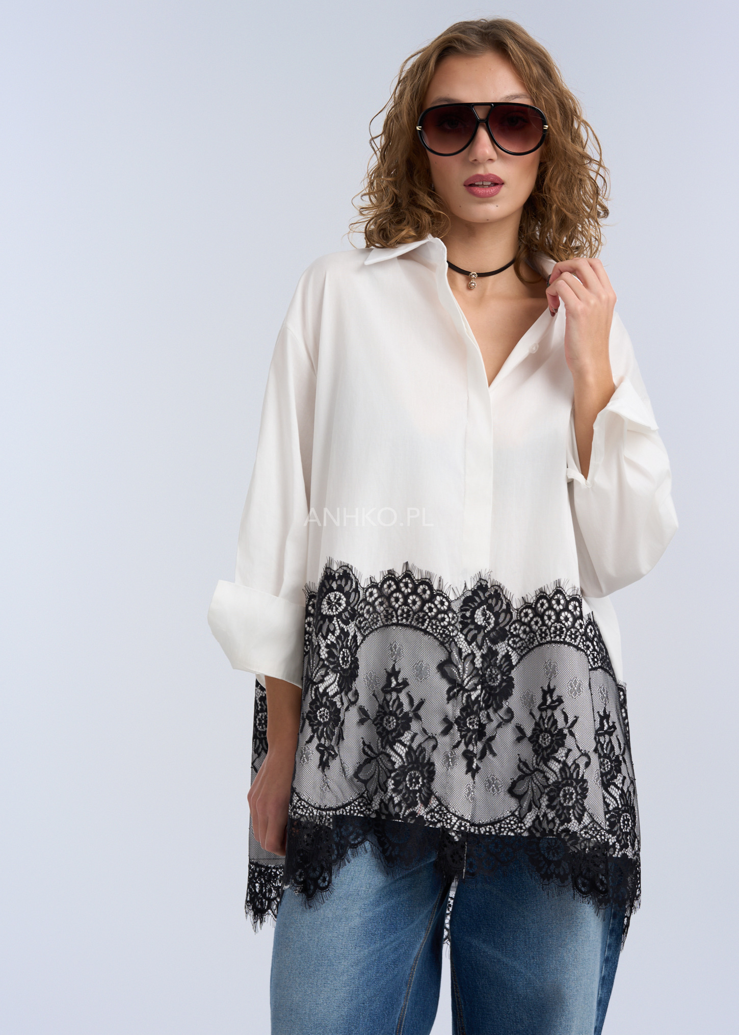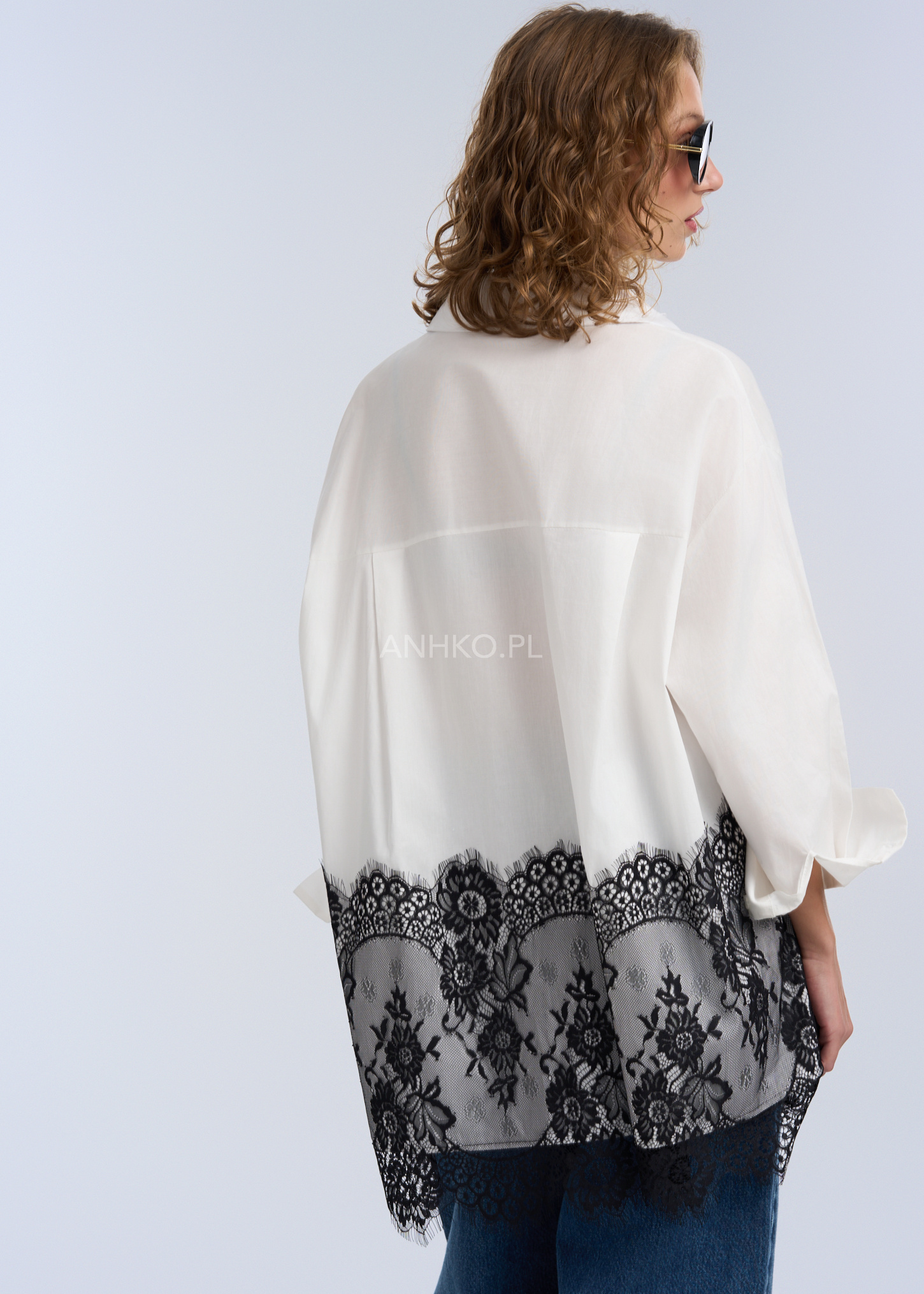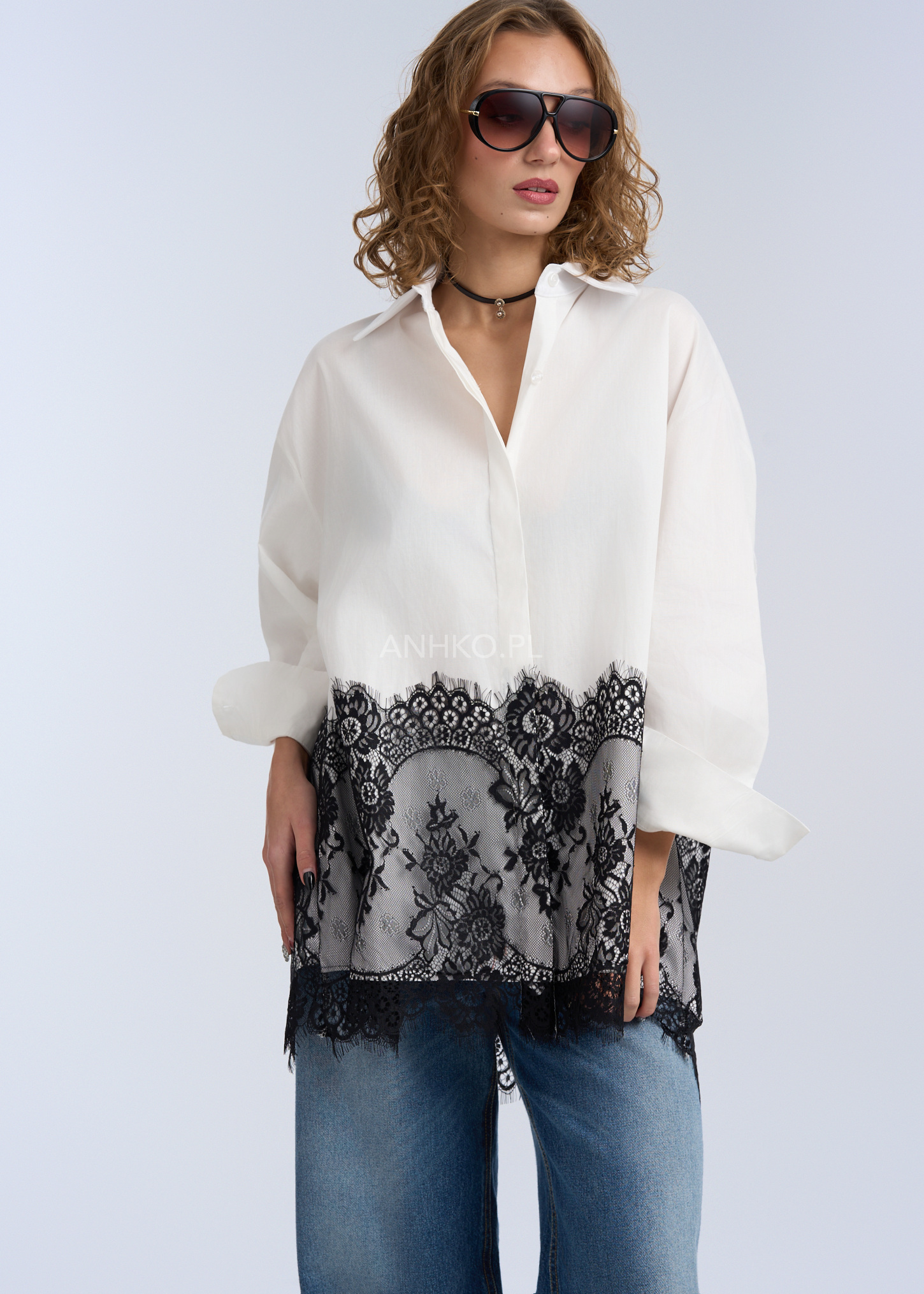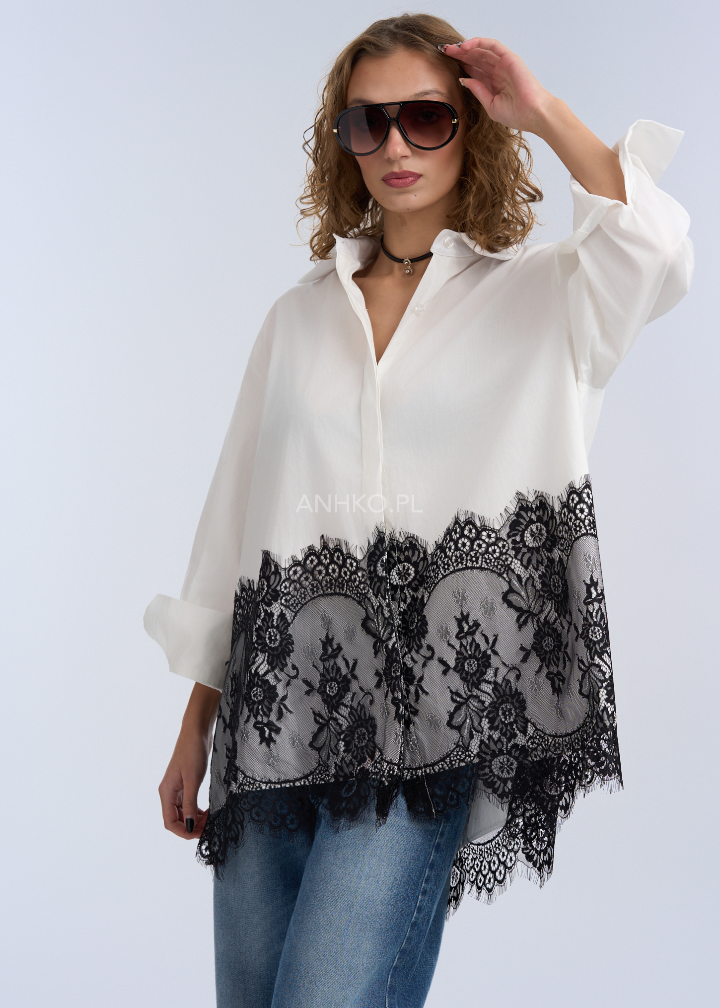 Ta biała koszula damska o luźnym, oversize’owym kroju swobodnie opływa sylwetkę, tworząc efekt lekkości i niewymuszonej elegancji. Delikatnie wydłużony fason pięknie układa się w ruchu, a kontrastowe, czarne wykończenie z koronki przy dolnej krawędzi przyciąga spojrzenia i nadaje całości wyrafinowanego charakteru.
