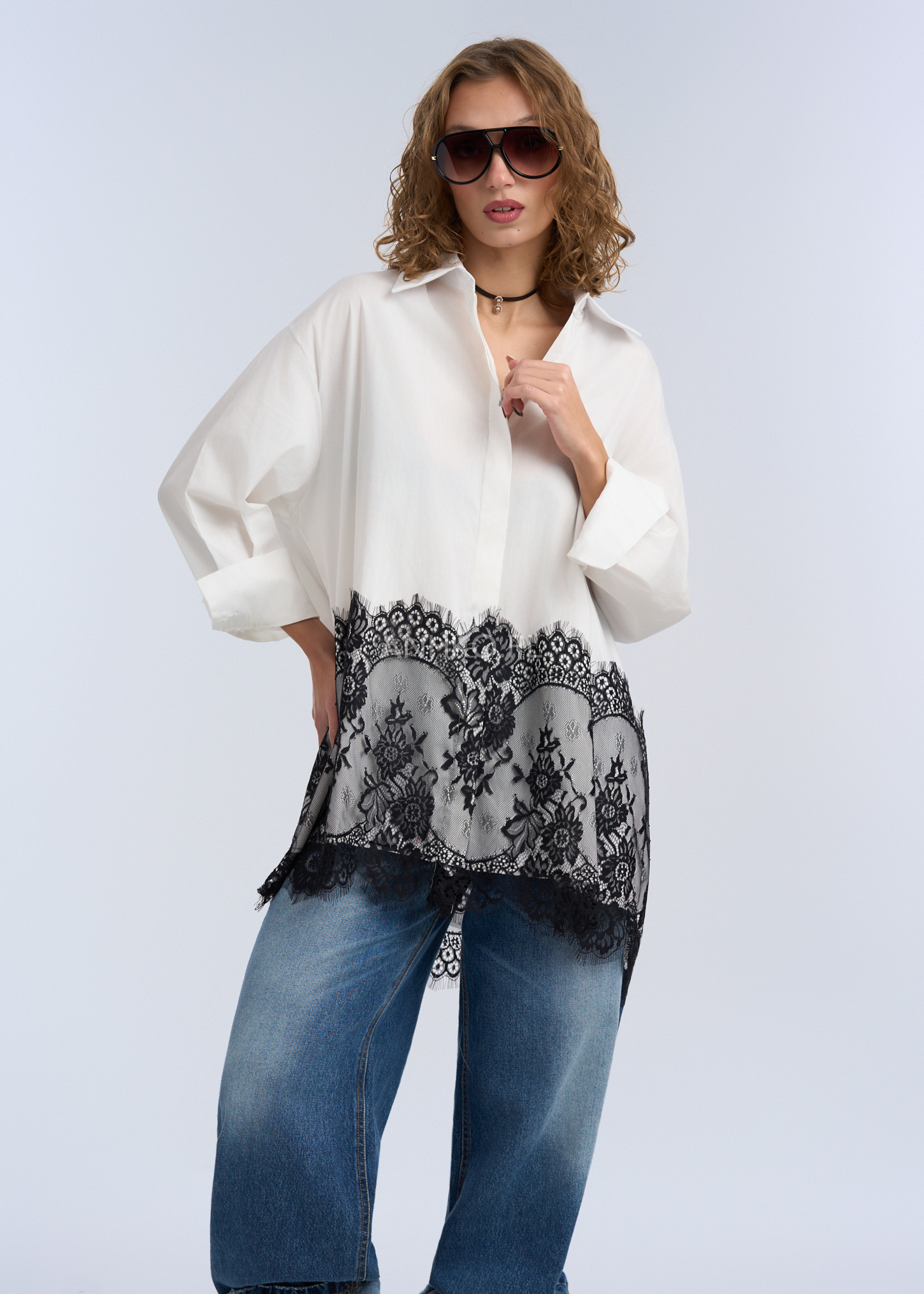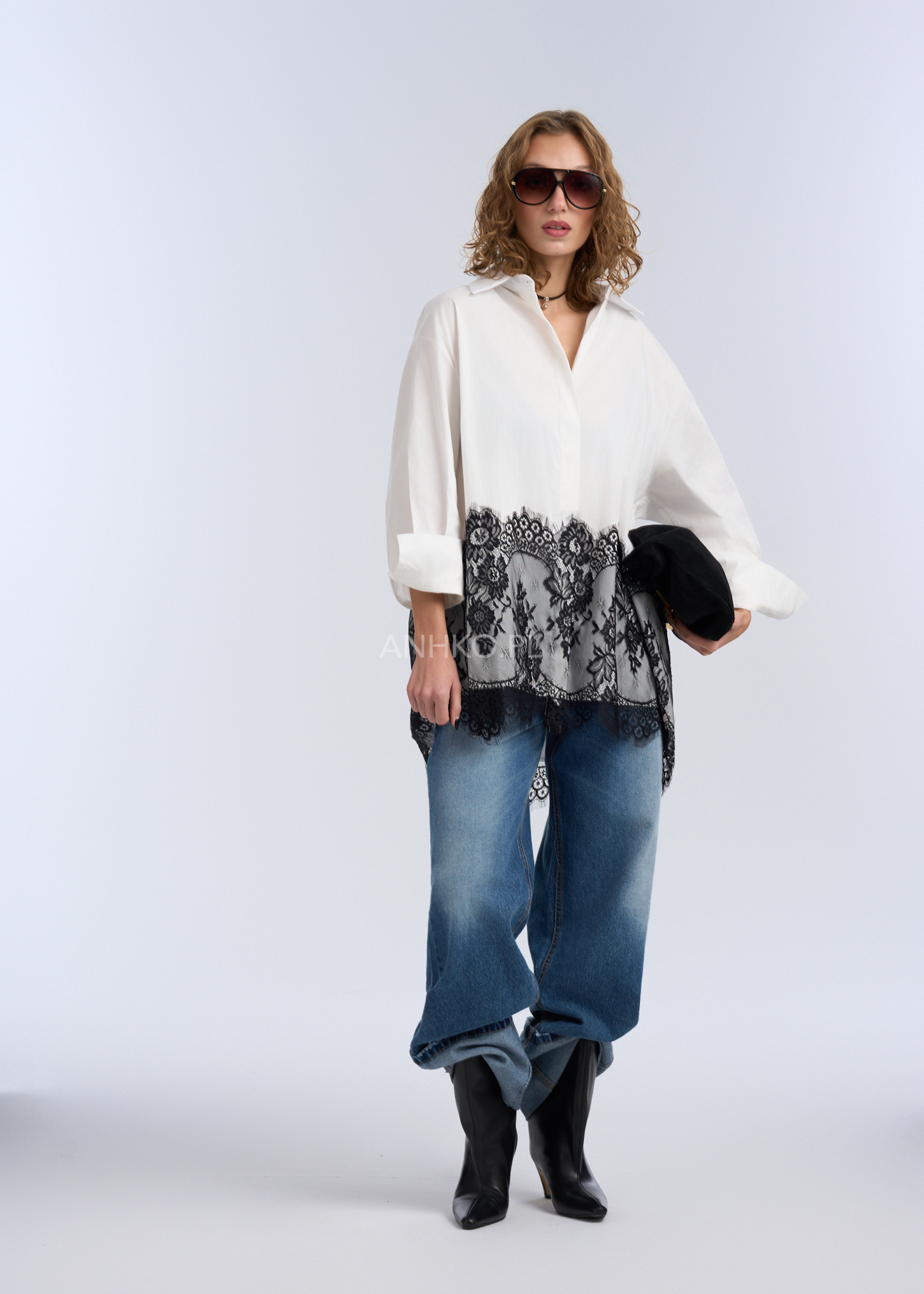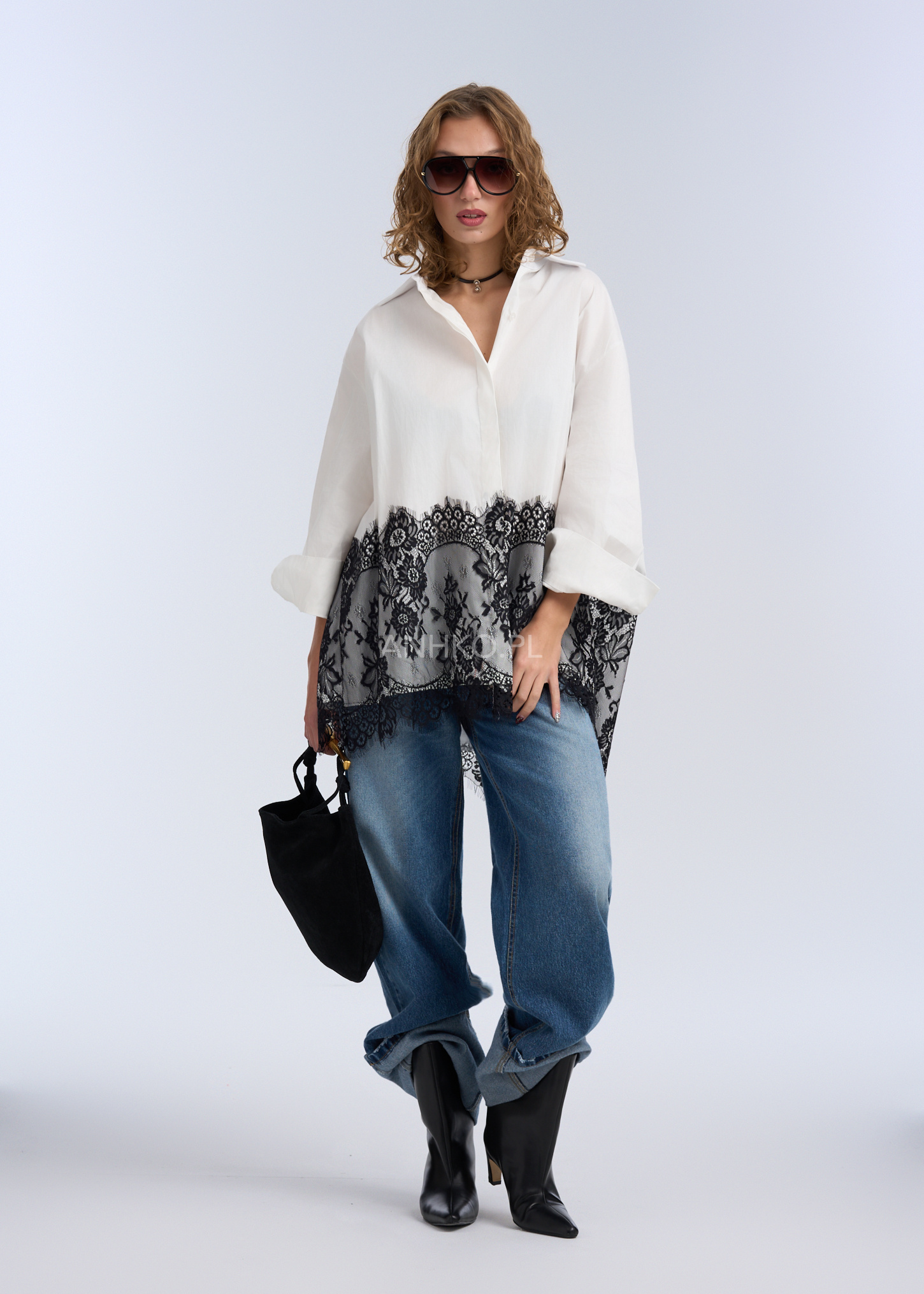Ta biała koszula damska o luźnym, oversize’owym kroju swobodnie opływa sylwetkę, tworząc efekt lekkości i niewymuszonej elegancji. Delikatnie wydłużony fason pięknie układa się w ruchu, a kontrastowe, czarne wykończenie z koronki przy dolnej krawędzi przyciąga spojrzenia i nadaje całości wyrafinowanego charakteru.