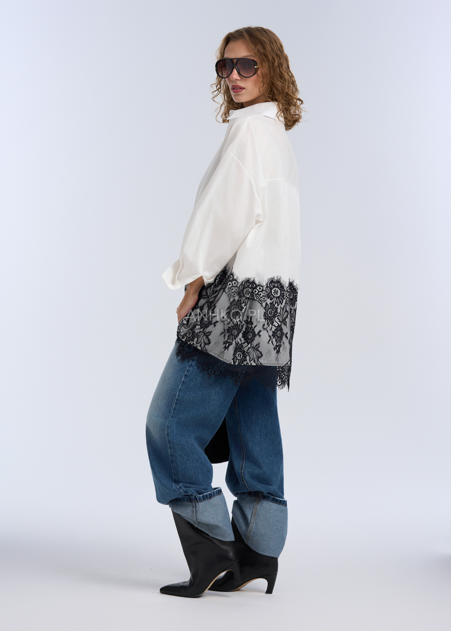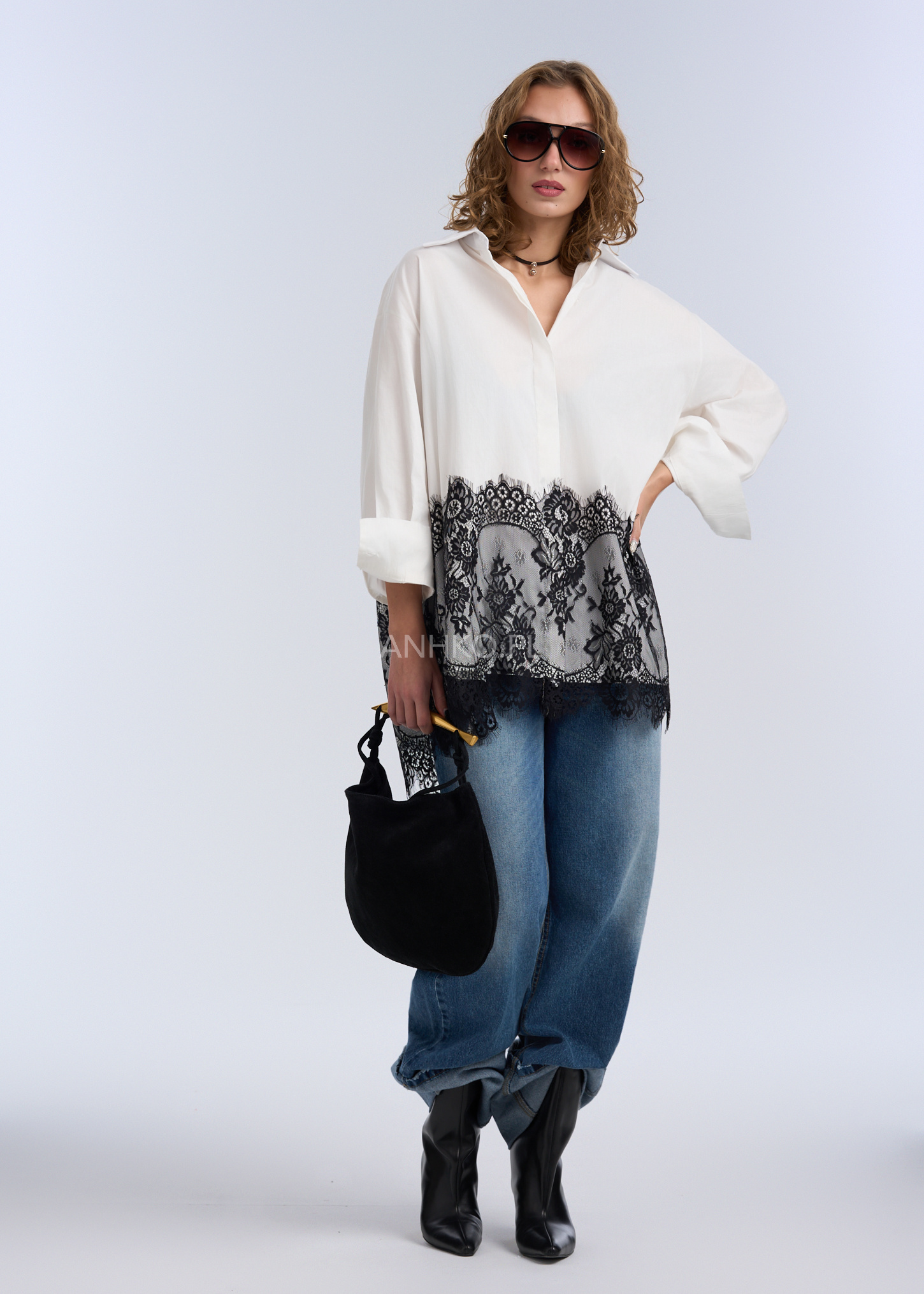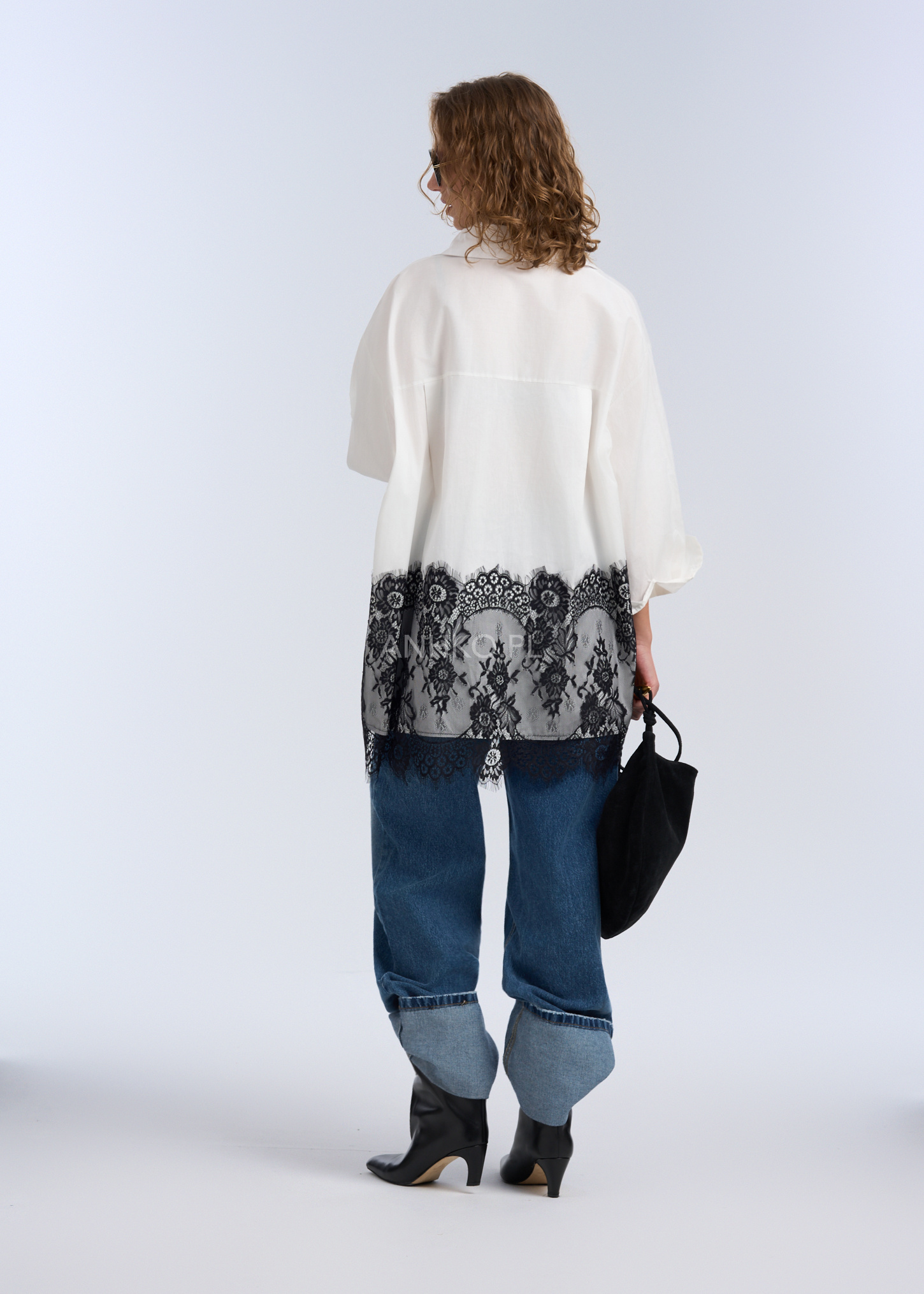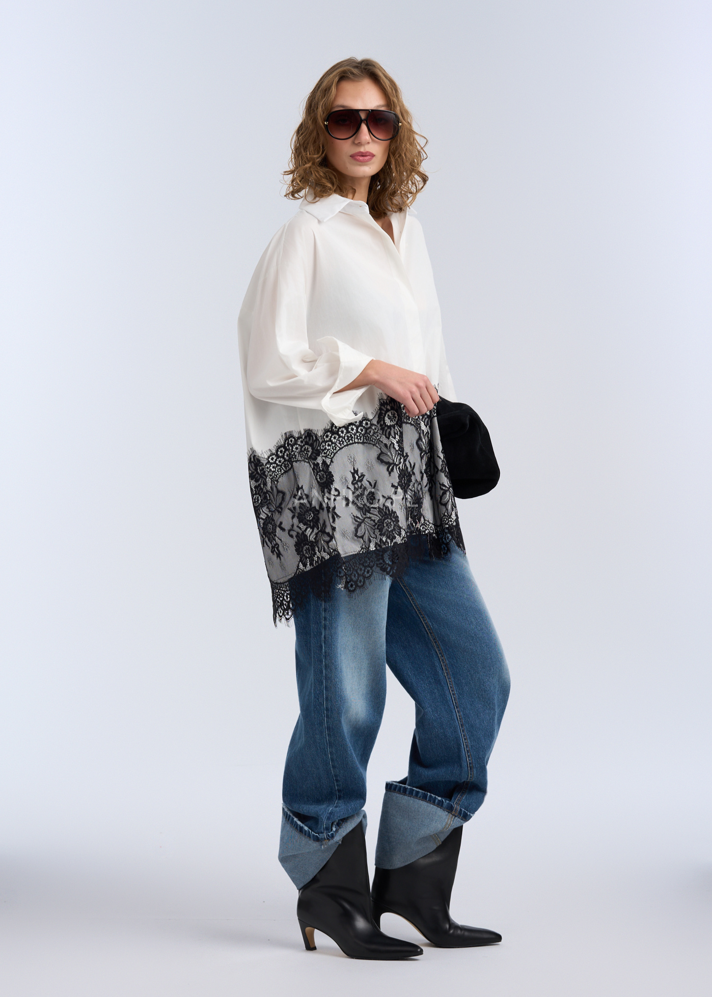 Ta biała koszula damska o luźnym, oversize’owym kroju swobodnie opływa sylwetkę, tworząc efekt lekkości i niewymuszonej elegancji. Delikatnie wydłużony fason pięknie układa się w ruchu, a kontrastowe, czarne wykończenie z koronki przy dolnej krawędzi przyciąga spojrzenia i nadaje całości wyrafinowanego charakteru.
