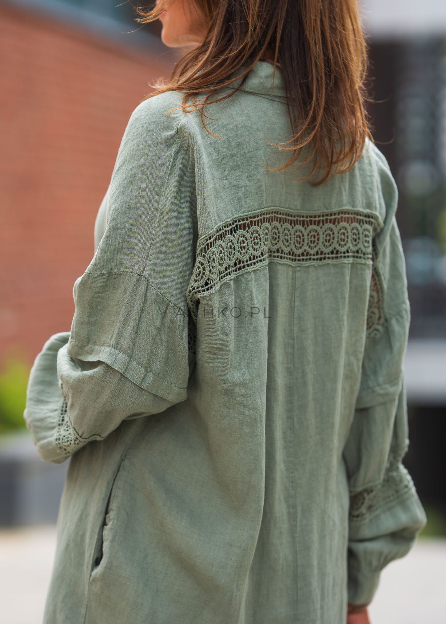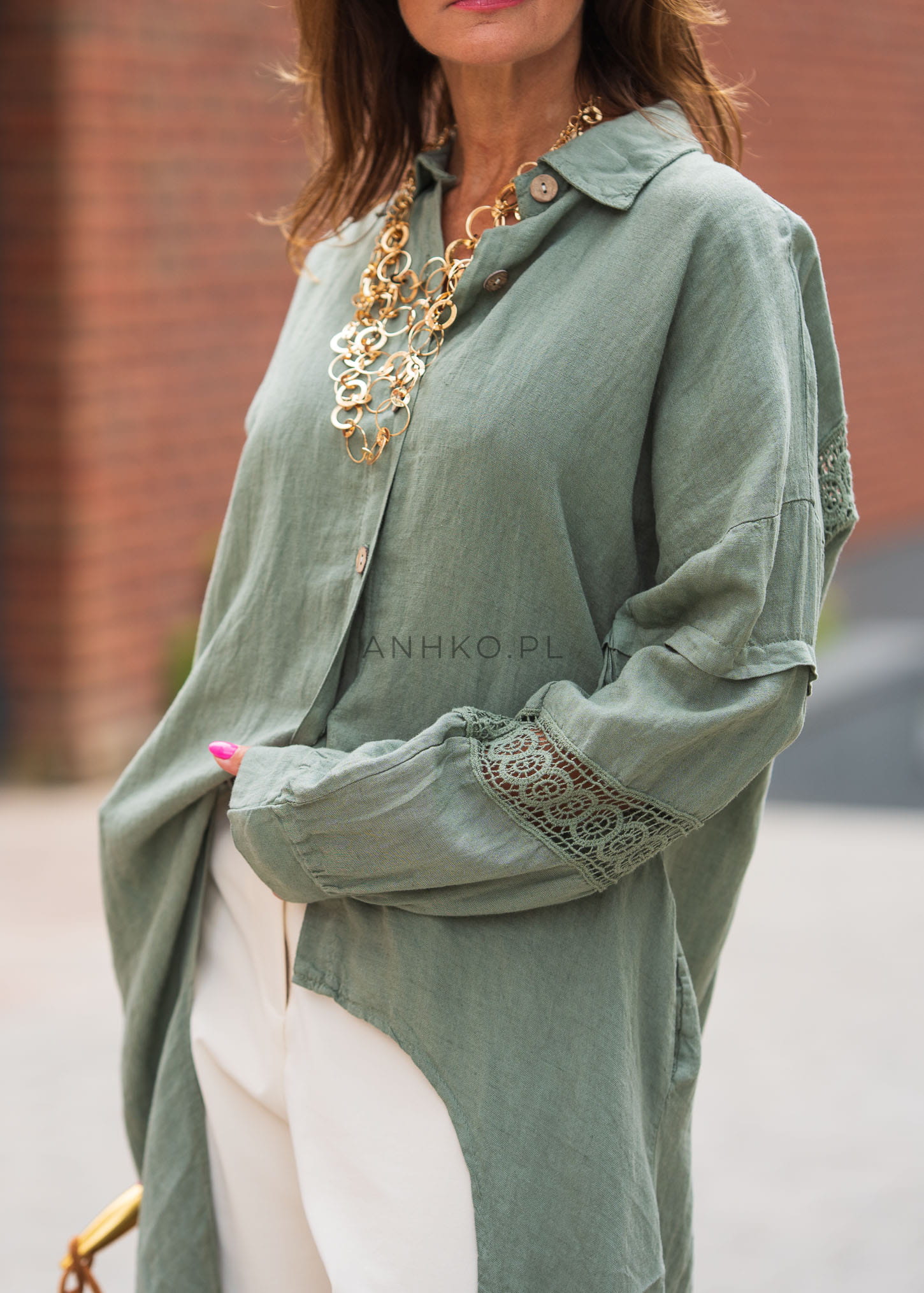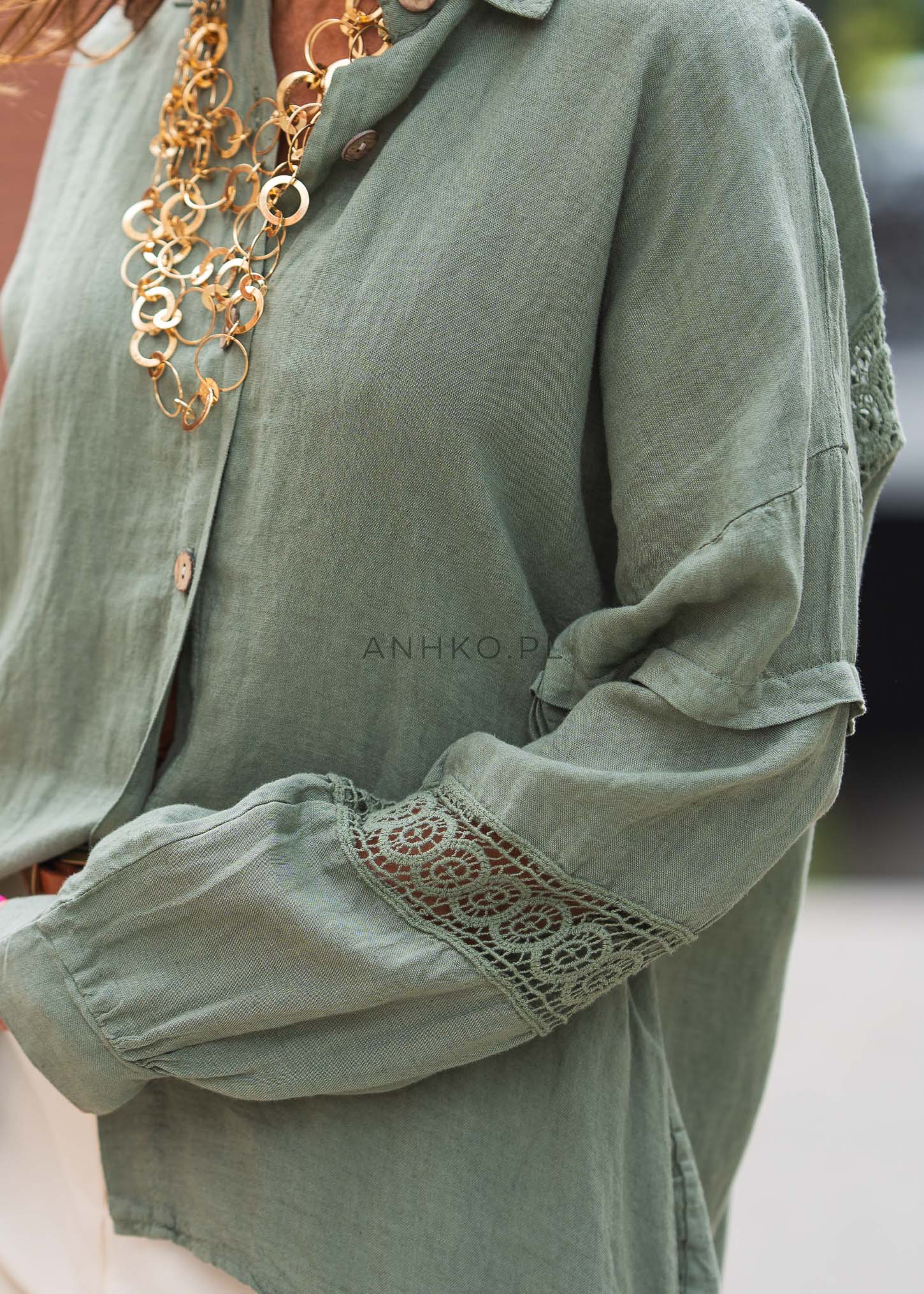 Koszula Estera Zielona - Ta elegancka koszula wykonana z wysokiej jakości lnu i bawełny to idealny wybór dla kobiet ceniących sobie komfort i styl. Dzięki subtelnym detalom z koronki, koszula nabiera wyjątkowego charakteru, który sprawdzi się zarówno w codziennych, jak i bardziej formalnych stylizacjach. Luźny fason zapewnia swobodę ruchów, a naturalne materiały gwarantują komfort noszenia przez cały dzień.